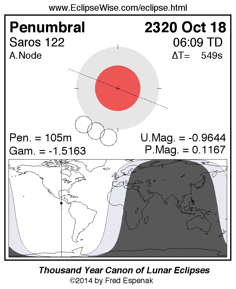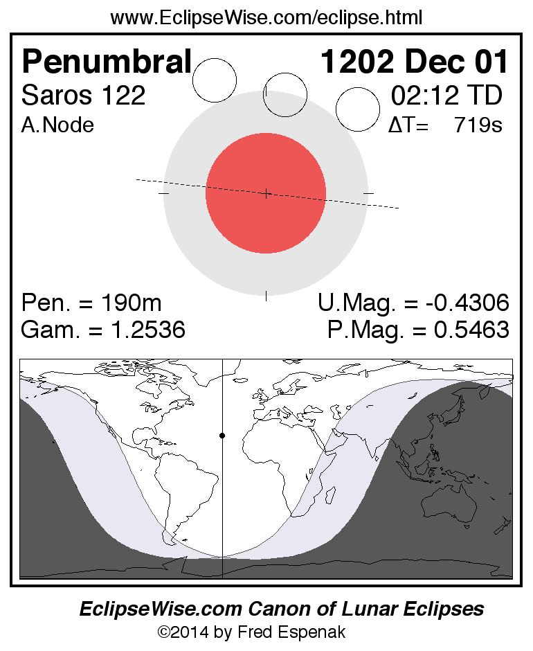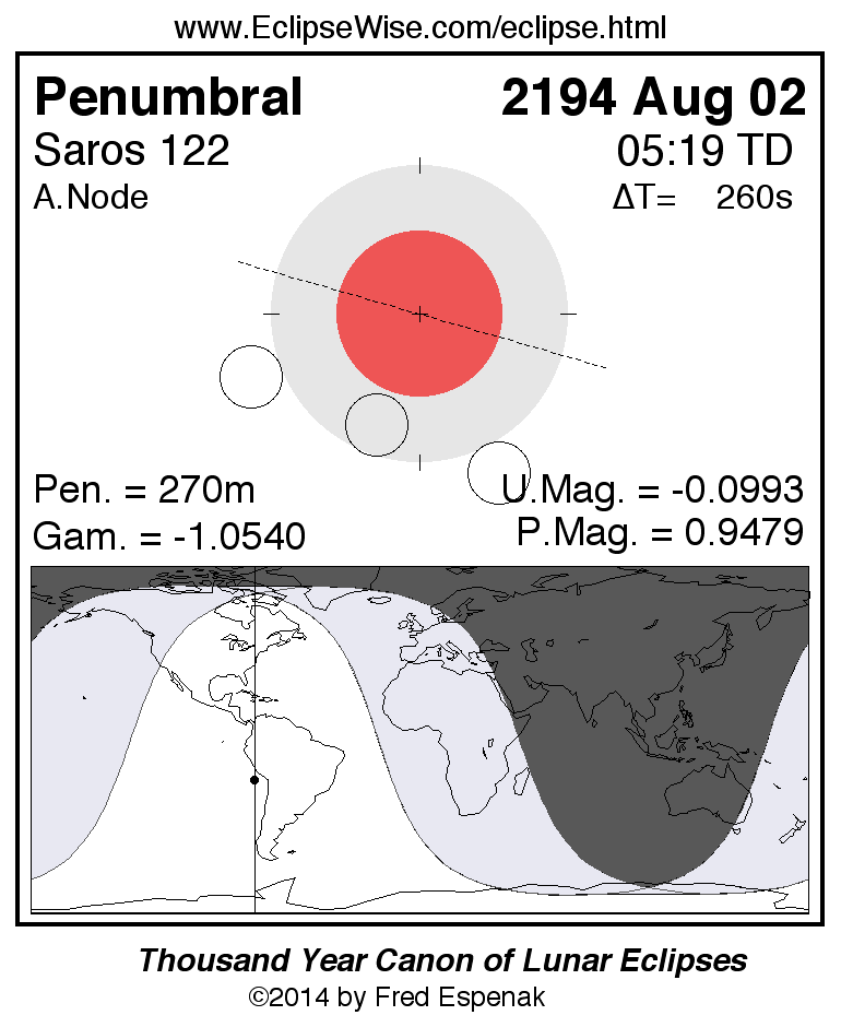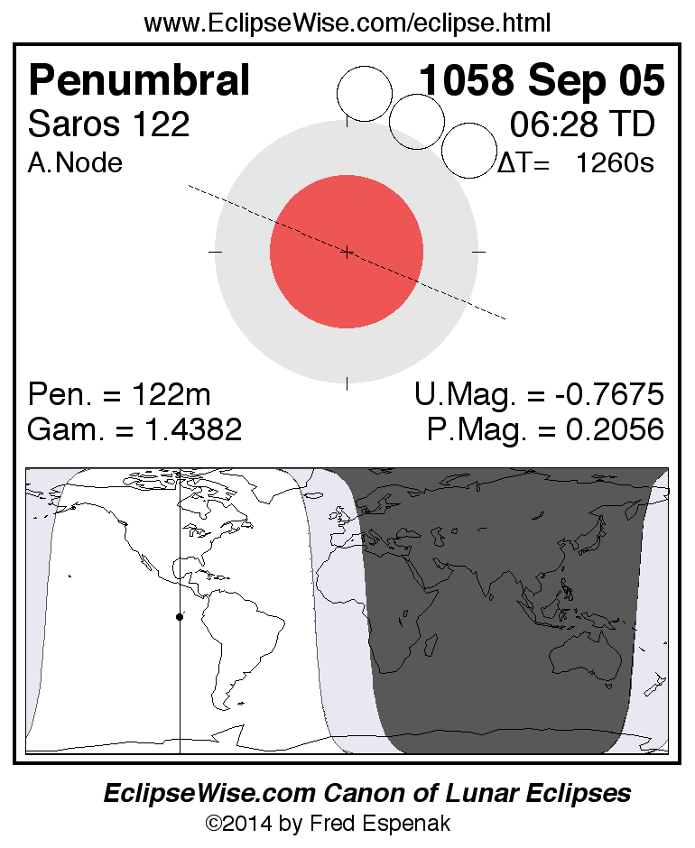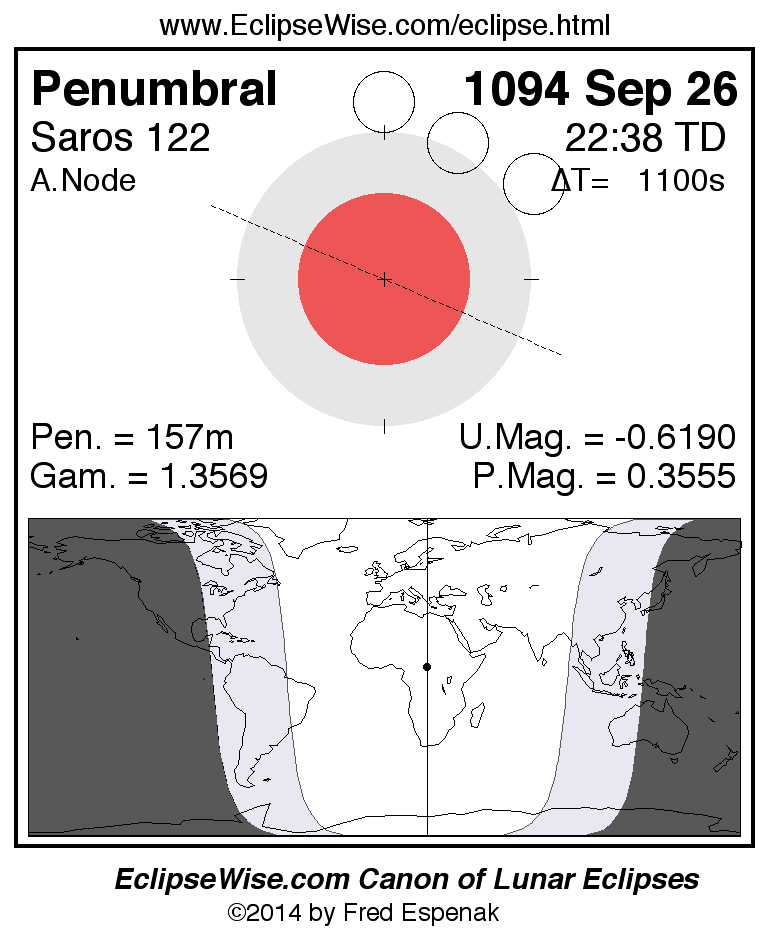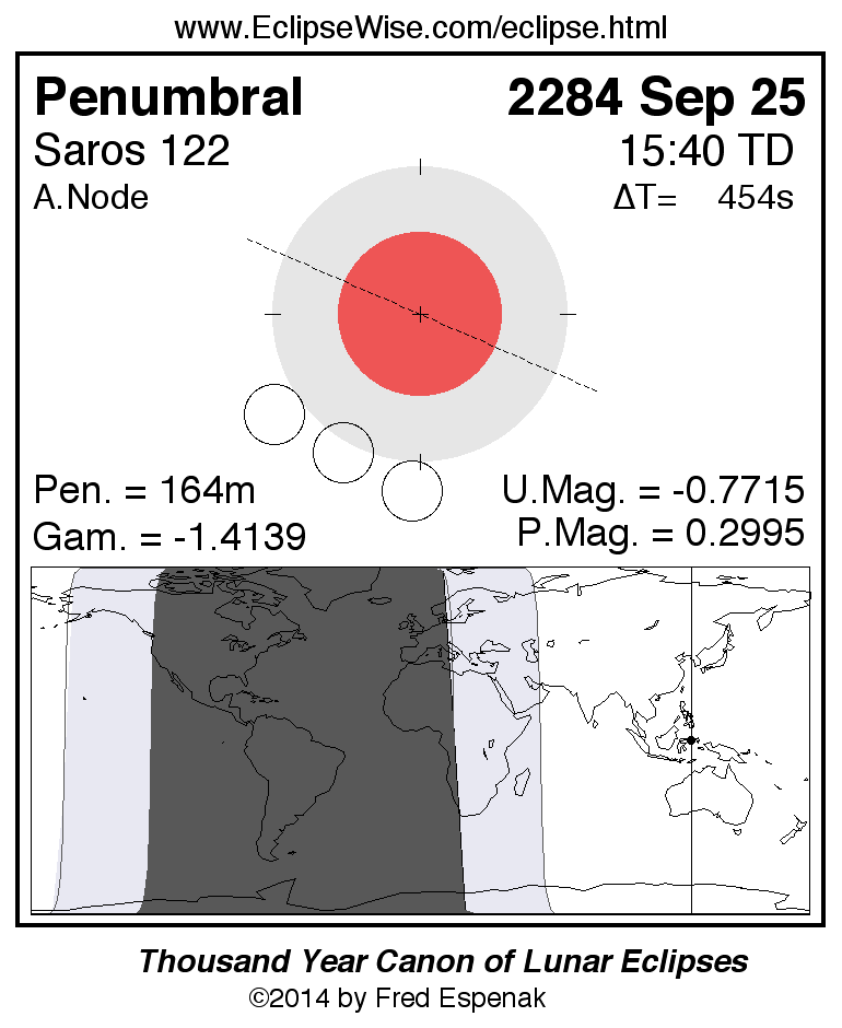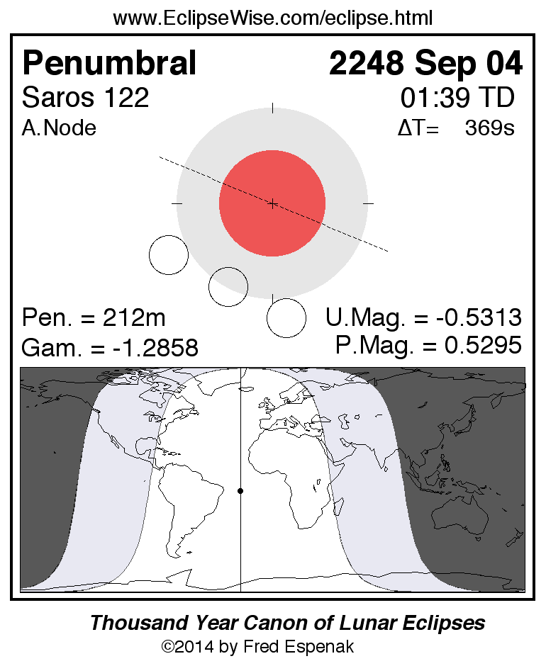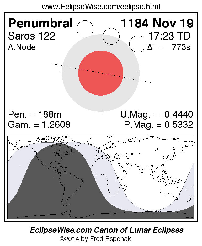 A panorama of all lunar eclipses belonging to Saros 122 is presented here. Each figure shows the Moon's path with respect to Earth's penumbral and umbral shadows. Below the path is a map depicting the geographic region of visibility for the eclipse. The date and time are given for the instant of Greatest Eclipse. Every figure serves as a hyperlink to the EclipseWise Prime page for that eclipse with a larger figure and complete details for the eclipse. Visit the Key to Lunar Eclipse Figures for a detailed explanation of these diagrams. Near the bottom of this page are a series of hyperlinks for more on lunar eclipses.