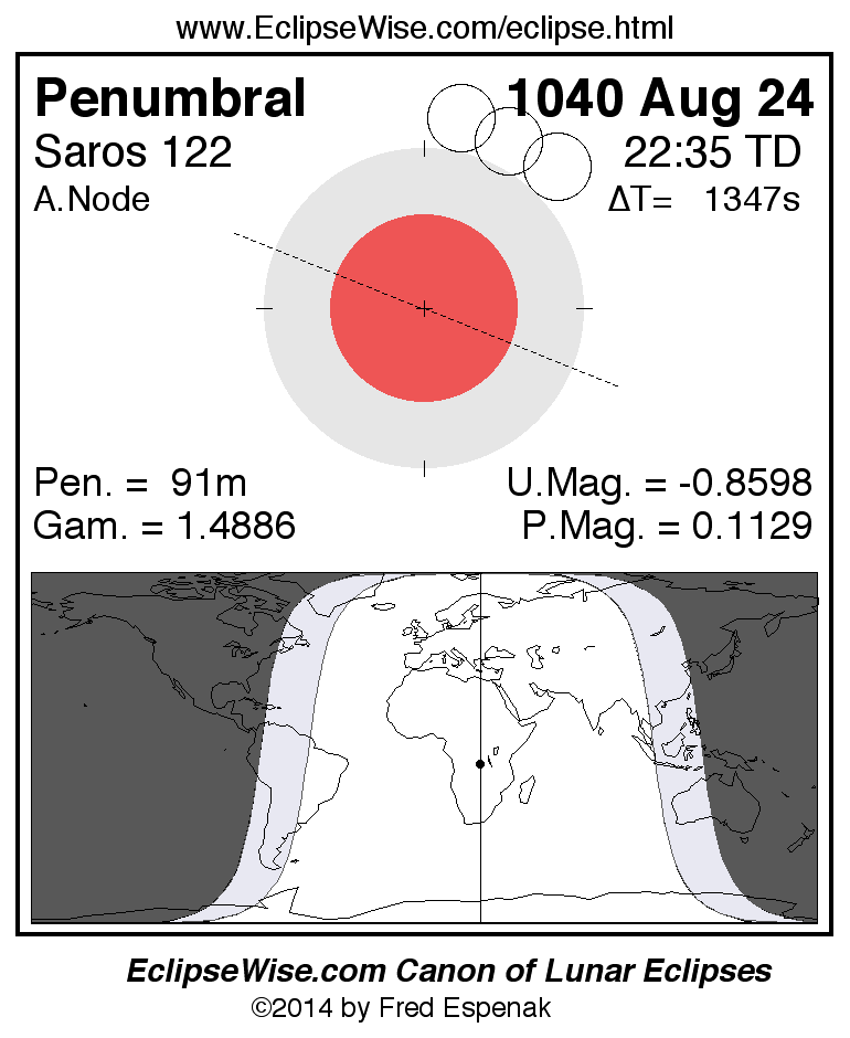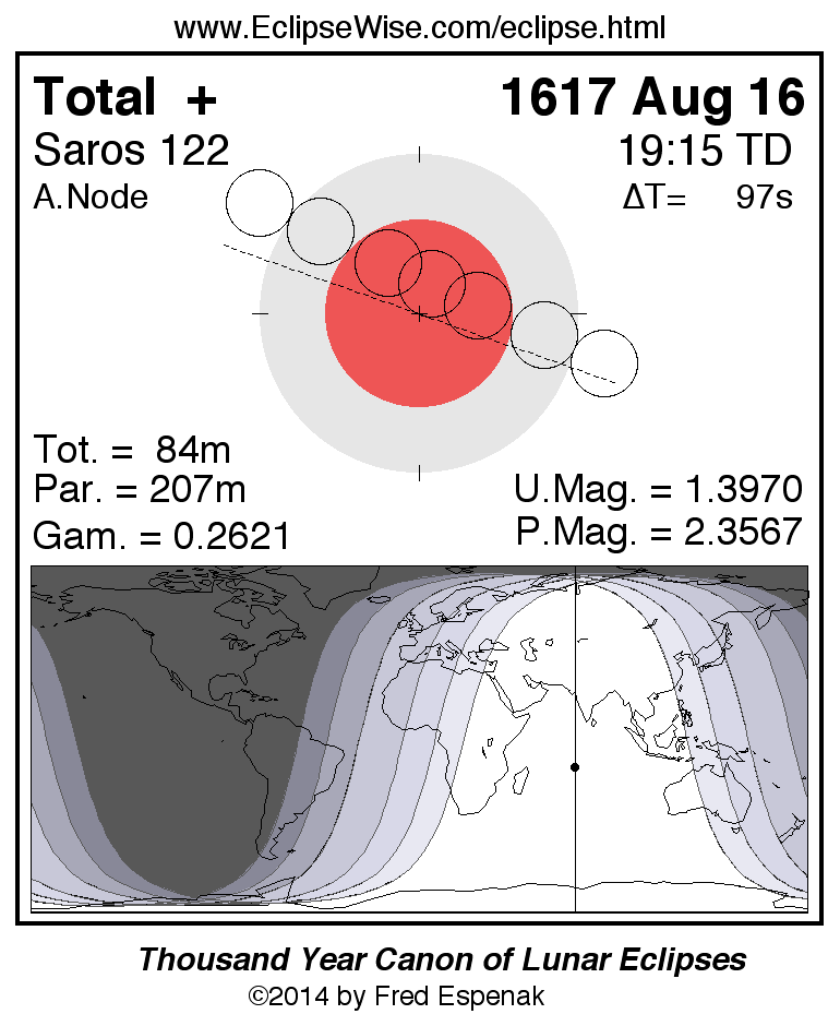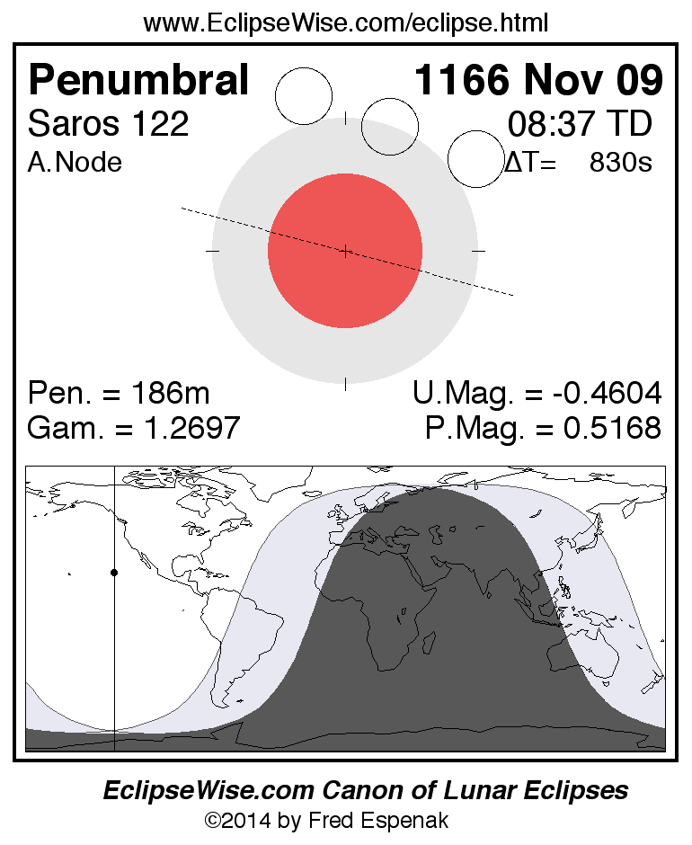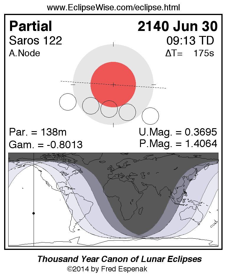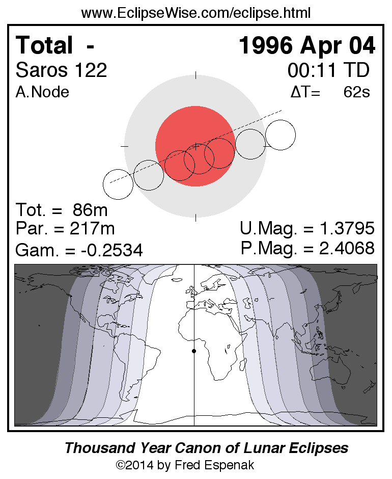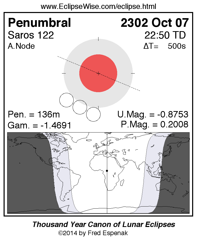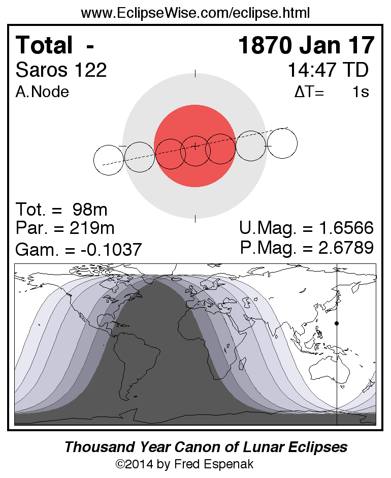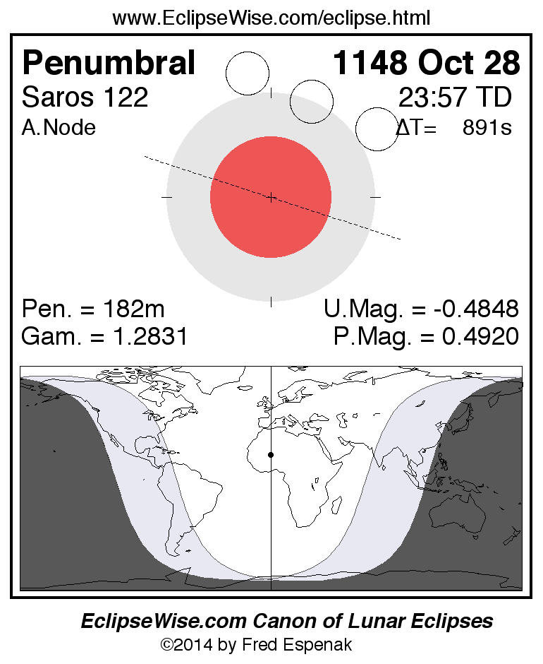 A panorama of all lunar eclipses belonging to Saros 122 is presented here. Each figure shows the Moon's path with respect to Earth's penumbral and umbral shadows. Below the path is a map depicting the geographic region of visibility for the eclipse. The date and time are given for the instant of Greatest Eclipse. Every figure serves as a hyperlink to the EclipseWise Prime page for that eclipse with a larger figure and complete details for the eclipse. Visit the Key to Lunar Eclipse Figures for a detailed explanation of these diagrams. Near the bottom of this page are a series of hyperlinks for more on lunar eclipses.