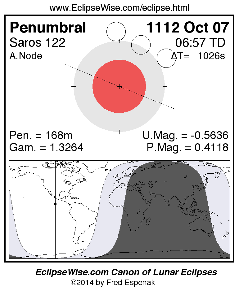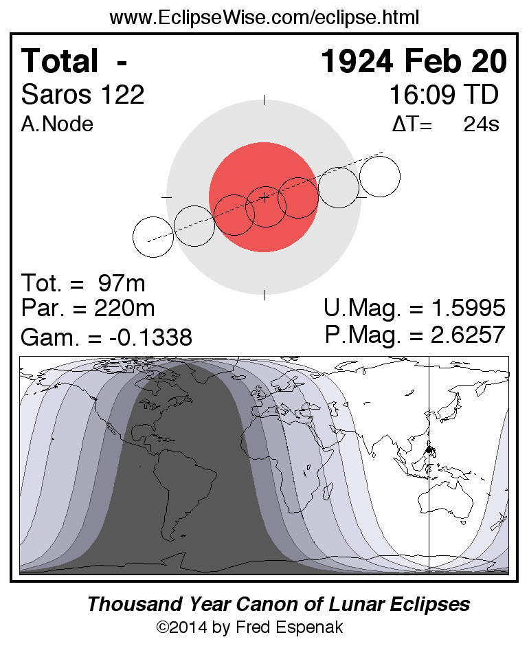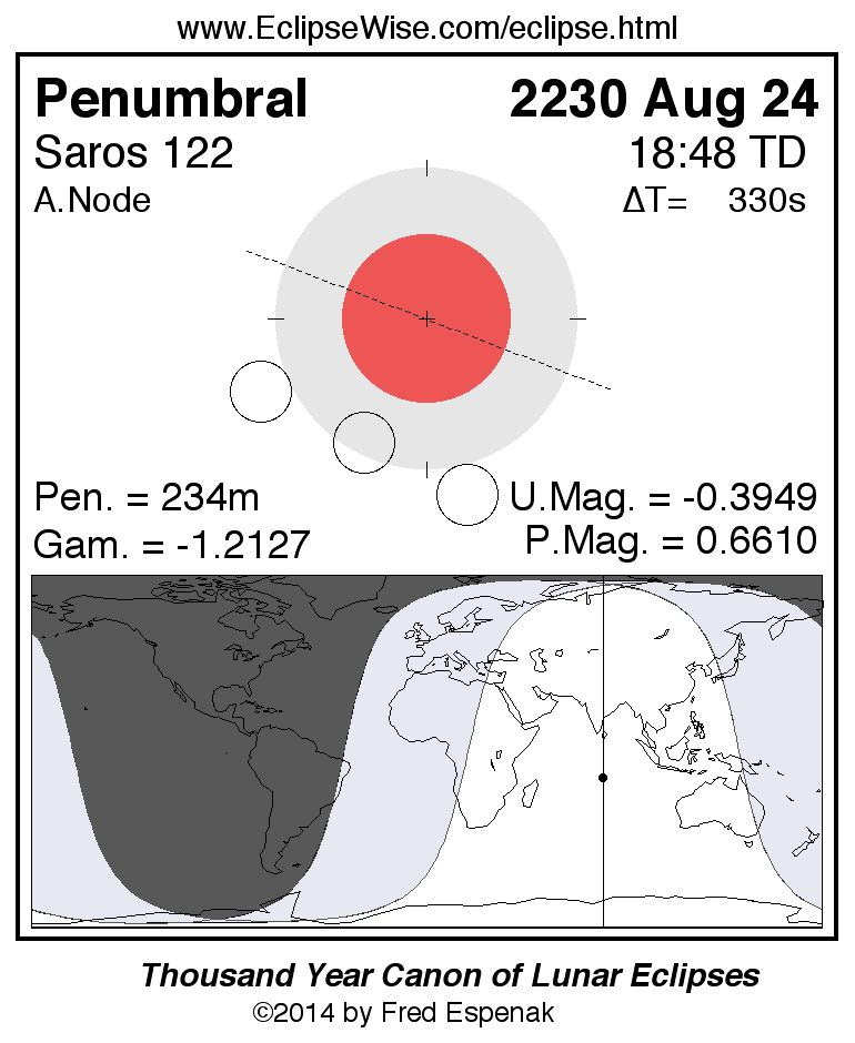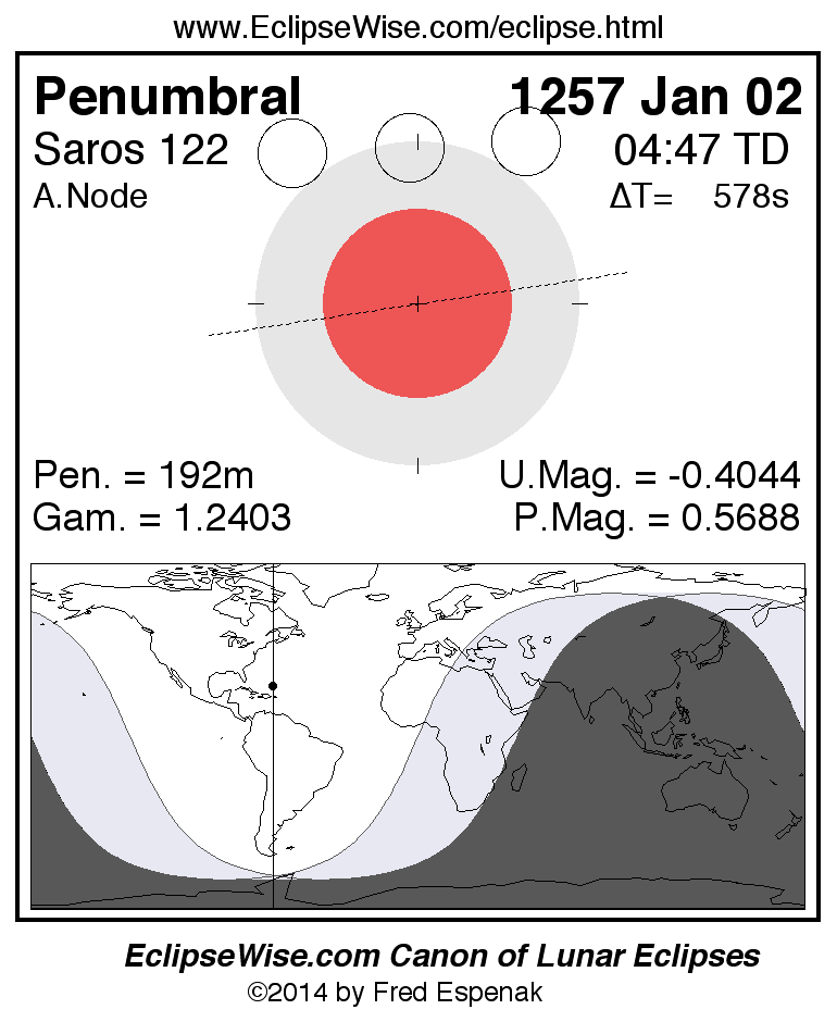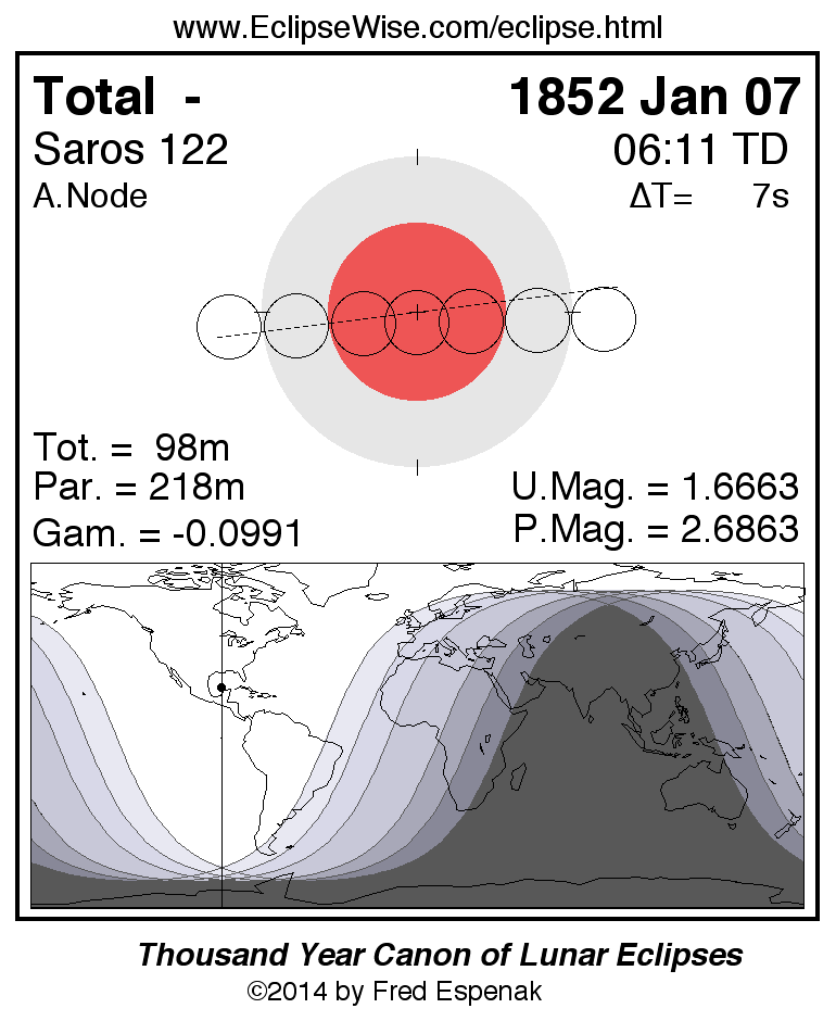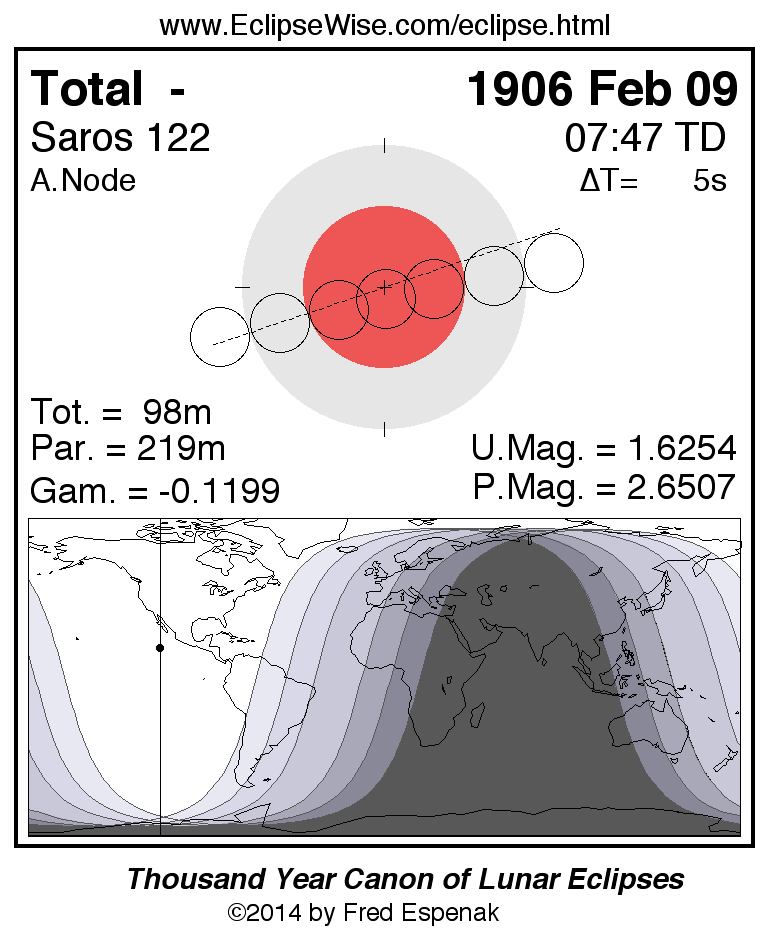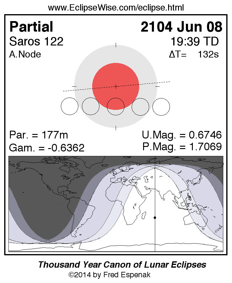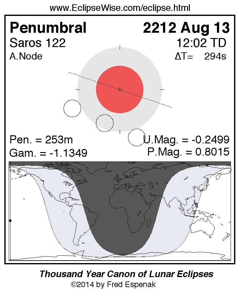 A panorama of all lunar eclipses belonging to Saros 122 is presented here. Each figure shows the Moon's path with respect to Earth's penumbral and umbral shadows. Below the path is a map depicting the geographic region of visibility for the eclipse. The date and time are given for the instant of Greatest Eclipse. Every figure serves as a hyperlink to the EclipseWise Prime page for that eclipse with a larger figure and complete details for the eclipse. Visit the Key to Lunar Eclipse Figures for a detailed explanation of these diagrams. Near the bottom of this page are a series of hyperlinks for more on lunar eclipses.