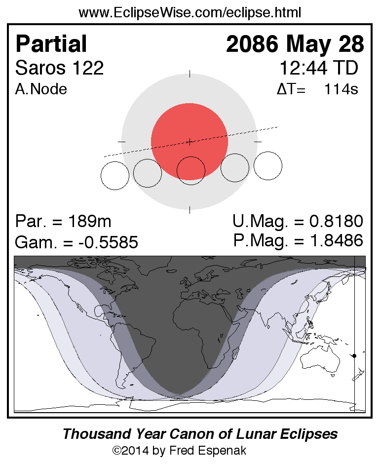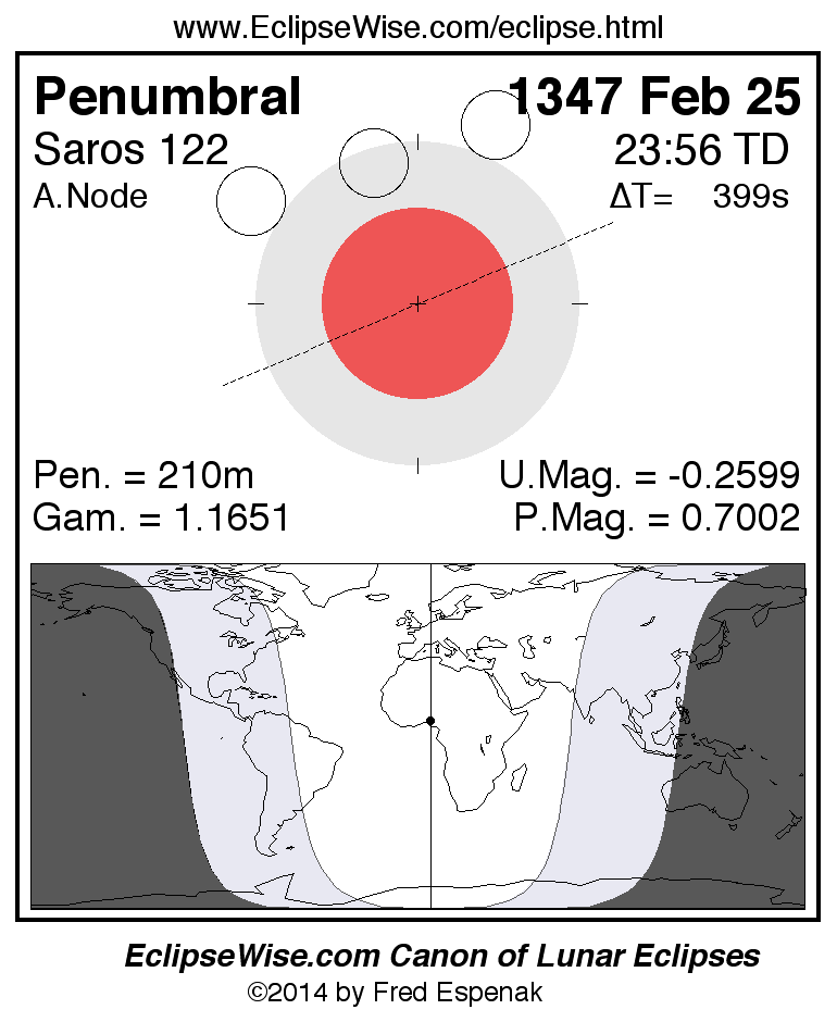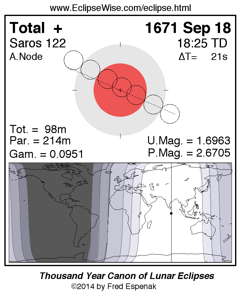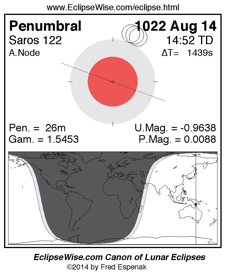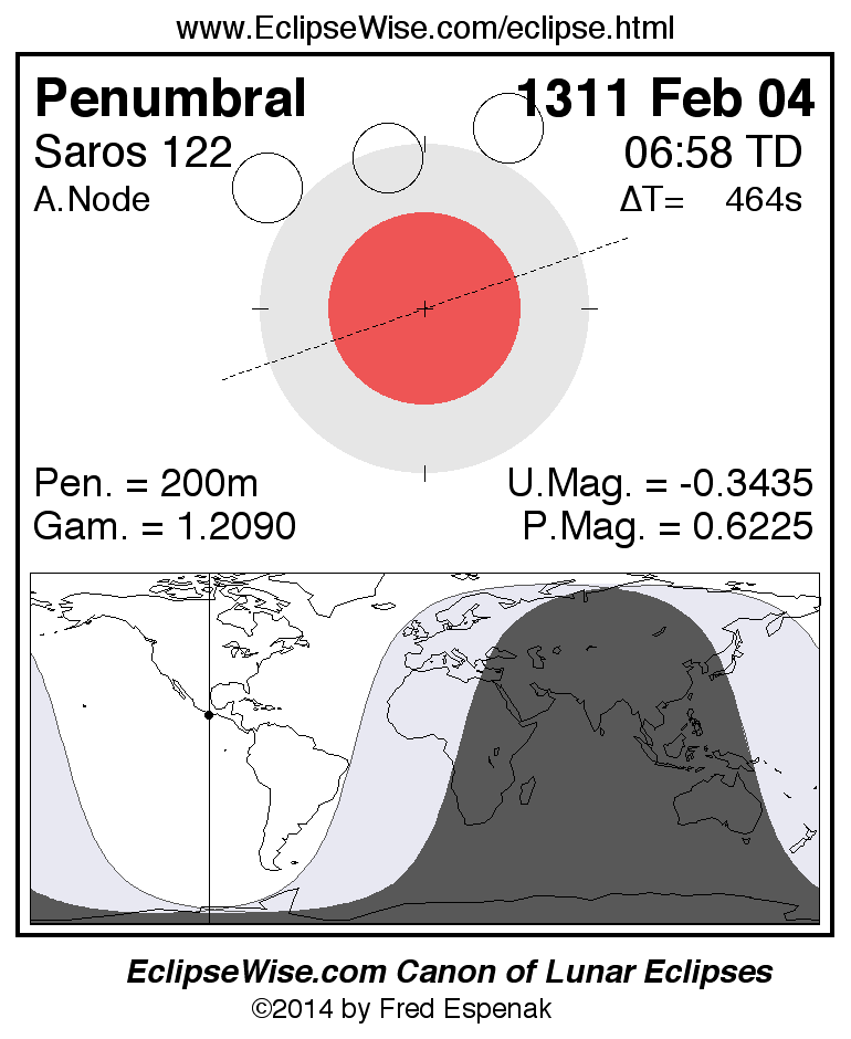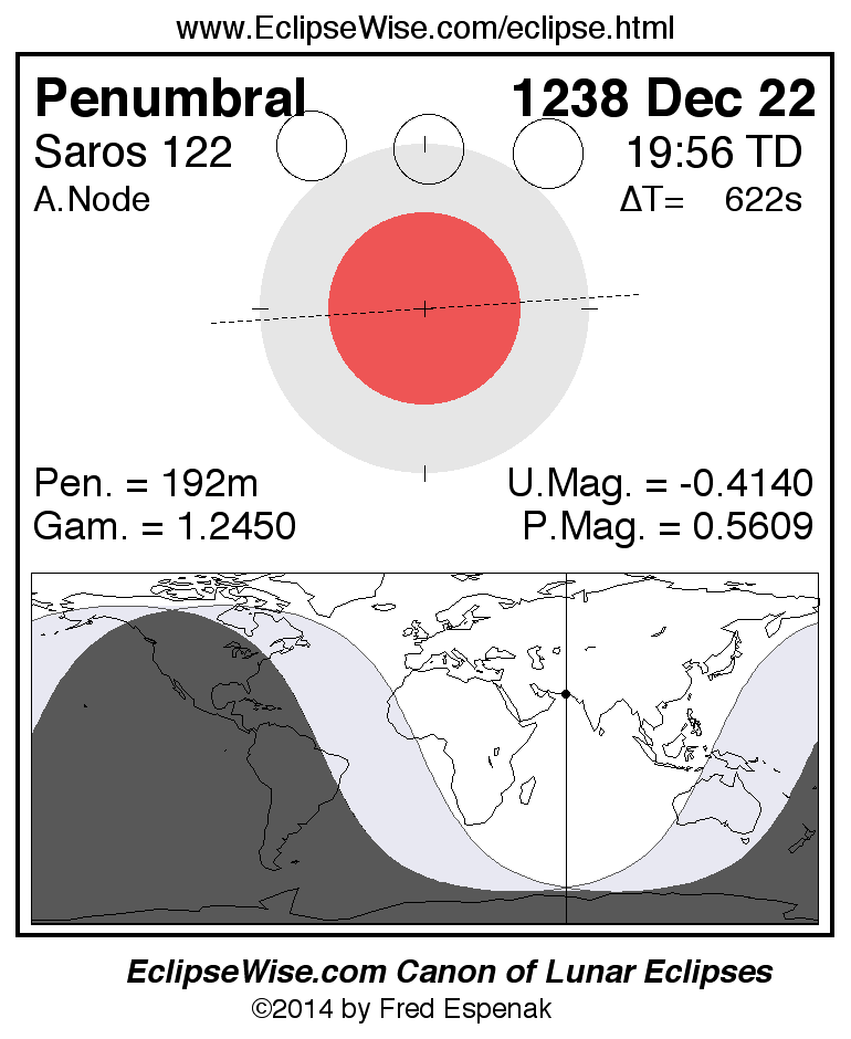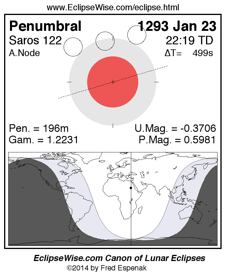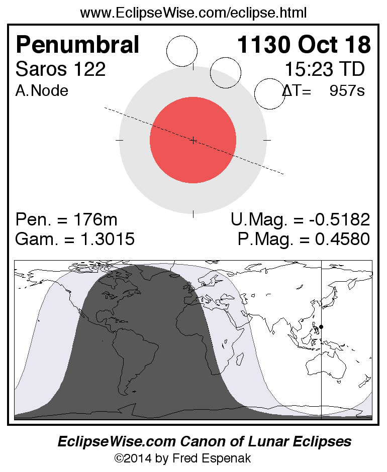 A panorama of all lunar eclipses belonging to Saros 122 is presented here. Each figure shows the Moon's path with respect to Earth's penumbral and umbral shadows. Below the path is a map depicting the geographic region of visibility for the eclipse. The date and time are given for the instant of Greatest Eclipse. Every figure serves as a hyperlink to the EclipseWise Prime page for that eclipse with a larger figure and complete details for the eclipse. Visit the Key to Lunar Eclipse Figures for a detailed explanation of these diagrams. Near the bottom of this page are a series of hyperlinks for more on lunar eclipses.
