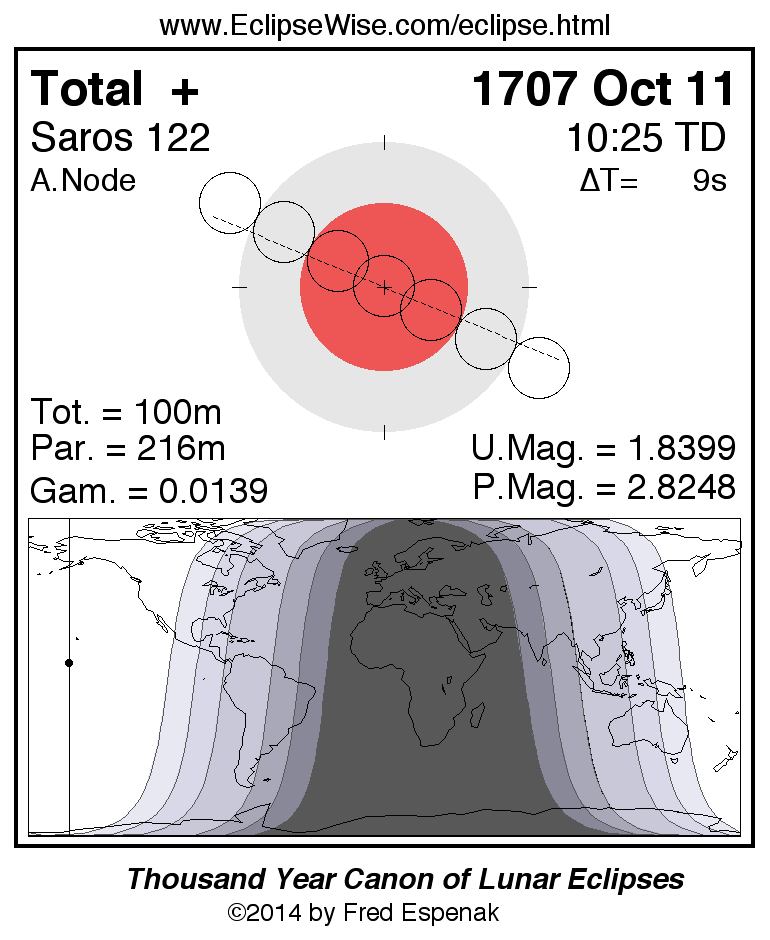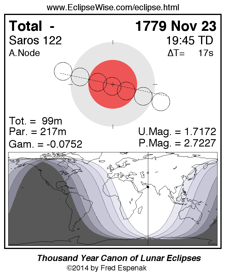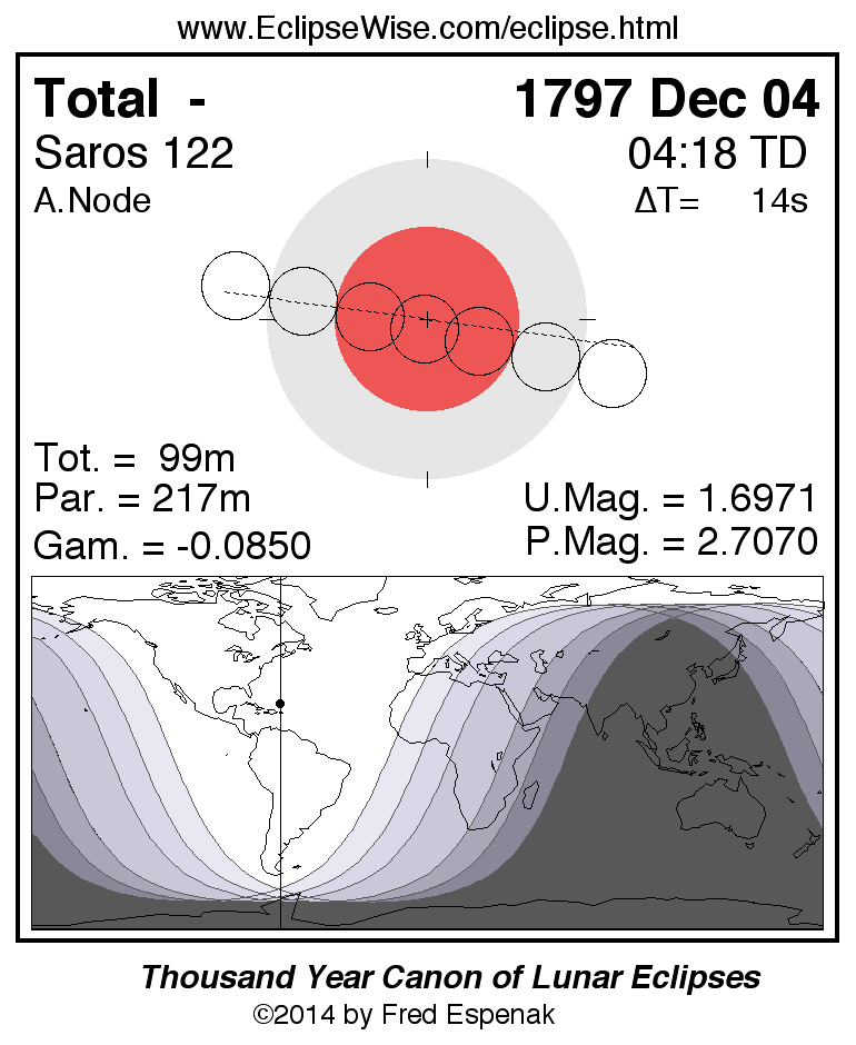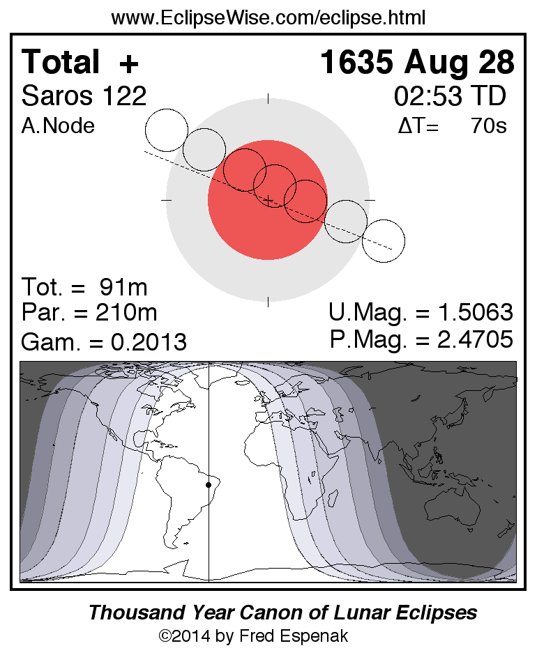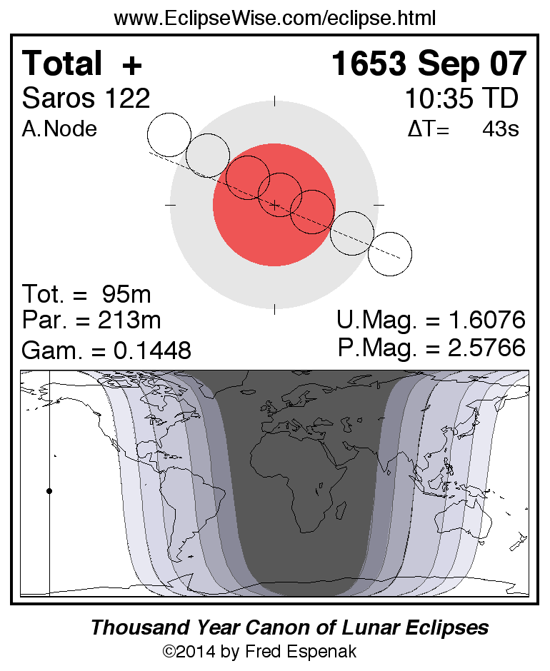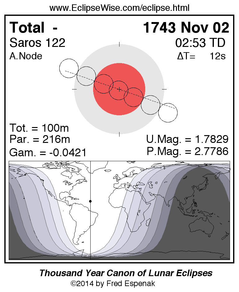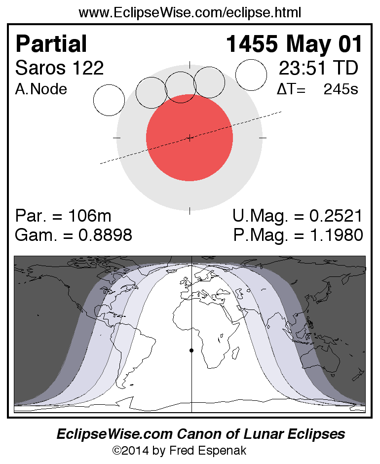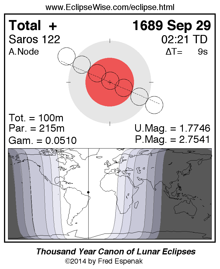 A panorama of all lunar eclipses belonging to Saros 122 is presented here. Each figure shows the Moon's path with respect to Earth's penumbral and umbral shadows. Below the path is a map depicting the geographic region of visibility for the eclipse. The date and time are given for the instant of Greatest Eclipse. Every figure serves as a hyperlink to the EclipseWise Prime page for that eclipse with a larger figure and complete details for the eclipse. Visit the Key to Lunar Eclipse Figures for a detailed explanation of these diagrams. Near the bottom of this page are a series of hyperlinks for more on lunar eclipses.