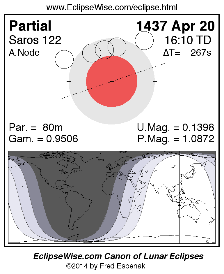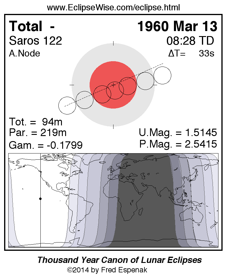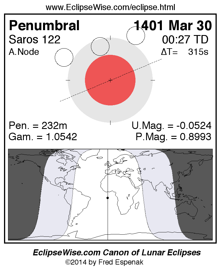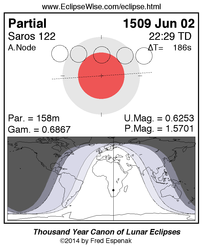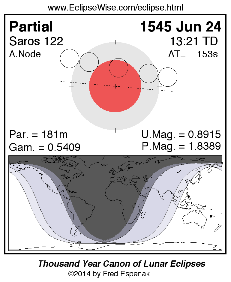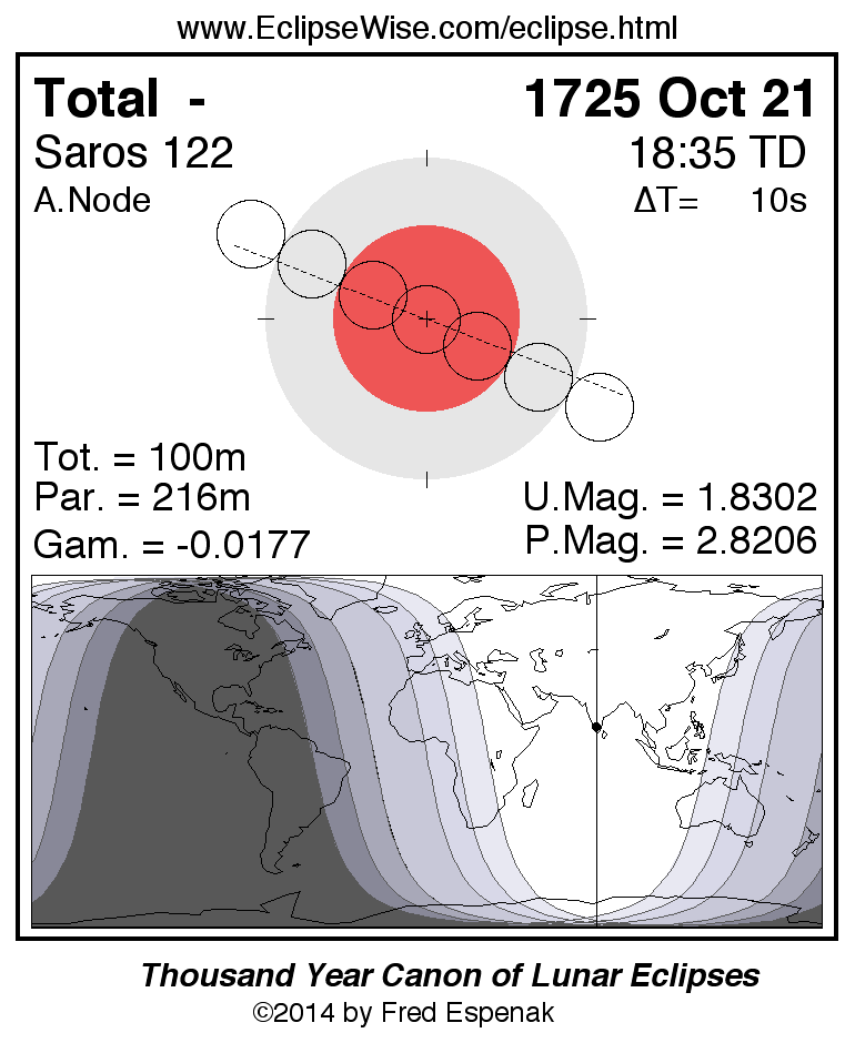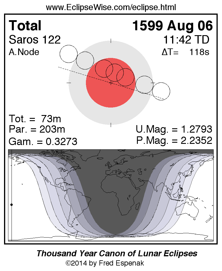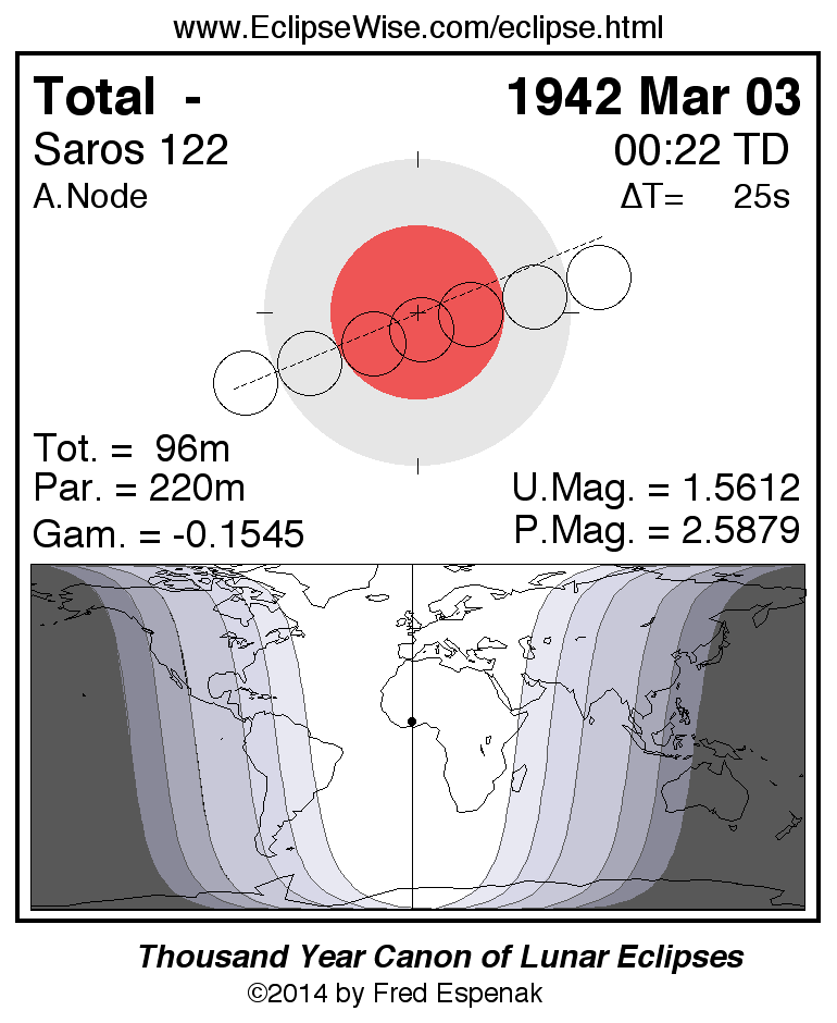 A panorama of all lunar eclipses belonging to Saros 122 is presented here. Each figure shows the Moon's path with respect to Earth's penumbral and umbral shadows. Below the path is a map depicting the geographic region of visibility for the eclipse. The date and time are given for the instant of Greatest Eclipse. Every figure serves as a hyperlink to the EclipseWise Prime page for that eclipse with a larger figure and complete details for the eclipse. Visit the Key to Lunar Eclipse Figures for a detailed explanation of these diagrams. Near the bottom of this page are a series of hyperlinks for more on lunar eclipses.