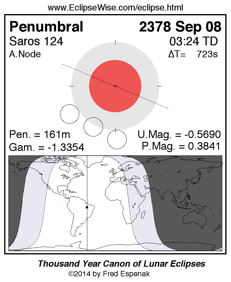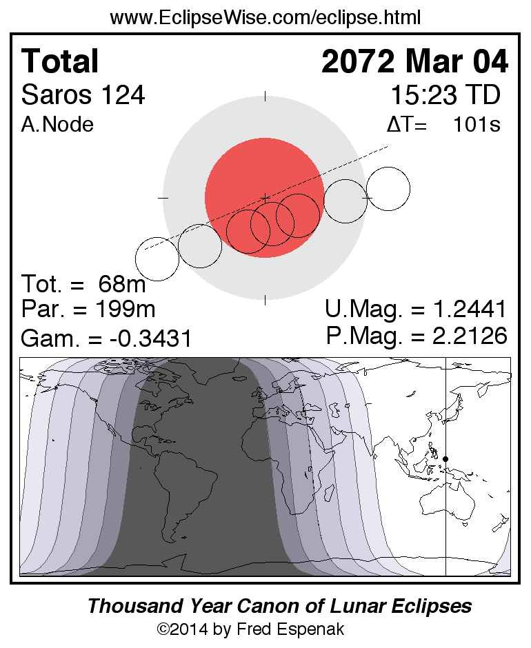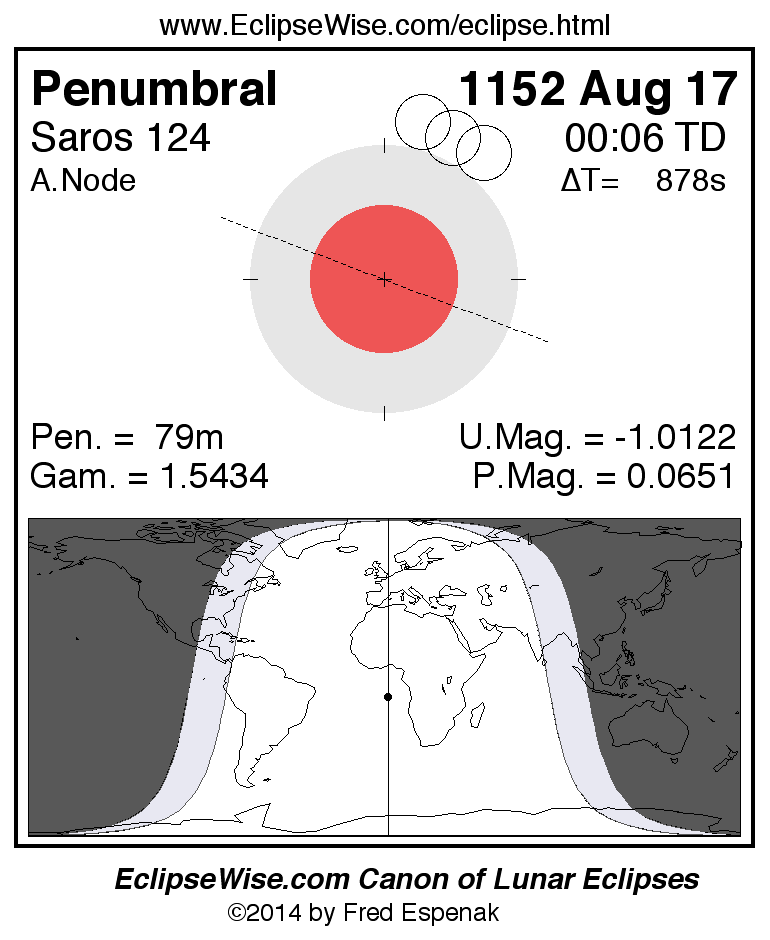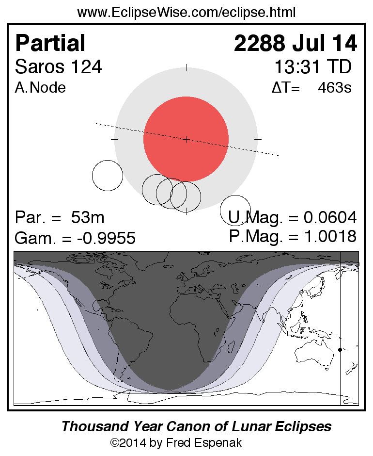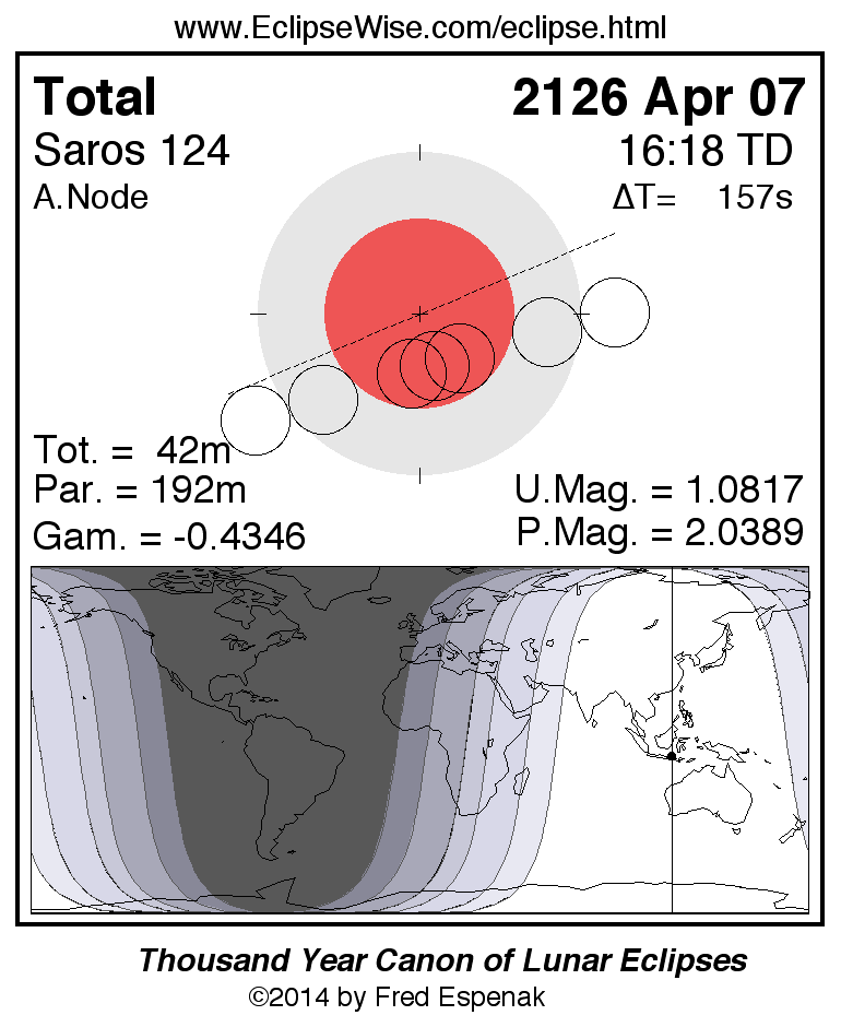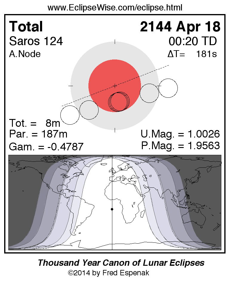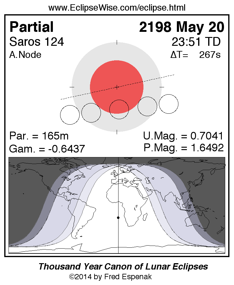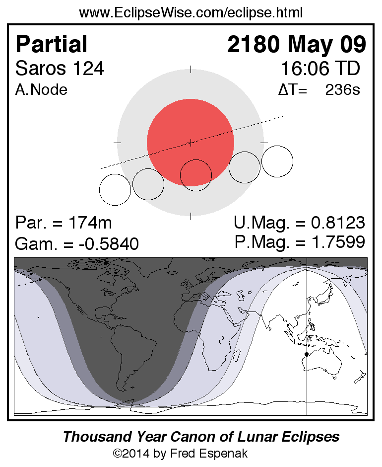 A panorama of all lunar eclipses belonging to Saros 124 is presented here. Each figure shows the Moon's path with respect to Earth's penumbral and umbral shadows. Below the path is a map depicting the geographic region of visibility for the eclipse. The date and time are given for the instant of Greatest Eclipse. Every figure serves as a hyperlink to the EclipseWise Prime page for that eclipse with a larger figure and complete details for the eclipse. Visit the Key to Lunar Eclipse Figures for a detailed explanation of these diagrams. Near the bottom of this page are a series of hyperlinks for more on lunar eclipses.