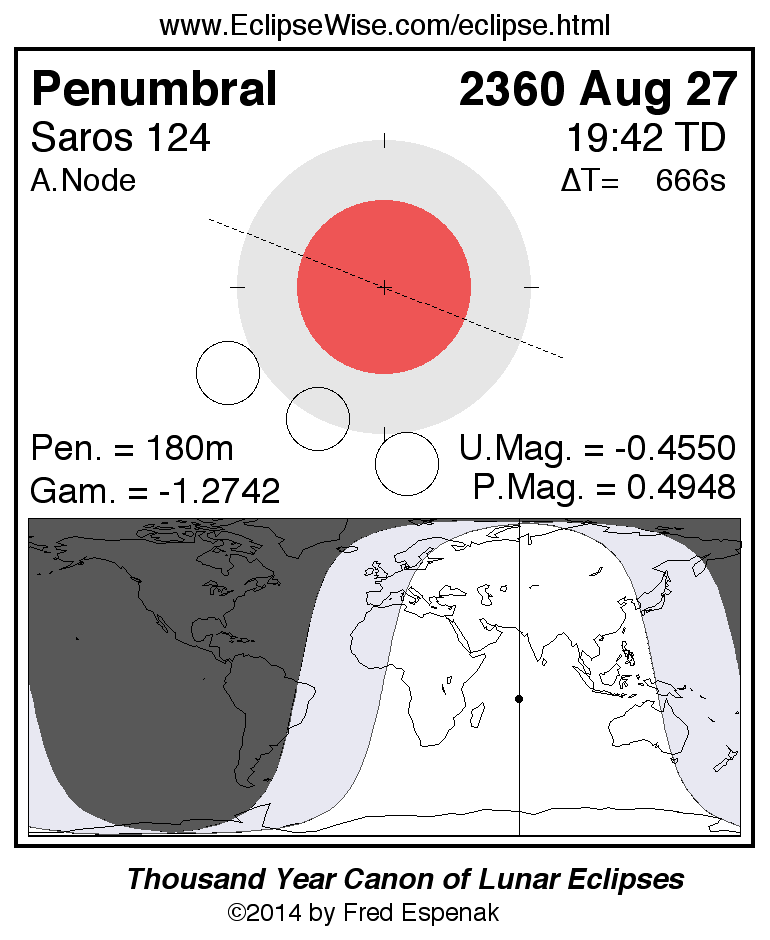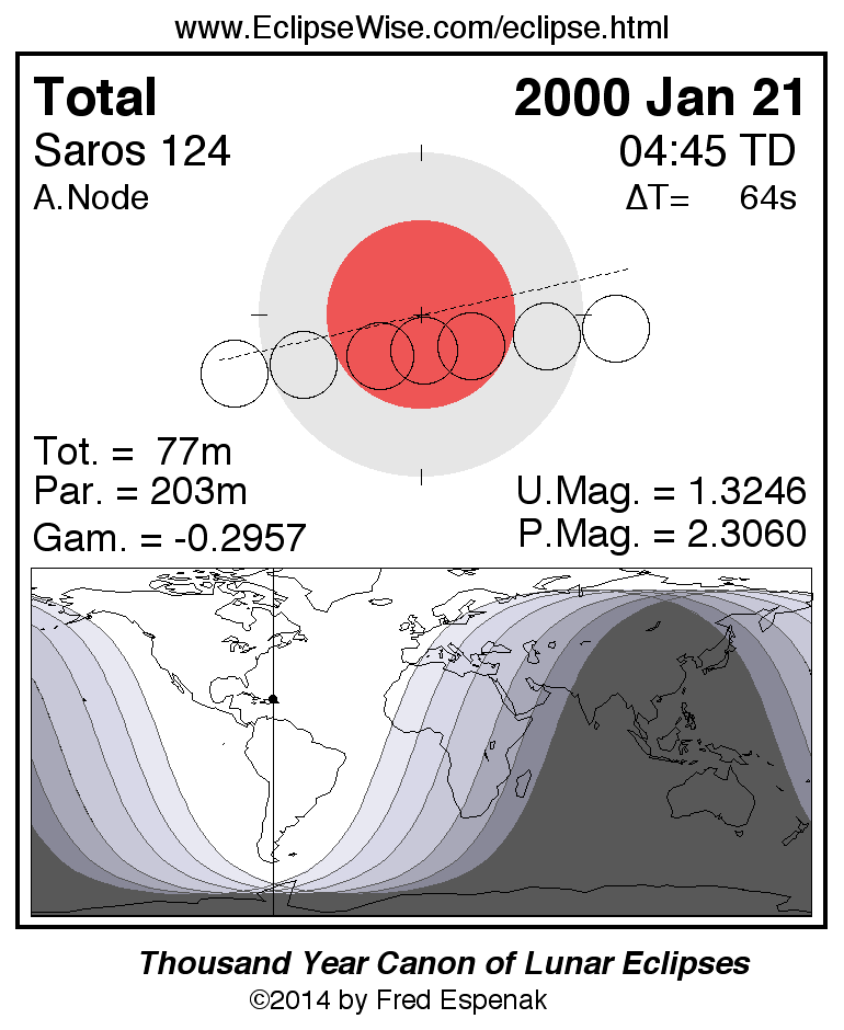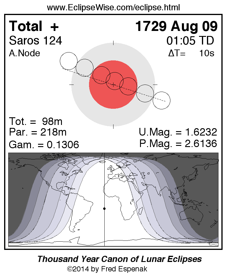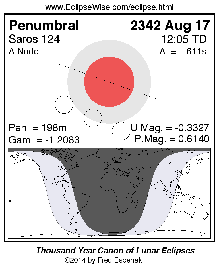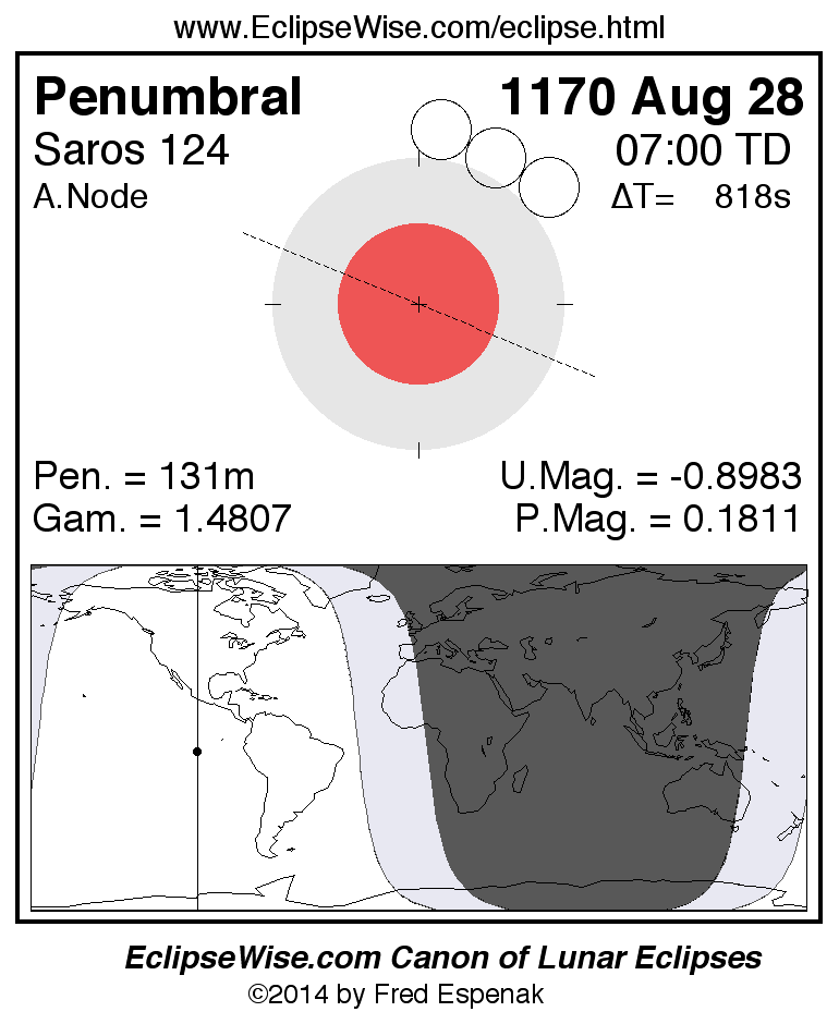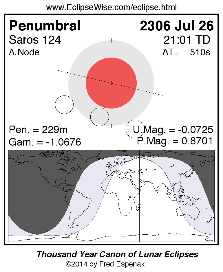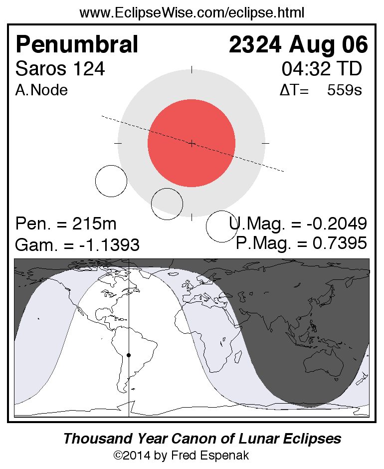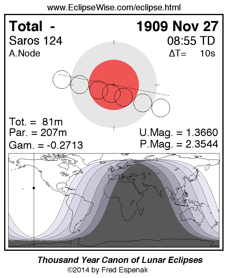 A panorama of all lunar eclipses belonging to Saros 124 is presented here. Each figure shows the Moon's path with respect to Earth's penumbral and umbral shadows. Below the path is a map depicting the geographic region of visibility for the eclipse. The date and time are given for the instant of Greatest Eclipse. Every figure serves as a hyperlink to the EclipseWise Prime page for that eclipse with a larger figure and complete details for the eclipse. Visit the Key to Lunar Eclipse Figures for a detailed explanation of these diagrams. Near the bottom of this page are a series of hyperlinks for more on lunar eclipses.