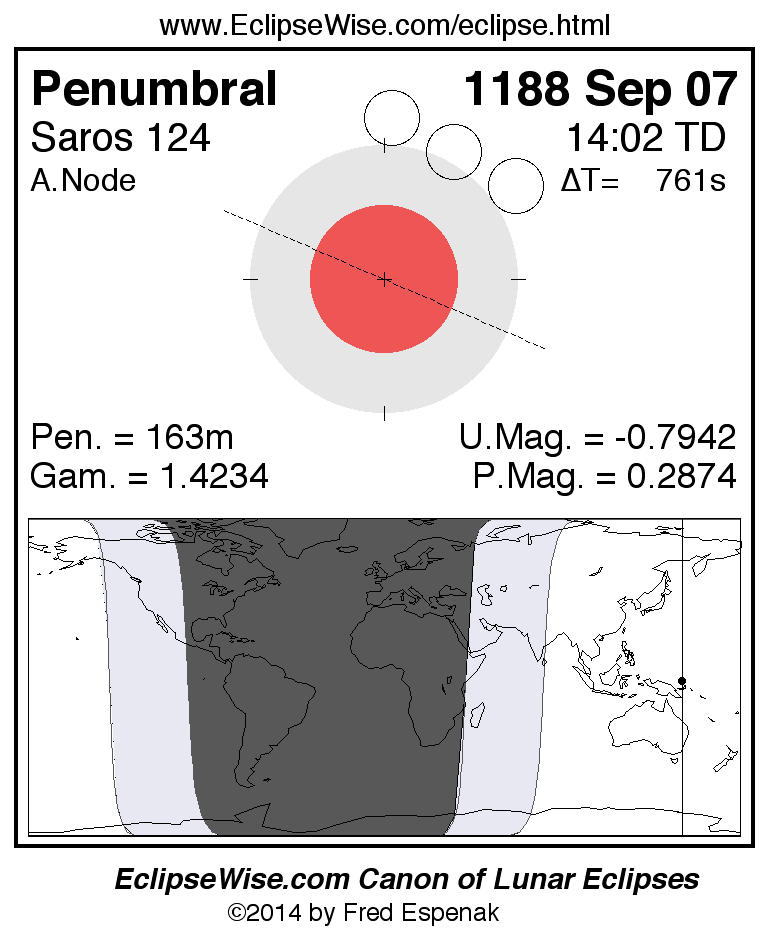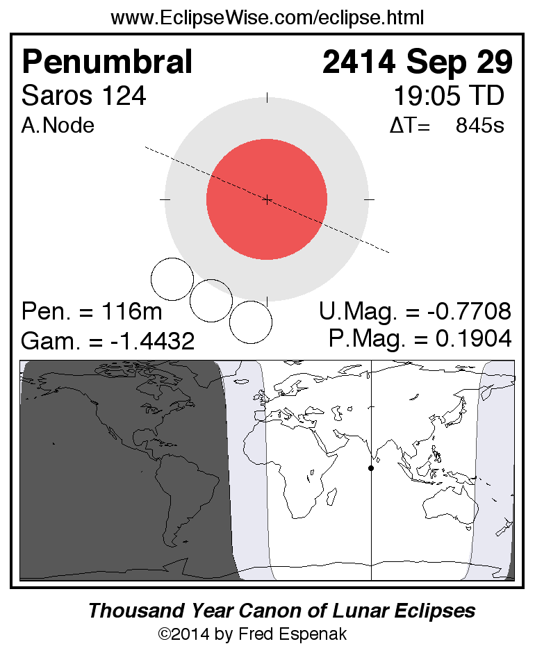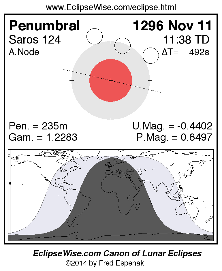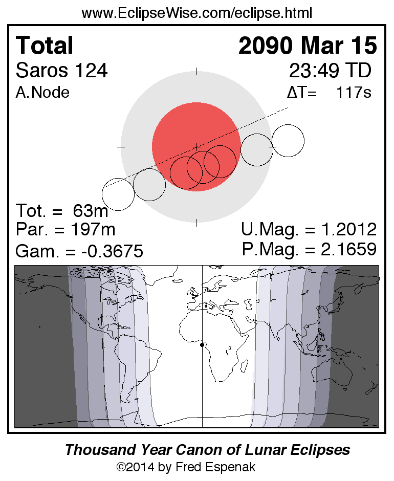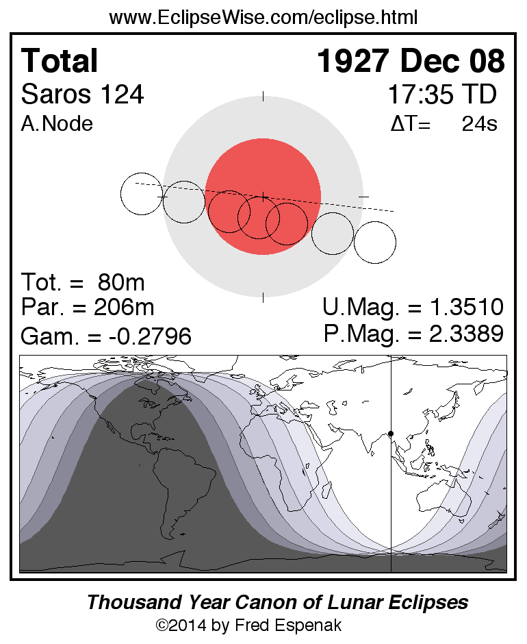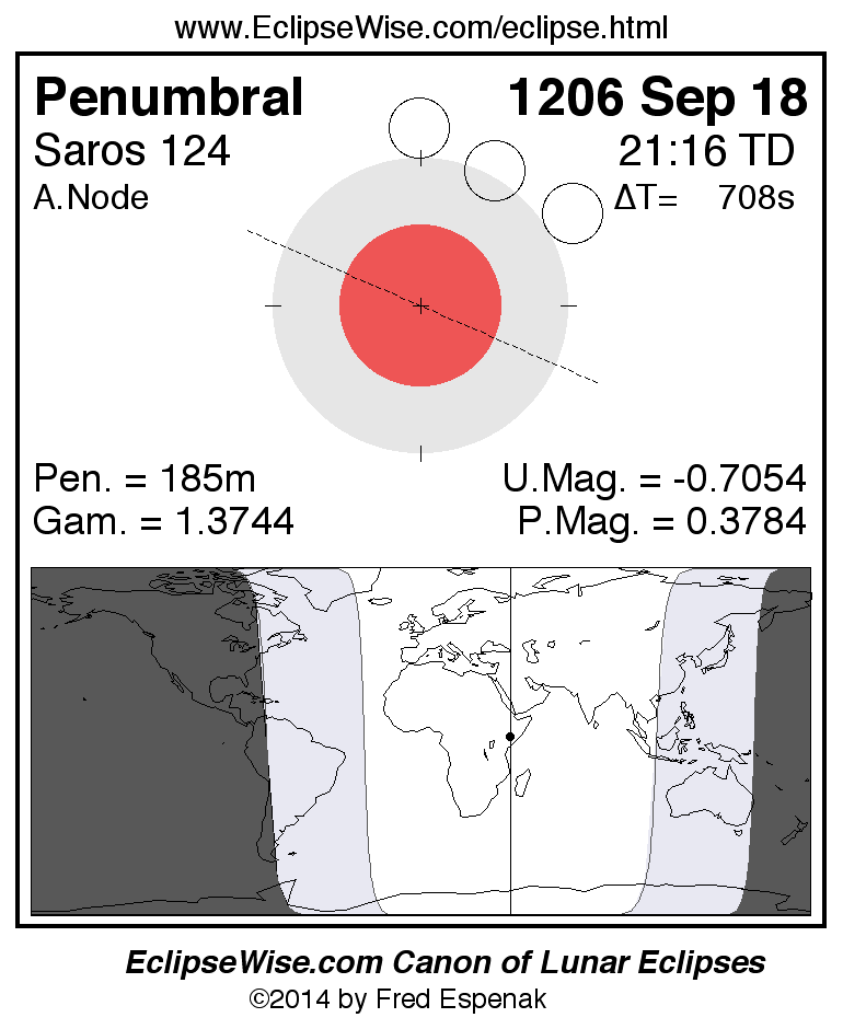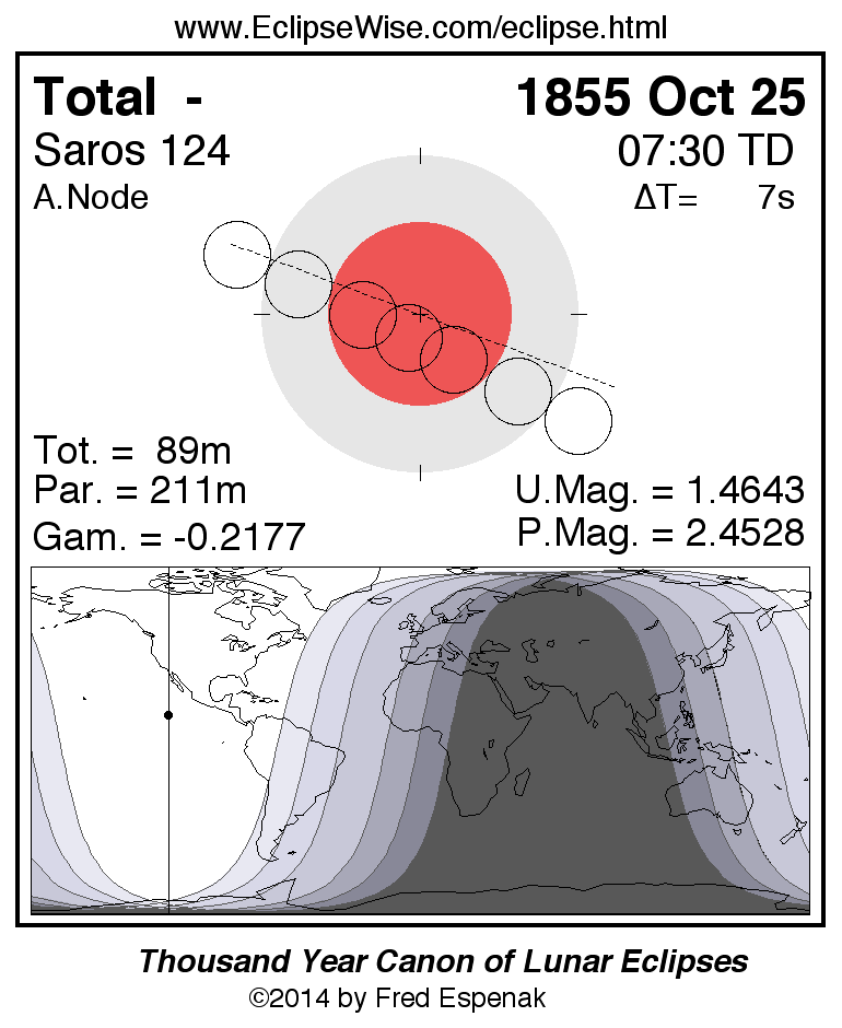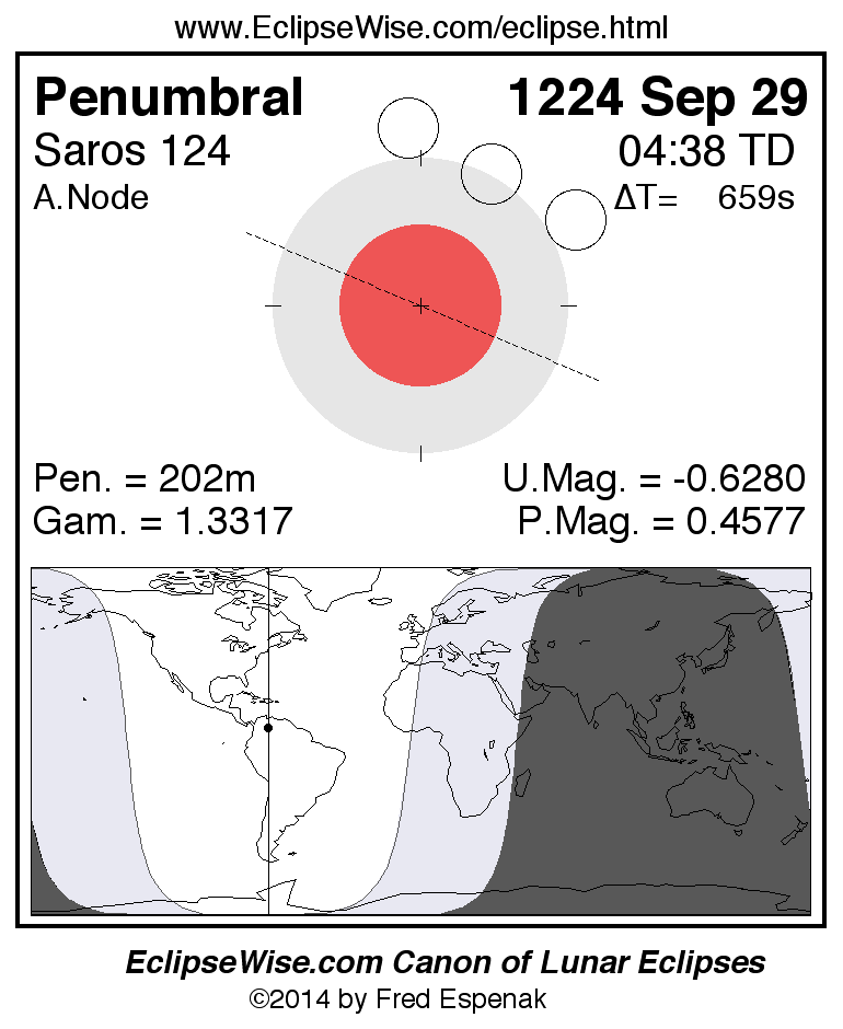 A panorama of all lunar eclipses belonging to Saros 124 is presented here. Each figure shows the Moon's path with respect to Earth's penumbral and umbral shadows. Below the path is a map depicting the geographic region of visibility for the eclipse. The date and time are given for the instant of Greatest Eclipse. Every figure serves as a hyperlink to the EclipseWise Prime page for that eclipse with a larger figure and complete details for the eclipse. Visit the Key to Lunar Eclipse Figures for a detailed explanation of these diagrams. Near the bottom of this page are a series of hyperlinks for more on lunar eclipses.