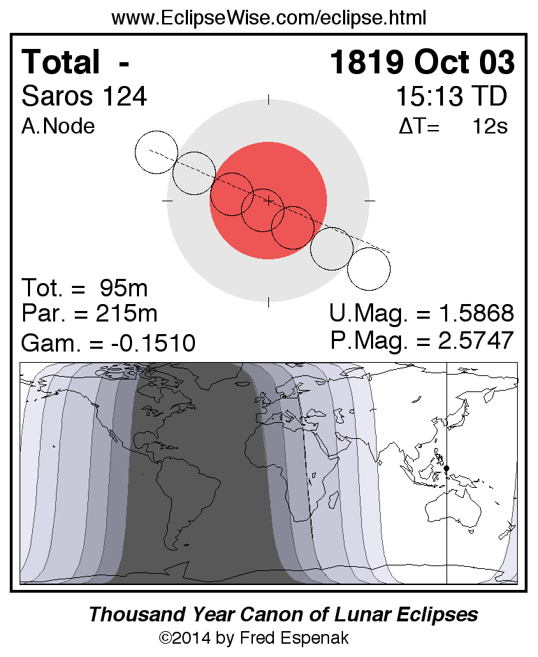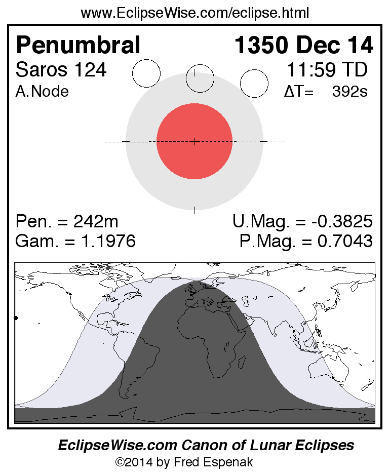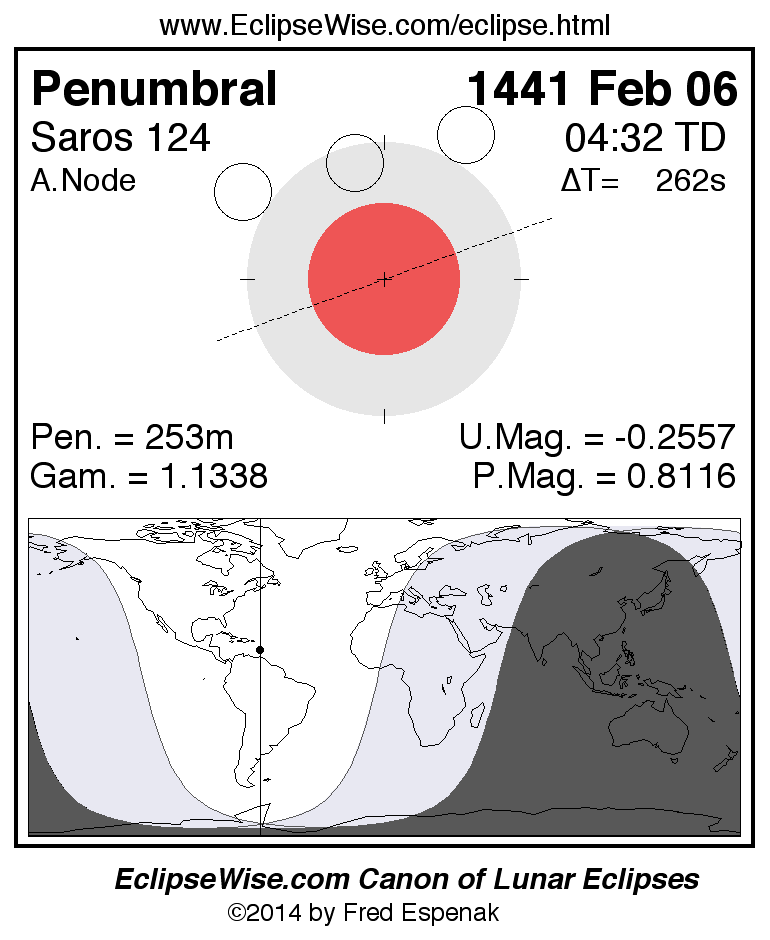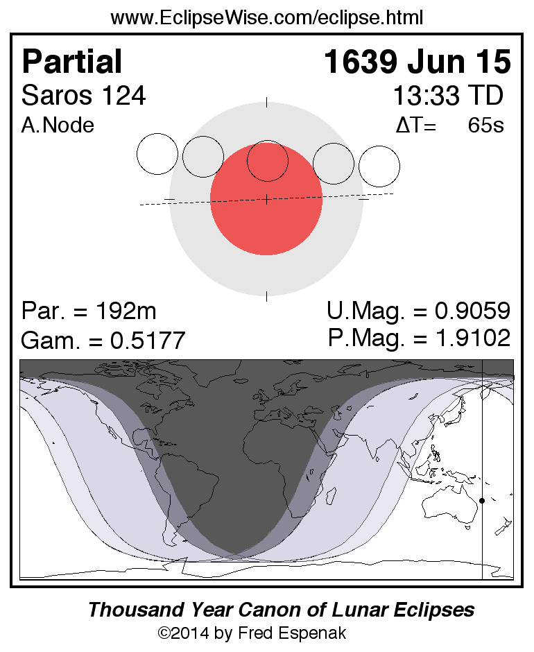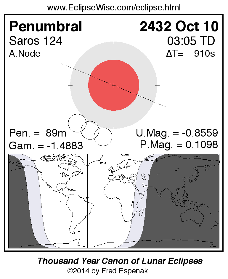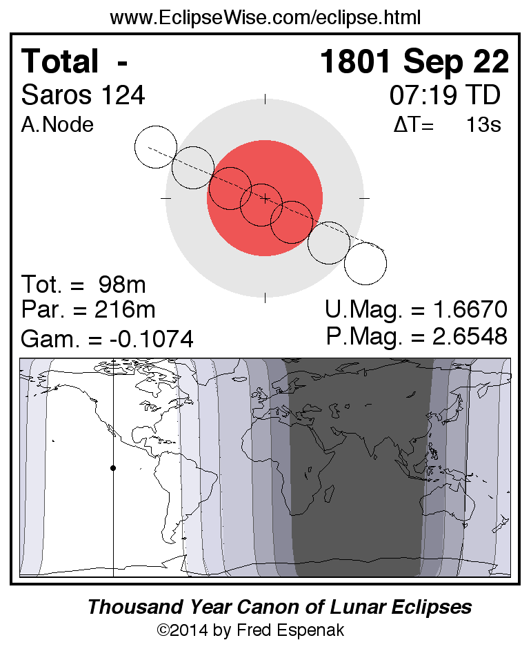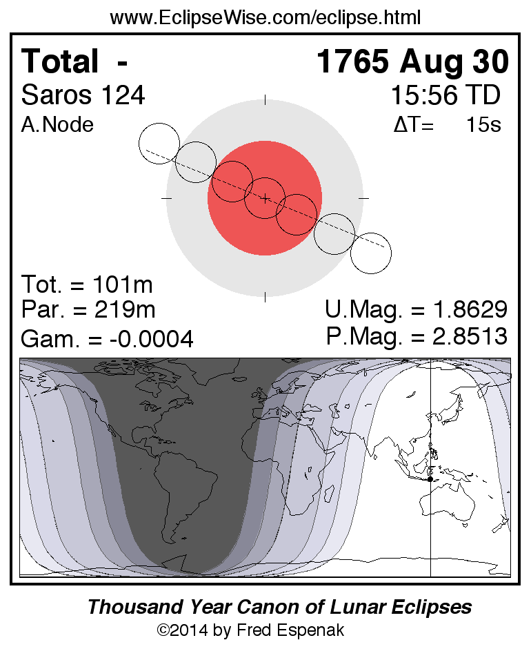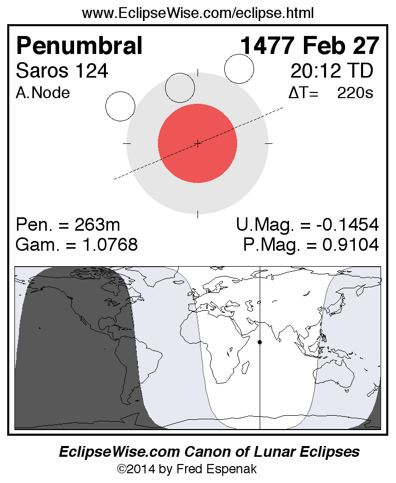 A panorama of all lunar eclipses belonging to Saros 124 is presented here. Each figure shows the Moon's path with respect to Earth's penumbral and umbral shadows. Below the path is a map depicting the geographic region of visibility for the eclipse. The date and time are given for the instant of Greatest Eclipse. Every figure serves as a hyperlink to the EclipseWise Prime page for that eclipse with a larger figure and complete details for the eclipse. Visit the Key to Lunar Eclipse Figures for a detailed explanation of these diagrams. Near the bottom of this page are a series of hyperlinks for more on lunar eclipses.