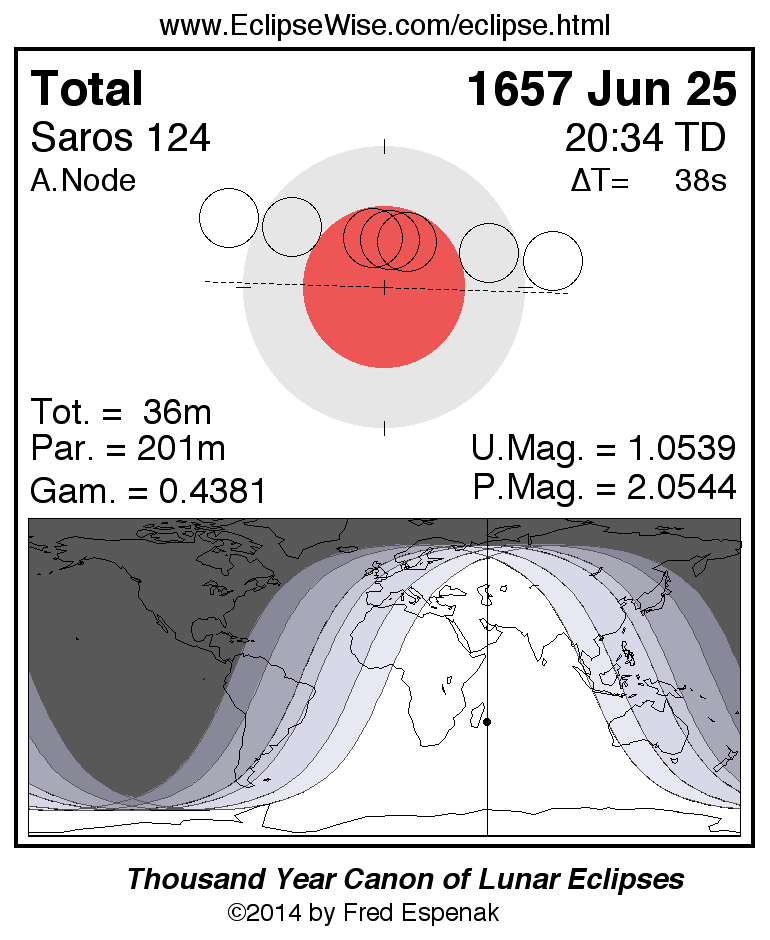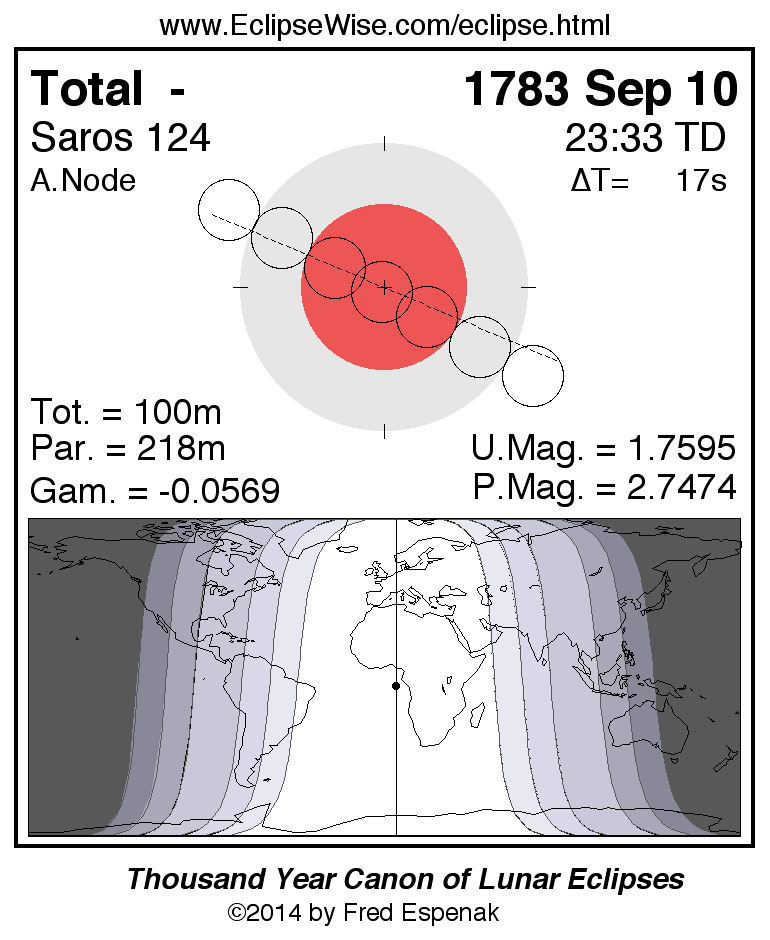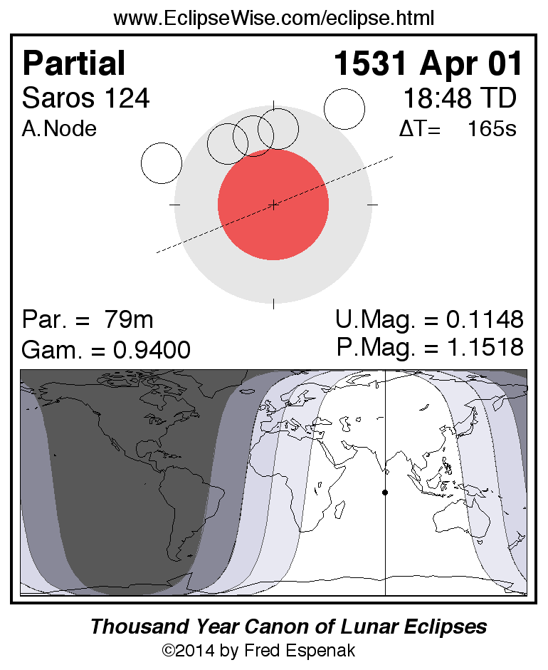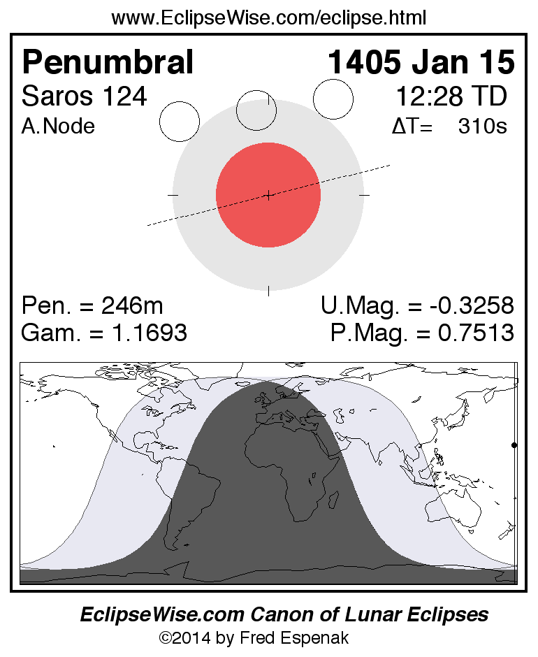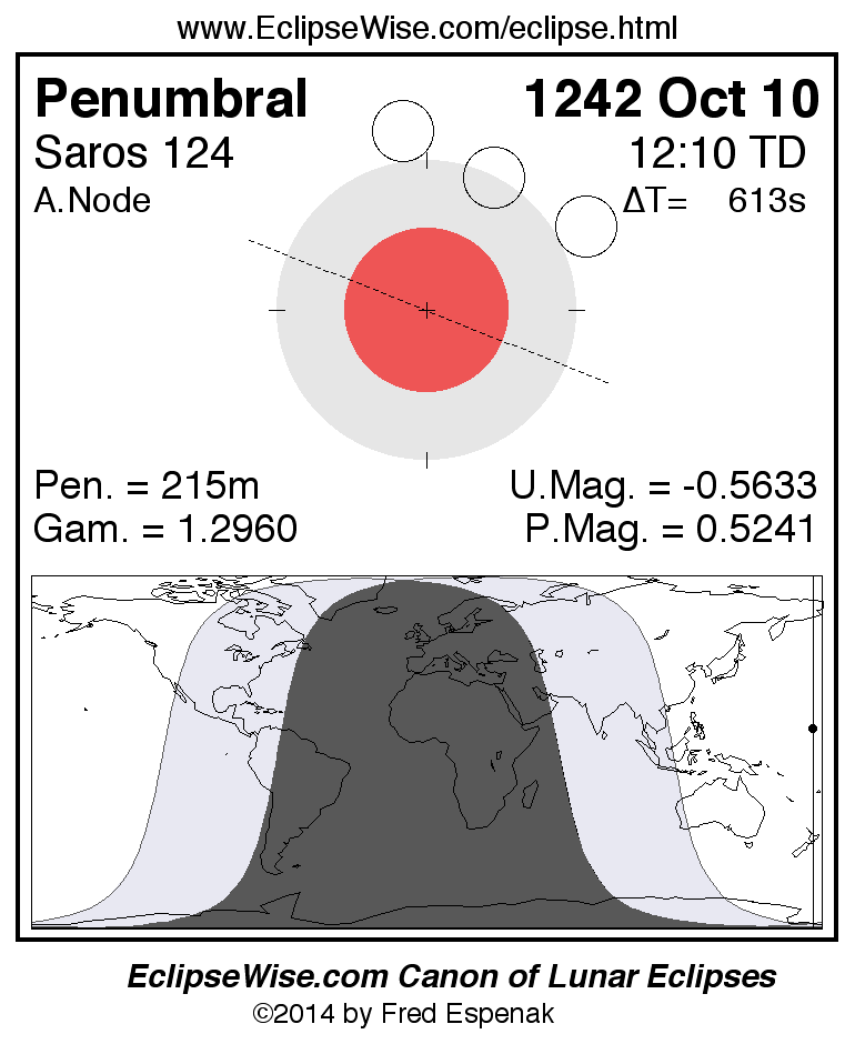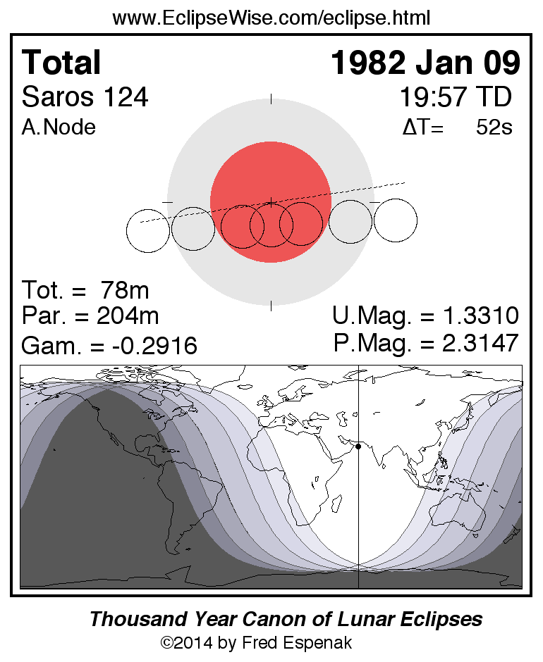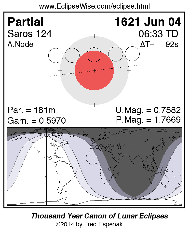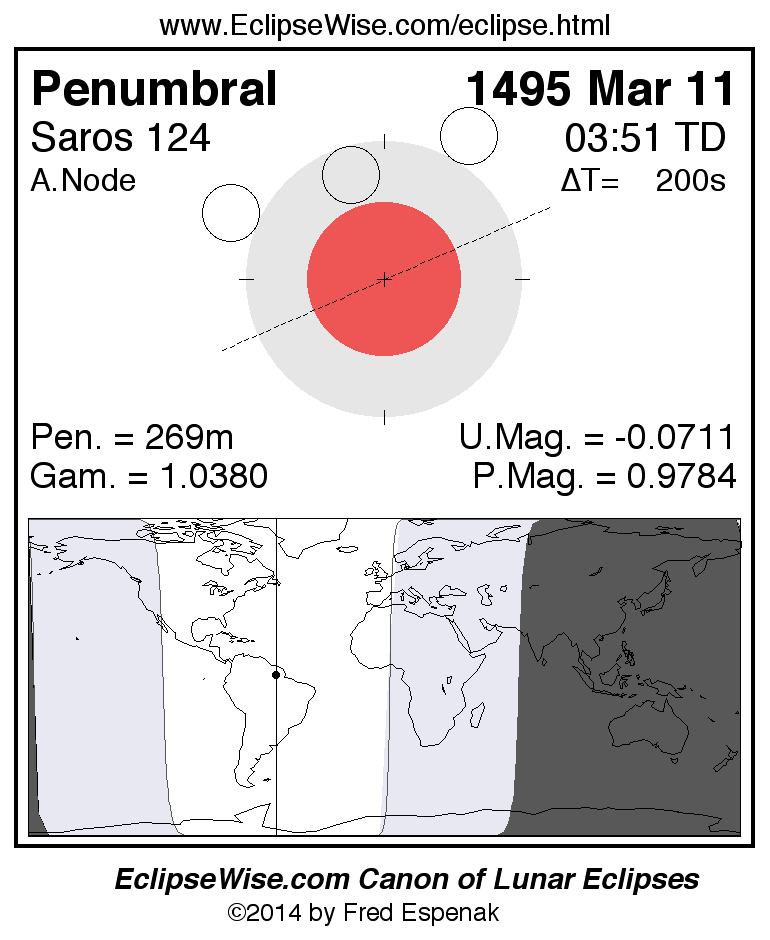 A panorama of all lunar eclipses belonging to Saros 124 is presented here. Each figure shows the Moon's path with respect to Earth's penumbral and umbral shadows. Below the path is a map depicting the geographic region of visibility for the eclipse. The date and time are given for the instant of Greatest Eclipse. Every figure serves as a hyperlink to the EclipseWise Prime page for that eclipse with a larger figure and complete details for the eclipse. Visit the Key to Lunar Eclipse Figures for a detailed explanation of these diagrams. Near the bottom of this page are a series of hyperlinks for more on lunar eclipses.