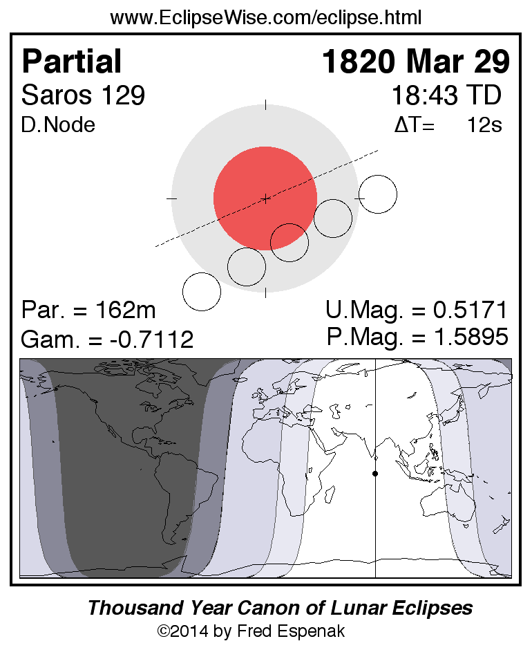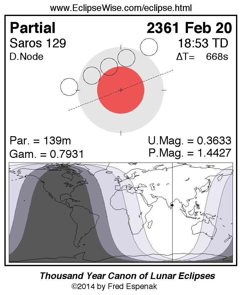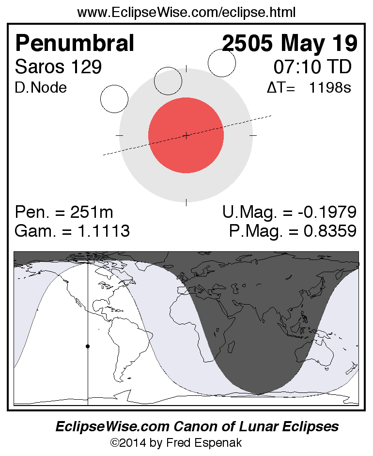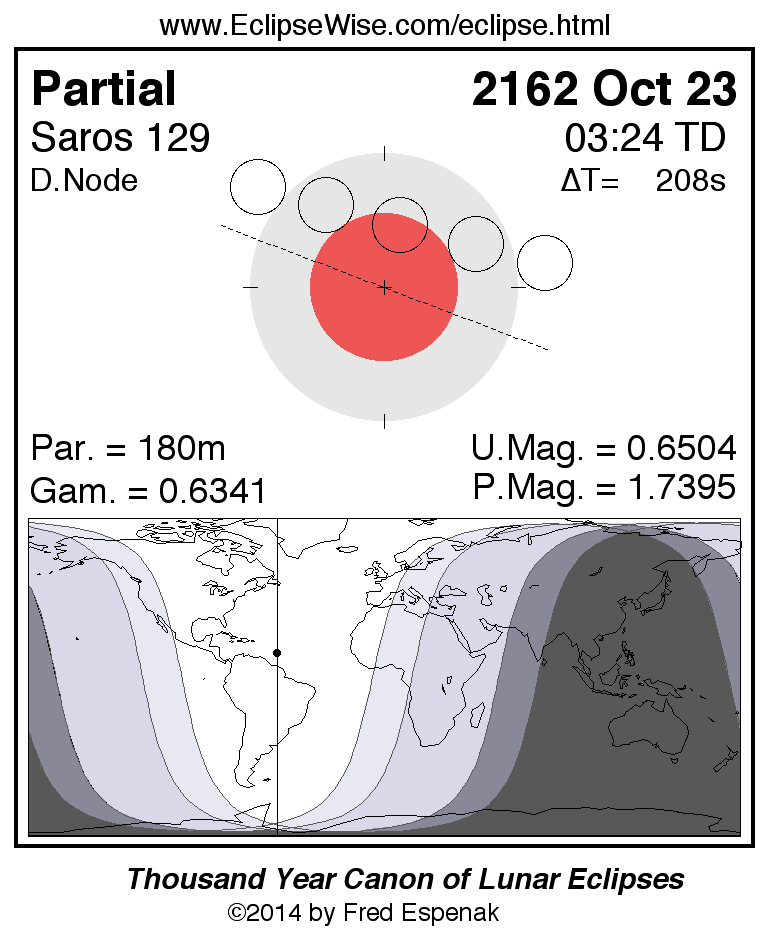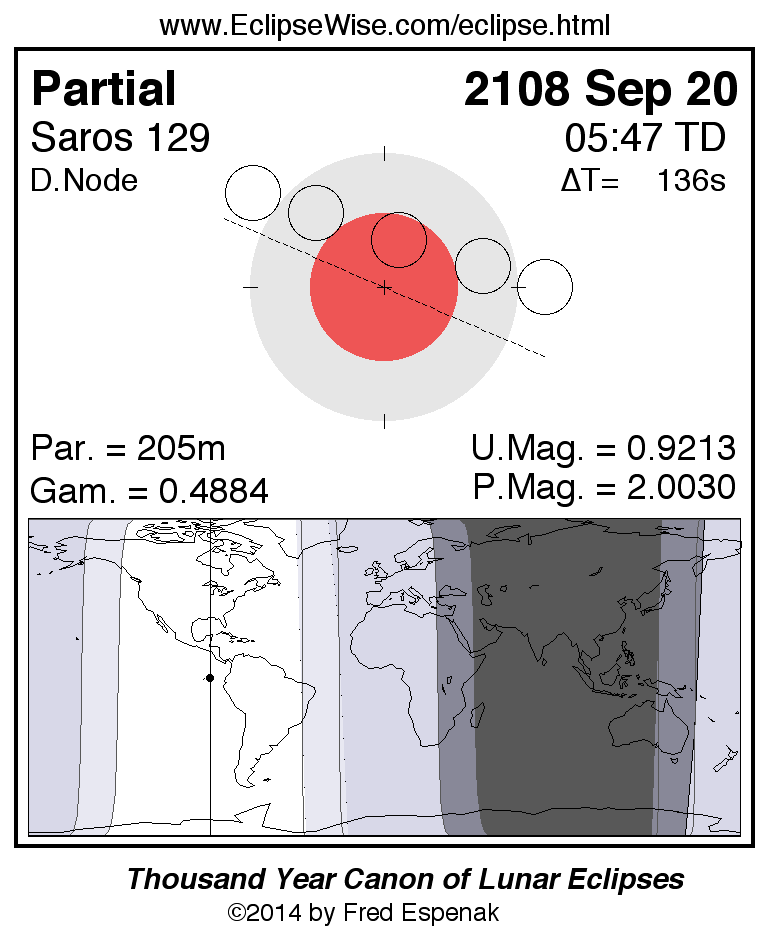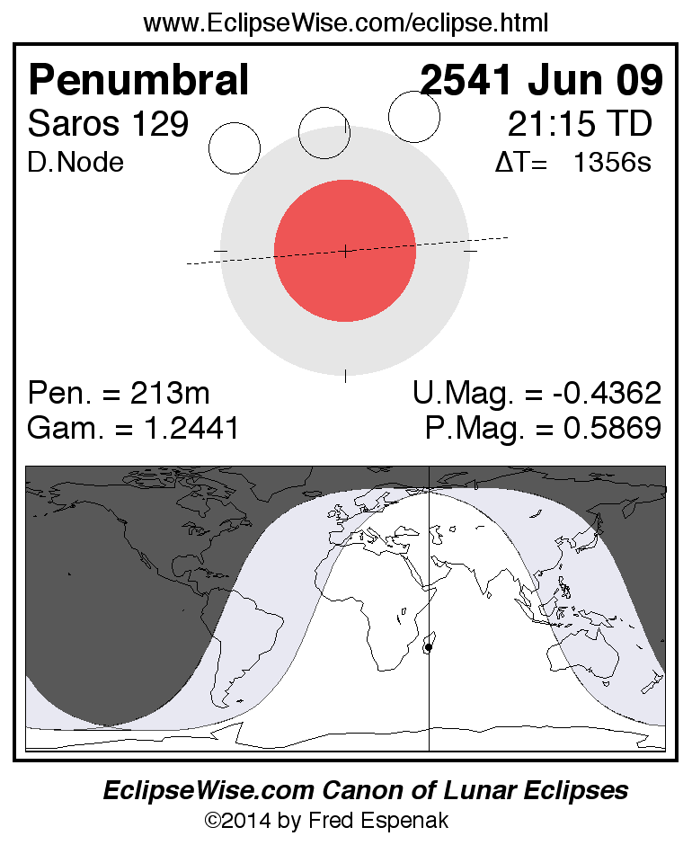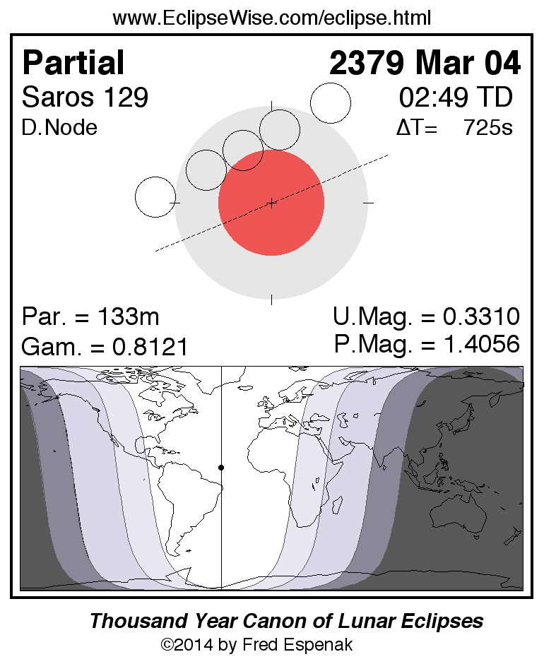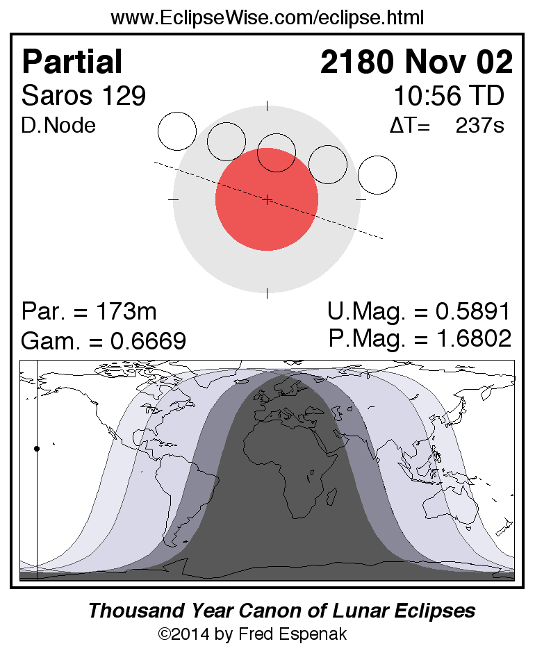 A panorama of all lunar eclipses belonging to Saros 129 is presented here. Each figure shows the Moon's path with respect to Earth's penumbral and umbral shadows. Below the path is a map depicting the geographic region of visibility for the eclipse. The date and time are given for the instant of Greatest Eclipse. Every figure serves as a hyperlink to the EclipseWise Prime page for that eclipse with a larger figure and complete details for the eclipse. Visit the Key to Lunar Eclipse Figures for a detailed explanation of these diagrams. Near the bottom of this page are a series of hyperlinks for more on lunar eclipses.