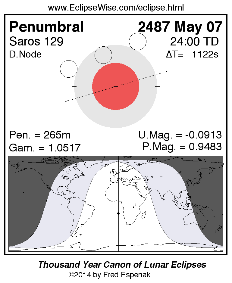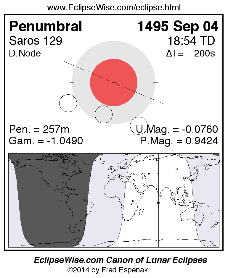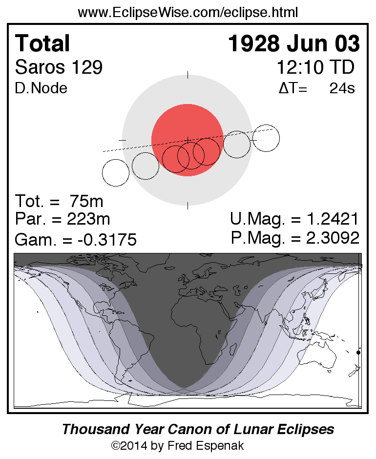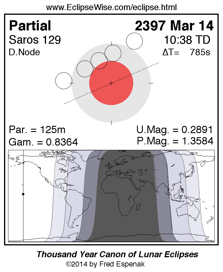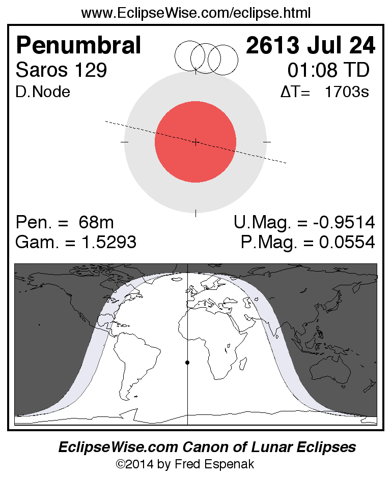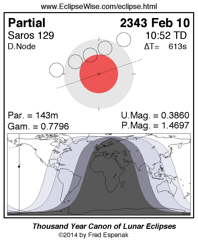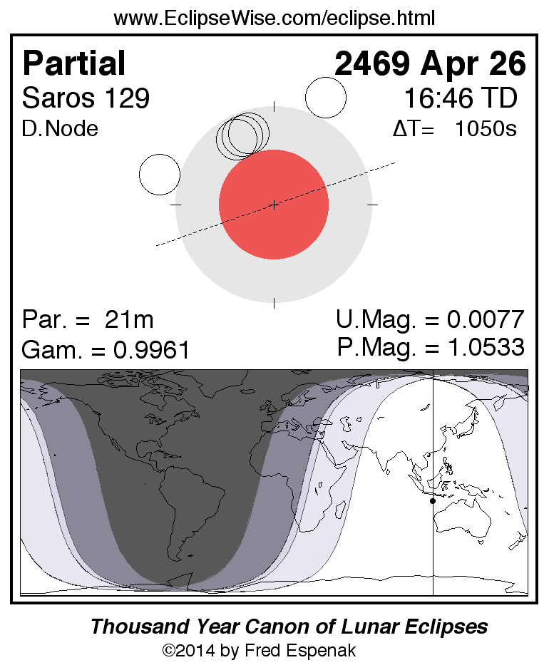 A panorama of all lunar eclipses belonging to Saros 129 is presented here. Each figure shows the Moon's path with respect to Earth's penumbral and umbral shadows. Below the path is a map depicting the geographic region of visibility for the eclipse. The date and time are given for the instant of Greatest Eclipse. Every figure serves as a hyperlink to the EclipseWise Prime page for that eclipse with a larger figure and complete details for the eclipse. Visit the Key to Lunar Eclipse Figures for a detailed explanation of these diagrams. Near the bottom of this page are a series of hyperlinks for more on lunar eclipses.