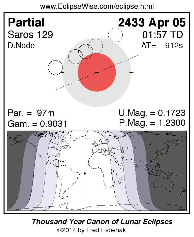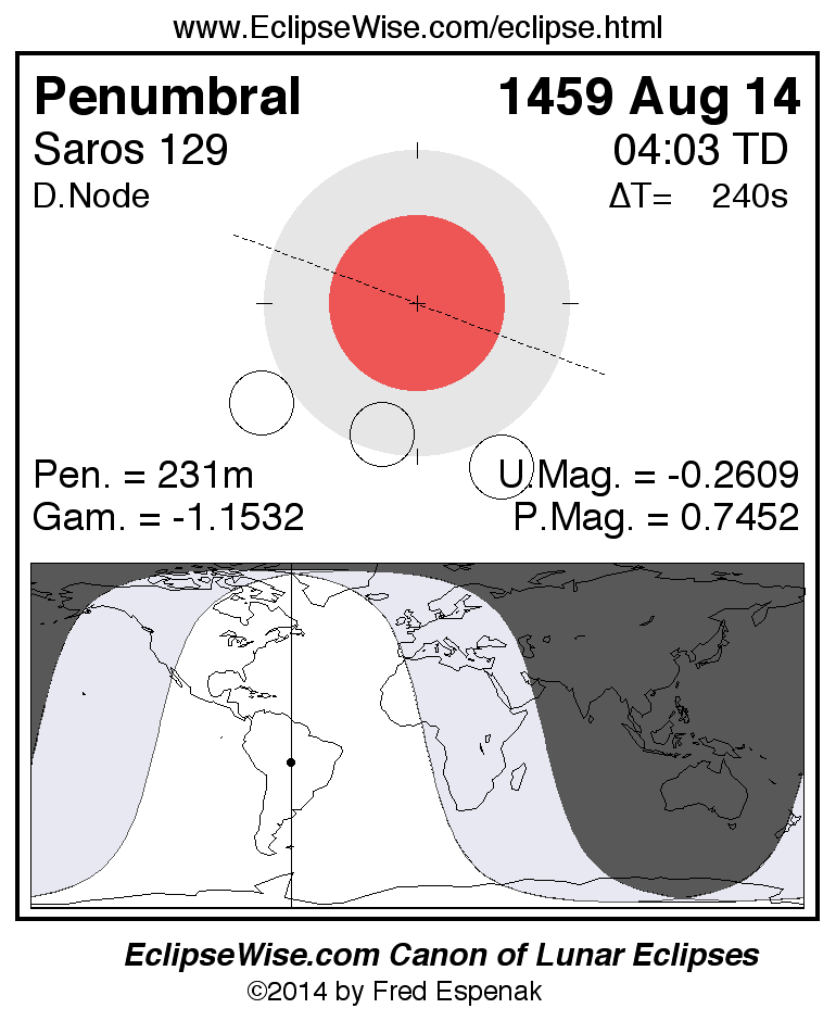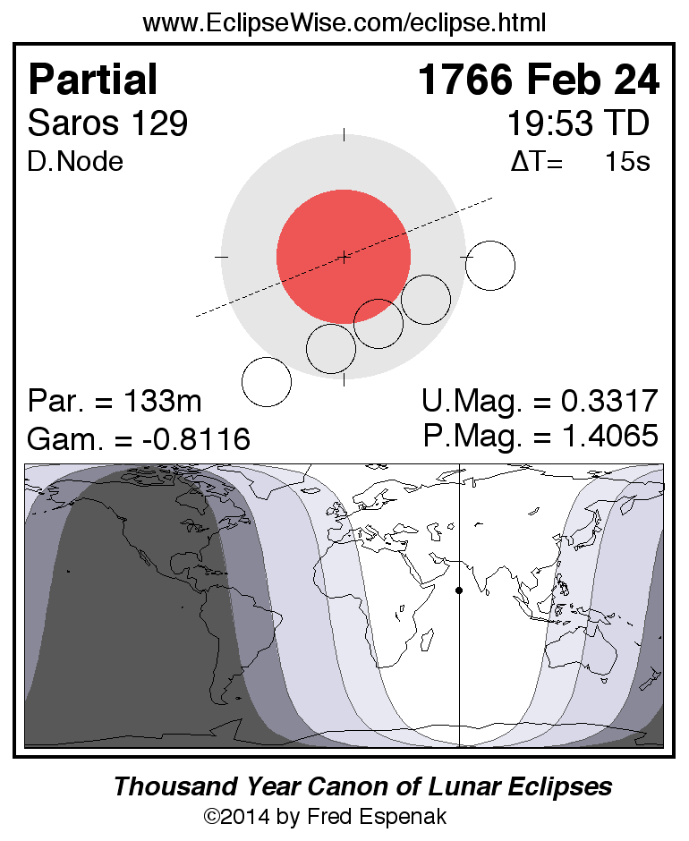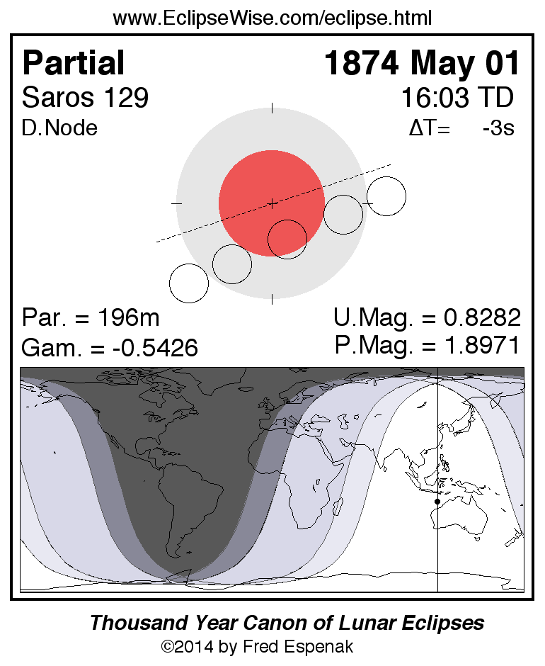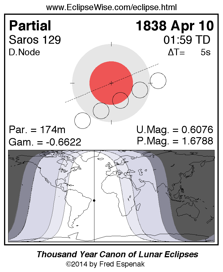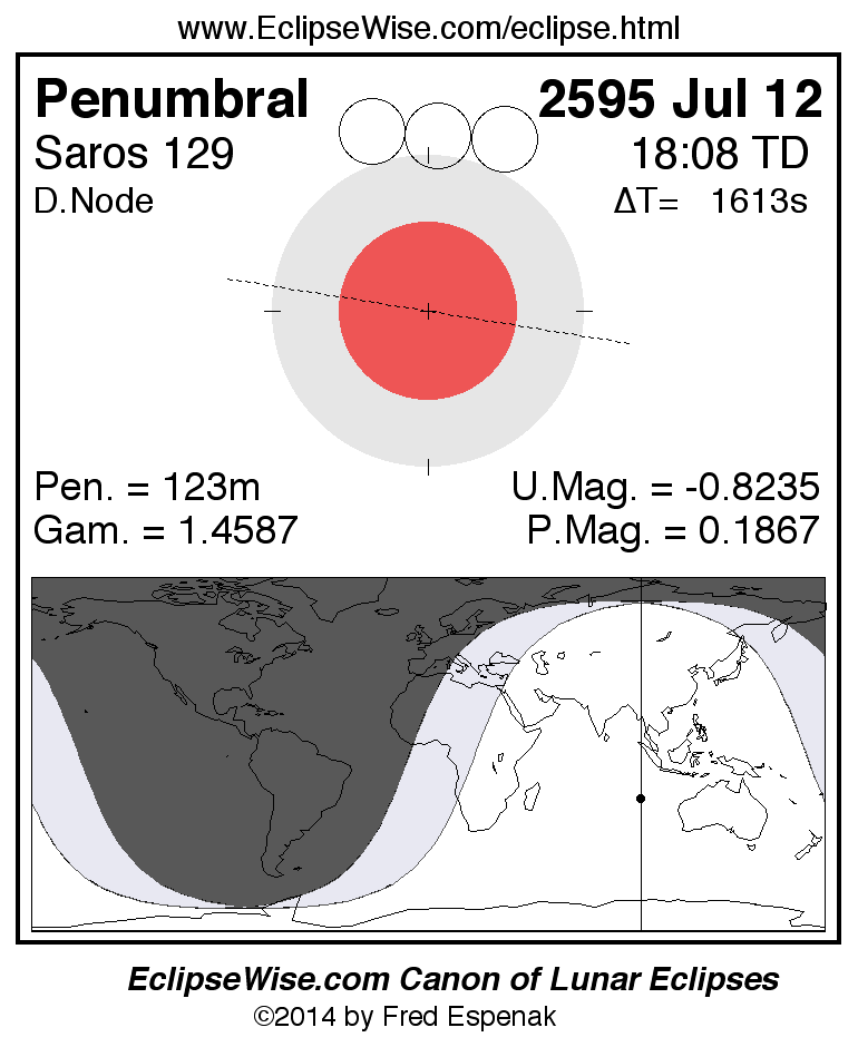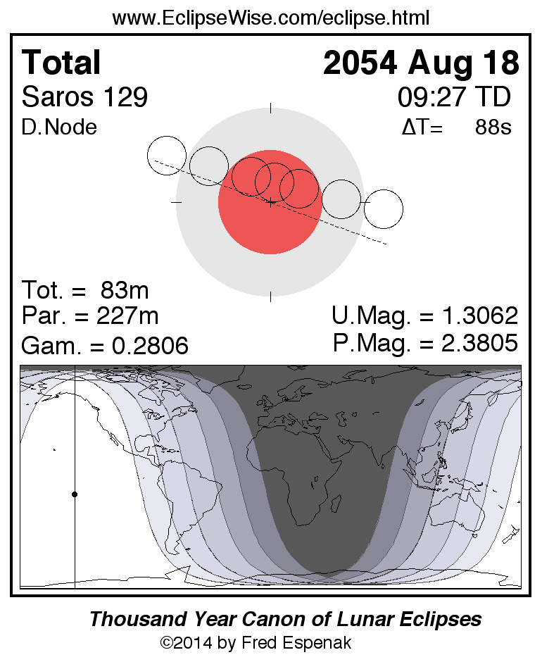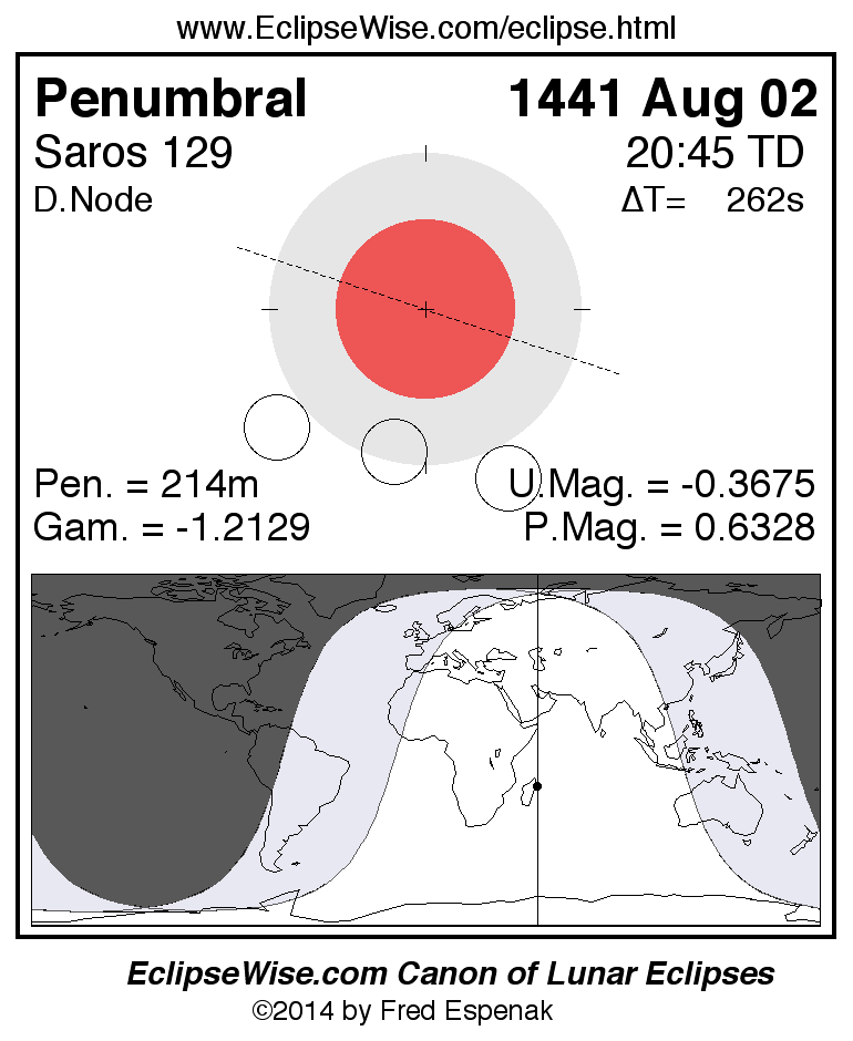 A panorama of all lunar eclipses belonging to Saros 129 is presented here. Each figure shows the Moon's path with respect to Earth's penumbral and umbral shadows. Below the path is a map depicting the geographic region of visibility for the eclipse. The date and time are given for the instant of Greatest Eclipse. Every figure serves as a hyperlink to the EclipseWise Prime page for that eclipse with a larger figure and complete details for the eclipse. Visit the Key to Lunar Eclipse Figures for a detailed explanation of these diagrams. Near the bottom of this page are a series of hyperlinks for more on lunar eclipses.
