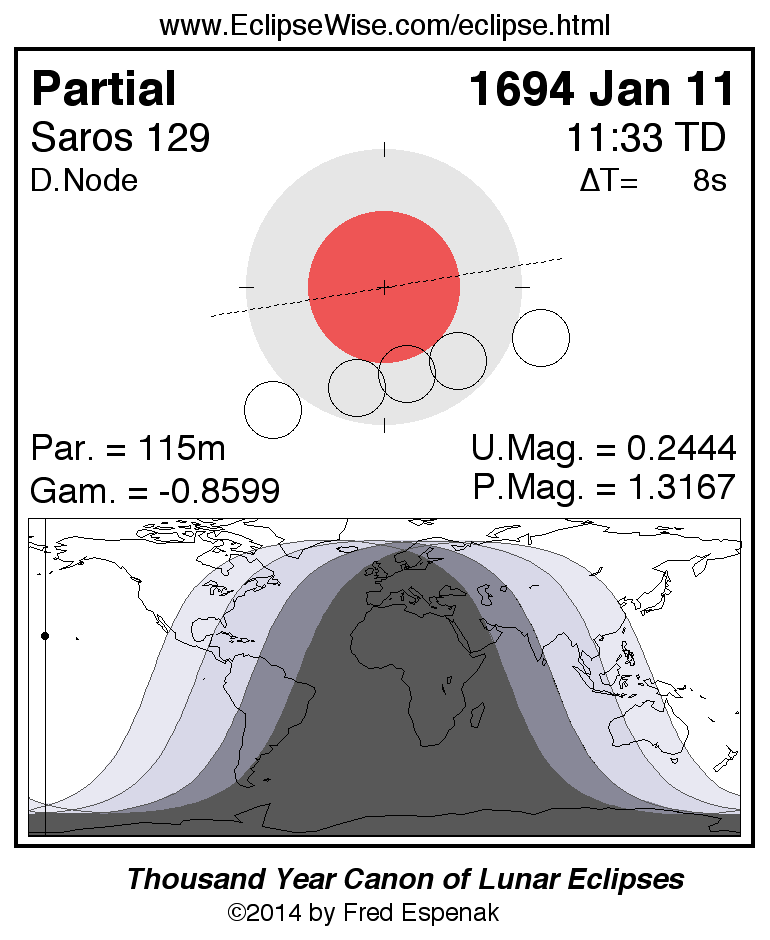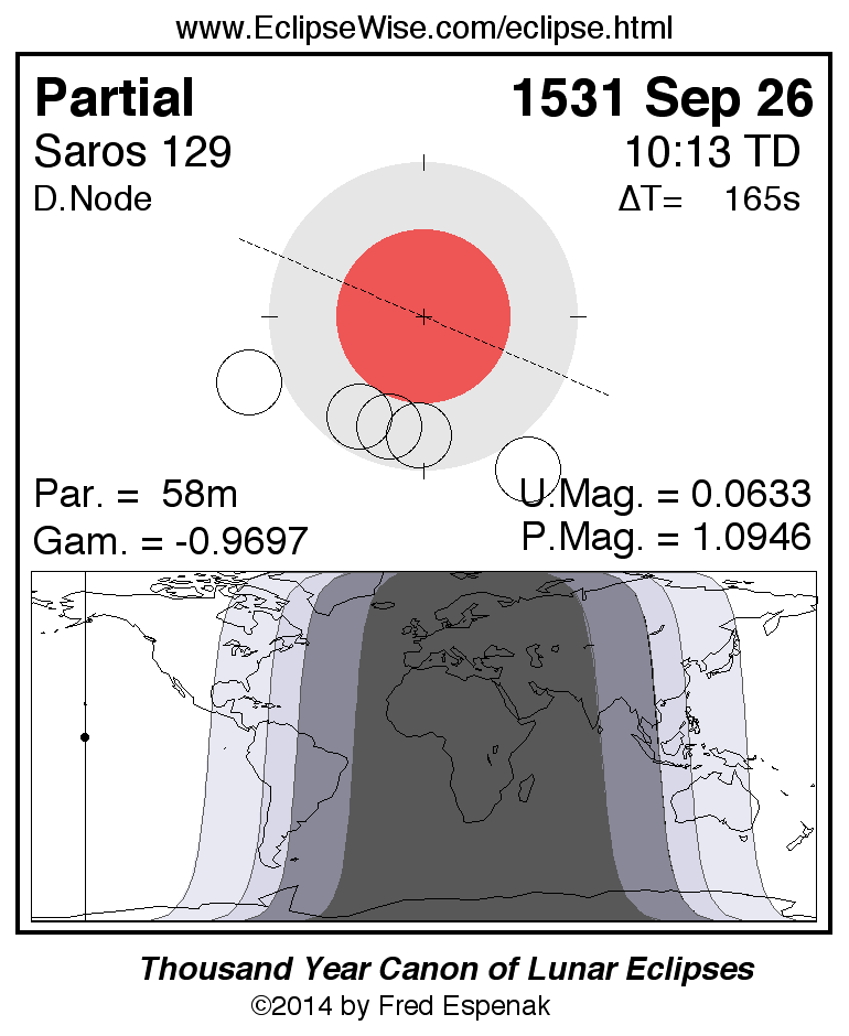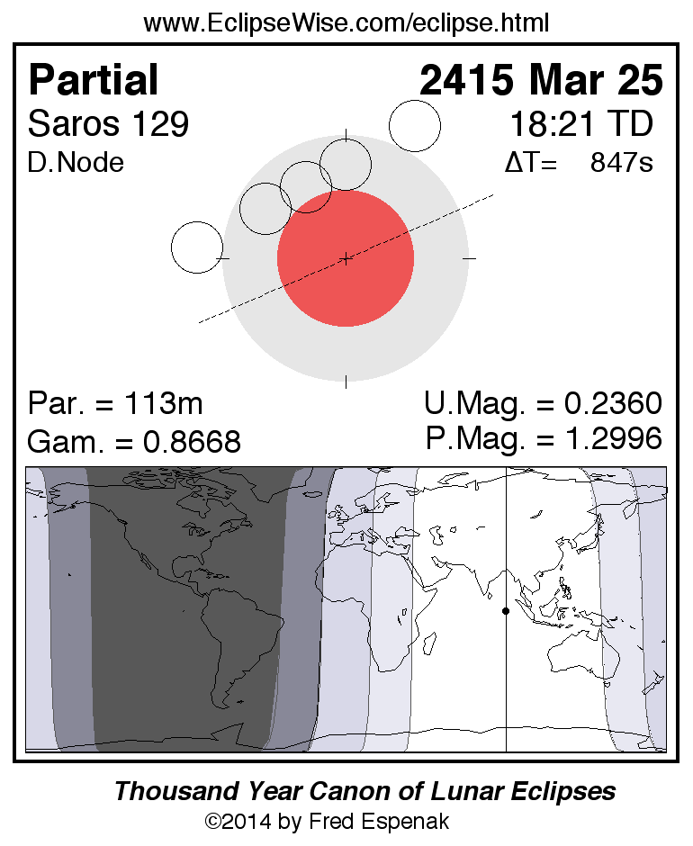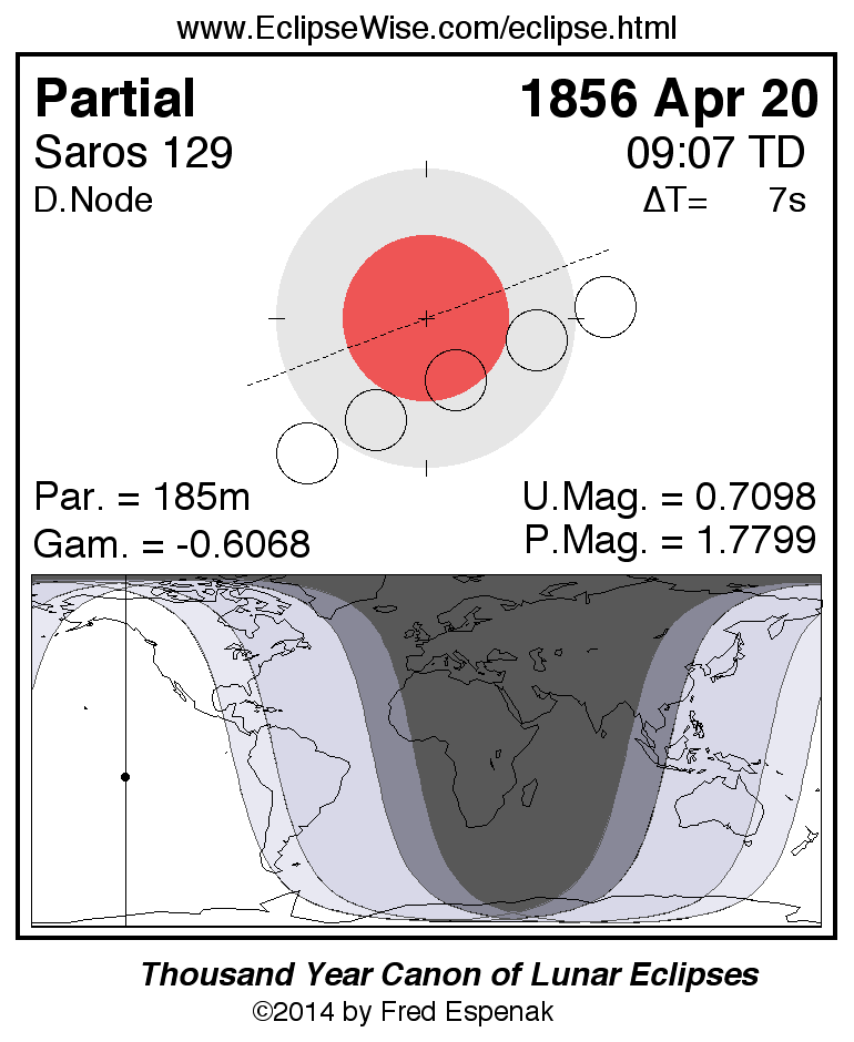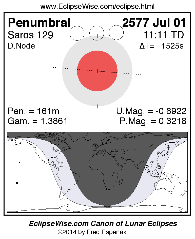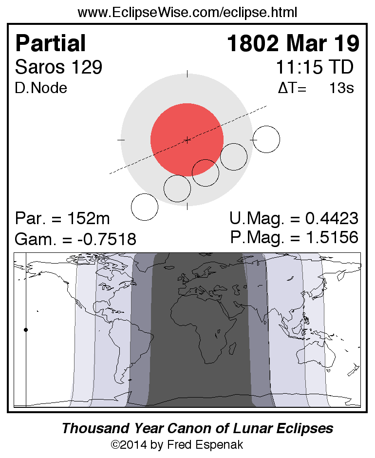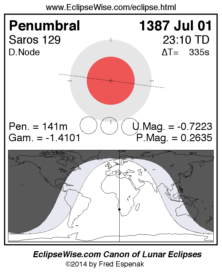 A panorama of all lunar eclipses belonging to Saros 129 is presented here. Each figure shows the Moon's path with respect to Earth's penumbral and umbral shadows. Below the path is a map depicting the geographic region of visibility for the eclipse. The date and time are given for the instant of Greatest Eclipse. Every figure serves as a hyperlink to the EclipseWise Prime page for that eclipse with a larger figure and complete details for the eclipse. Visit the Key to Lunar Eclipse Figures for a detailed explanation of these diagrams. Near the bottom of this page are a series of hyperlinks for more on lunar eclipses.