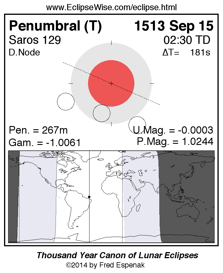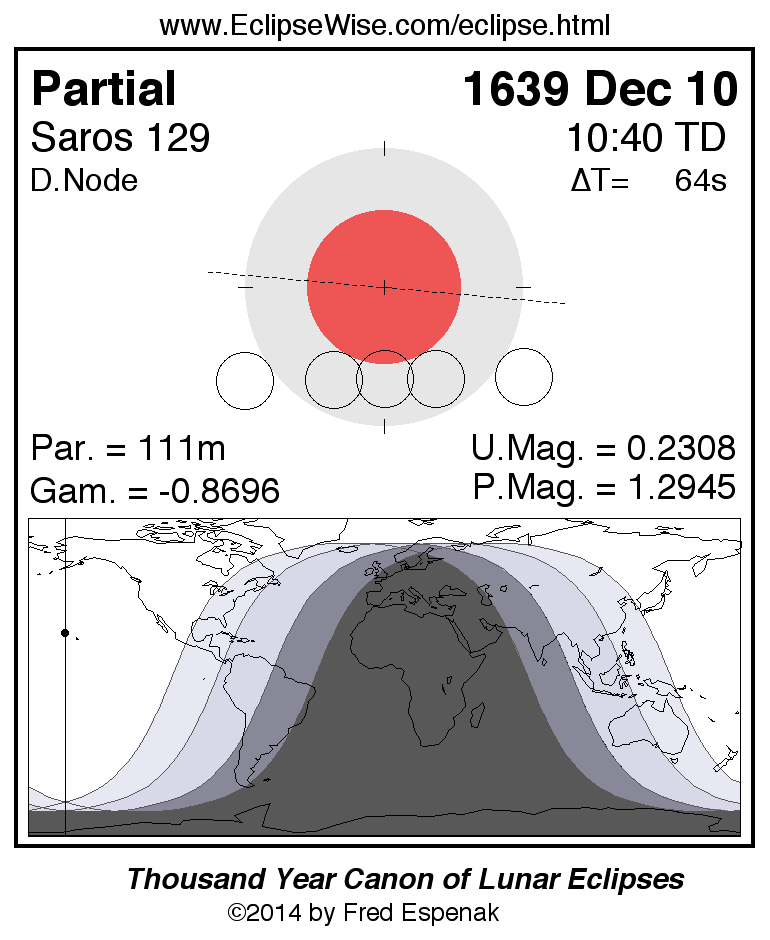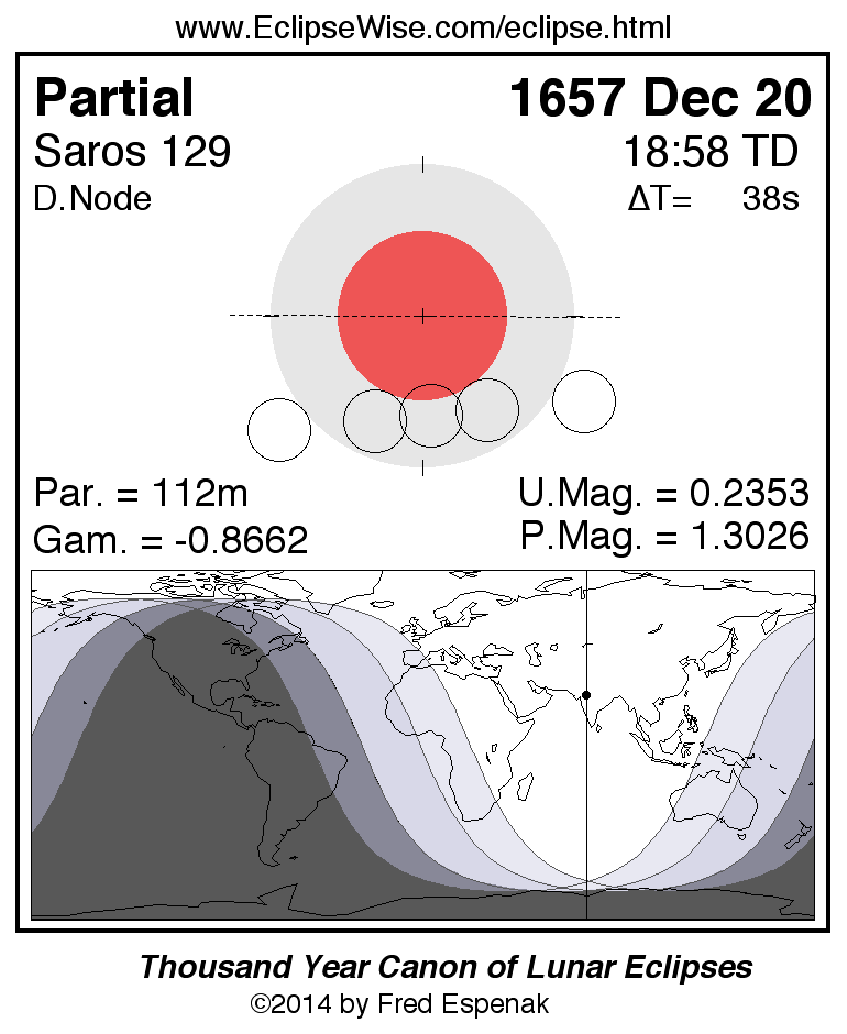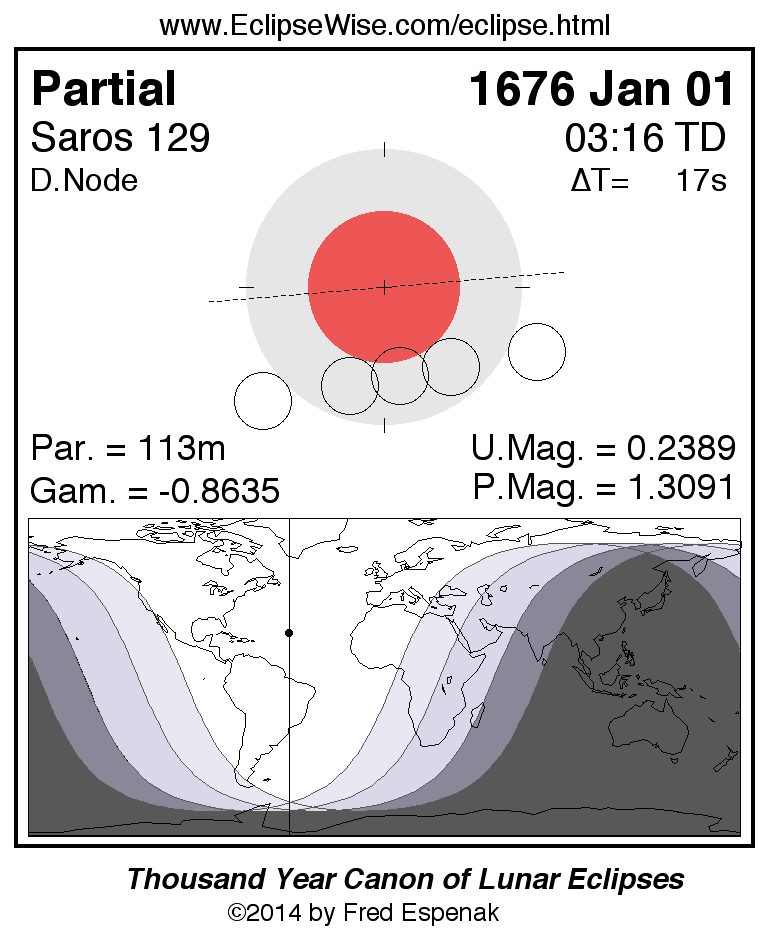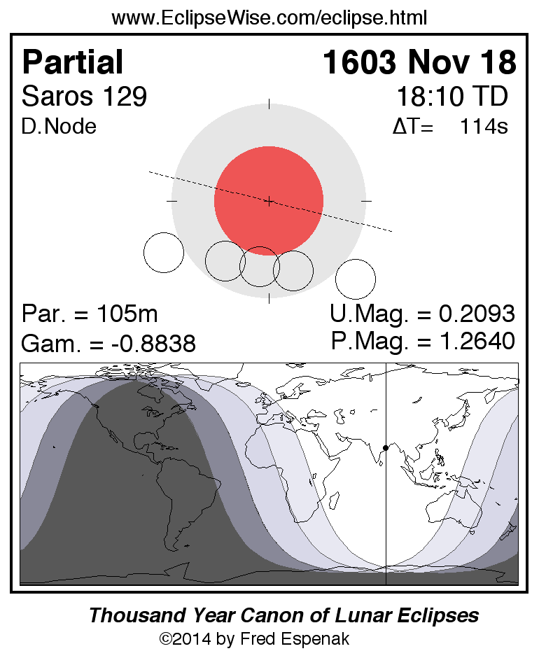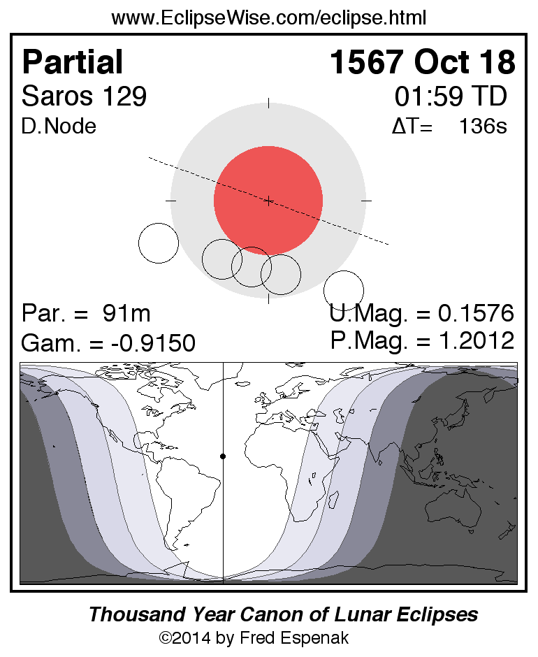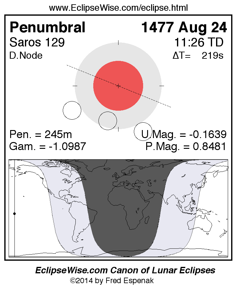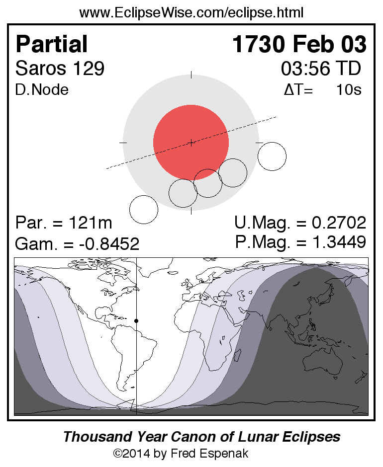 A panorama of all lunar eclipses belonging to Saros 129 is presented here. Each figure shows the Moon's path with respect to Earth's penumbral and umbral shadows. Below the path is a map depicting the geographic region of visibility for the eclipse. The date and time are given for the instant of Greatest Eclipse. Every figure serves as a hyperlink to the EclipseWise Prime page for that eclipse with a larger figure and complete details for the eclipse. Visit the Key to Lunar Eclipse Figures for a detailed explanation of these diagrams. Near the bottom of this page are a series of hyperlinks for more on lunar eclipses.