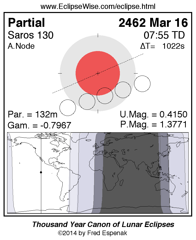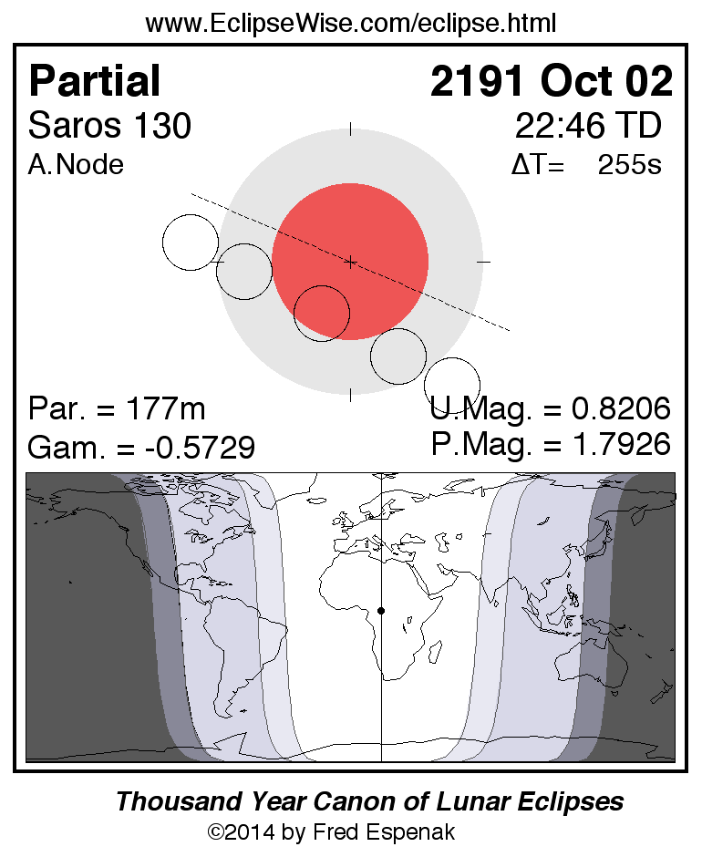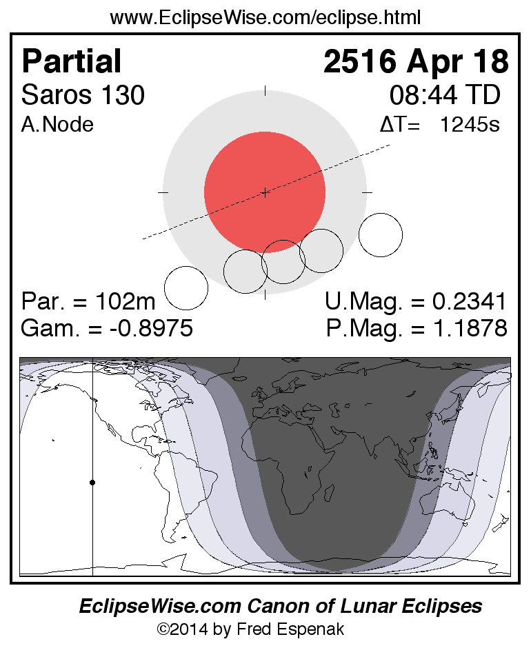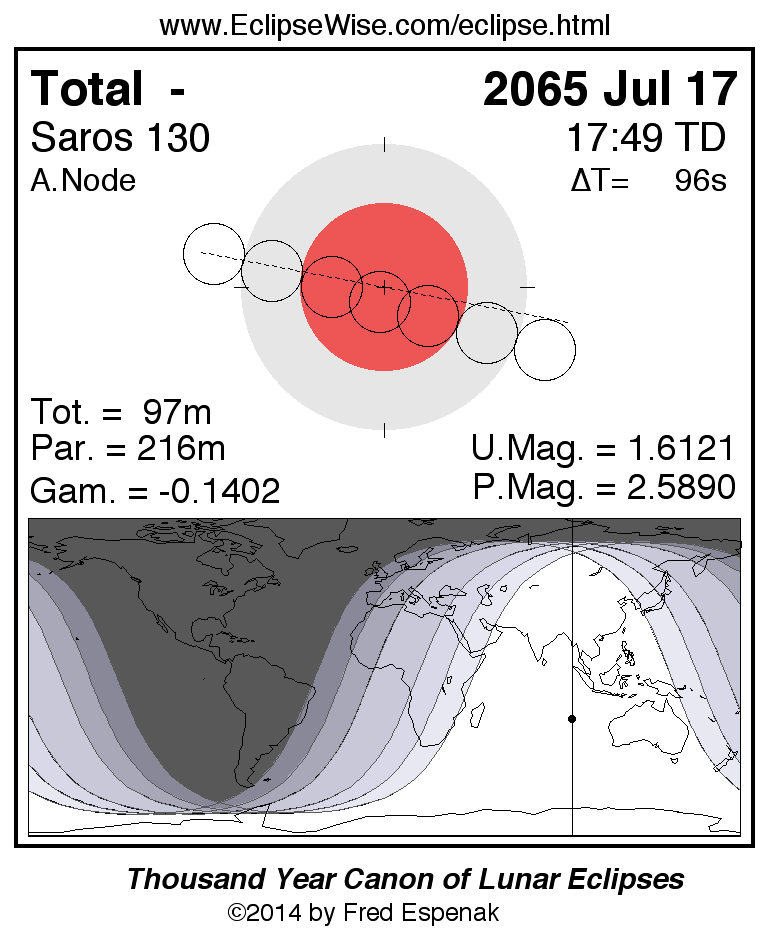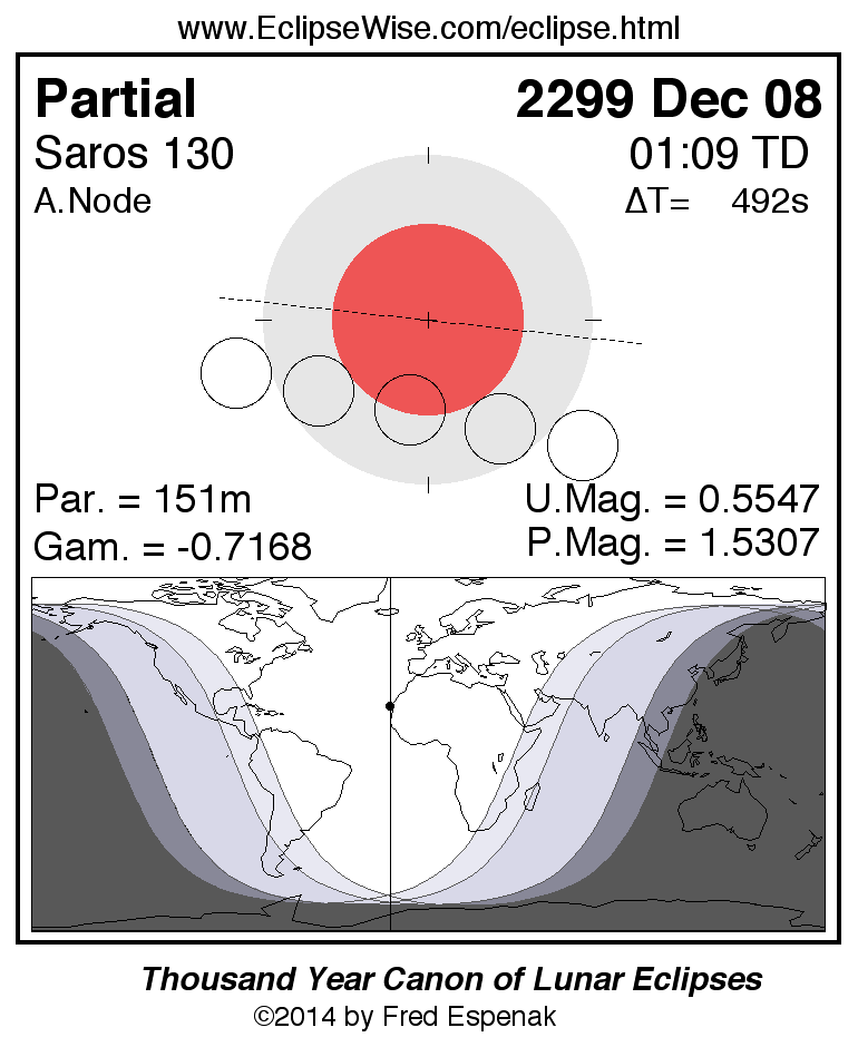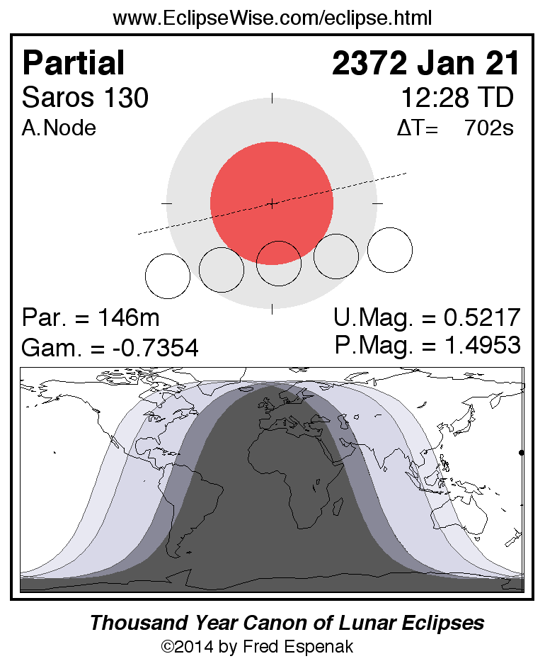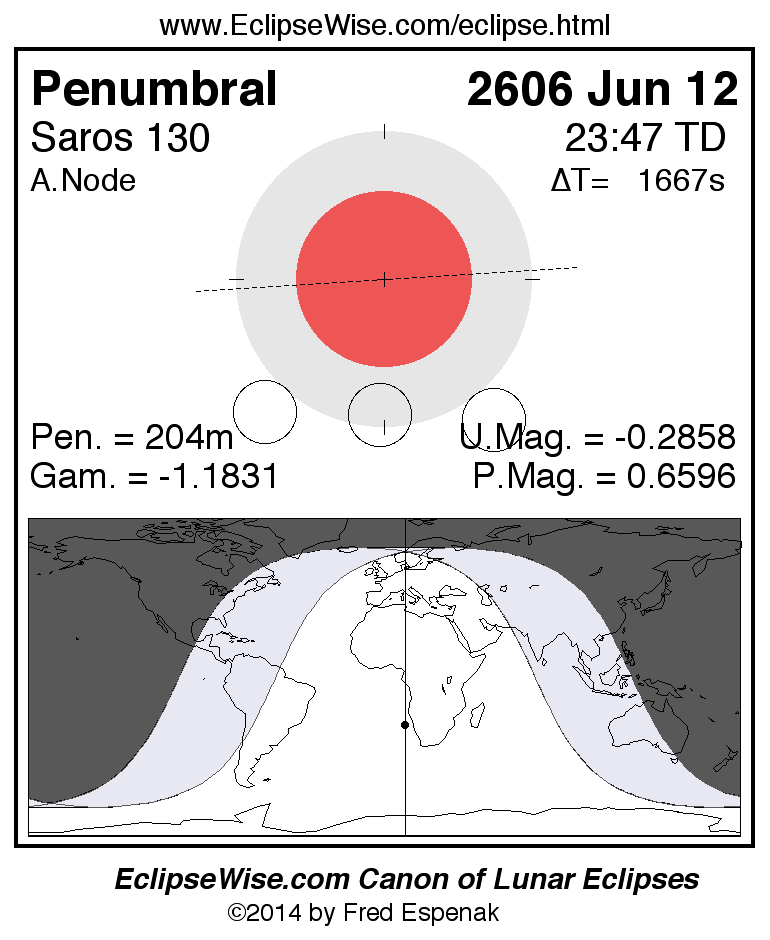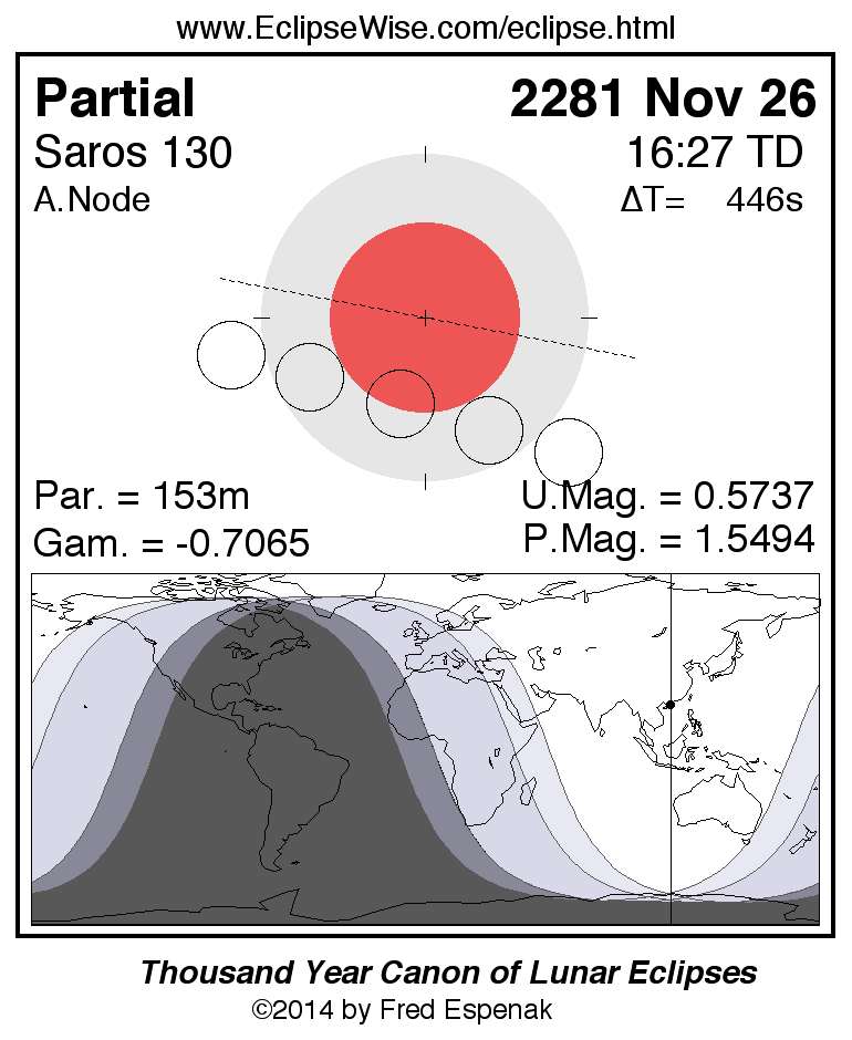 A panorama of all lunar eclipses belonging to Saros 130 is presented here. Each figure shows the Moon's path with respect to Earth's penumbral and umbral shadows. Below the path is a map depicting the geographic region of visibility for the eclipse. The date and time are given for the instant of Greatest Eclipse. Every figure serves as a hyperlink to the EclipseWise Prime page for that eclipse with a larger figure and complete details for the eclipse. Visit the Key to Lunar Eclipse Figures for a detailed explanation of these diagrams. Near the bottom of this page are a series of hyperlinks for more on lunar eclipses.
