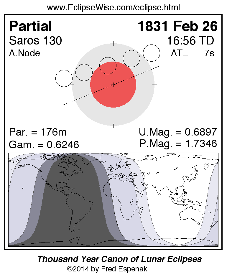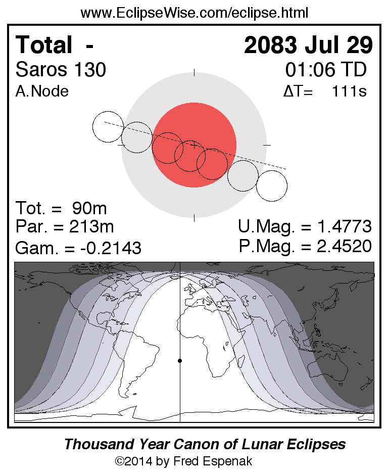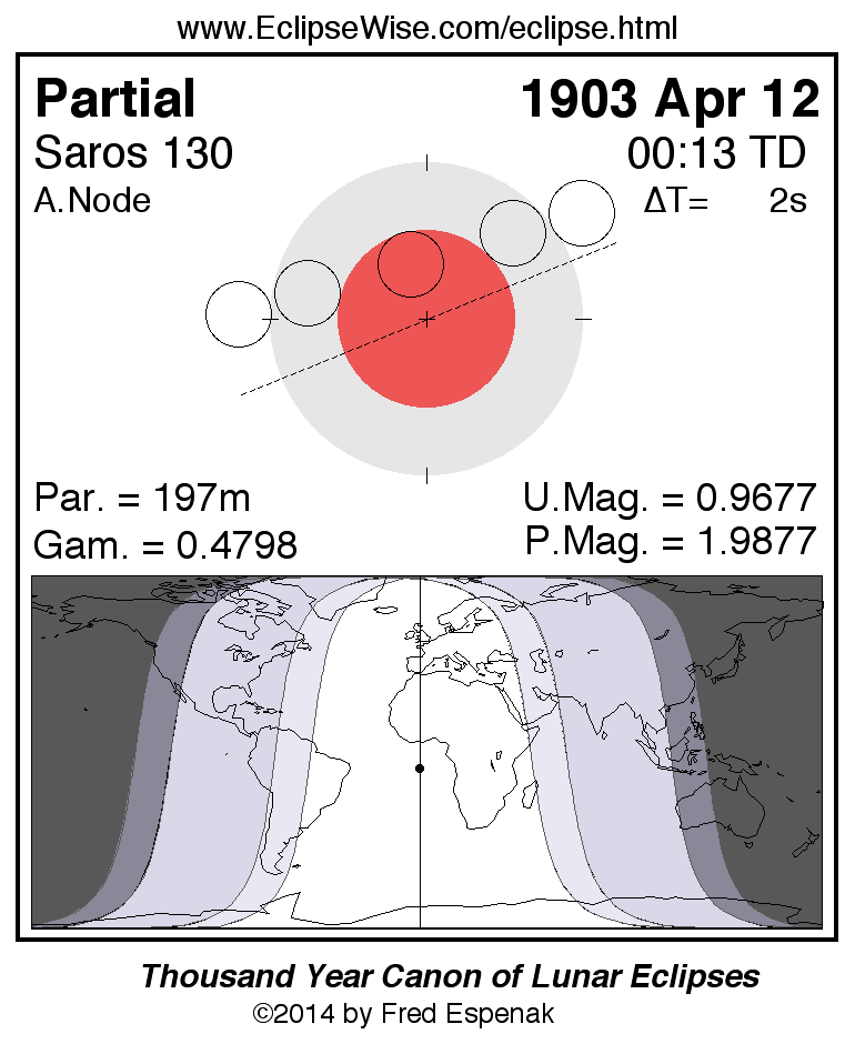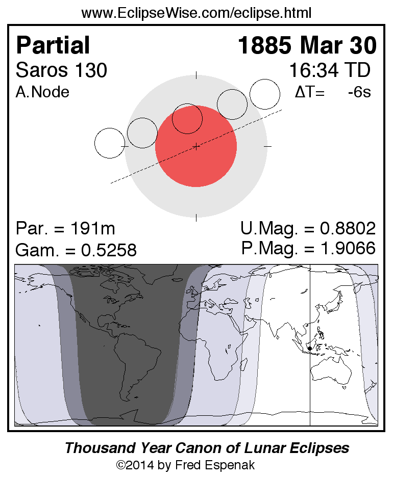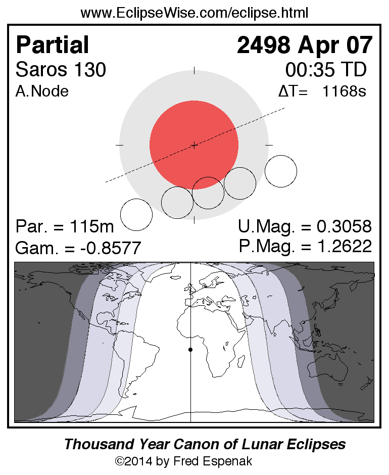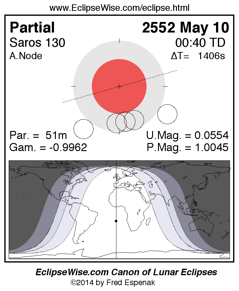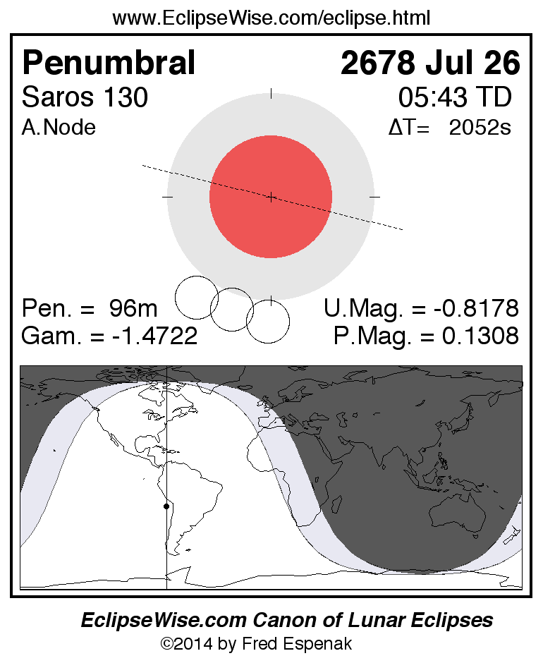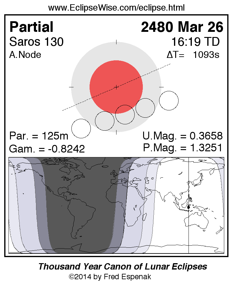 A panorama of all lunar eclipses belonging to Saros 130 is presented here. Each figure shows the Moon's path with respect to Earth's penumbral and umbral shadows. Below the path is a map depicting the geographic region of visibility for the eclipse. The date and time are given for the instant of Greatest Eclipse. Every figure serves as a hyperlink to the EclipseWise Prime page for that eclipse with a larger figure and complete details for the eclipse. Visit the Key to Lunar Eclipse Figures for a detailed explanation of these diagrams. Near the bottom of this page are a series of hyperlinks for more on lunar eclipses.