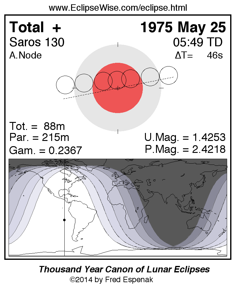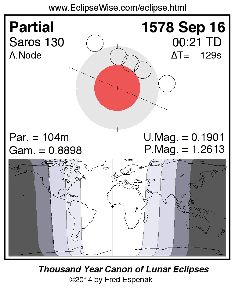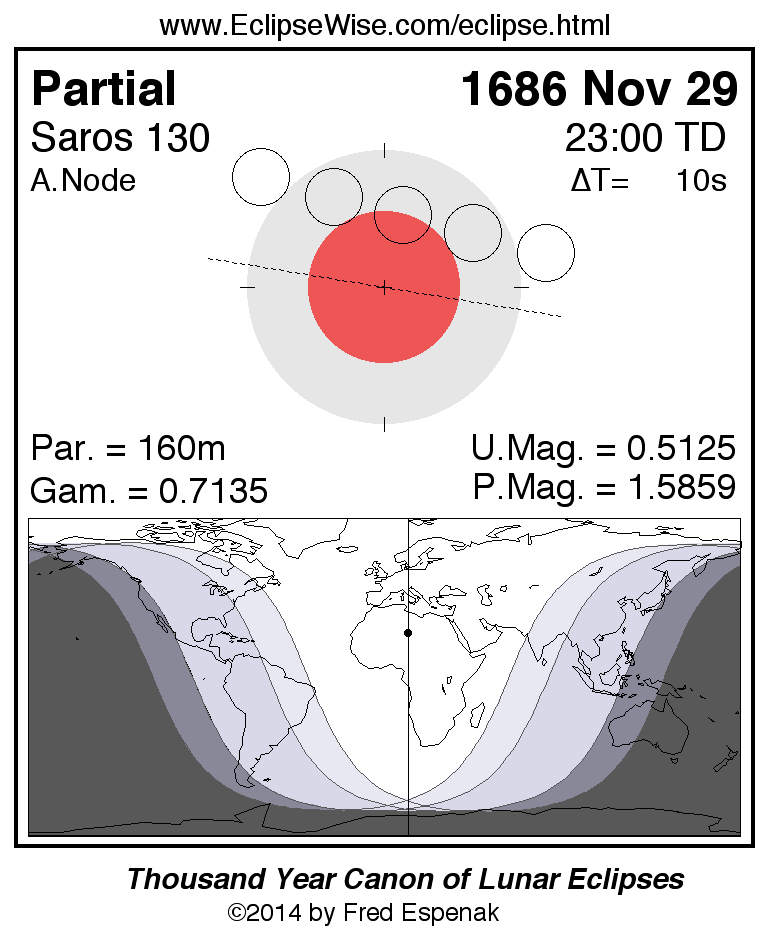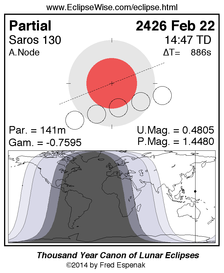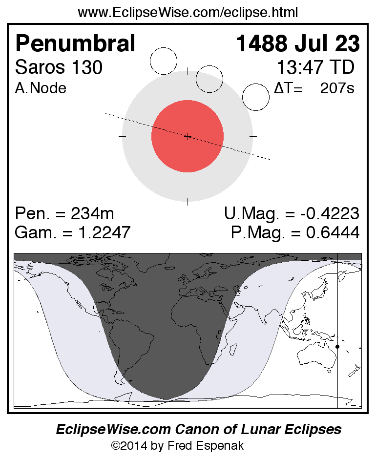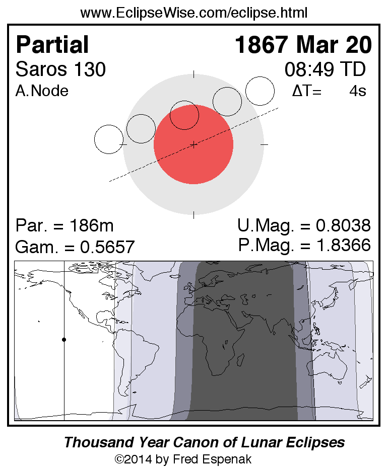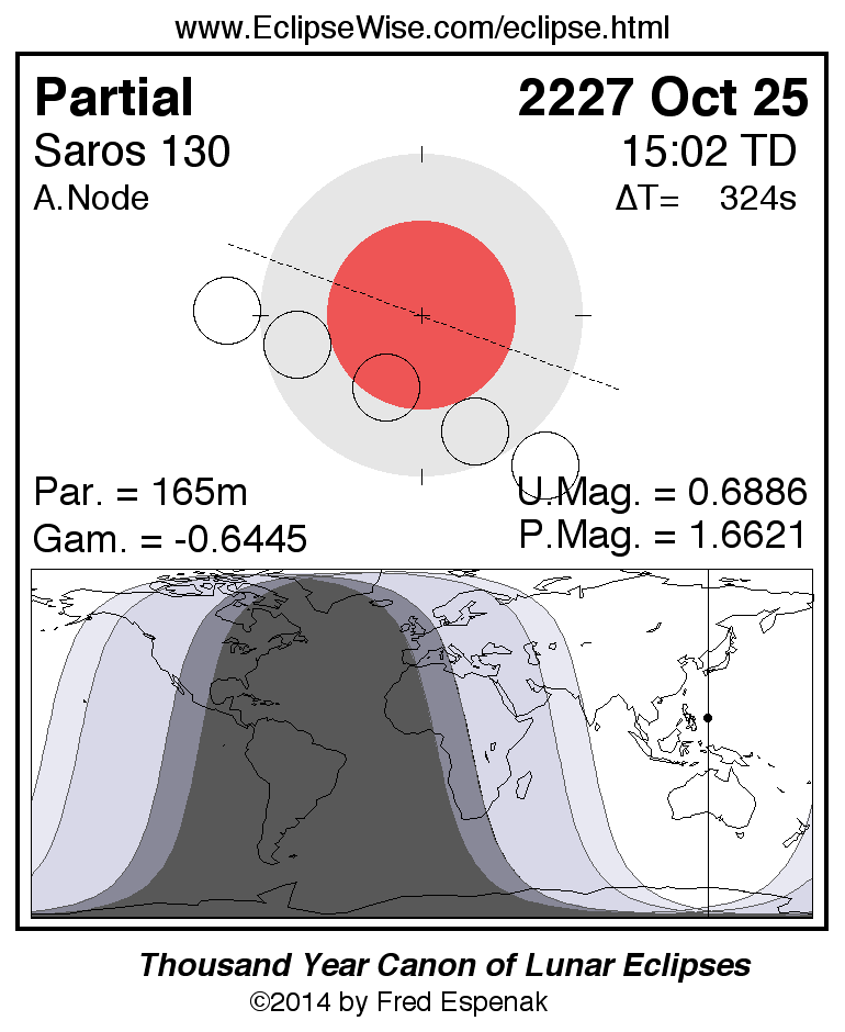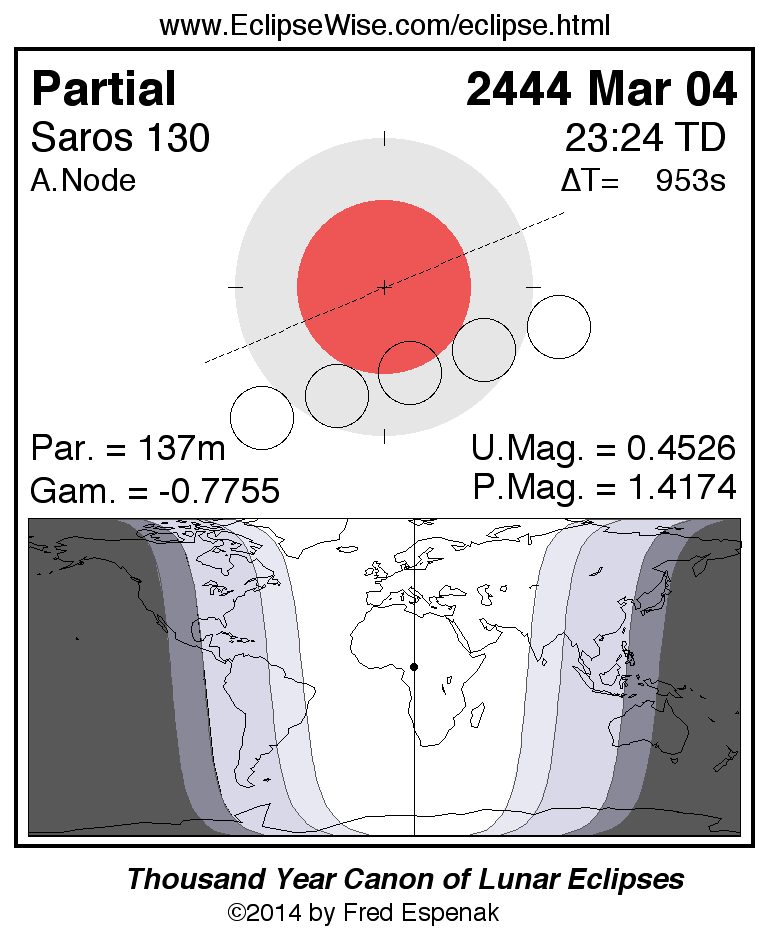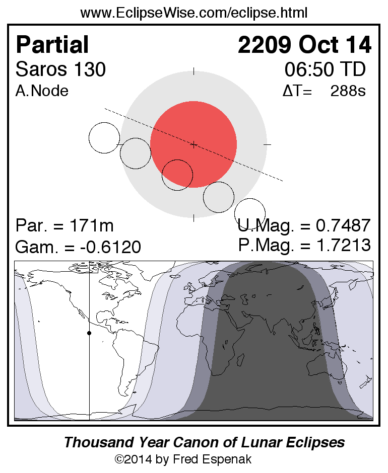 A panorama of all lunar eclipses belonging to Saros 130 is presented here. Each figure shows the Moon's path with respect to Earth's penumbral and umbral shadows. Below the path is a map depicting the geographic region of visibility for the eclipse. The date and time are given for the instant of Greatest Eclipse. Every figure serves as a hyperlink to the EclipseWise Prime page for that eclipse with a larger figure and complete details for the eclipse. Visit the Key to Lunar Eclipse Figures for a detailed explanation of these diagrams. Near the bottom of this page are a series of hyperlinks for more on lunar eclipses.
