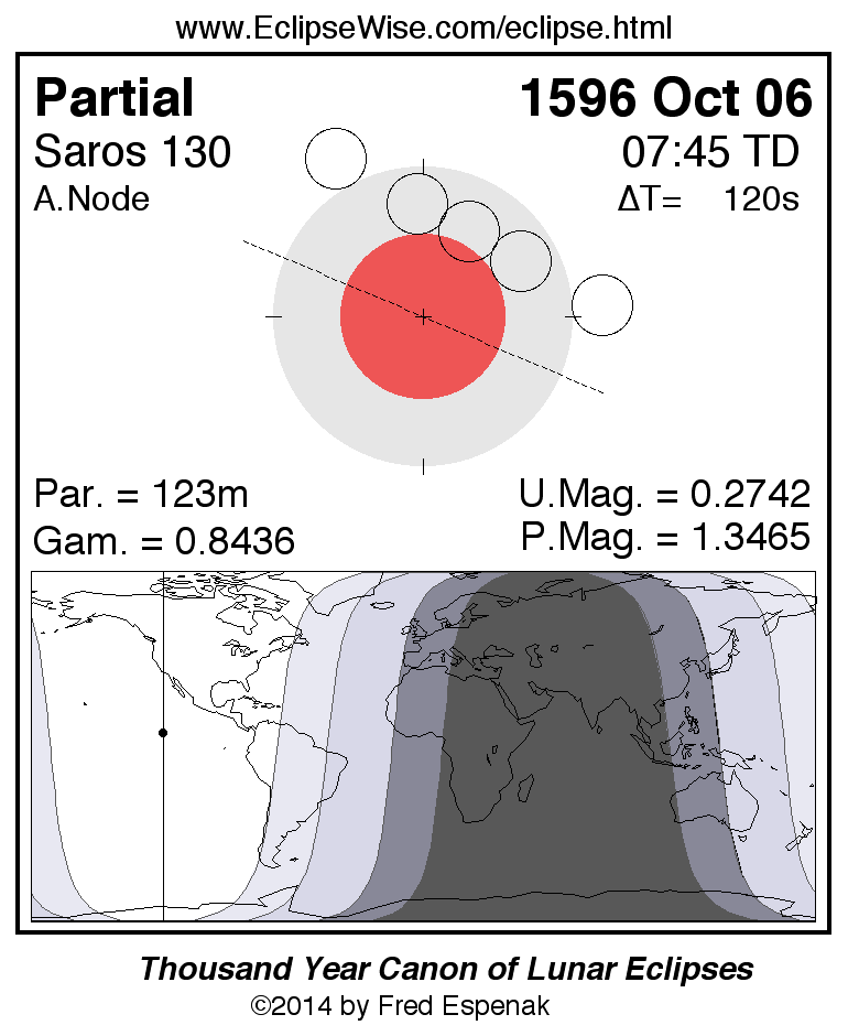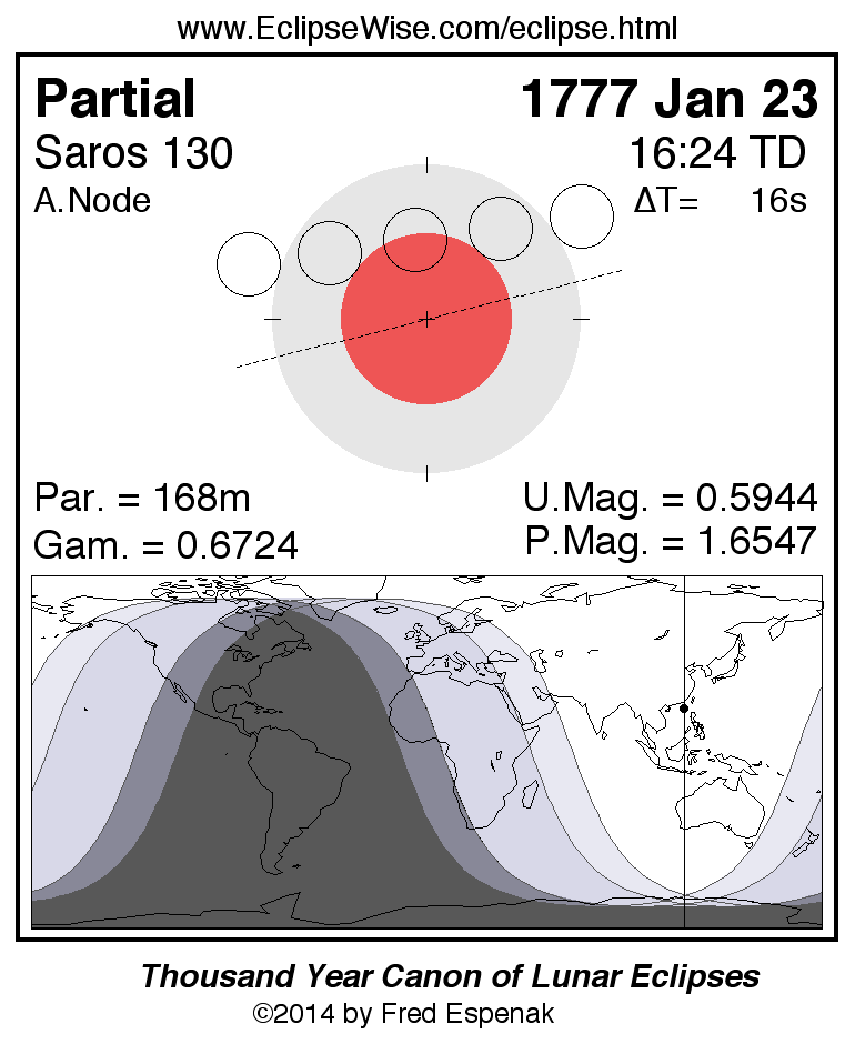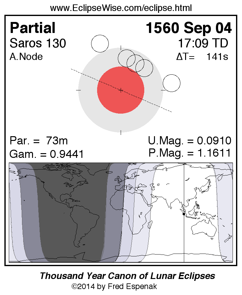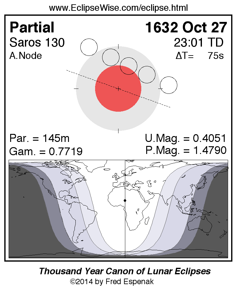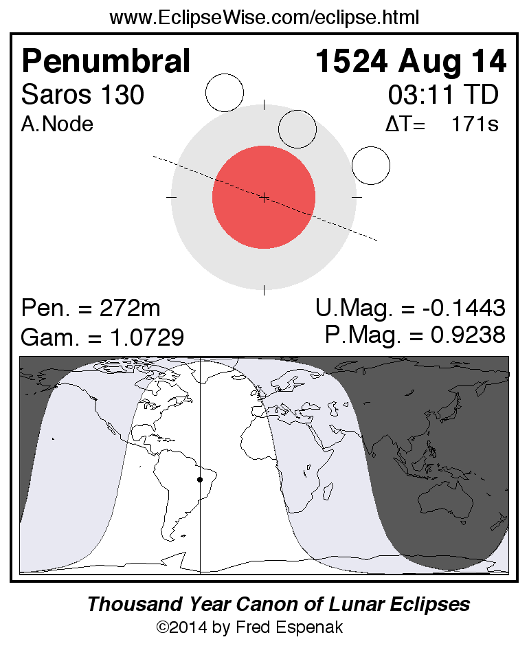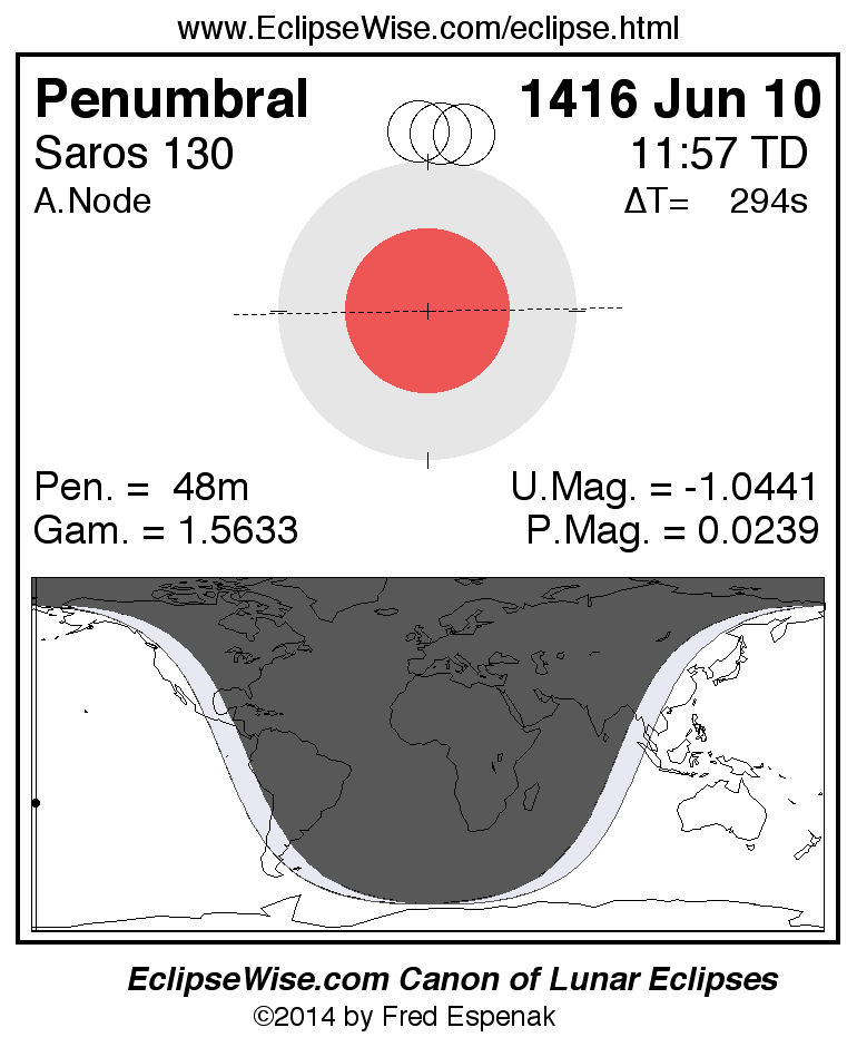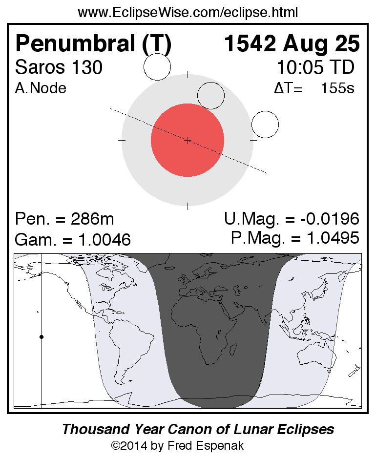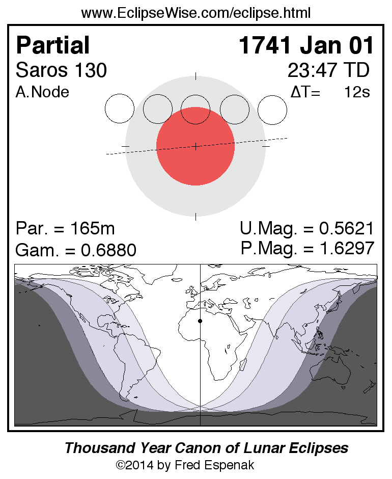 A panorama of all lunar eclipses belonging to Saros 130 is presented here. Each figure shows the Moon's path with respect to Earth's penumbral and umbral shadows. Below the path is a map depicting the geographic region of visibility for the eclipse. The date and time are given for the instant of Greatest Eclipse. Every figure serves as a hyperlink to the EclipseWise Prime page for that eclipse with a larger figure and complete details for the eclipse. Visit the Key to Lunar Eclipse Figures for a detailed explanation of these diagrams. Near the bottom of this page are a series of hyperlinks for more on lunar eclipses.