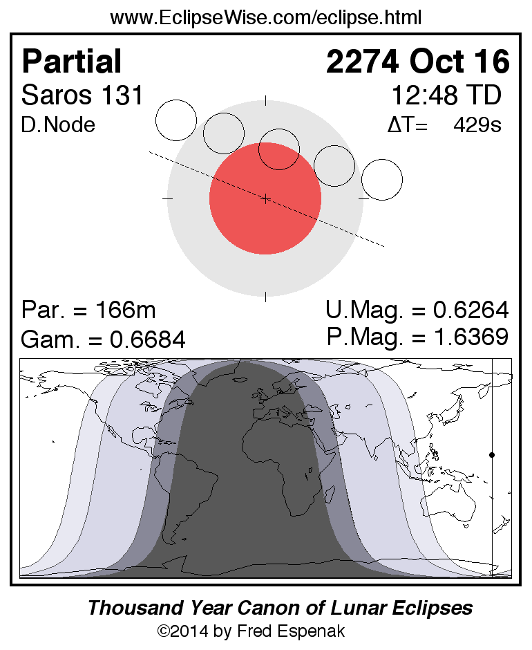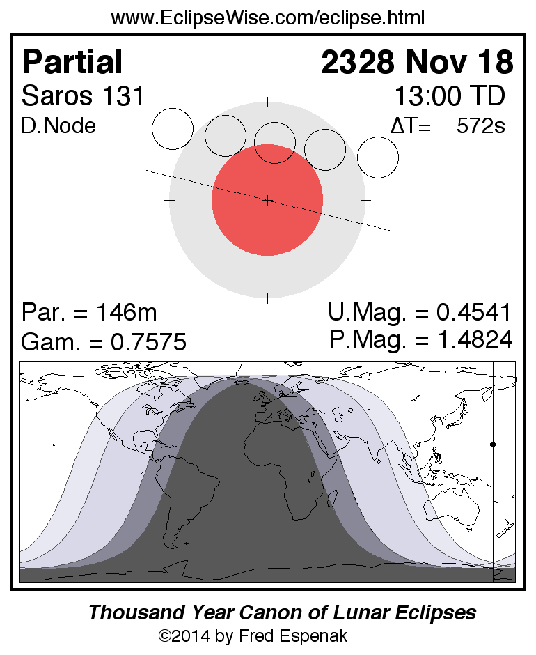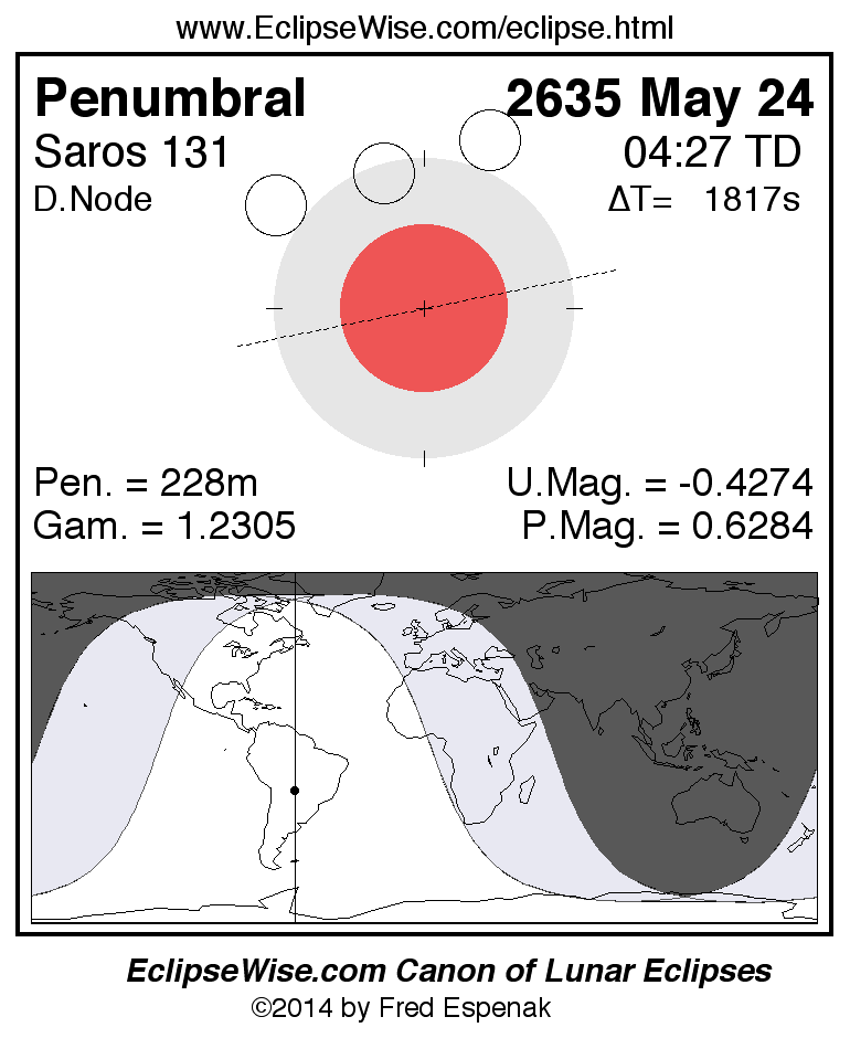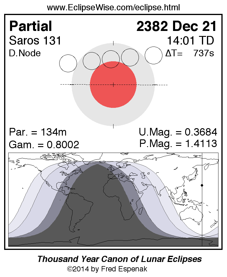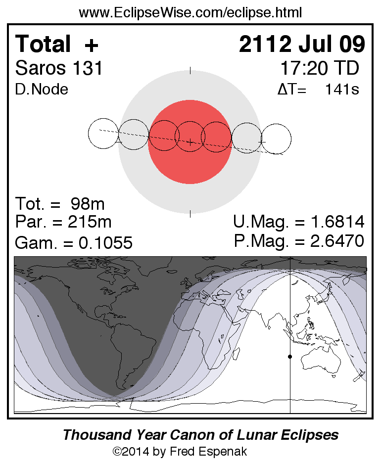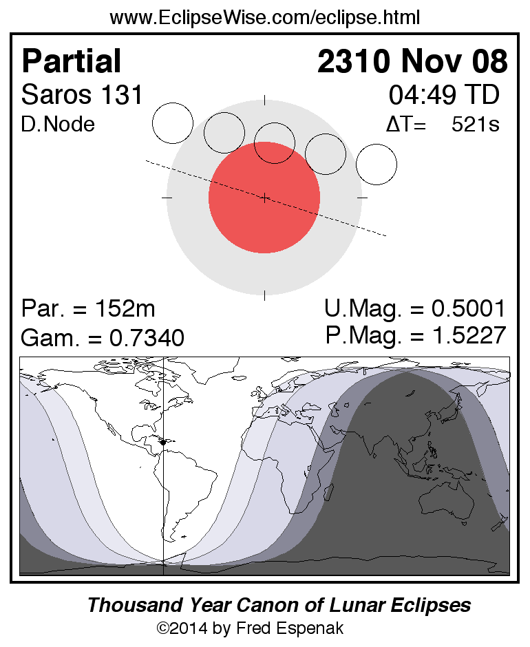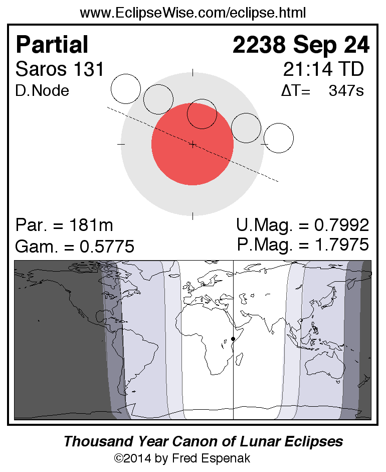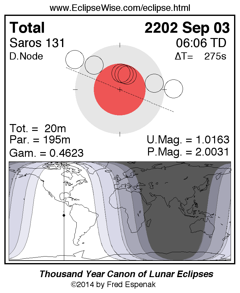 A panorama of all lunar eclipses belonging to Saros 131 is presented here. Each figure shows the Moon's path with respect to Earth's penumbral and umbral shadows. Below the path is a map depicting the geographic region of visibility for the eclipse. The date and time are given for the instant of Greatest Eclipse. Every figure serves as a hyperlink to the EclipseWise Prime page for that eclipse with a larger figure and complete details for the eclipse. Visit the Key to Lunar Eclipse Figures for a detailed explanation of these diagrams. Near the bottom of this page are a series of hyperlinks for more on lunar eclipses.