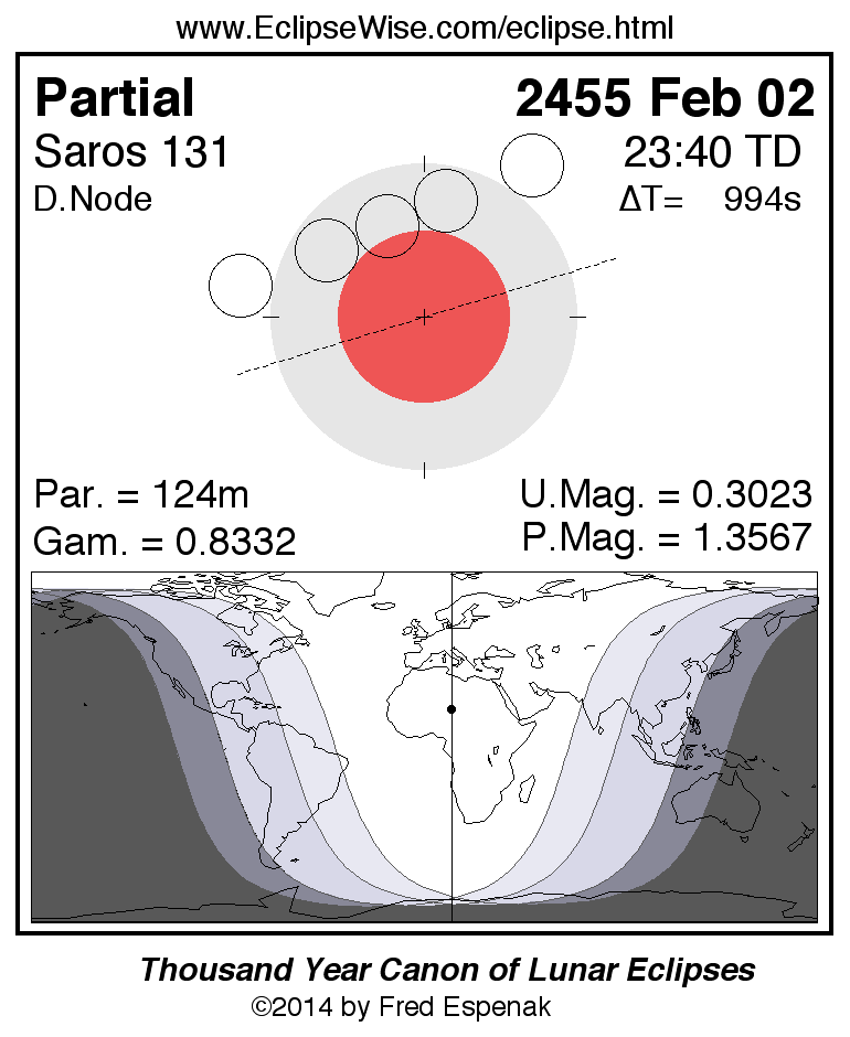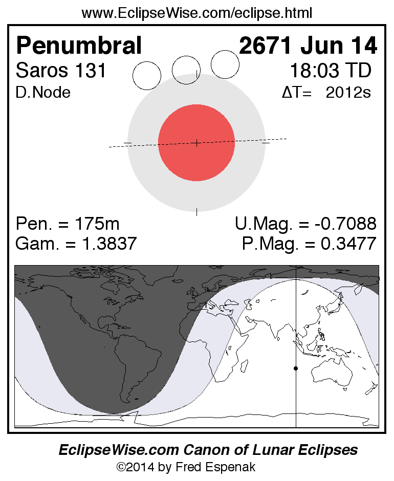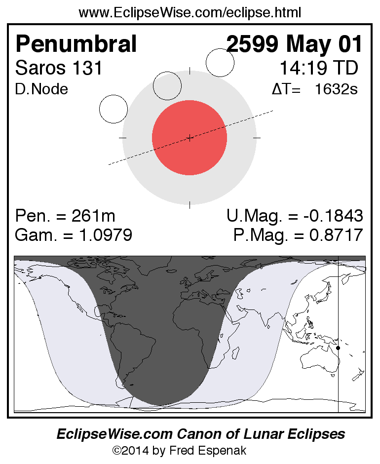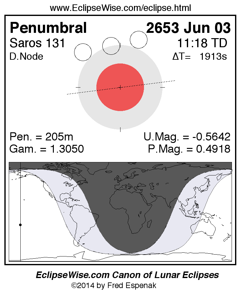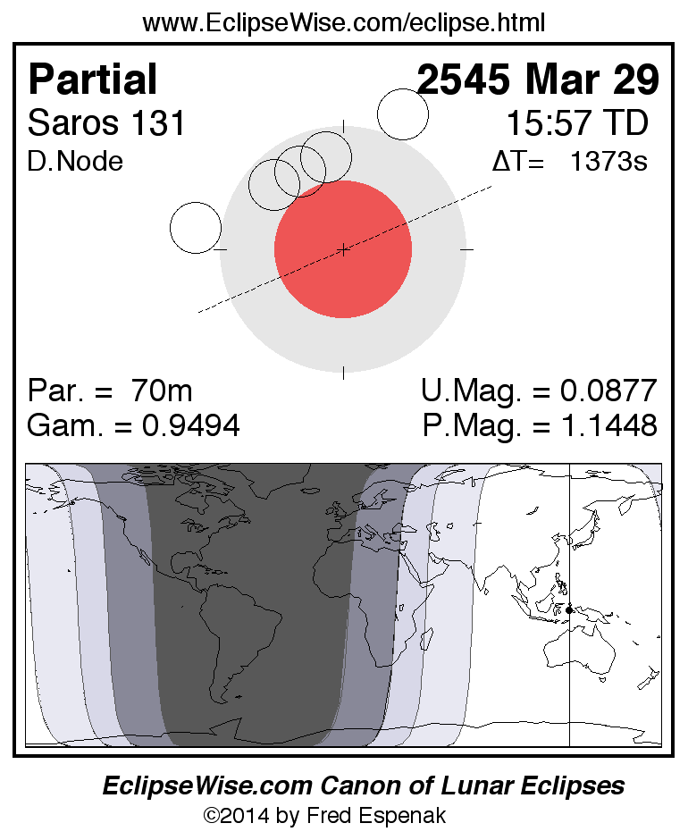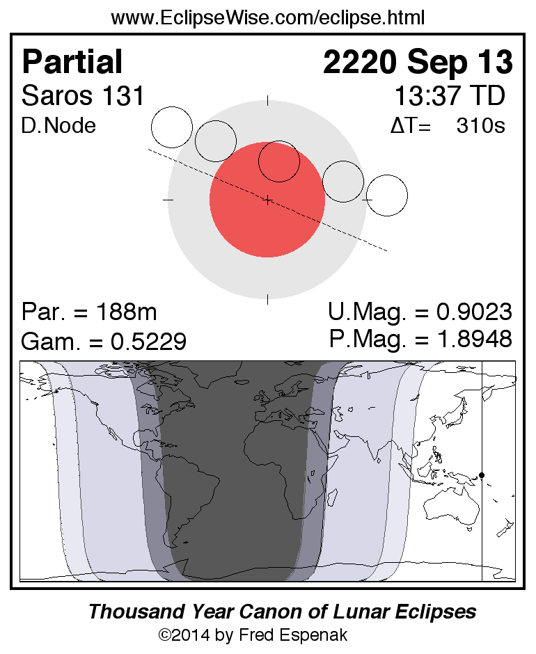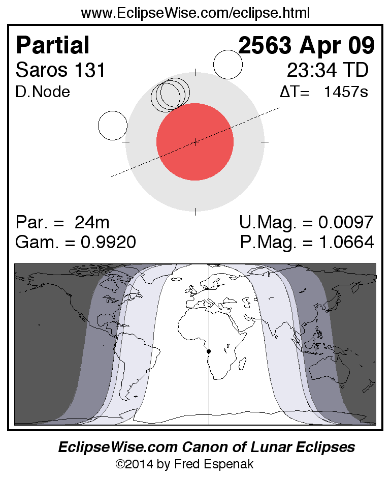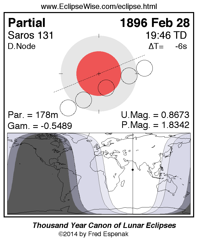 A panorama of all lunar eclipses belonging to Saros 131 is presented here. Each figure shows the Moon's path with respect to Earth's penumbral and umbral shadows. Below the path is a map depicting the geographic region of visibility for the eclipse. The date and time are given for the instant of Greatest Eclipse. Every figure serves as a hyperlink to the EclipseWise Prime page for that eclipse with a larger figure and complete details for the eclipse. Visit the Key to Lunar Eclipse Figures for a detailed explanation of these diagrams. Near the bottom of this page are a series of hyperlinks for more on lunar eclipses.