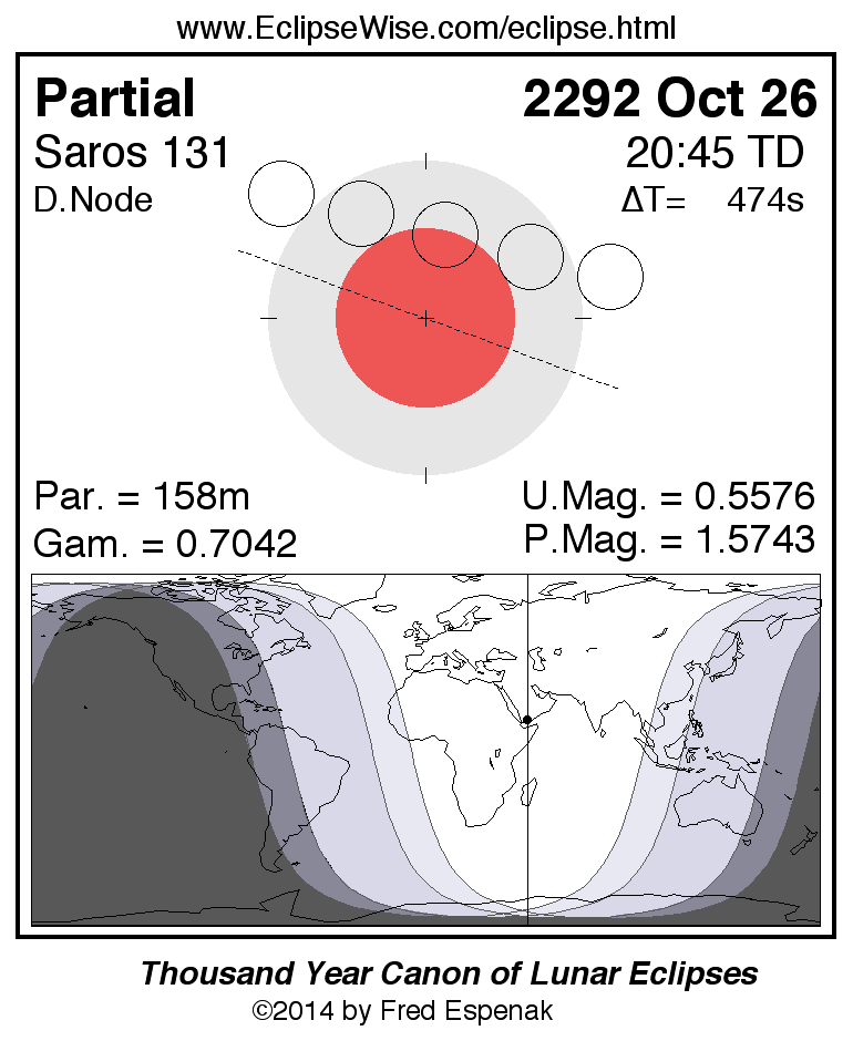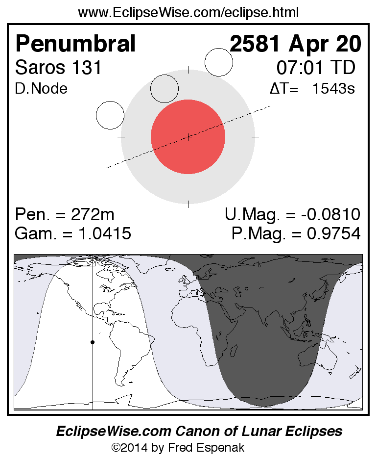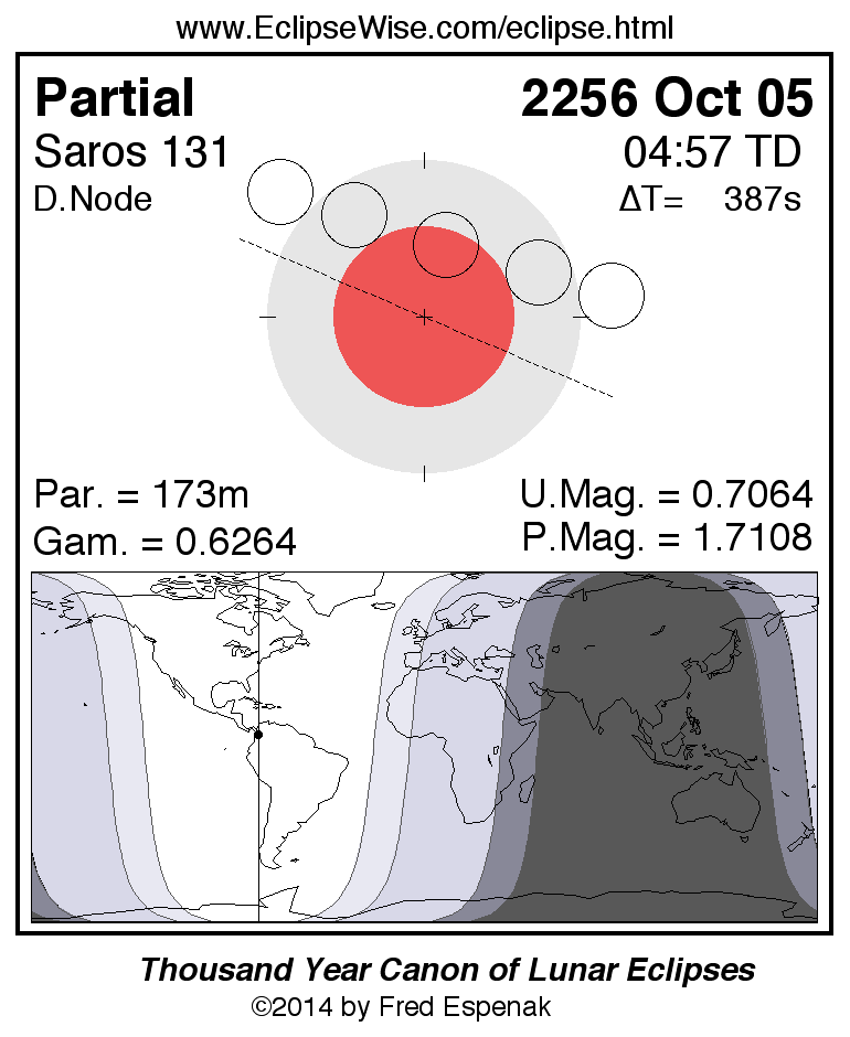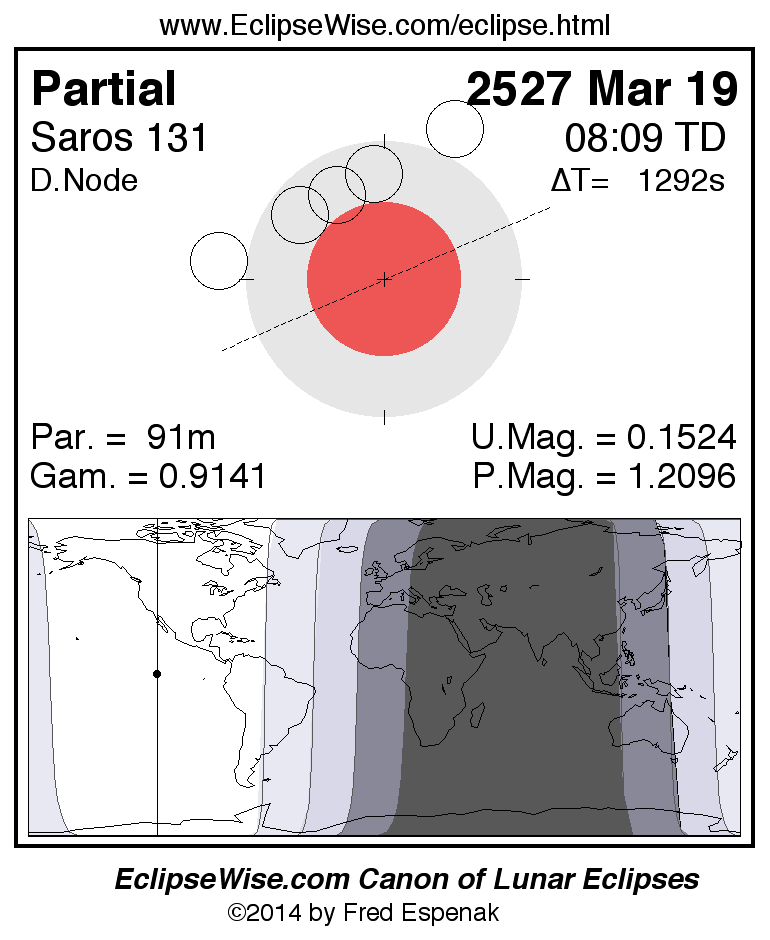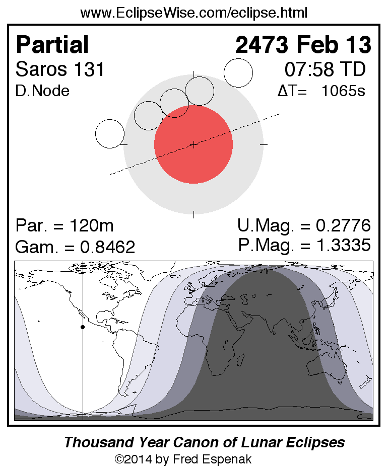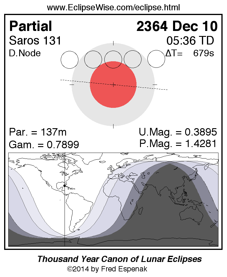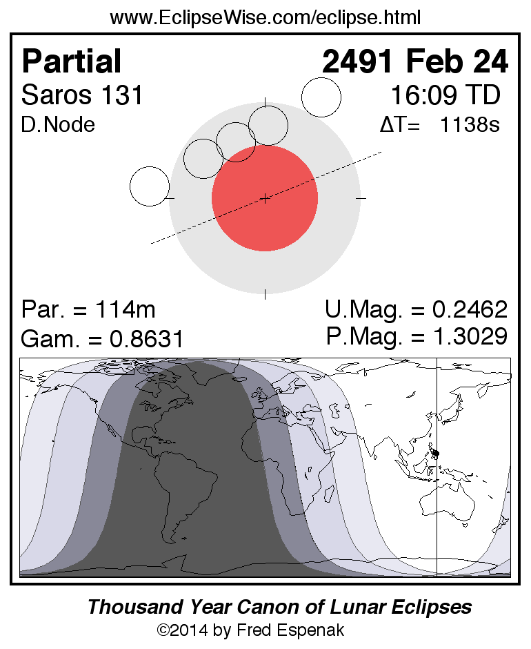 A panorama of all lunar eclipses belonging to Saros 131 is presented here. Each figure shows the Moon's path with respect to Earth's penumbral and umbral shadows. Below the path is a map depicting the geographic region of visibility for the eclipse. The date and time are given for the instant of Greatest Eclipse. Every figure serves as a hyperlink to the EclipseWise Prime page for that eclipse with a larger figure and complete details for the eclipse. Visit the Key to Lunar Eclipse Figures for a detailed explanation of these diagrams. Near the bottom of this page are a series of hyperlinks for more on lunar eclipses.