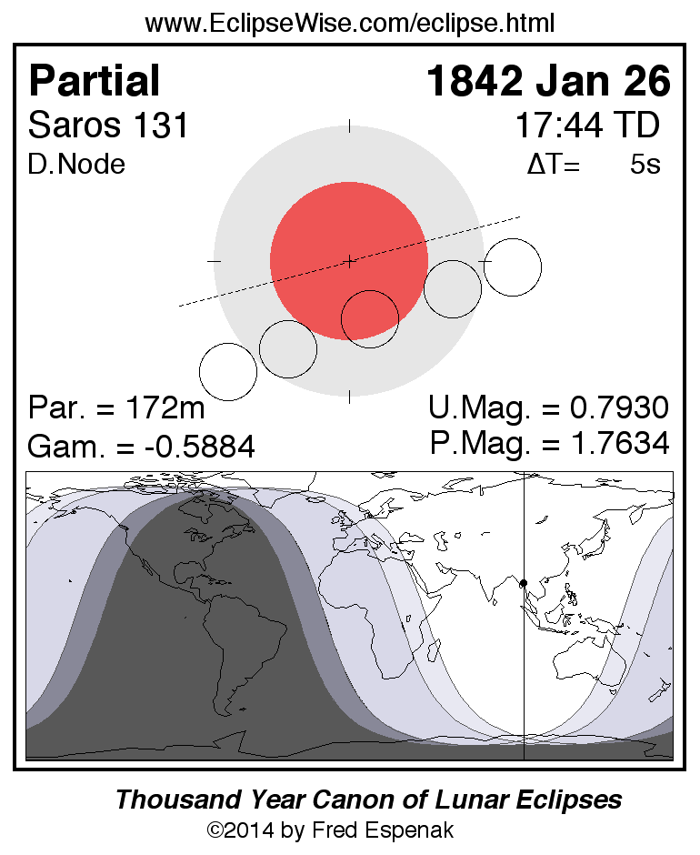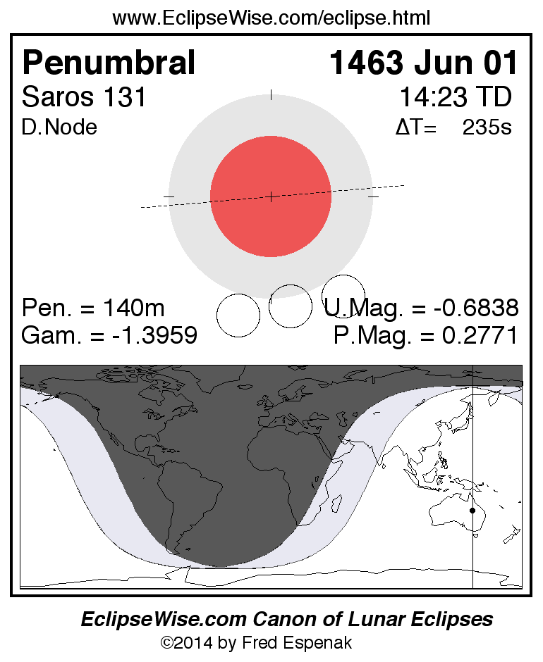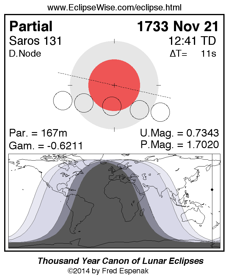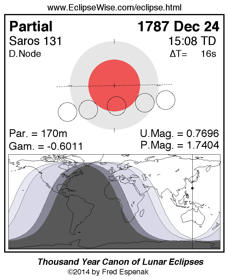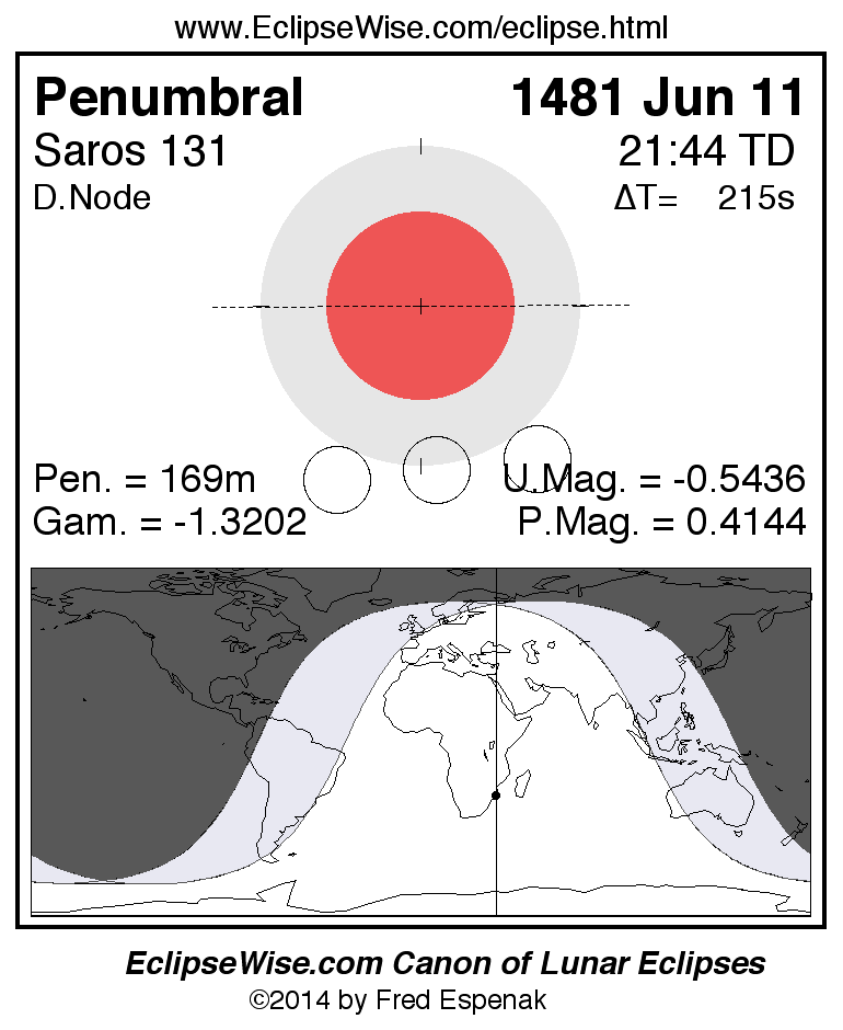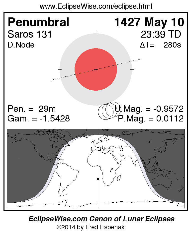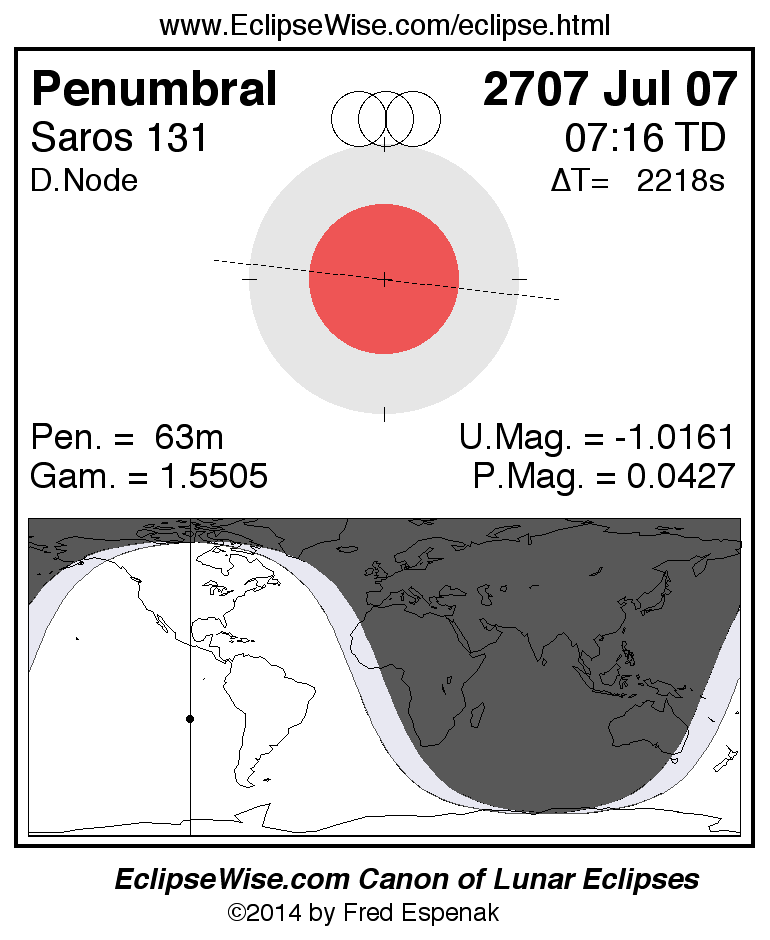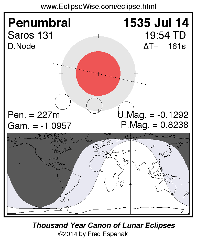 A panorama of all lunar eclipses belonging to Saros 131 is presented here. Each figure shows the Moon's path with respect to Earth's penumbral and umbral shadows. Below the path is a map depicting the geographic region of visibility for the eclipse. The date and time are given for the instant of Greatest Eclipse. Every figure serves as a hyperlink to the EclipseWise Prime page for that eclipse with a larger figure and complete details for the eclipse. Visit the Key to Lunar Eclipse Figures for a detailed explanation of these diagrams. Near the bottom of this page are a series of hyperlinks for more on lunar eclipses.