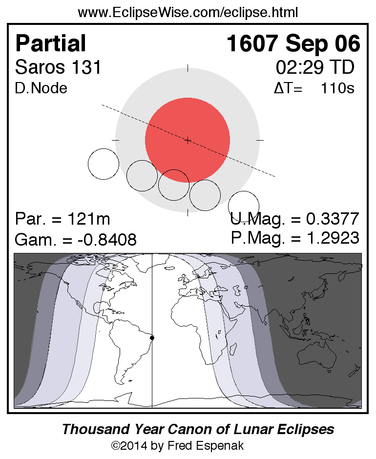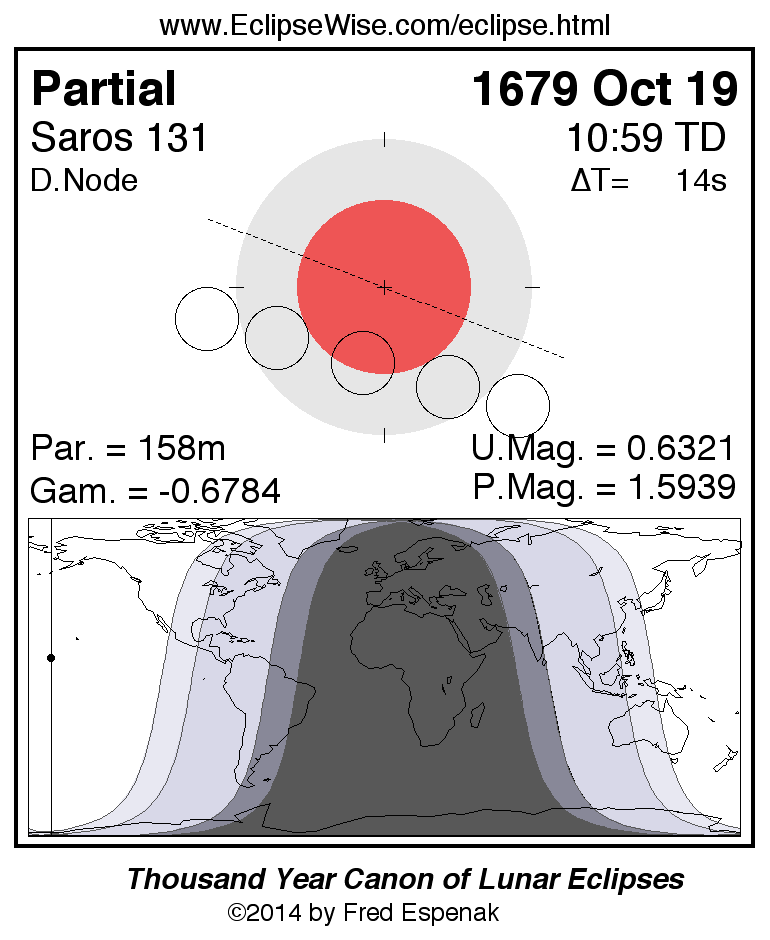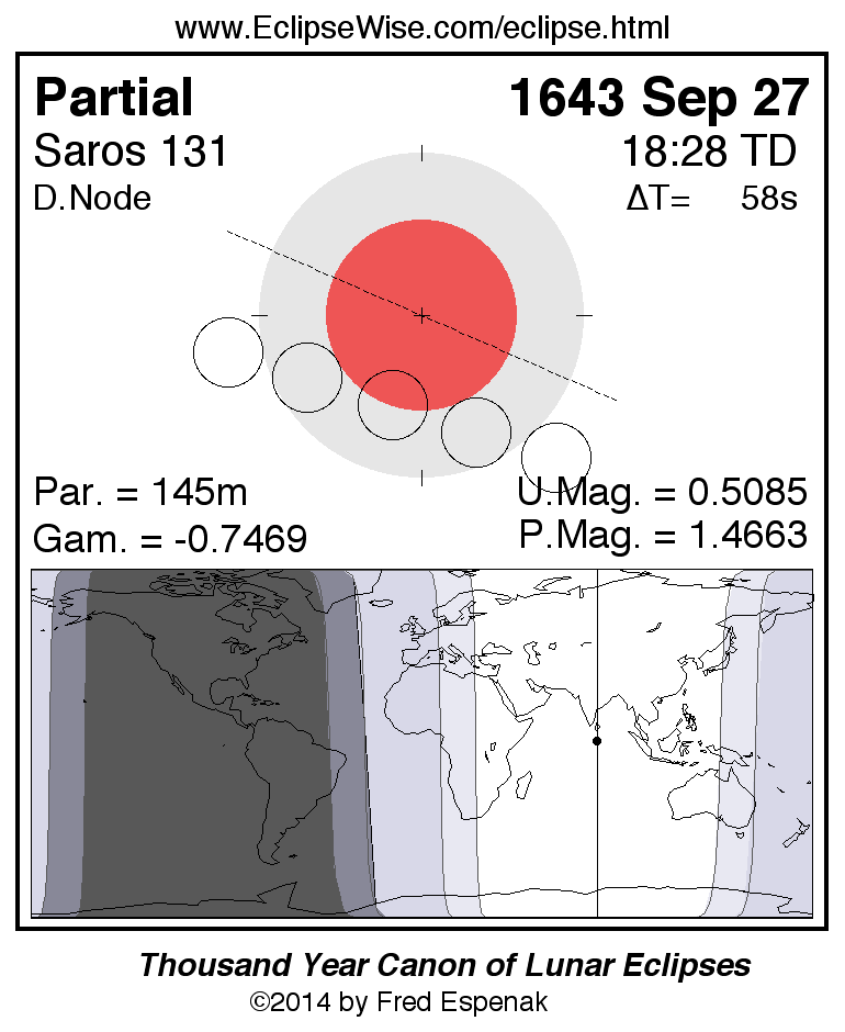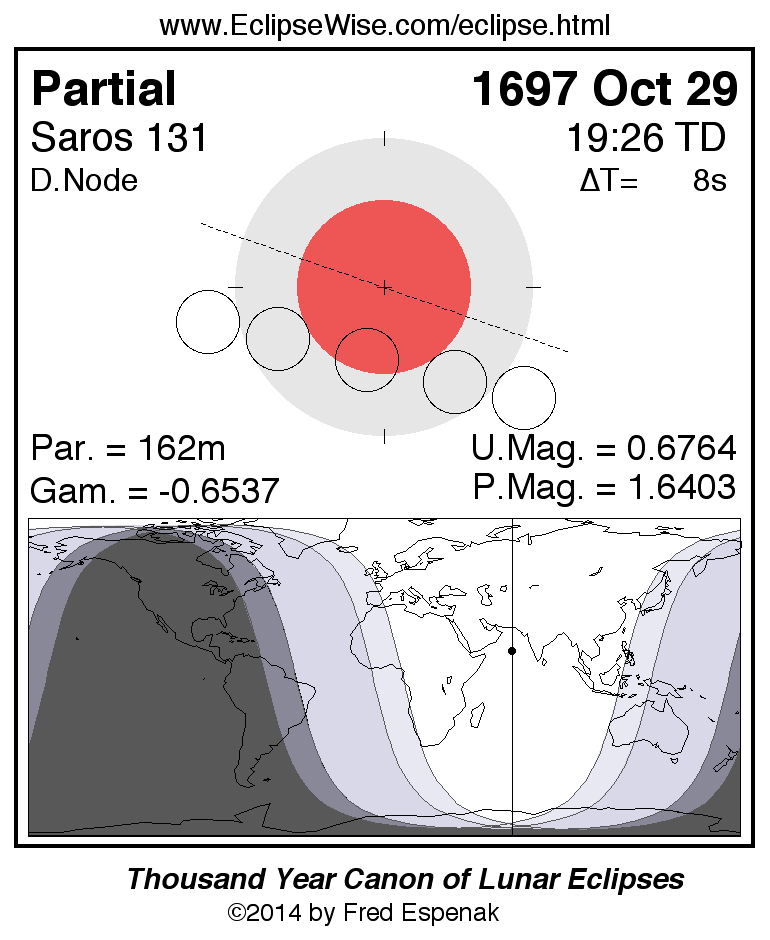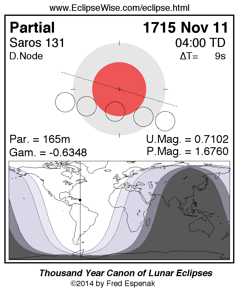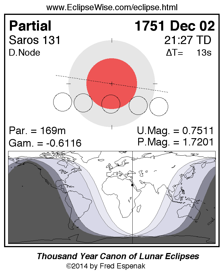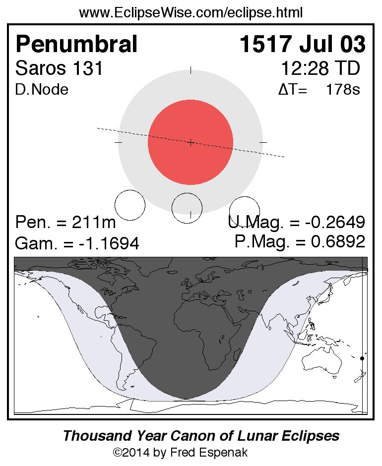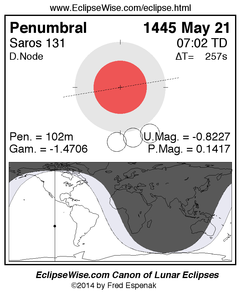 A panorama of all lunar eclipses belonging to Saros 131 is presented here. Each figure shows the Moon's path with respect to Earth's penumbral and umbral shadows. Below the path is a map depicting the geographic region of visibility for the eclipse. The date and time are given for the instant of Greatest Eclipse. Every figure serves as a hyperlink to the EclipseWise Prime page for that eclipse with a larger figure and complete details for the eclipse. Visit the Key to Lunar Eclipse Figures for a detailed explanation of these diagrams. Near the bottom of this page are a series of hyperlinks for more on lunar eclipses.