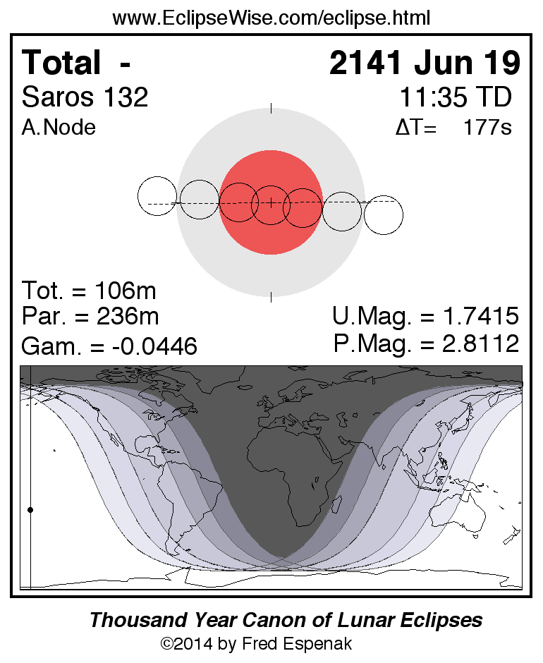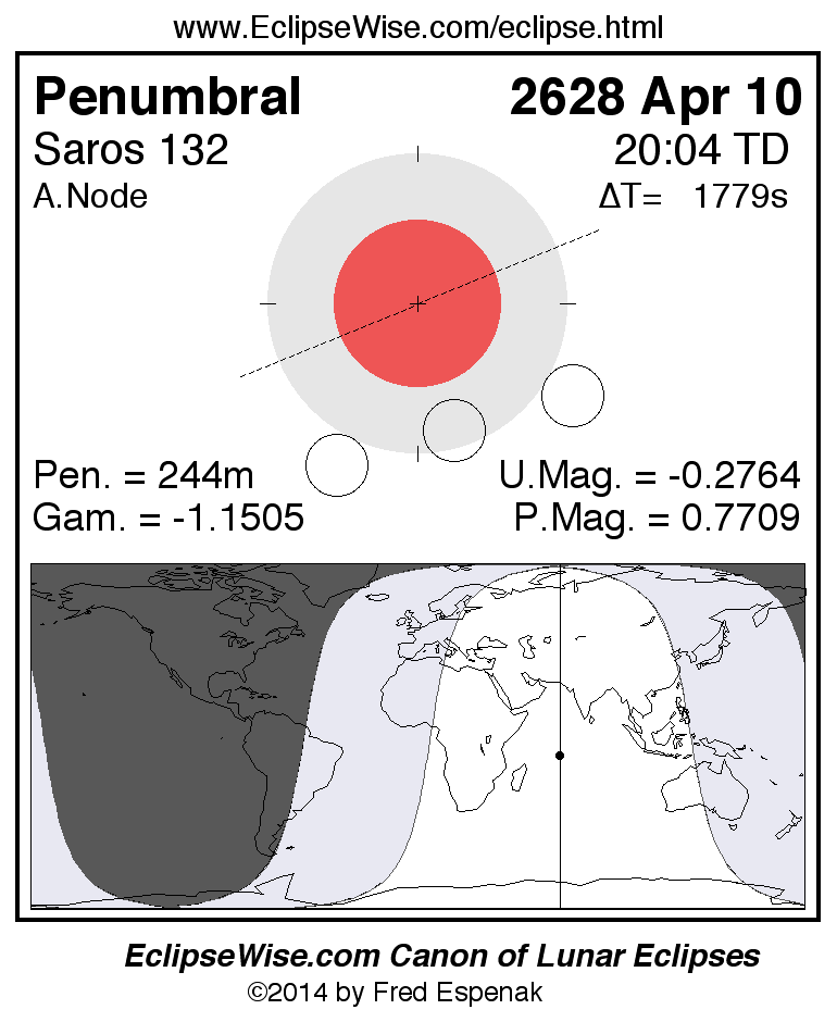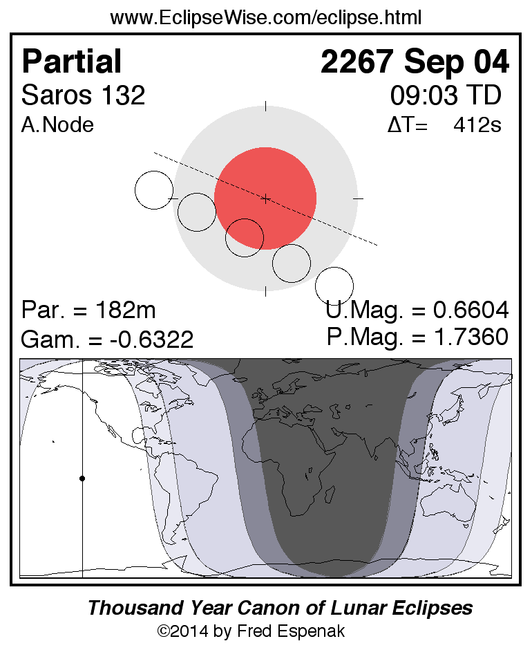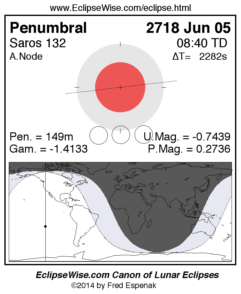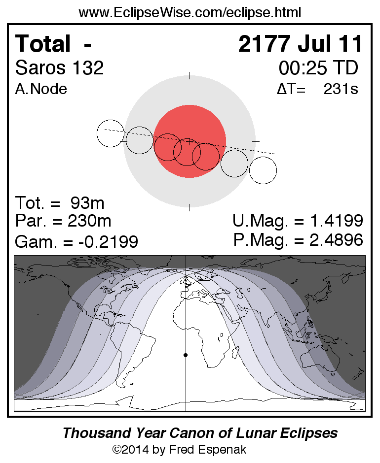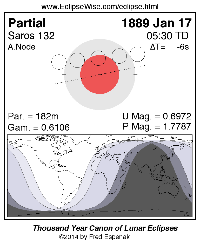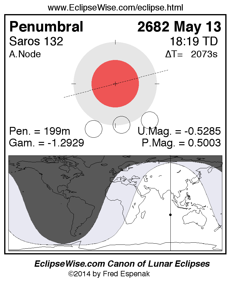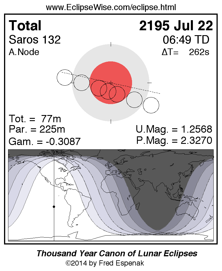A panorama of all lunar eclipses belonging to Saros 132 is presented here. Each figure shows the Moon's path with respect to Earth's penumbral and umbral shadows. Below the path is a map depicting the geographic region of visibility for the eclipse. The date and time are given for the instant of Greatest Eclipse. Every figure serves as a hyperlink to the EclipseWise Prime page for that eclipse with a larger figure and complete details for the eclipse. Visit the Key to Lunar Eclipse Figures for a detailed explanation of these diagrams. Near the bottom of this page are a series of hyperlinks for more on lunar eclipses.