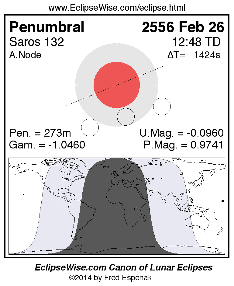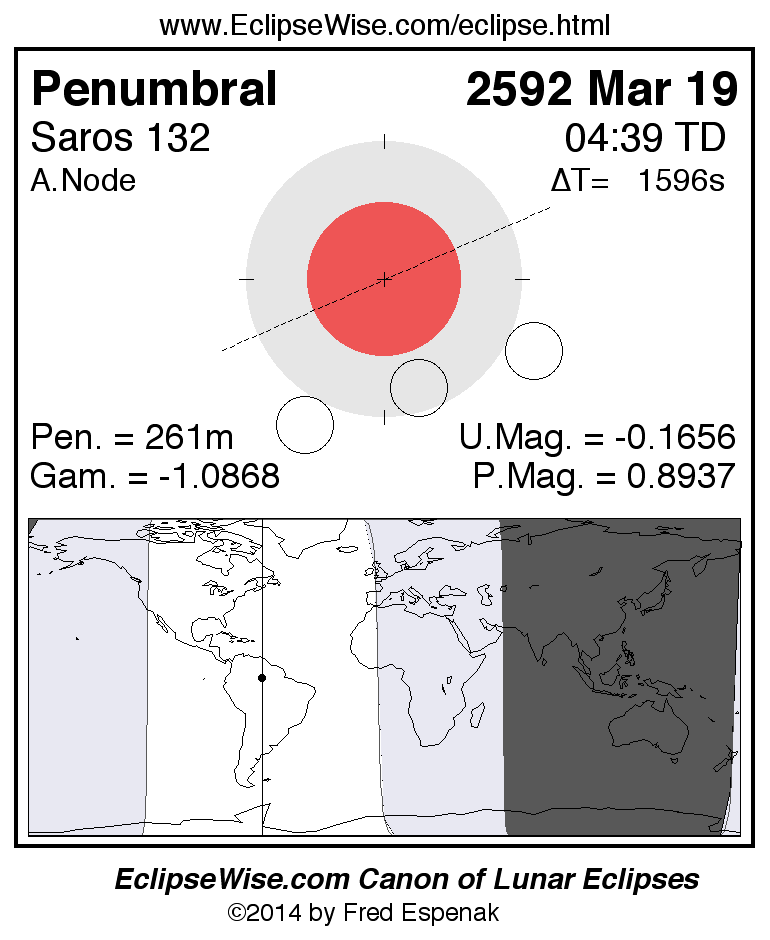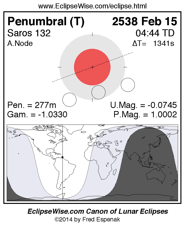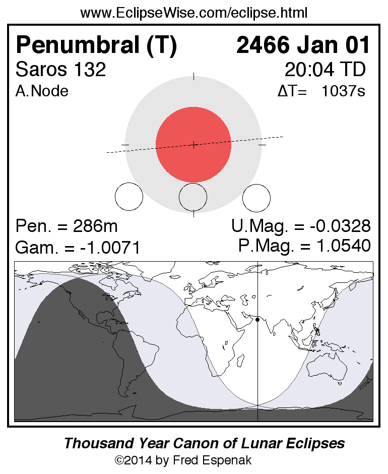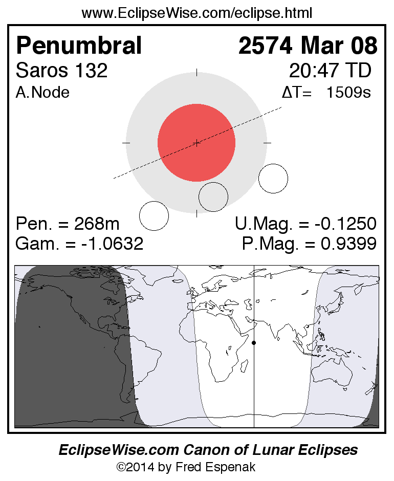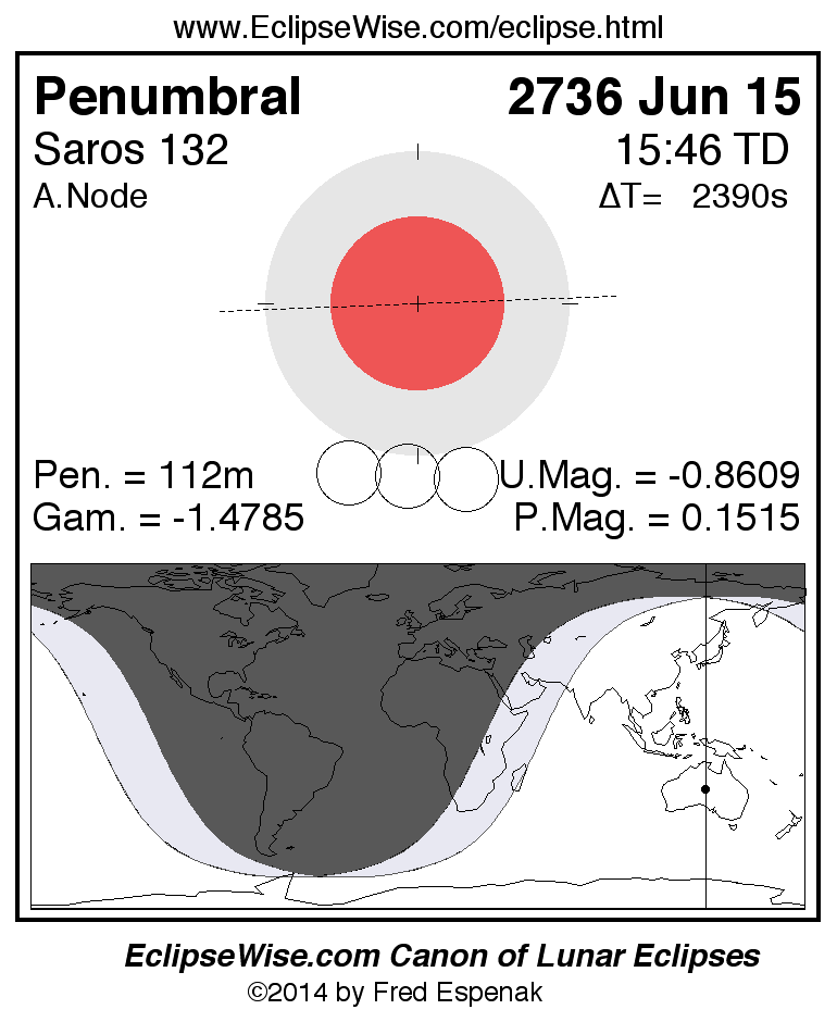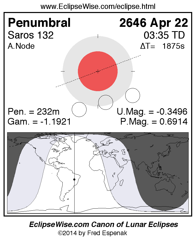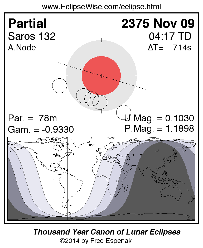 A panorama of all lunar eclipses belonging to Saros 132 is presented here. Each figure shows the Moon's path with respect to Earth's penumbral and umbral shadows. Below the path is a map depicting the geographic region of visibility for the eclipse. The date and time are given for the instant of Greatest Eclipse. Every figure serves as a hyperlink to the EclipseWise Prime page for that eclipse with a larger figure and complete details for the eclipse. Visit the Key to Lunar Eclipse Figures for a detailed explanation of these diagrams. Near the bottom of this page are a series of hyperlinks for more on lunar eclipses.