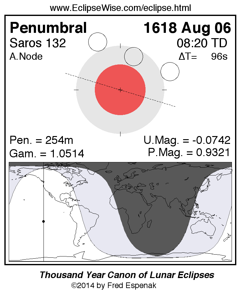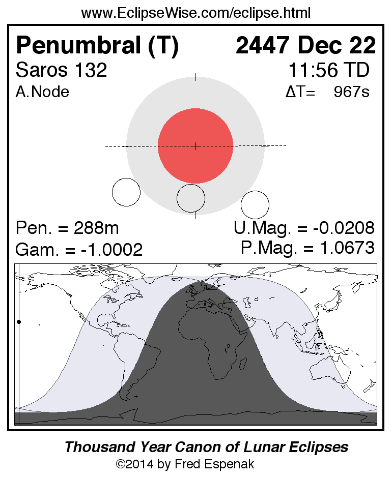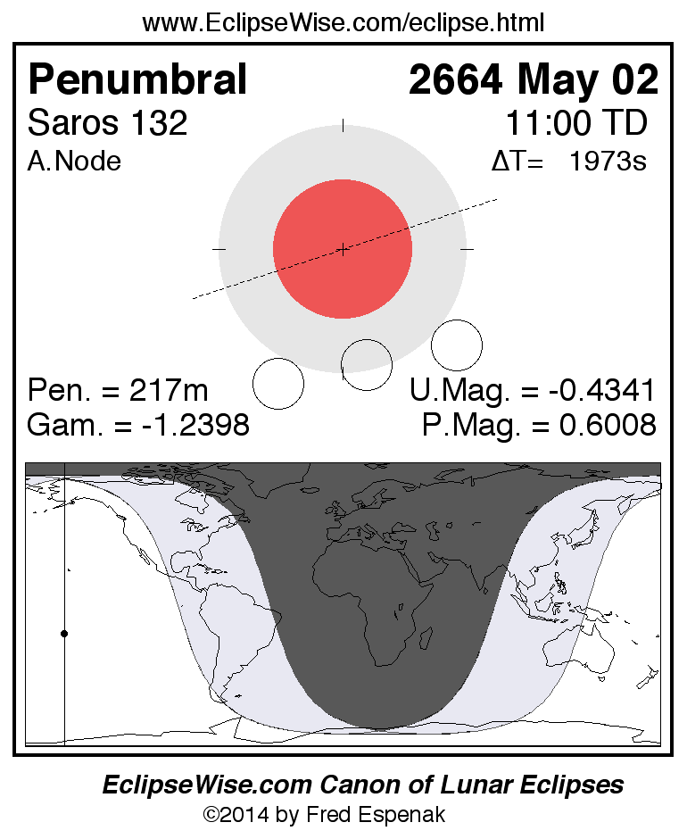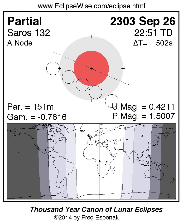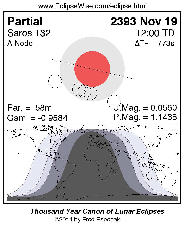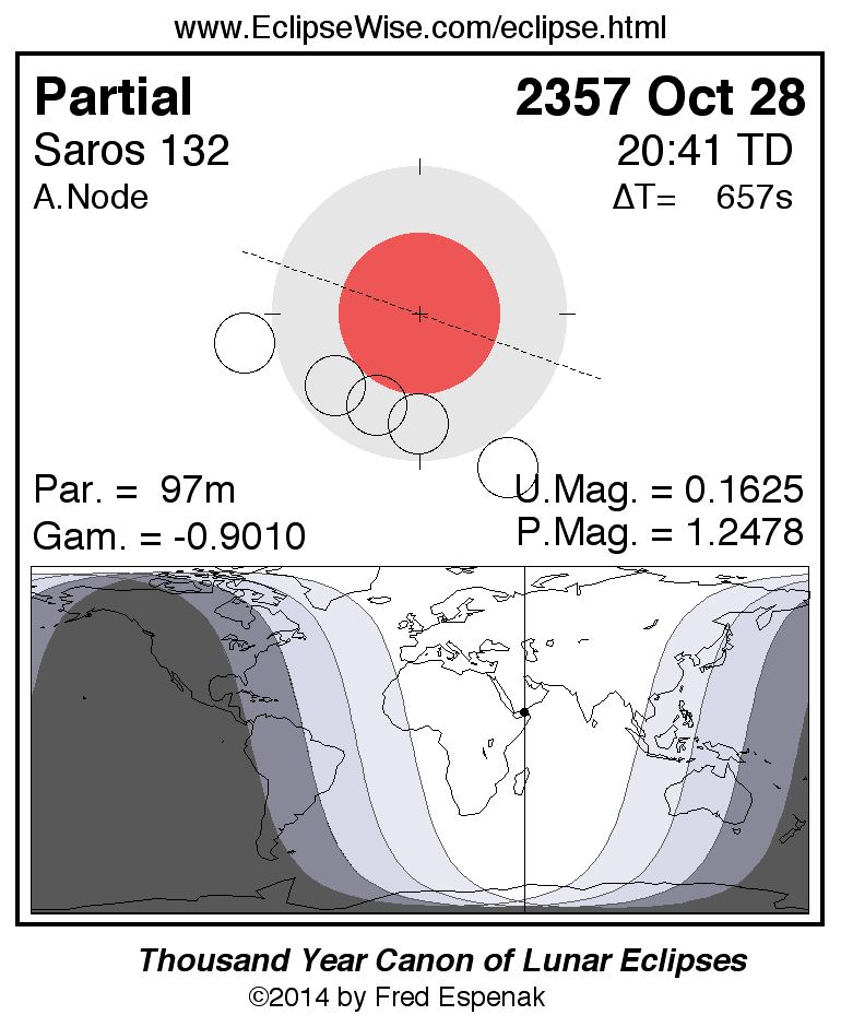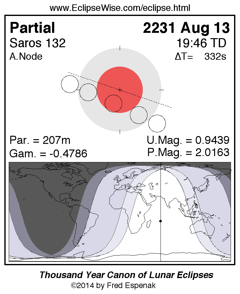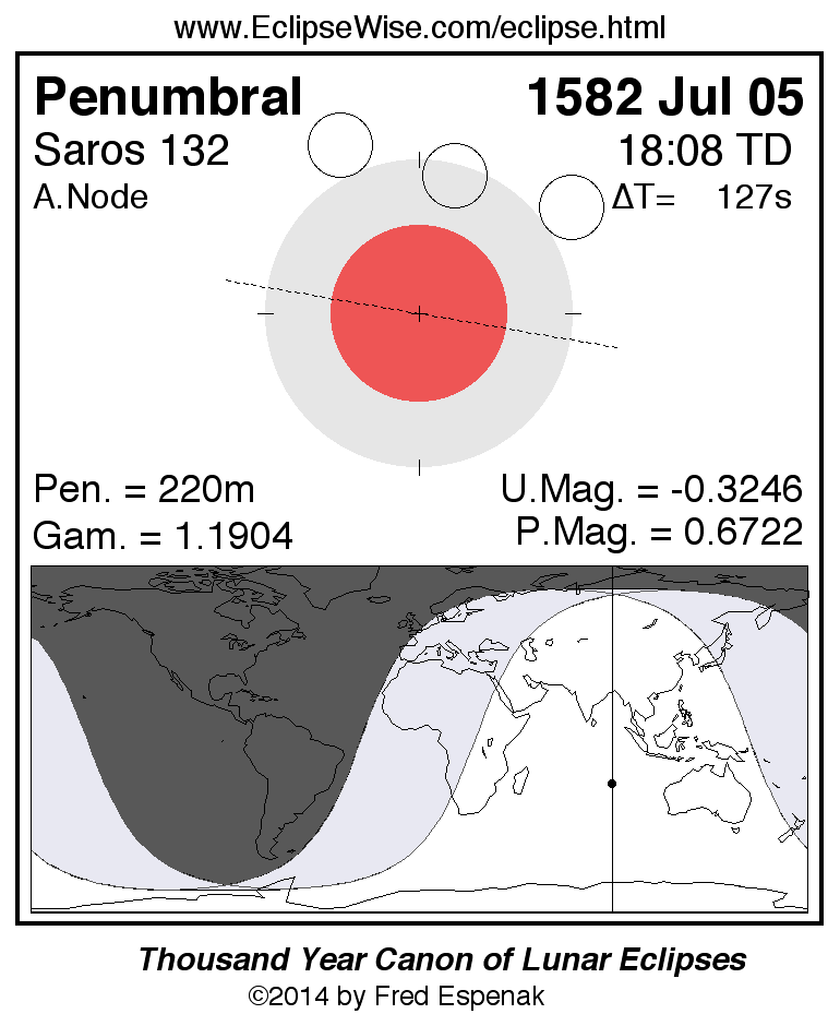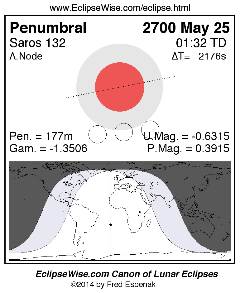A panorama of all lunar eclipses belonging to Saros 132 is presented here. Each figure shows the Moon's path with respect to Earth's penumbral and umbral shadows. Below the path is a map depicting the geographic region of visibility for the eclipse. The date and time are given for the instant of Greatest Eclipse. Every figure serves as a hyperlink to the EclipseWise Prime page for that eclipse with a larger figure and complete details for the eclipse. Visit the Key to Lunar Eclipse Figures for a detailed explanation of these diagrams. Near the bottom of this page are a series of hyperlinks for more on lunar eclipses.