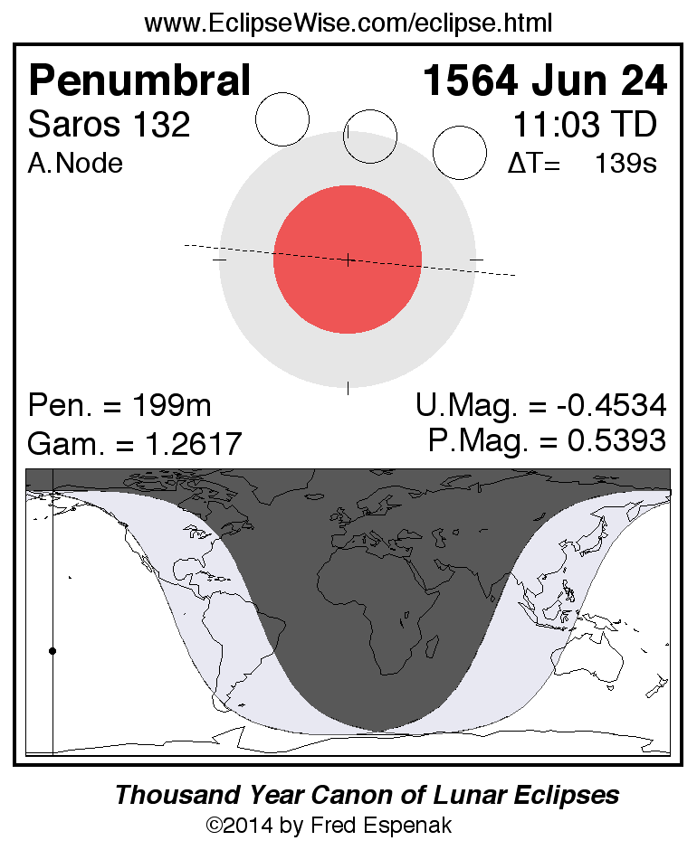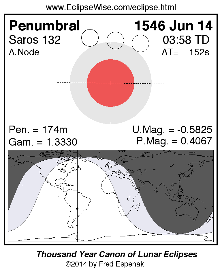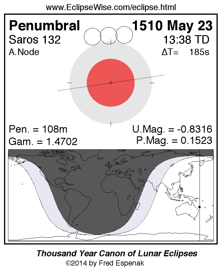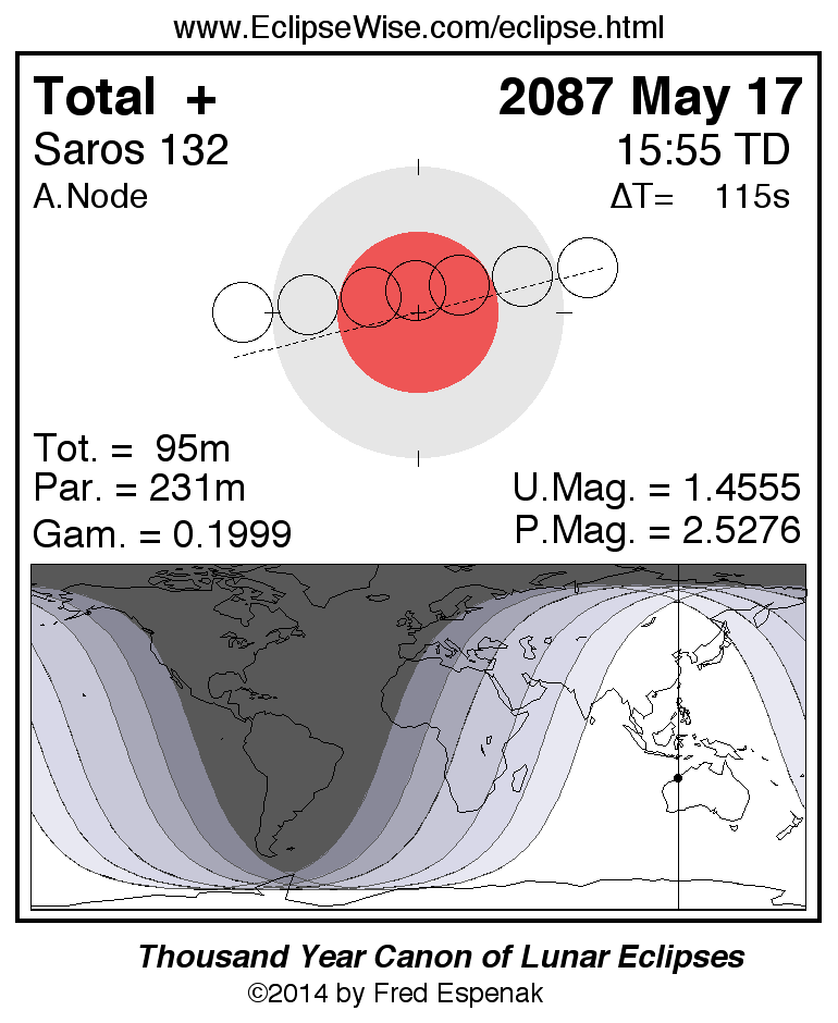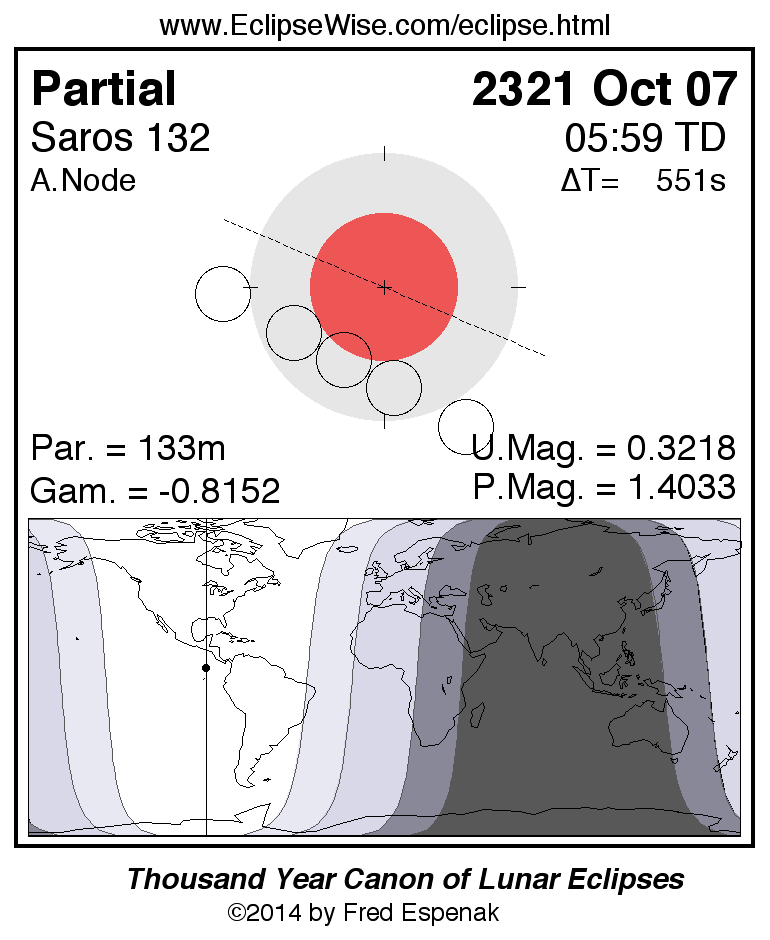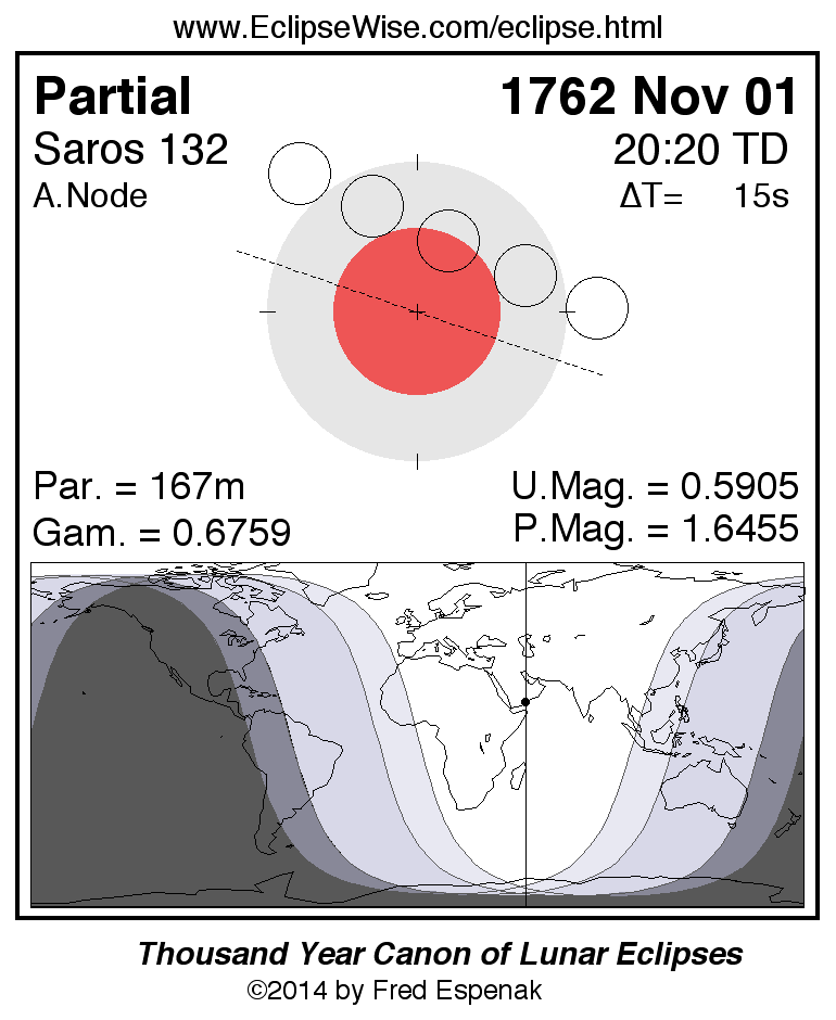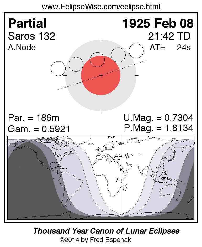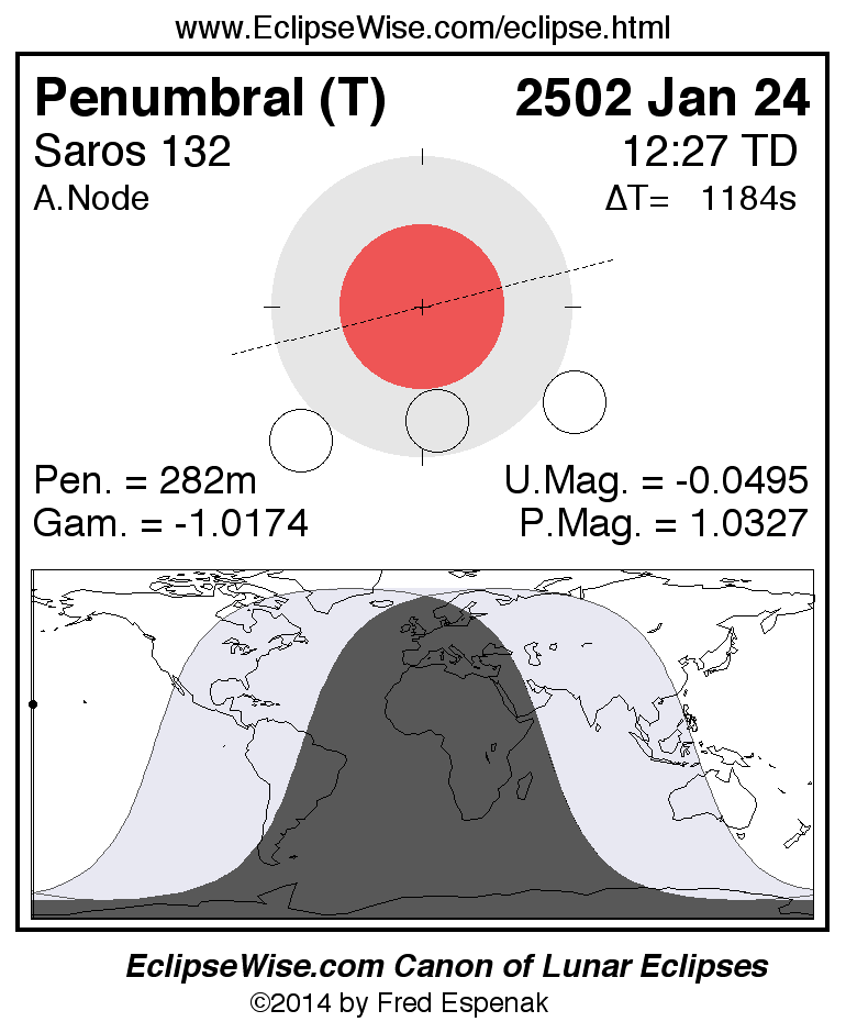 A panorama of all lunar eclipses belonging to Saros 132 is presented here. Each figure shows the Moon's path with respect to Earth's penumbral and umbral shadows. Below the path is a map depicting the geographic region of visibility for the eclipse. The date and time are given for the instant of Greatest Eclipse. Every figure serves as a hyperlink to the EclipseWise Prime page for that eclipse with a larger figure and complete details for the eclipse. Visit the Key to Lunar Eclipse Figures for a detailed explanation of these diagrams. Near the bottom of this page are a series of hyperlinks for more on lunar eclipses.