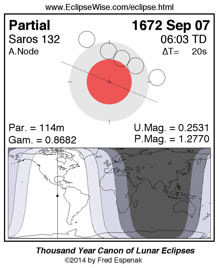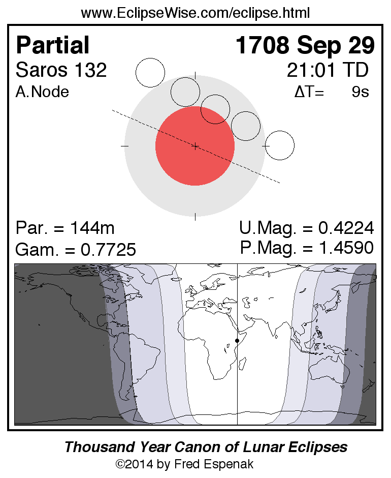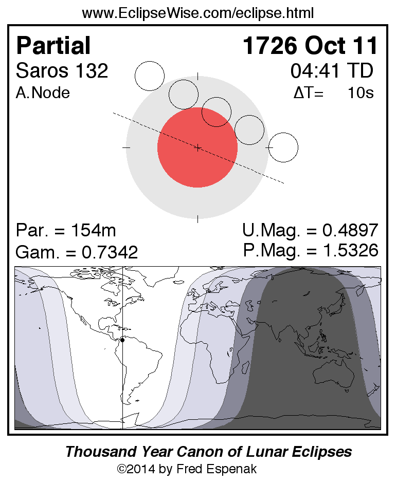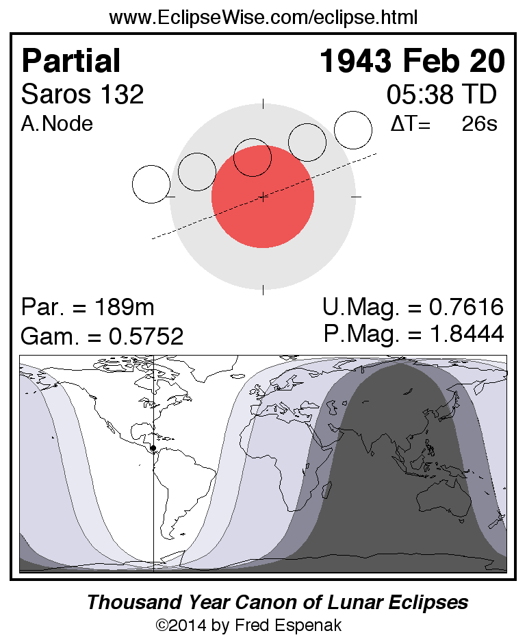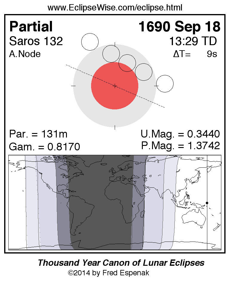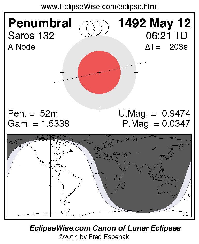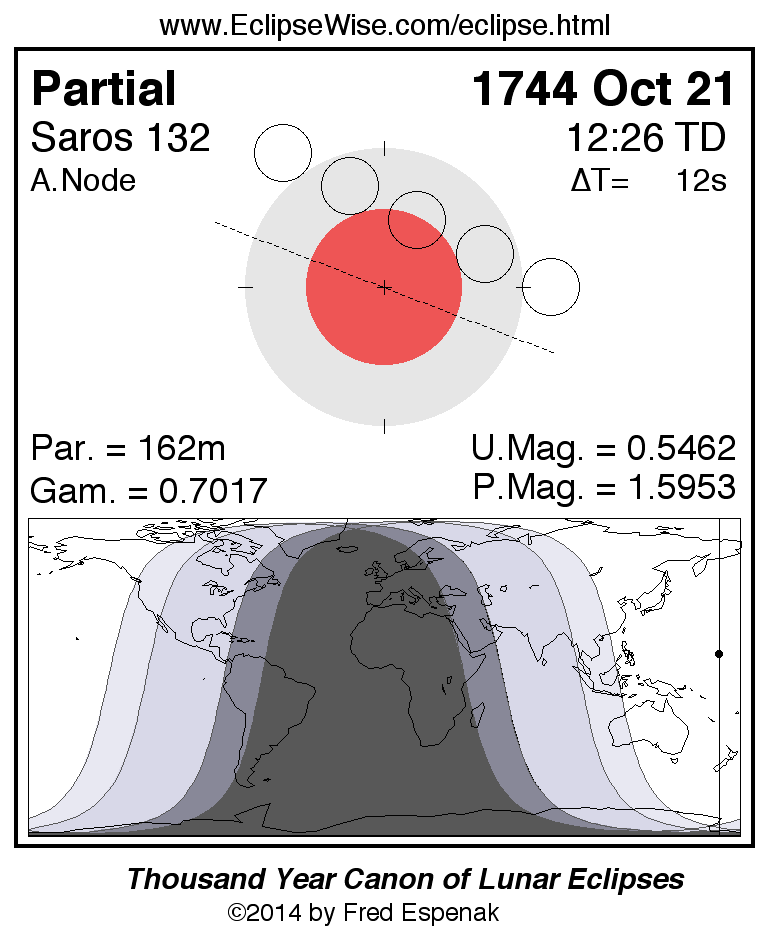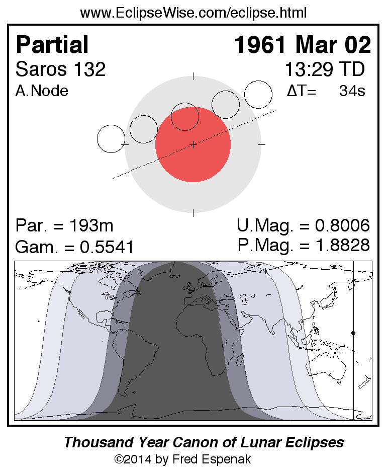 A panorama of all lunar eclipses belonging to Saros 132 is presented here. Each figure shows the Moon's path with respect to Earth's penumbral and umbral shadows. Below the path is a map depicting the geographic region of visibility for the eclipse. The date and time are given for the instant of Greatest Eclipse. Every figure serves as a hyperlink to the EclipseWise Prime page for that eclipse with a larger figure and complete details for the eclipse. Visit the Key to Lunar Eclipse Figures for a detailed explanation of these diagrams. Near the bottom of this page are a series of hyperlinks for more on lunar eclipses.