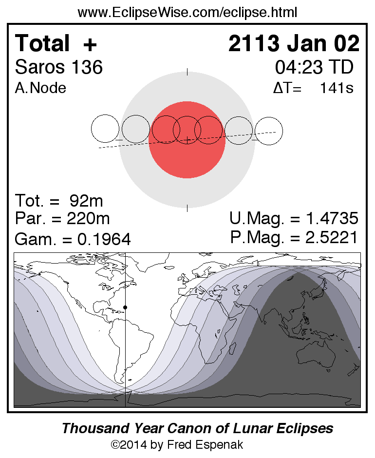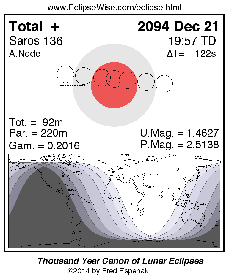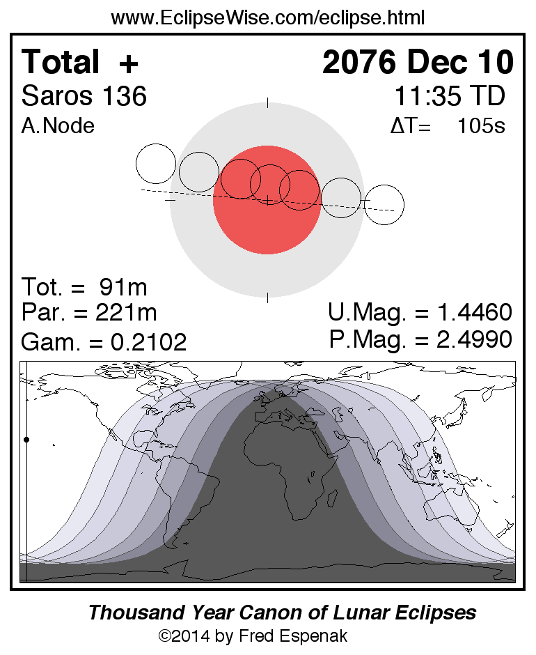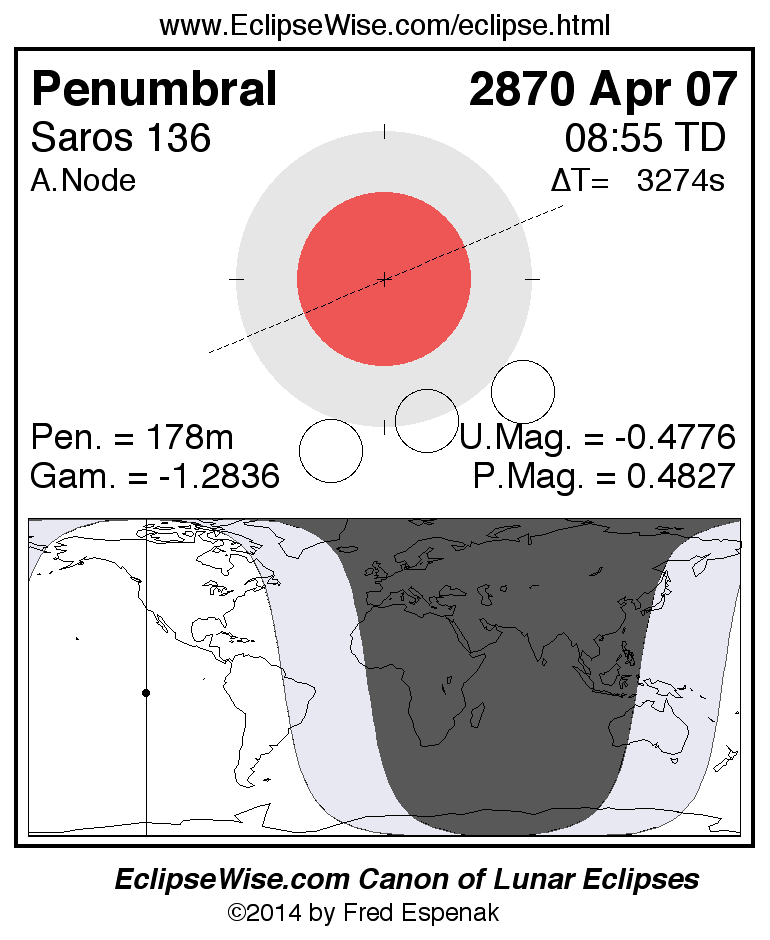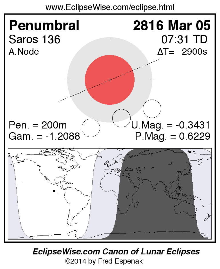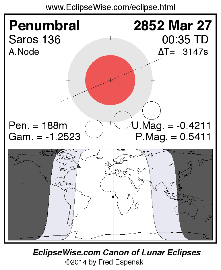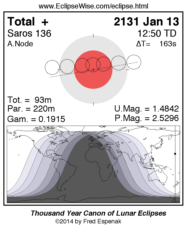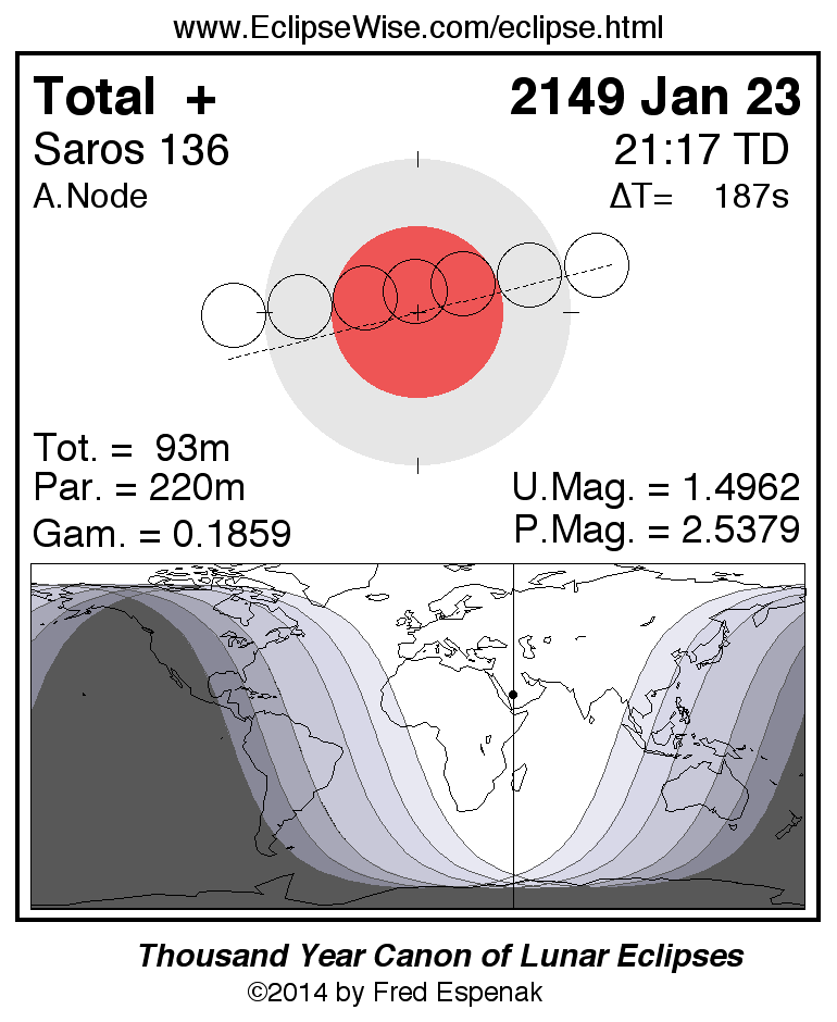 A panorama of all lunar eclipses belonging to Saros 136 is presented here. Each figure shows the Moon's path with respect to Earth's penumbral and umbral shadows. Below the path is a map depicting the geographic region of visibility for the eclipse. The date and time are given for the instant of Greatest Eclipse. Every figure serves as a hyperlink to the EclipseWise Prime page for that eclipse with a larger figure and complete details for the eclipse. Visit the Key to Lunar Eclipse Figures for a detailed explanation of these diagrams. Near the bottom of this page are a series of hyperlinks for more on lunar eclipses.