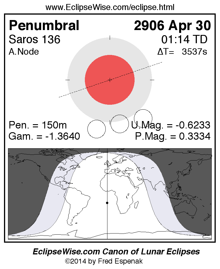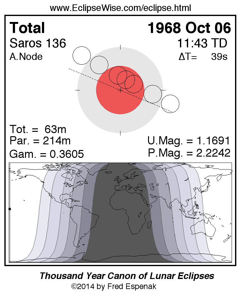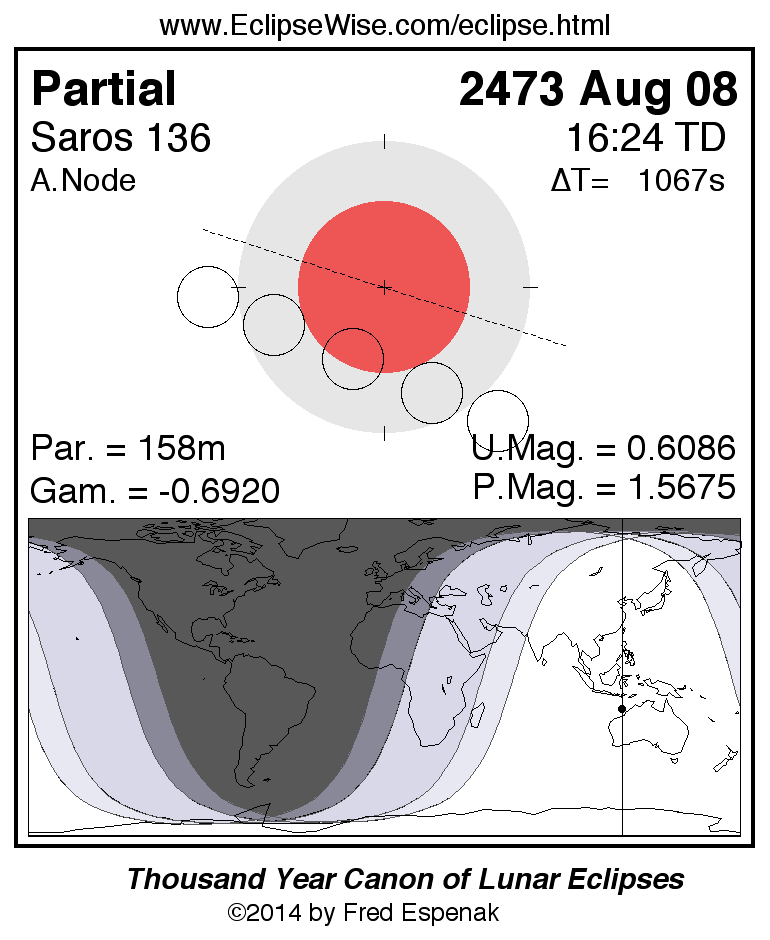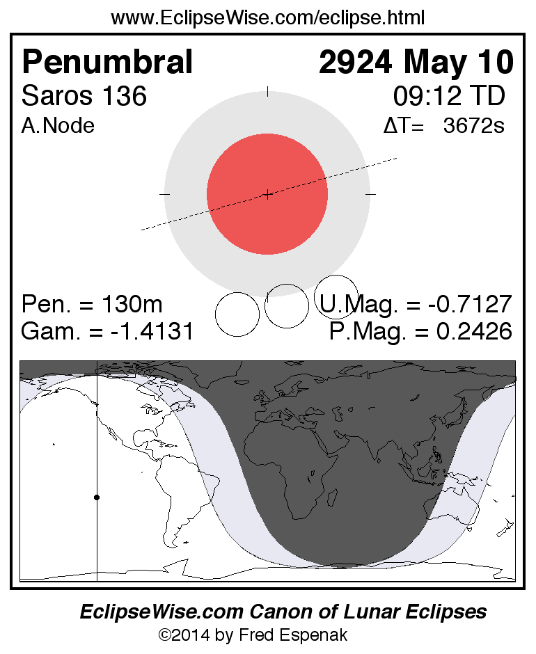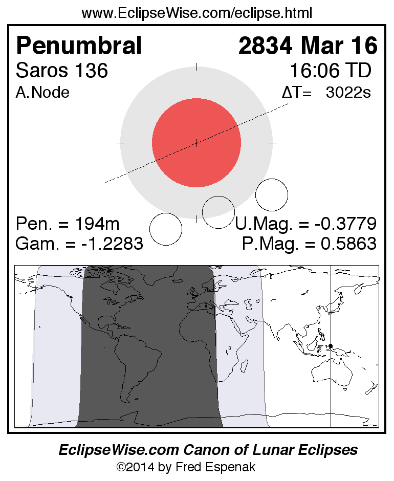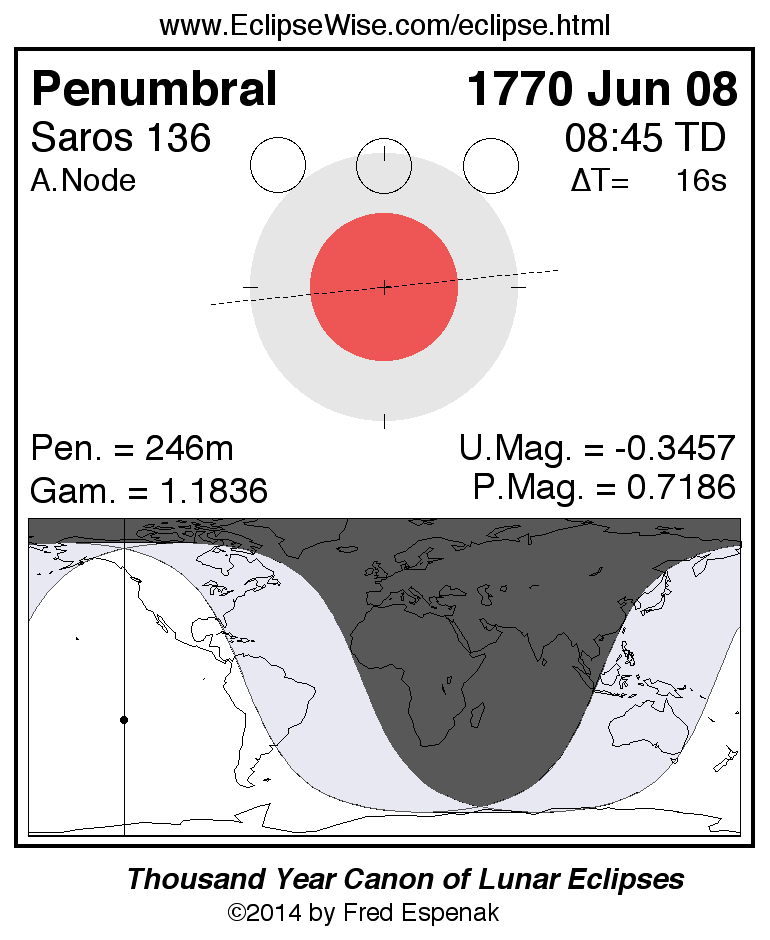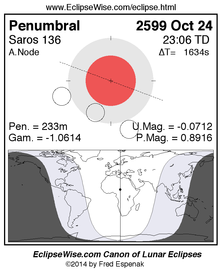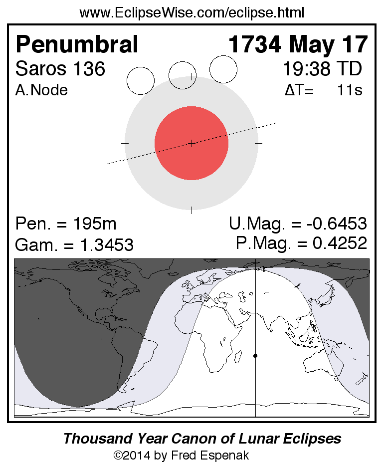 A panorama of all lunar eclipses belonging to Saros 136 is presented here. Each figure shows the Moon's path with respect to Earth's penumbral and umbral shadows. Below the path is a map depicting the geographic region of visibility for the eclipse. The date and time are given for the instant of Greatest Eclipse. Every figure serves as a hyperlink to the EclipseWise Prime page for that eclipse with a larger figure and complete details for the eclipse. Visit the Key to Lunar Eclipse Figures for a detailed explanation of these diagrams. Near the bottom of this page are a series of hyperlinks for more on lunar eclipses.