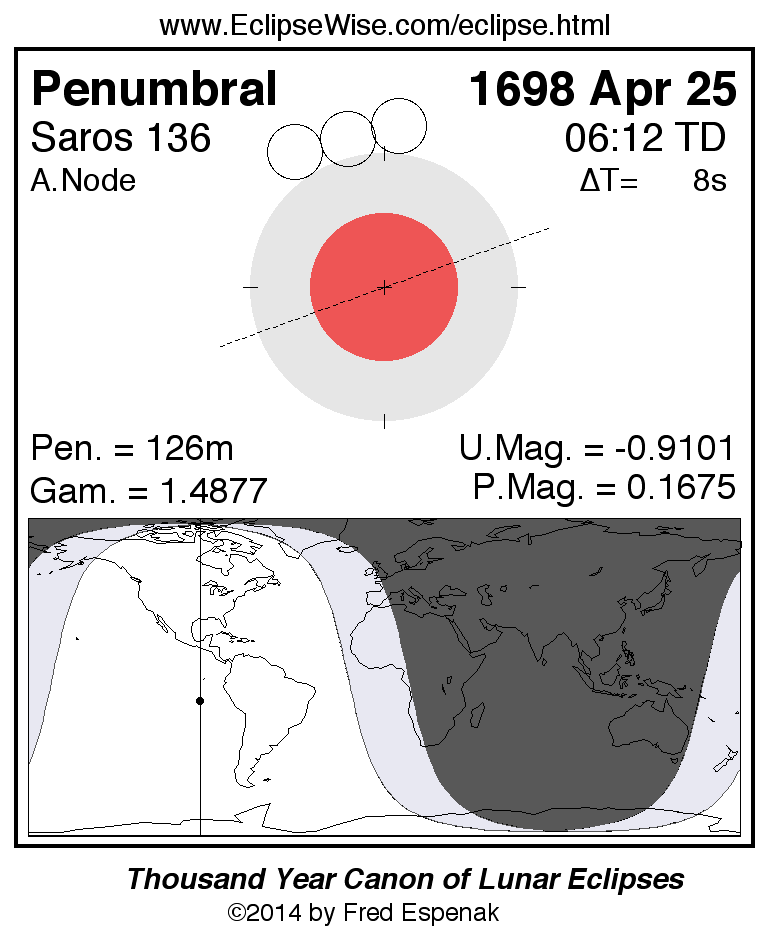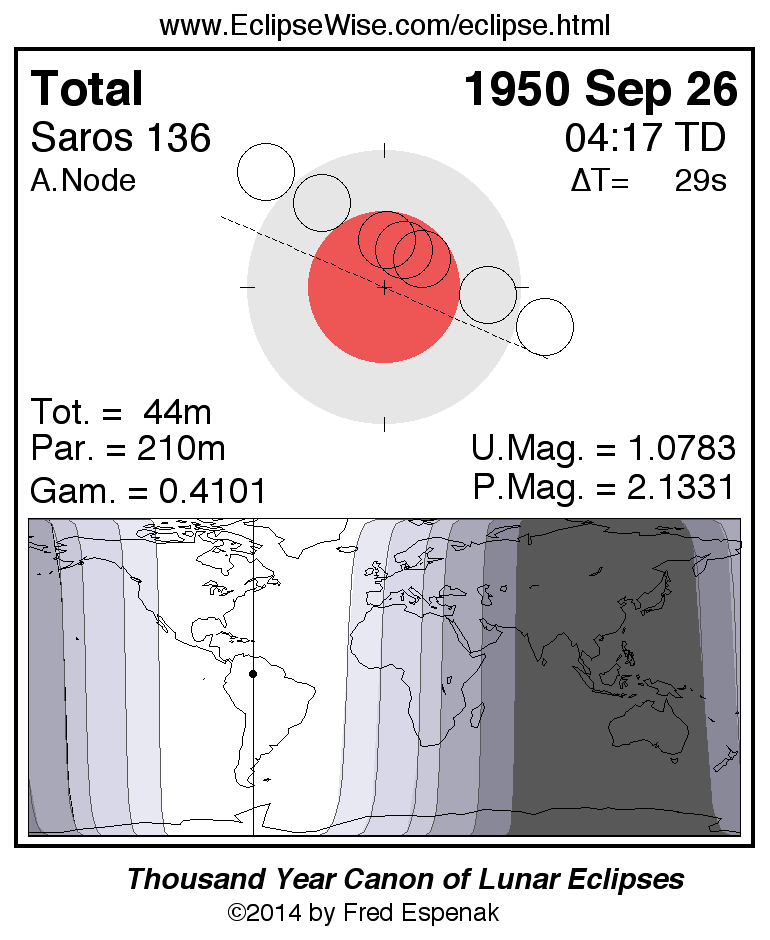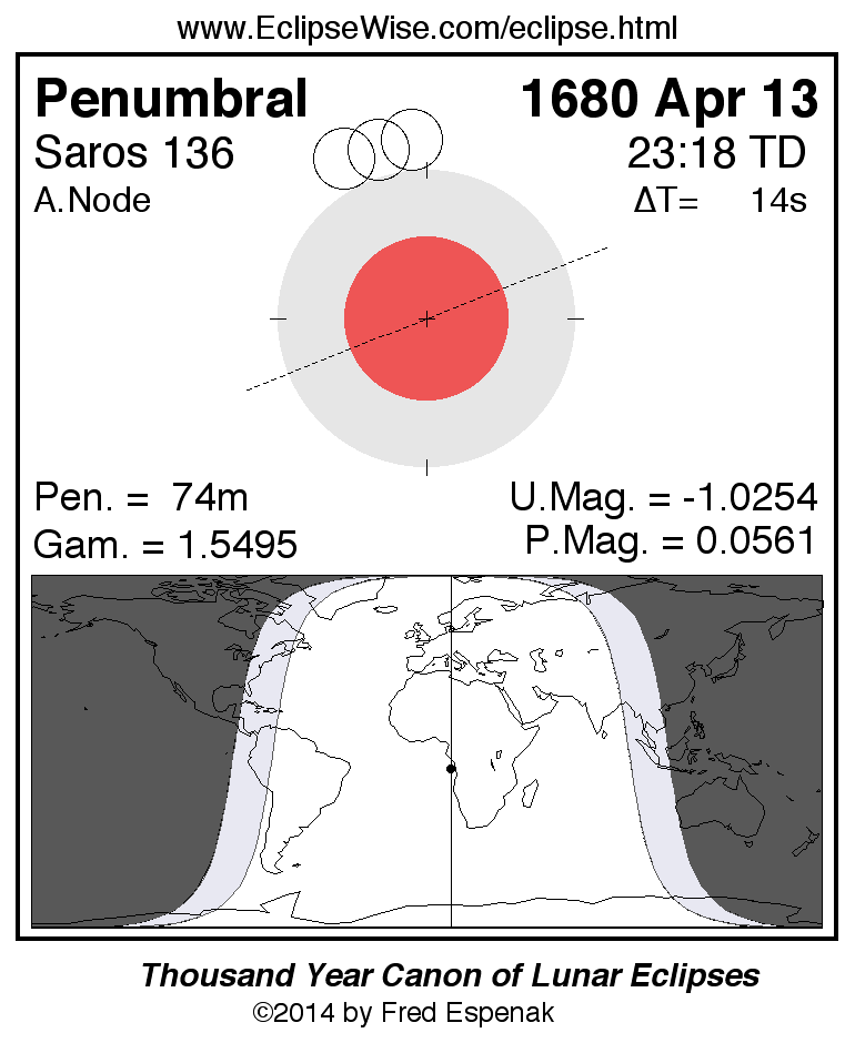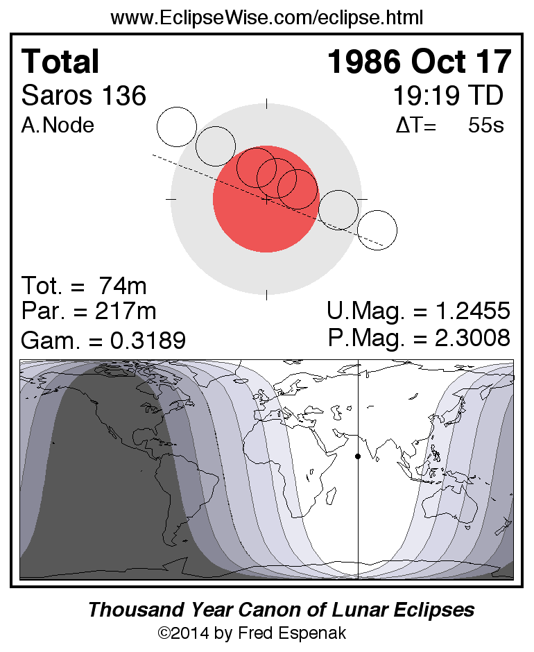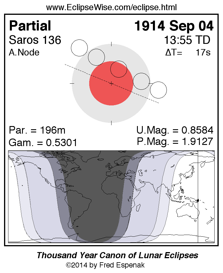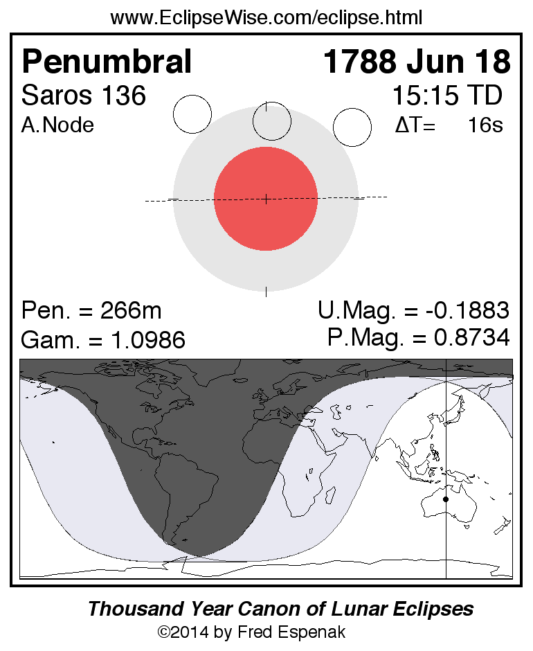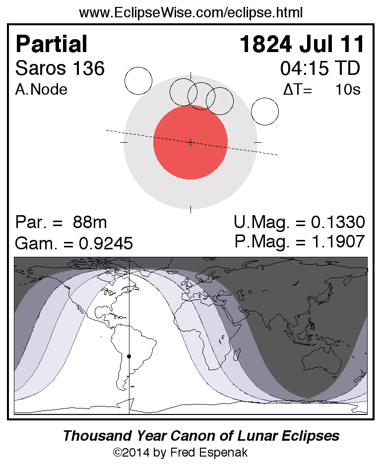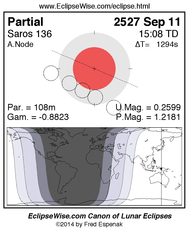 A panorama of all lunar eclipses belonging to Saros 136 is presented here. Each figure shows the Moon's path with respect to Earth's penumbral and umbral shadows. Below the path is a map depicting the geographic region of visibility for the eclipse. The date and time are given for the instant of Greatest Eclipse. Every figure serves as a hyperlink to the EclipseWise Prime page for that eclipse with a larger figure and complete details for the eclipse. Visit the Key to Lunar Eclipse Figures for a detailed explanation of these diagrams. Near the bottom of this page are a series of hyperlinks for more on lunar eclipses.