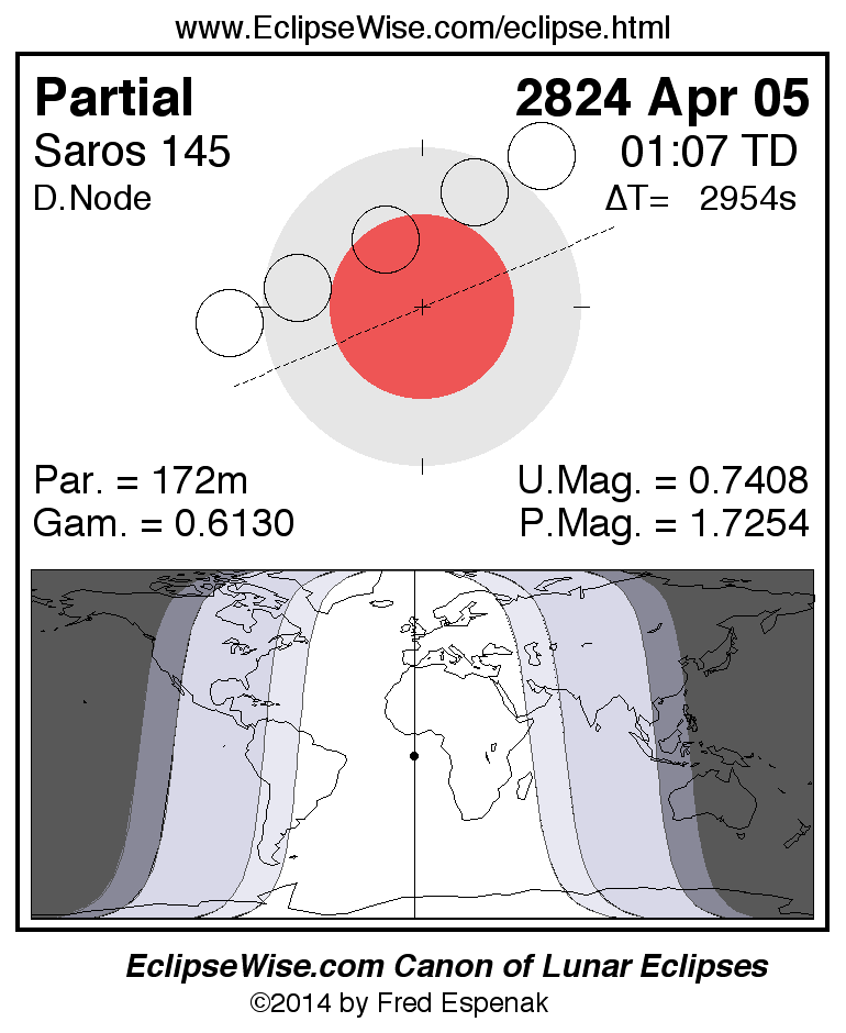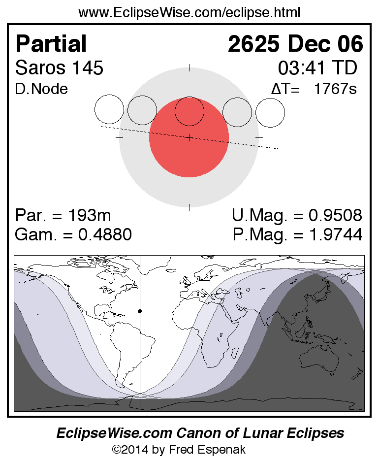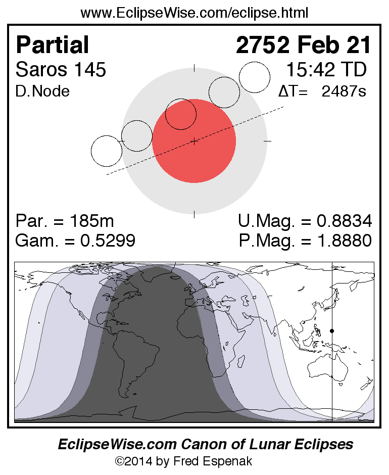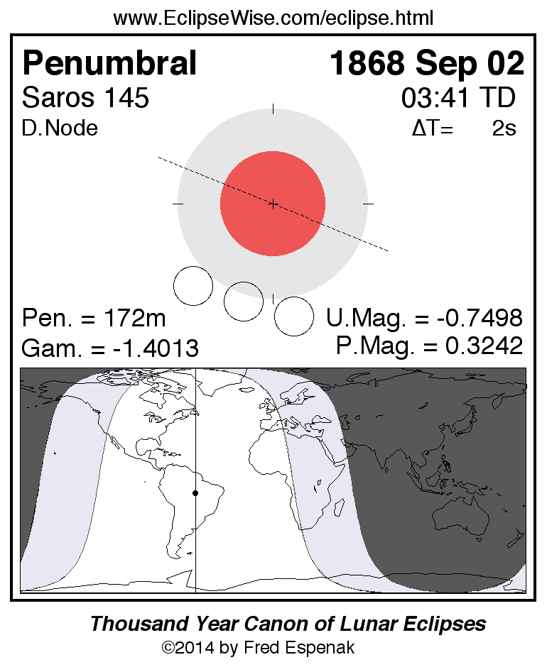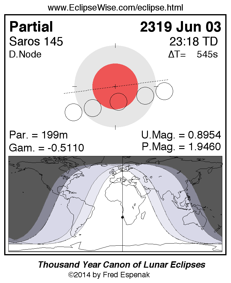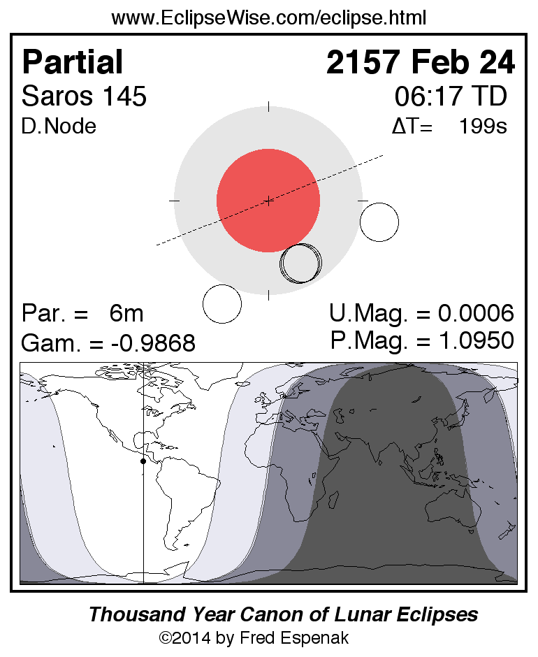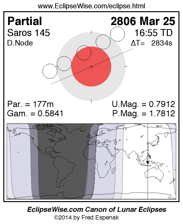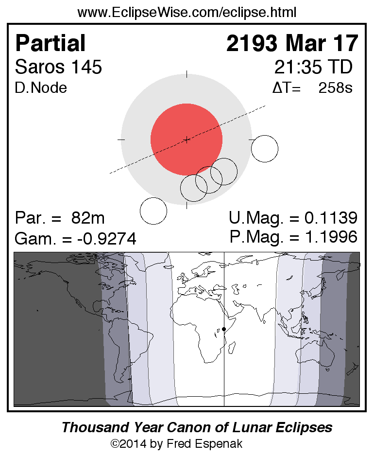 A panorama of all lunar eclipses belonging to Saros 145 is presented here. Each figure shows the Moon's path with respect to Earth's penumbral and umbral shadows. Below the path is a map depicting the geographic region of visibility for the eclipse. The date and time are given for the instant of Greatest Eclipse. Every figure serves as a hyperlink to the EclipseWise Prime page for that eclipse with a larger figure and complete details for the eclipse. Visit the Key to Lunar Eclipse Figures for a detailed explanation of these diagrams. Near the bottom of this page are a series of hyperlinks for more on lunar eclipses.