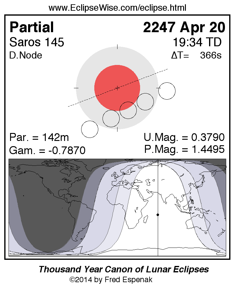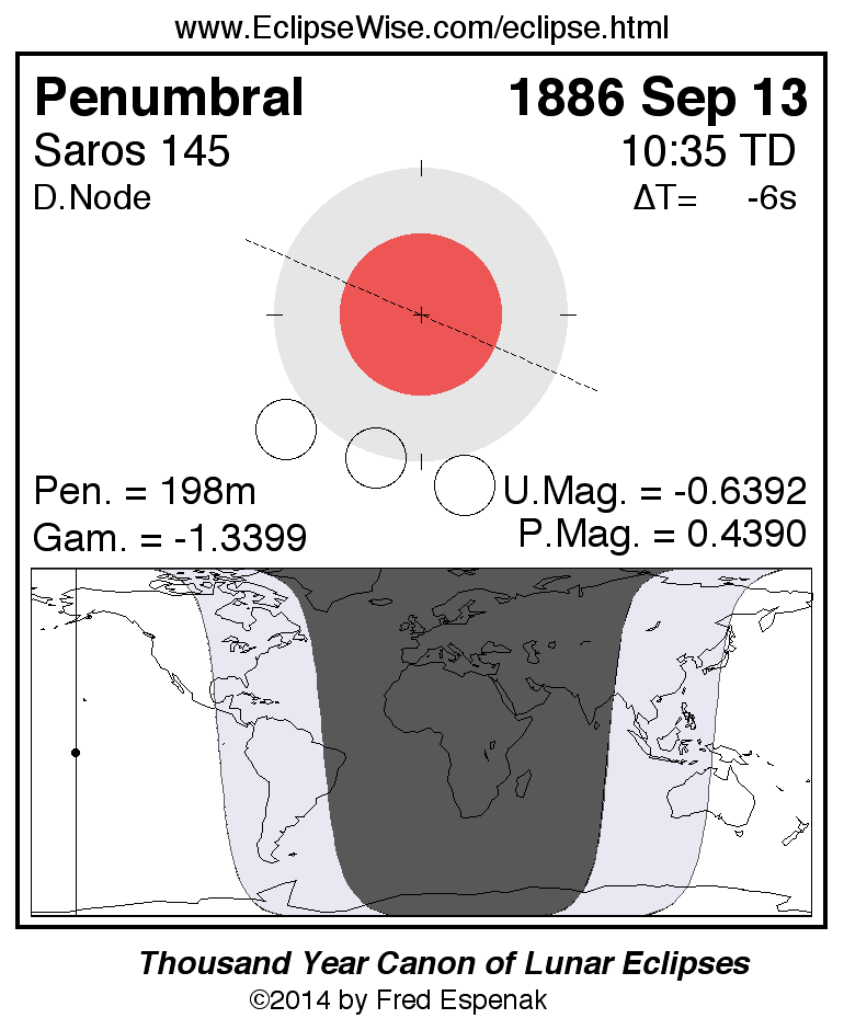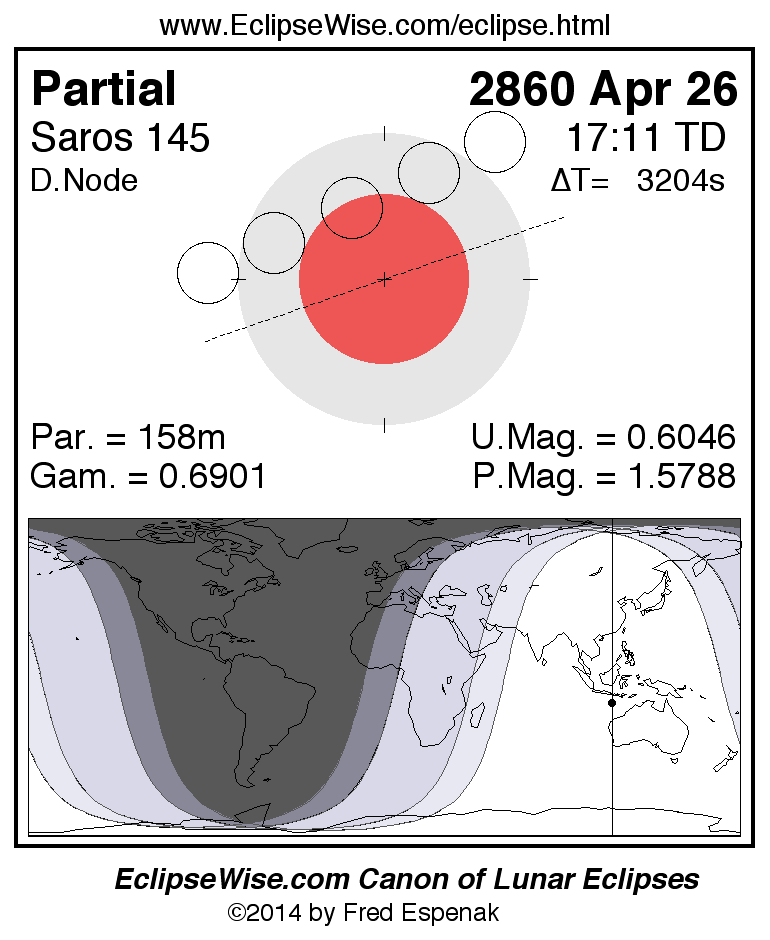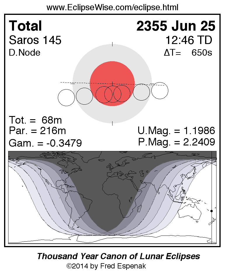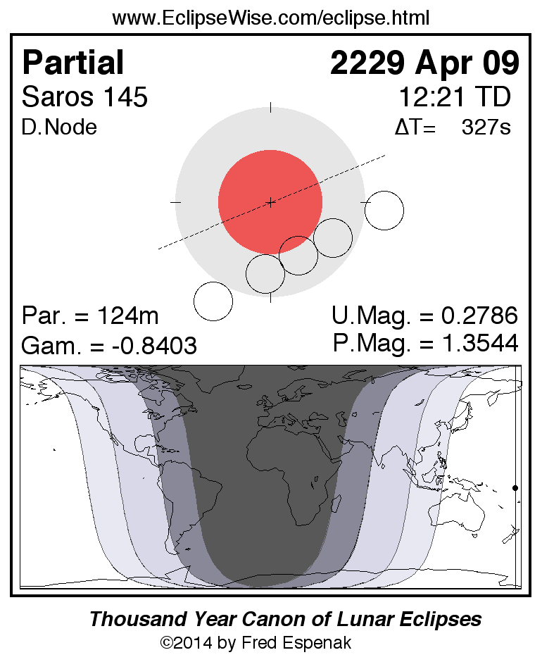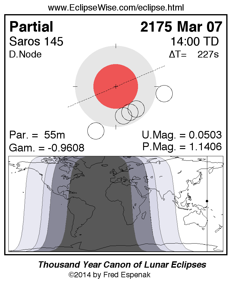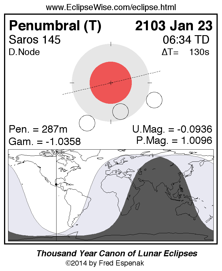 A panorama of all lunar eclipses belonging to Saros 145 is presented here. Each figure shows the Moon's path with respect to Earth's penumbral and umbral shadows. Below the path is a map depicting the geographic region of visibility for the eclipse. The date and time are given for the instant of Greatest Eclipse. Every figure serves as a hyperlink to the EclipseWise Prime page for that eclipse with a larger figure and complete details for the eclipse. Visit the Key to Lunar Eclipse Figures for a detailed explanation of these diagrams. Near the bottom of this page are a series of hyperlinks for more on lunar eclipses.