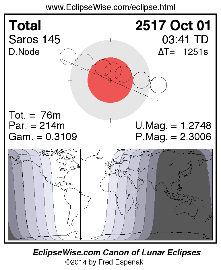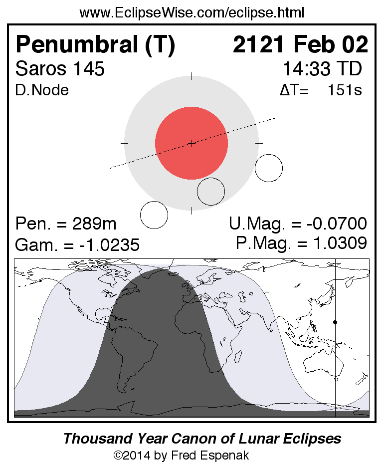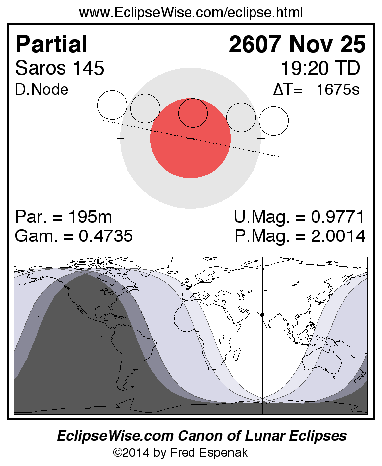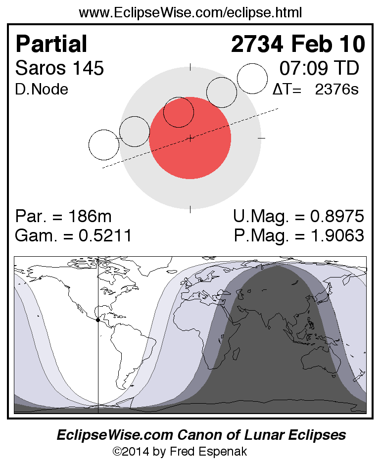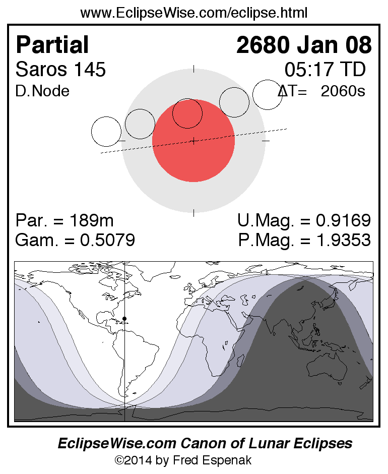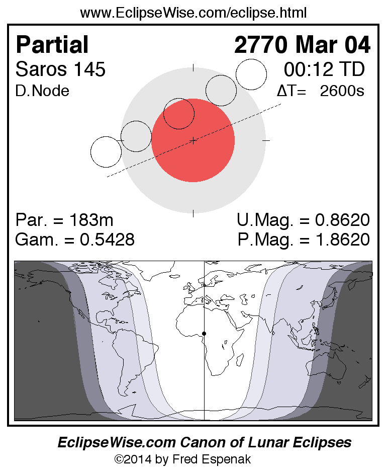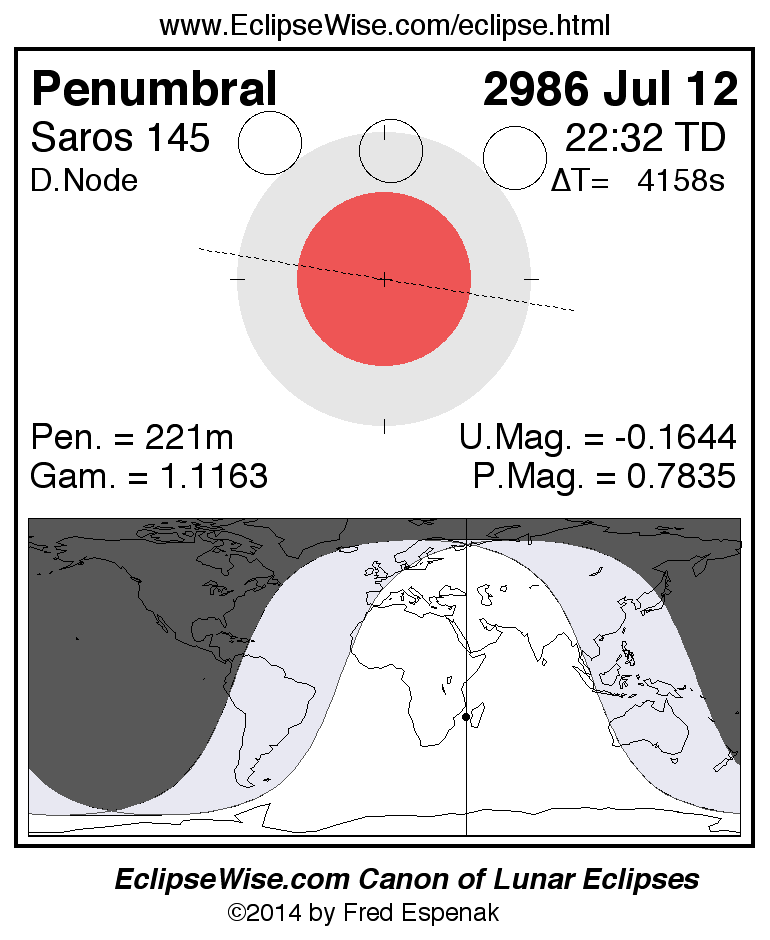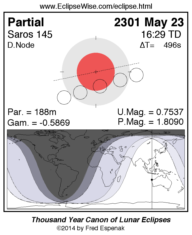 A panorama of all lunar eclipses belonging to Saros 145 is presented here. Each figure shows the Moon's path with respect to Earth's penumbral and umbral shadows. Below the path is a map depicting the geographic region of visibility for the eclipse. The date and time are given for the instant of Greatest Eclipse. Every figure serves as a hyperlink to the EclipseWise Prime page for that eclipse with a larger figure and complete details for the eclipse. Visit the Key to Lunar Eclipse Figures for a detailed explanation of these diagrams. Near the bottom of this page are a series of hyperlinks for more on lunar eclipses.