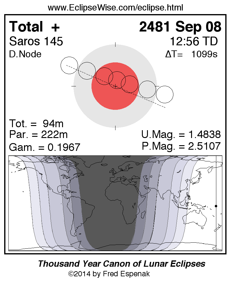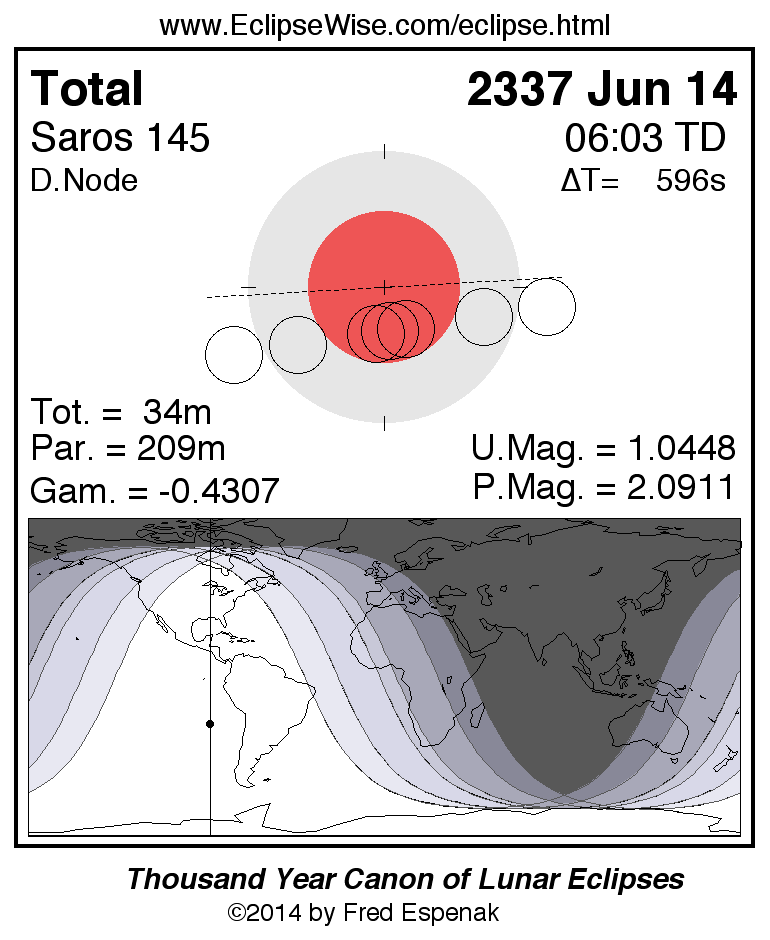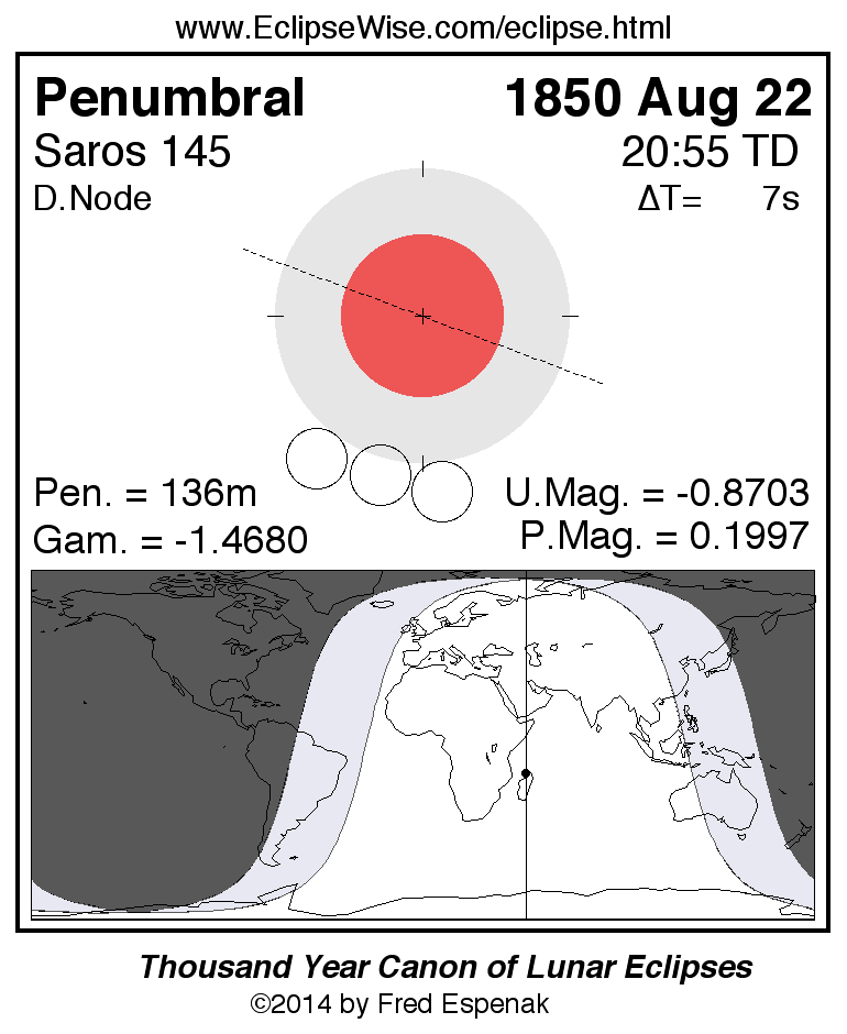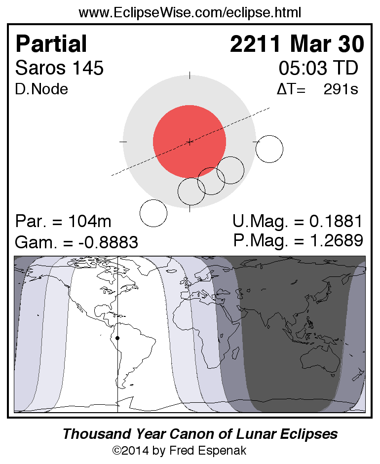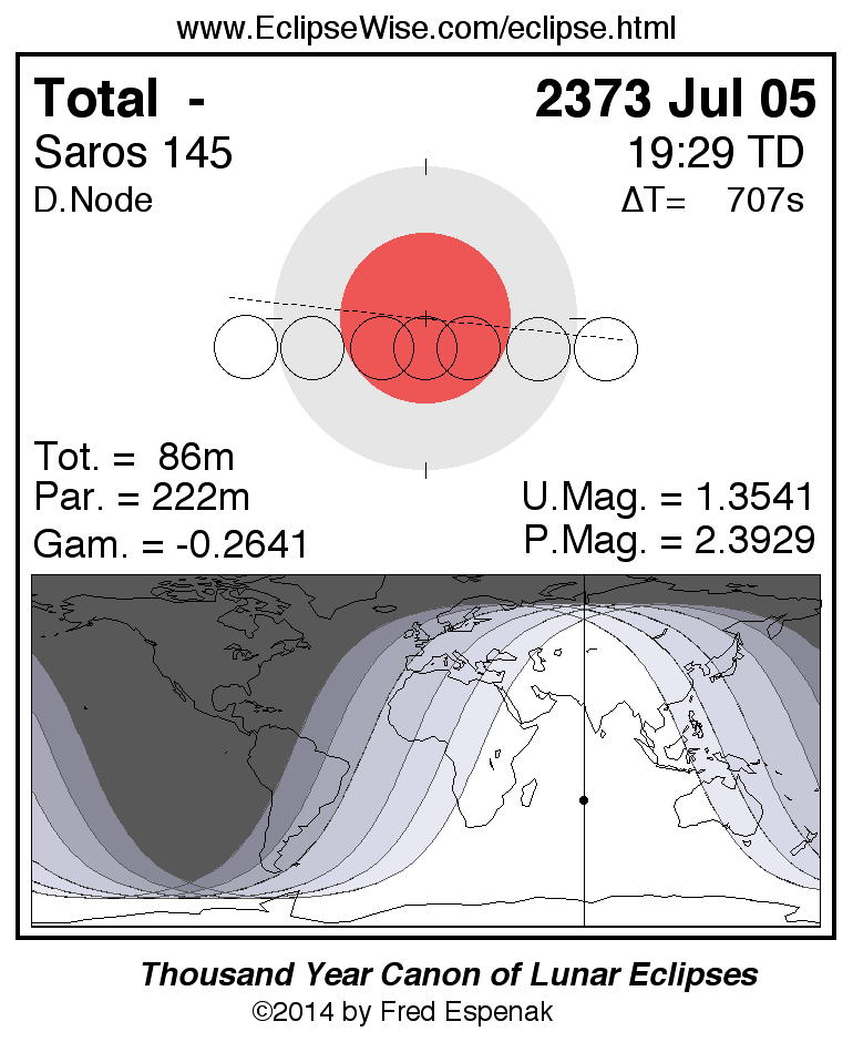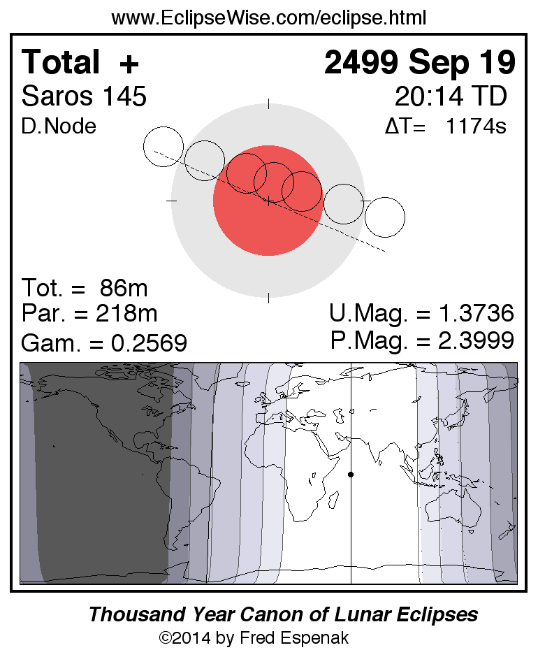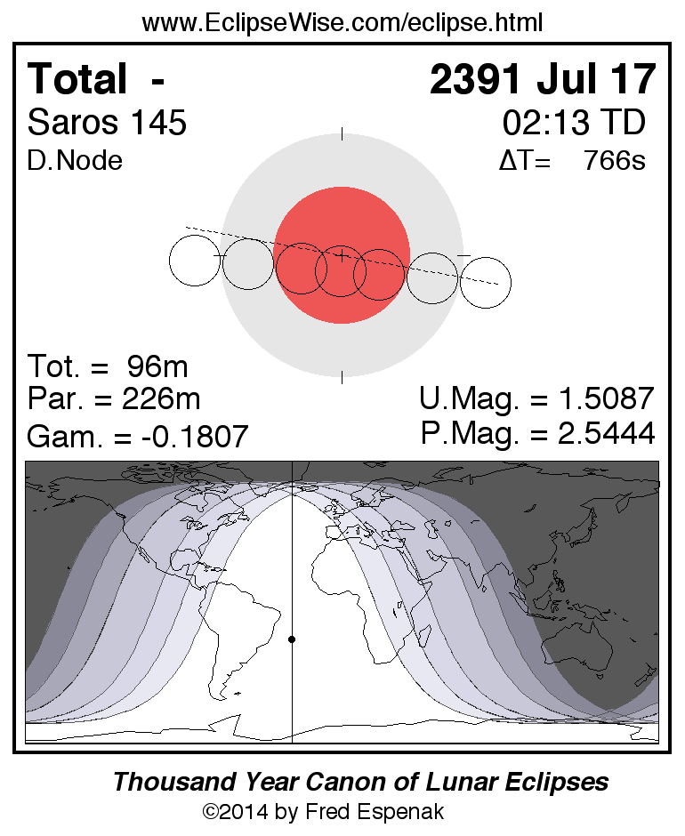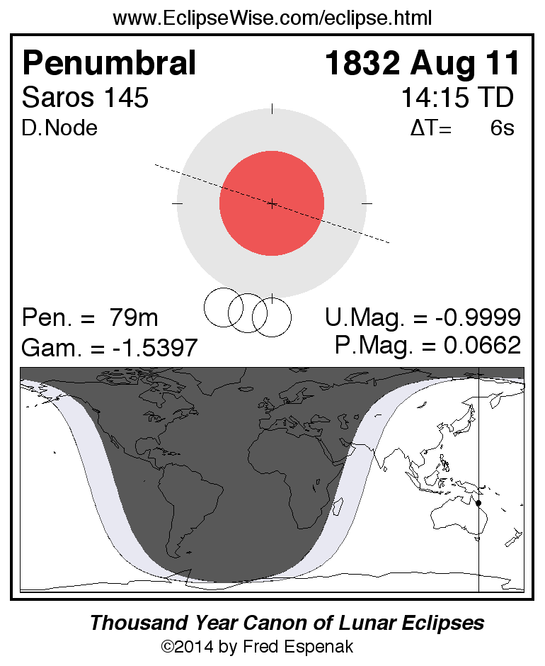 A panorama of all lunar eclipses belonging to Saros 145 is presented here. Each figure shows the Moon's path with respect to Earth's penumbral and umbral shadows. Below the path is a map depicting the geographic region of visibility for the eclipse. The date and time are given for the instant of Greatest Eclipse. Every figure serves as a hyperlink to the EclipseWise Prime page for that eclipse with a larger figure and complete details for the eclipse. Visit the Key to Lunar Eclipse Figures for a detailed explanation of these diagrams. Near the bottom of this page are a series of hyperlinks for more on lunar eclipses.