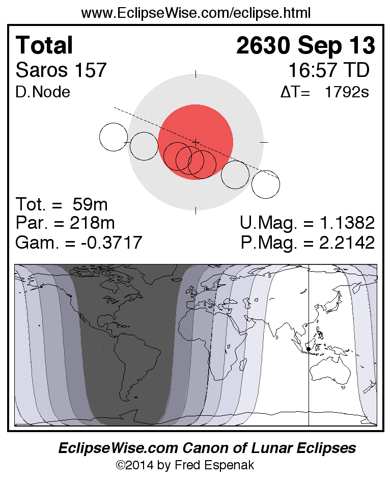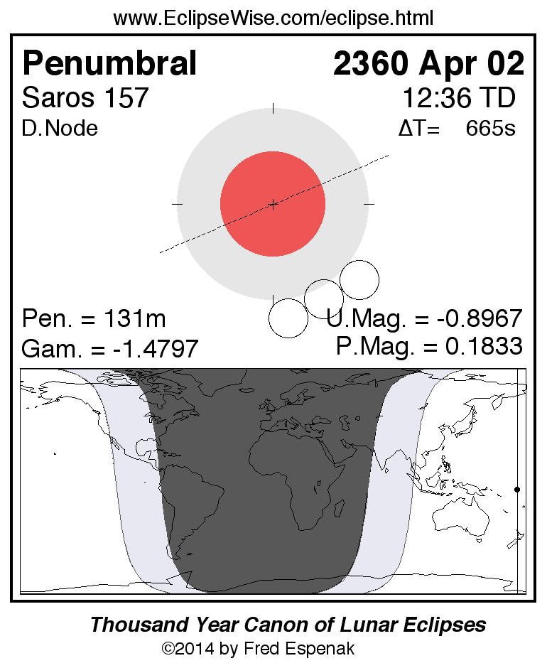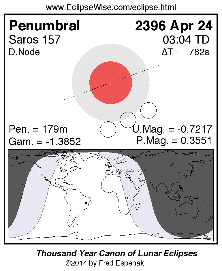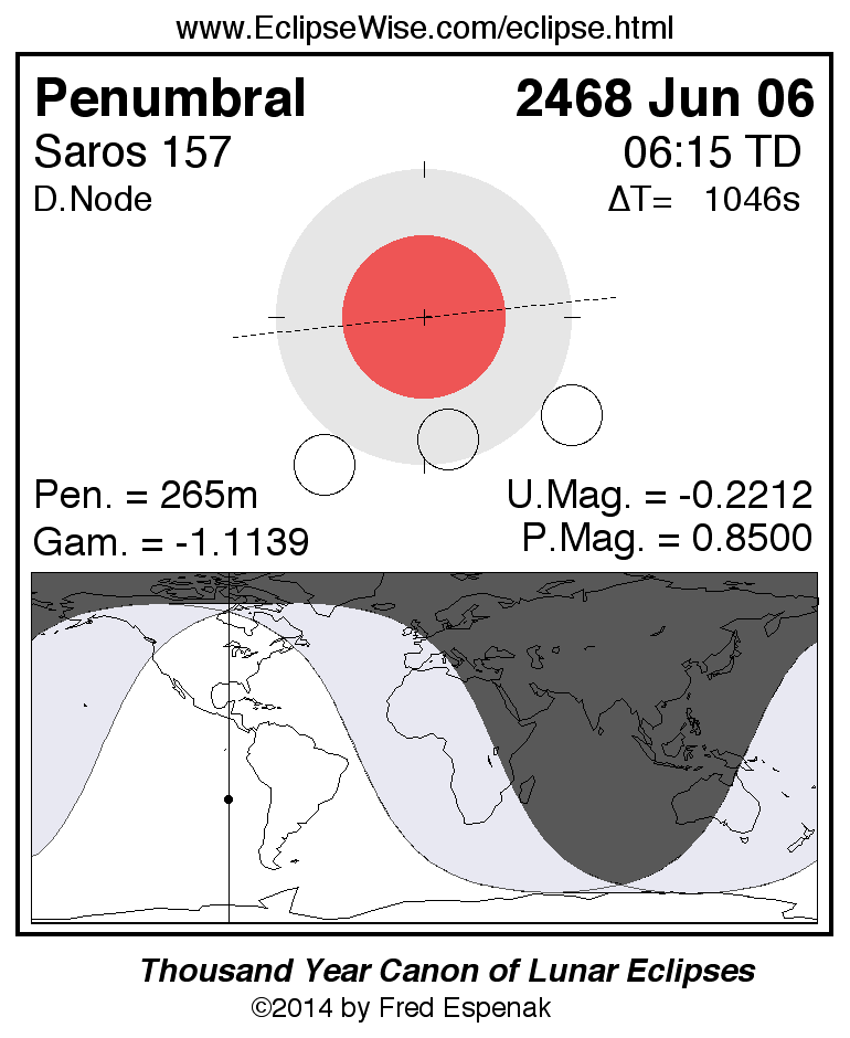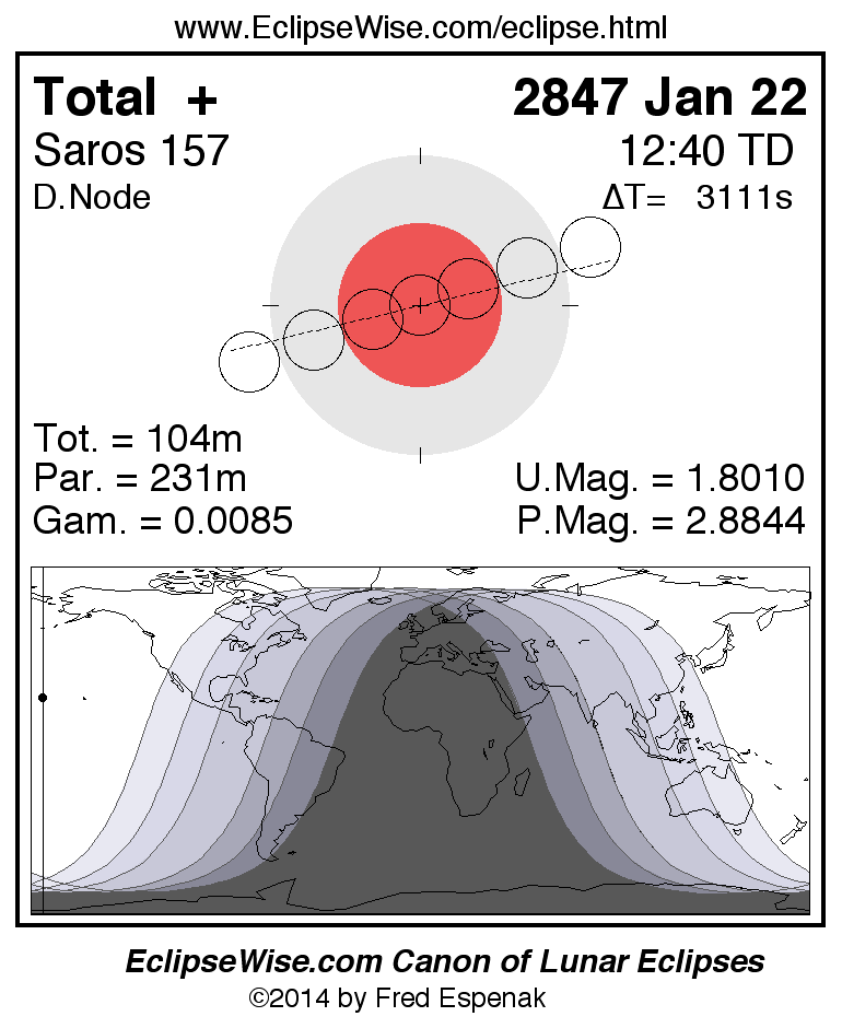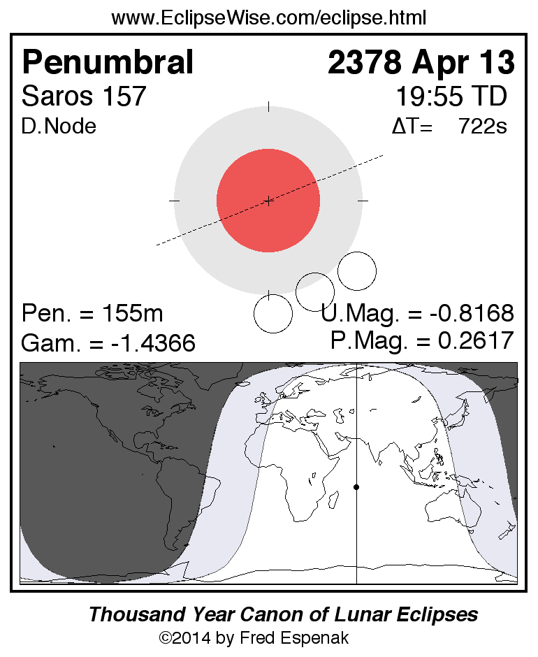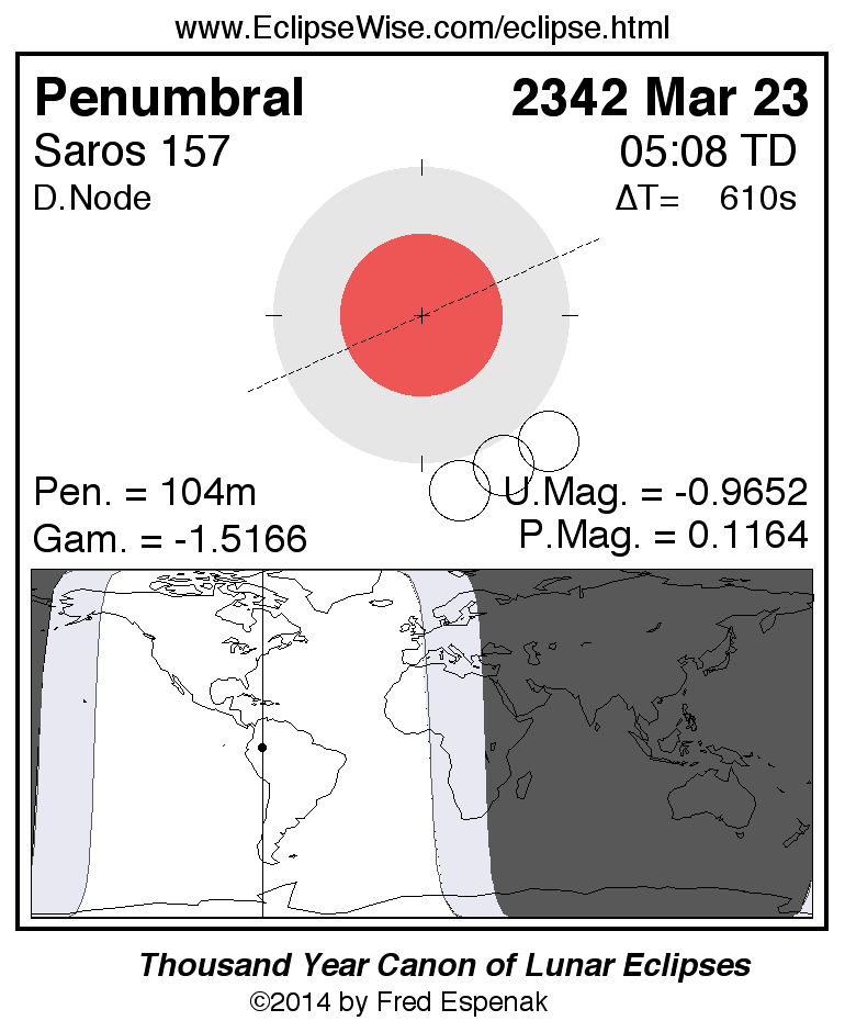 A panorama of all lunar eclipses belonging to Saros 157 is presented here. Each figure shows the Moon's path with respect to Earth's penumbral and umbral shadows. Below the path is a map depicting the geographic region of visibility for the eclipse. The date and time are given for the instant of Greatest Eclipse. Every figure serves as a hyperlink to the EclipseWise Prime page for that eclipse with a larger figure and complete details for the eclipse. Visit the Key to Lunar Eclipse Figures for a detailed explanation of these diagrams. Near the bottom of this page are a series of hyperlinks for more on lunar eclipses.