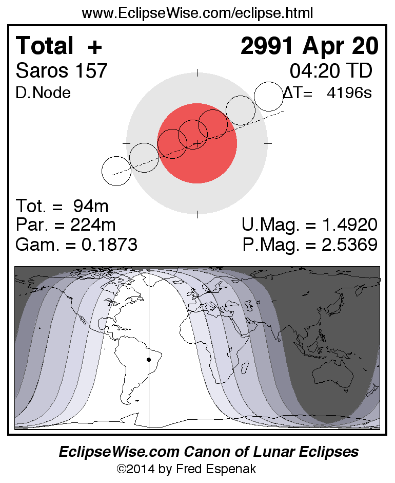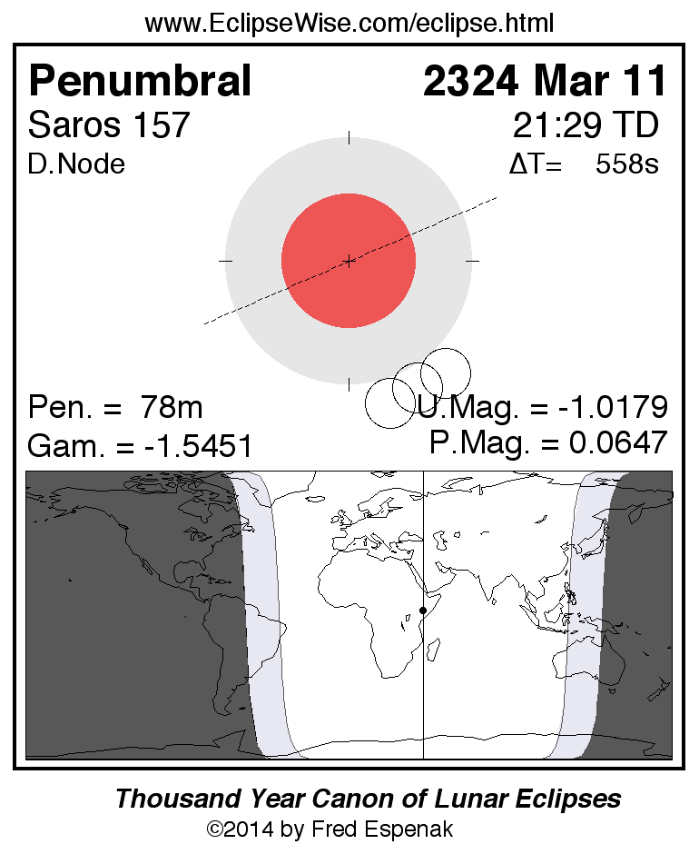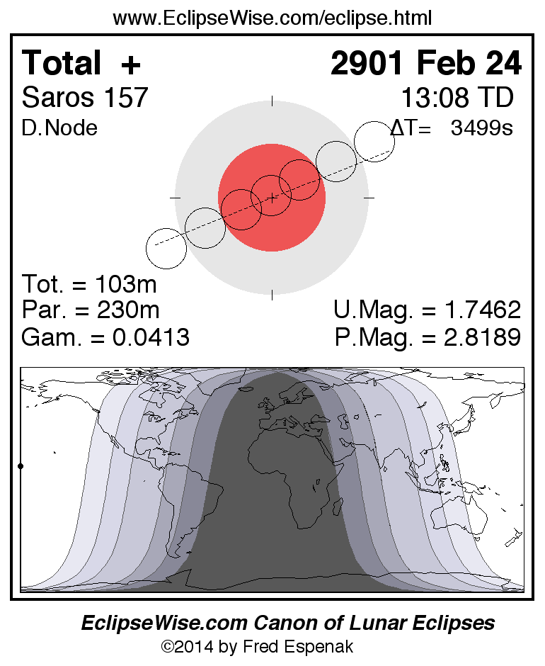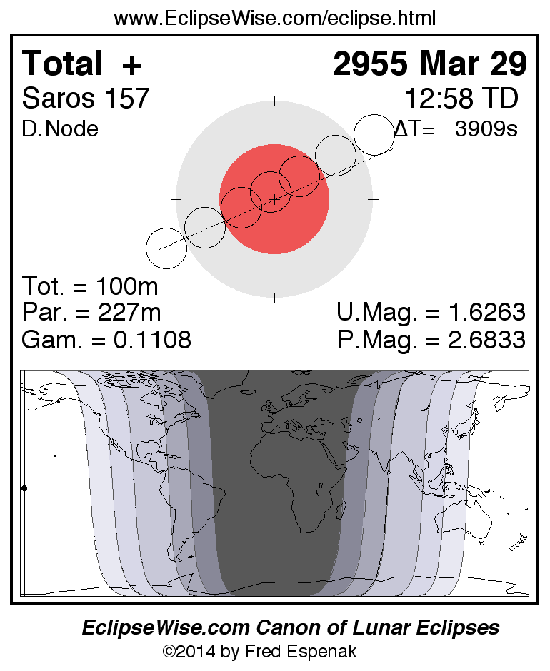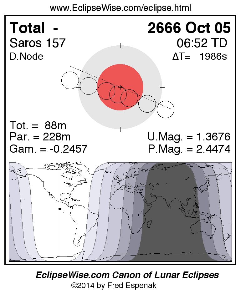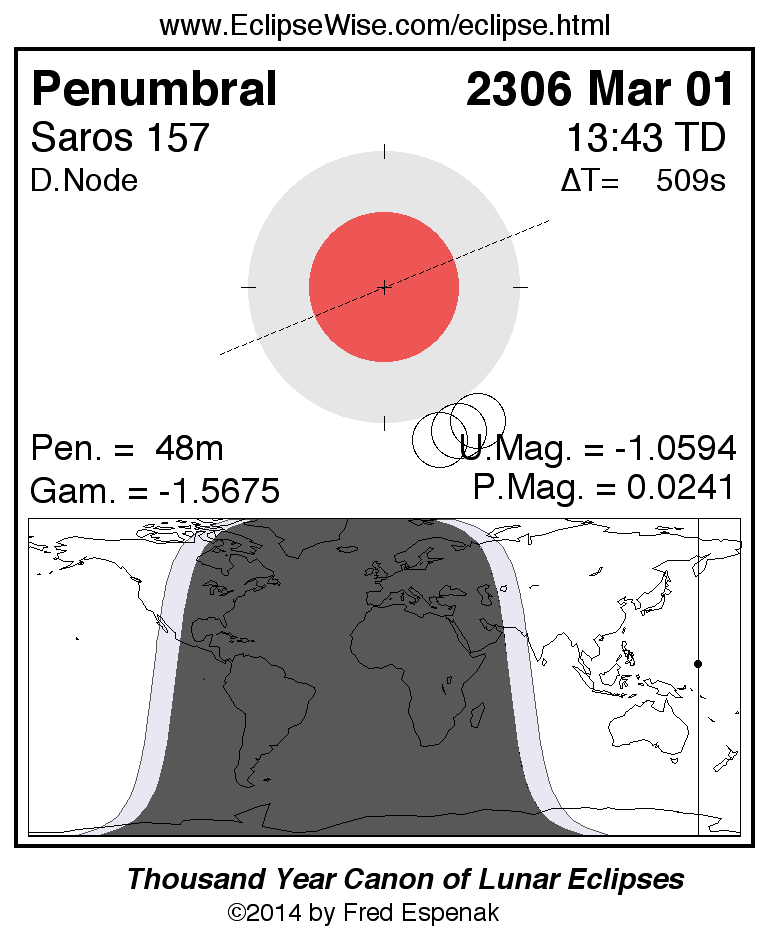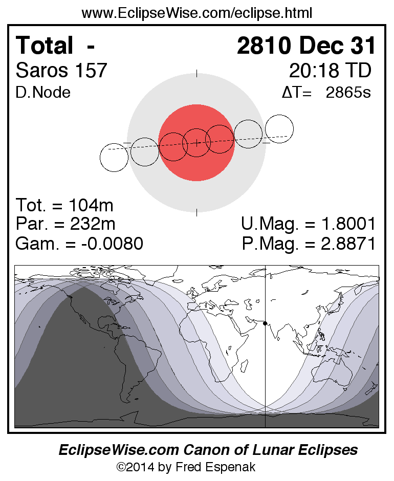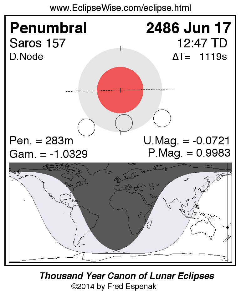 A panorama of all lunar eclipses belonging to Saros 157 is presented here. Each figure shows the Moon's path with respect to Earth's penumbral and umbral shadows. Below the path is a map depicting the geographic region of visibility for the eclipse. The date and time are given for the instant of Greatest Eclipse. Every figure serves as a hyperlink to the EclipseWise Prime page for that eclipse with a larger figure and complete details for the eclipse. Visit the Key to Lunar Eclipse Figures for a detailed explanation of these diagrams. Near the bottom of this page are a series of hyperlinks for more on lunar eclipses.