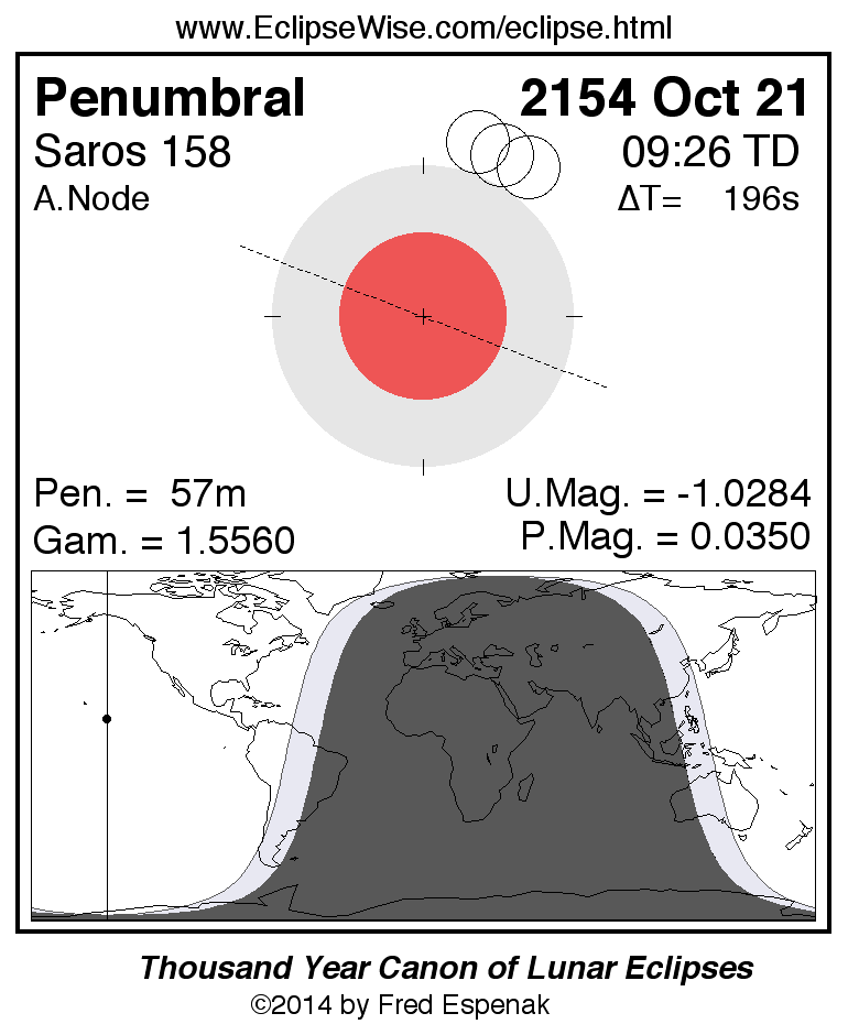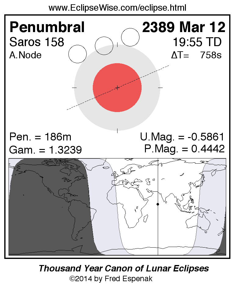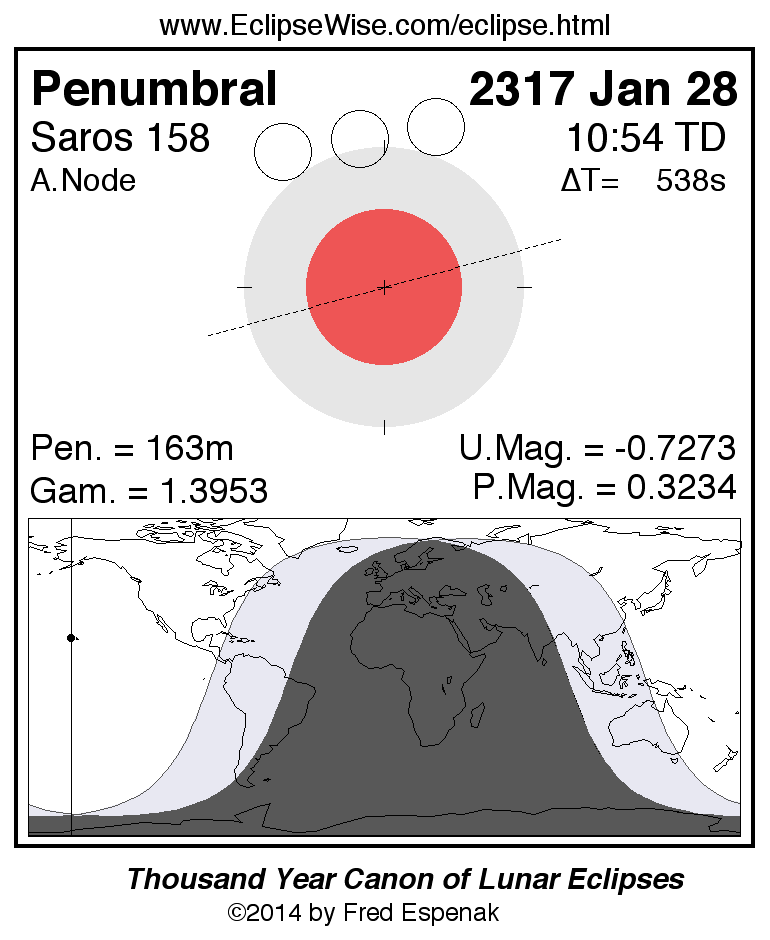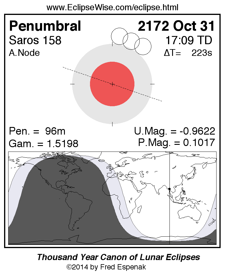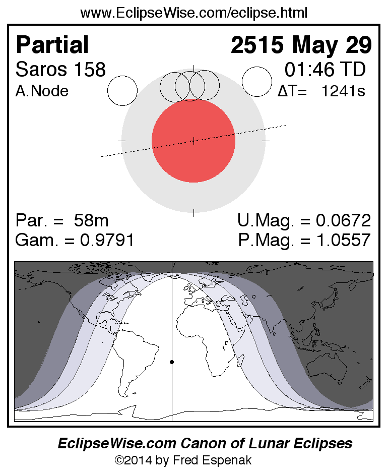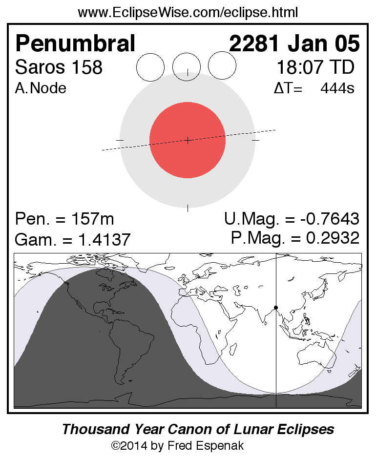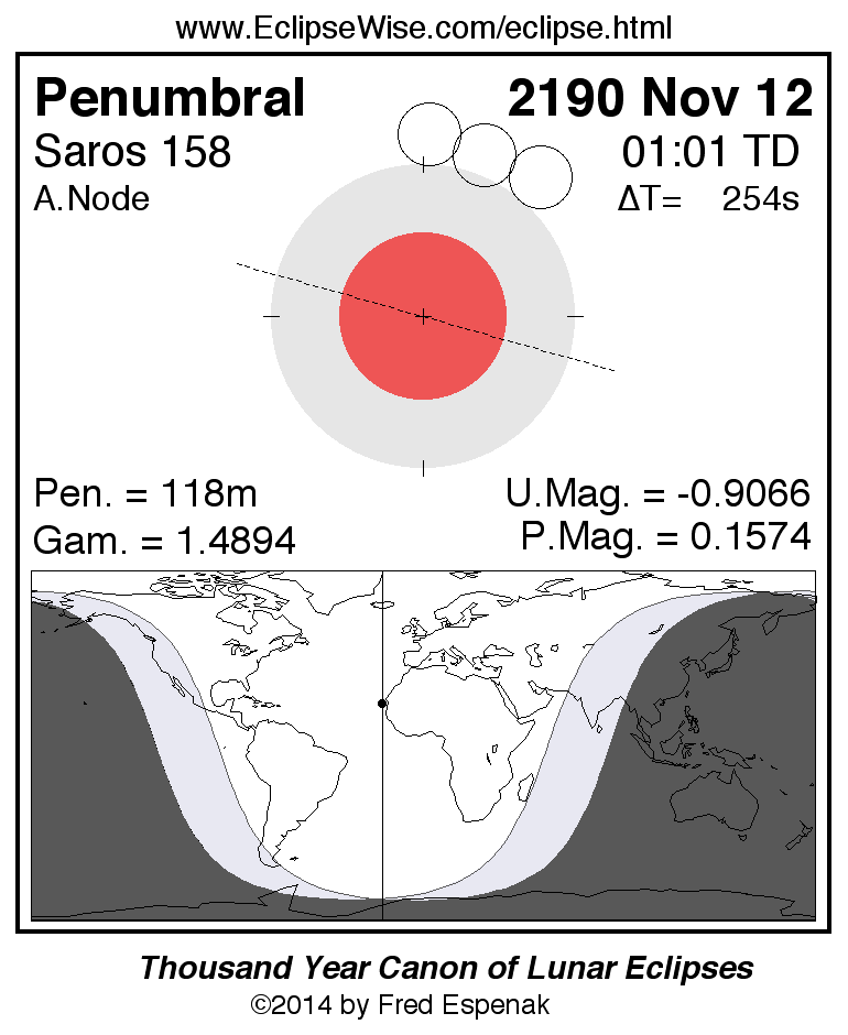 A panorama of all lunar eclipses belonging to Saros 158 is presented here. Each figure shows the Moon's path with respect to Earth's penumbral and umbral shadows. Below the path is a map depicting the geographic region of visibility for the eclipse. The date and time are given for the instant of Greatest Eclipse. Every figure serves as a hyperlink to the EclipseWise Prime page for that eclipse with a larger figure and complete details for the eclipse. Visit the Key to Lunar Eclipse Figures for a detailed explanation of these diagrams. Near the bottom of this page are a series of hyperlinks for more on lunar eclipses.