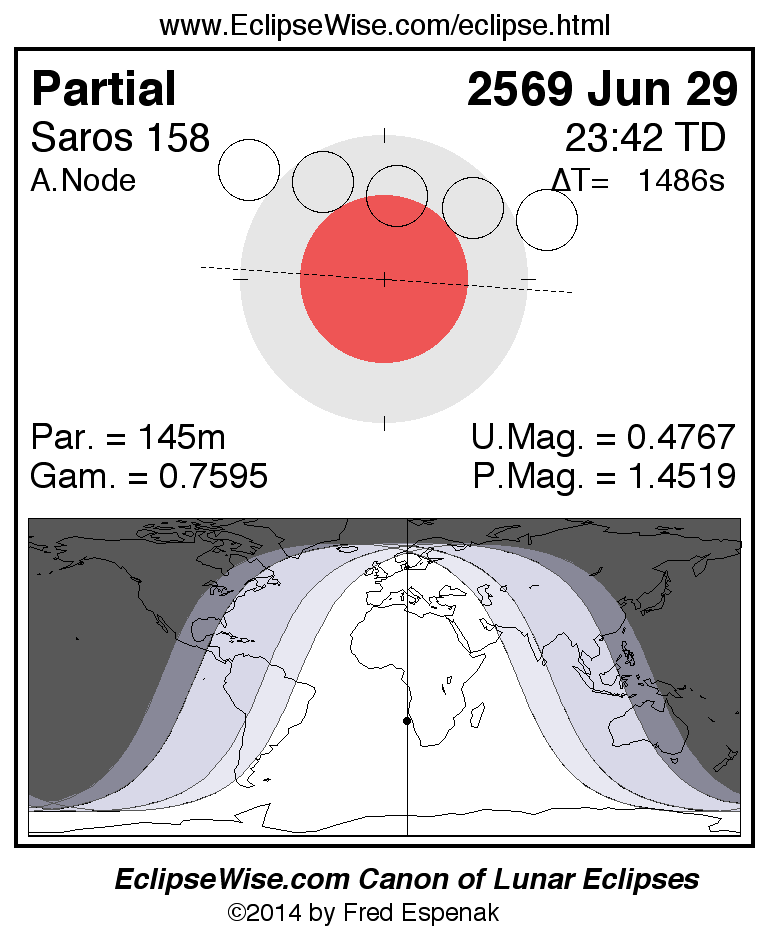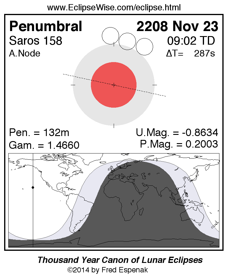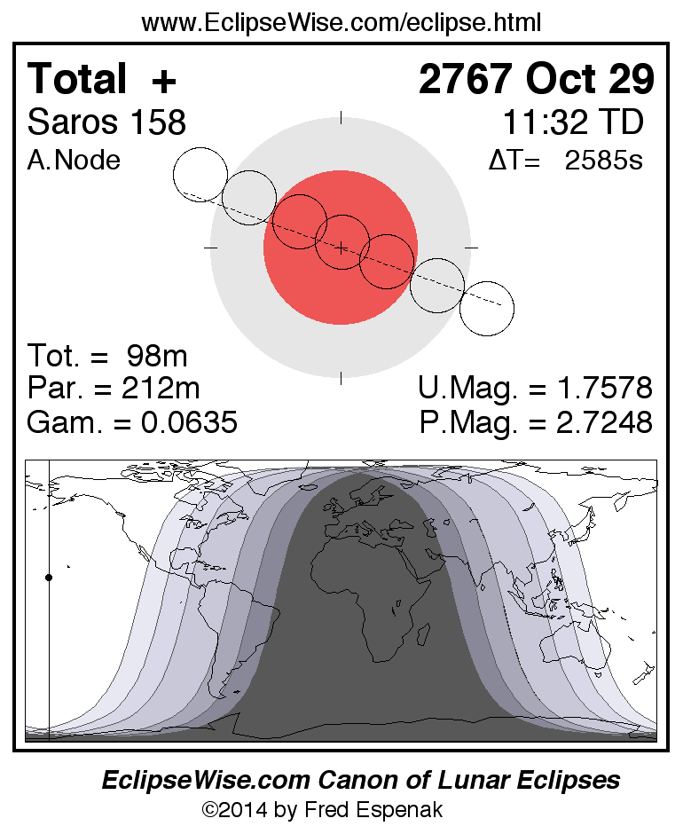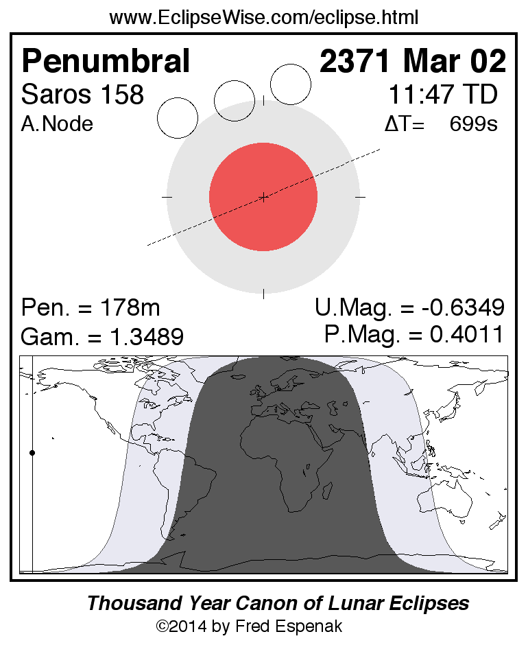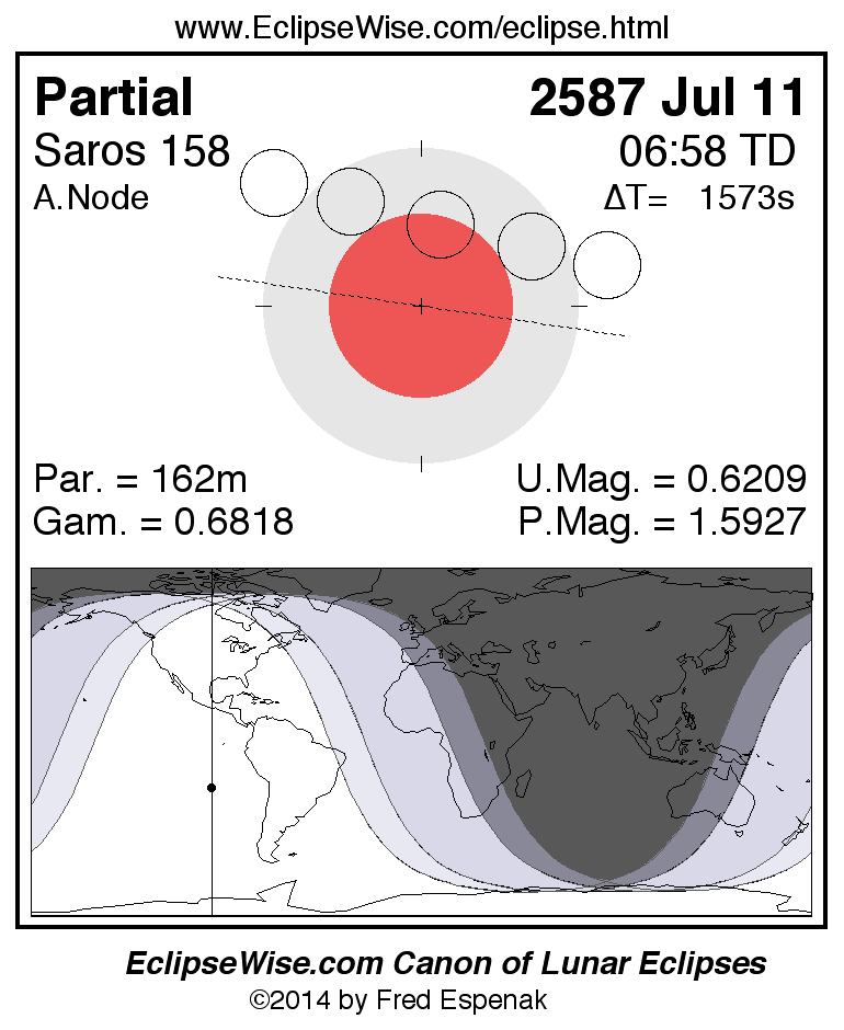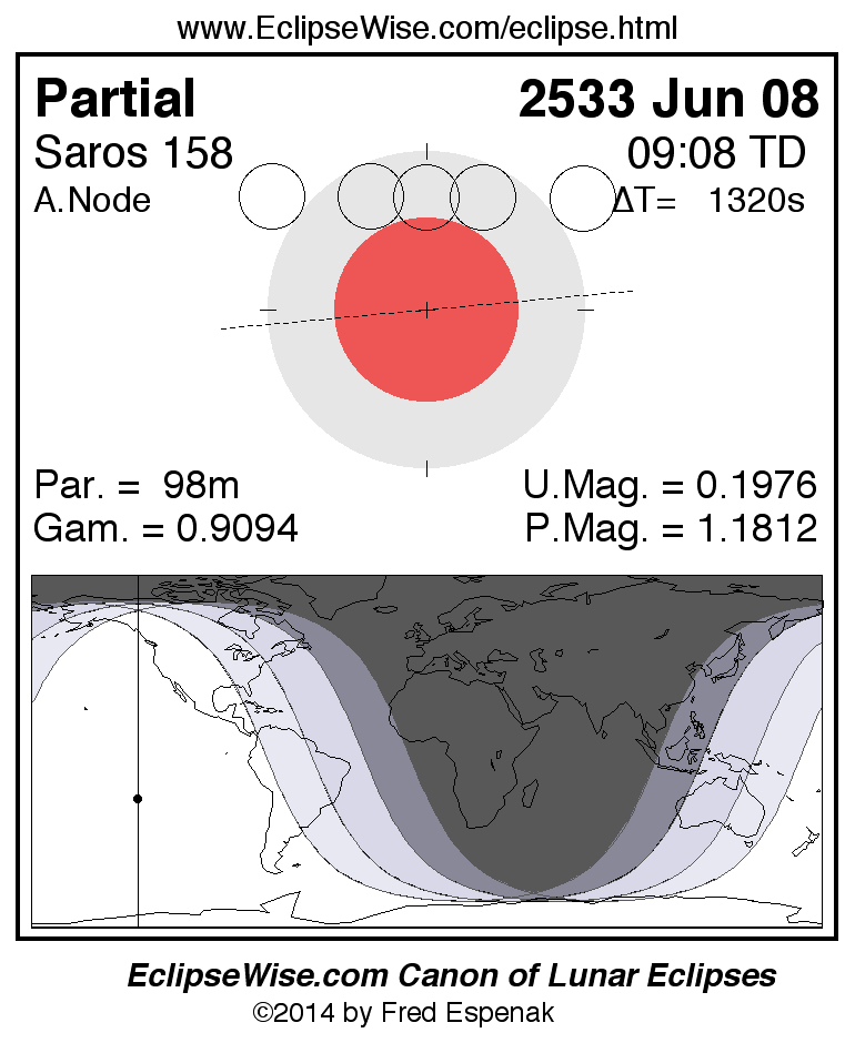 A panorama of all lunar eclipses belonging to Saros 158 is presented here. Each figure shows the Moon's path with respect to Earth's penumbral and umbral shadows. Below the path is a map depicting the geographic region of visibility for the eclipse. The date and time are given for the instant of Greatest Eclipse. Every figure serves as a hyperlink to the EclipseWise Prime page for that eclipse with a larger figure and complete details for the eclipse. Visit the Key to Lunar Eclipse Figures for a detailed explanation of these diagrams. Near the bottom of this page are a series of hyperlinks for more on lunar eclipses.