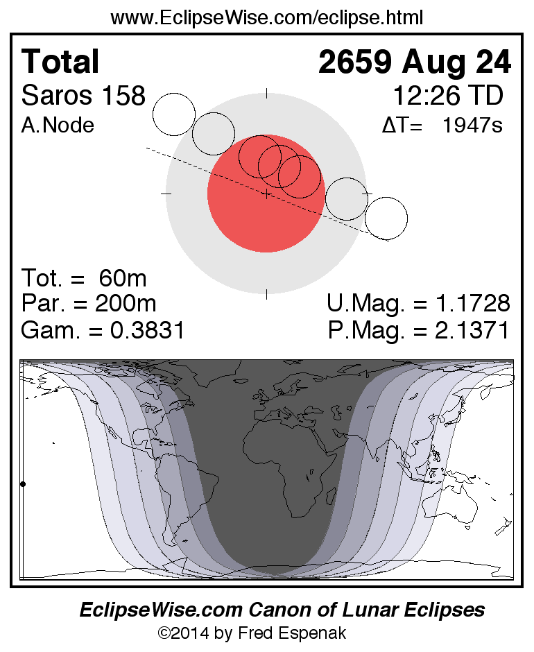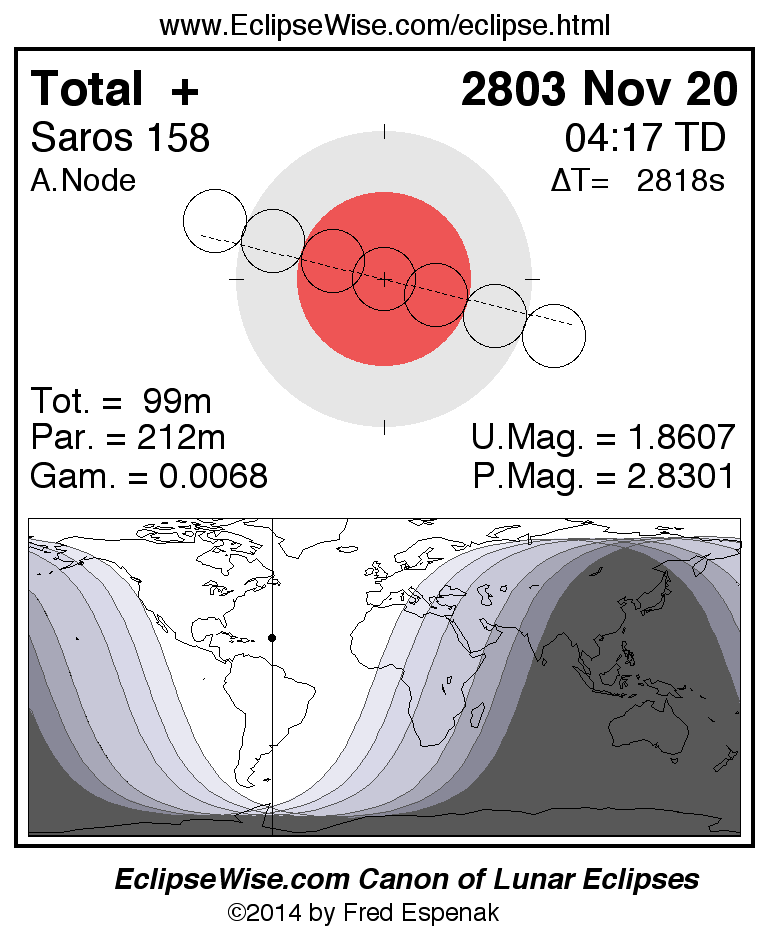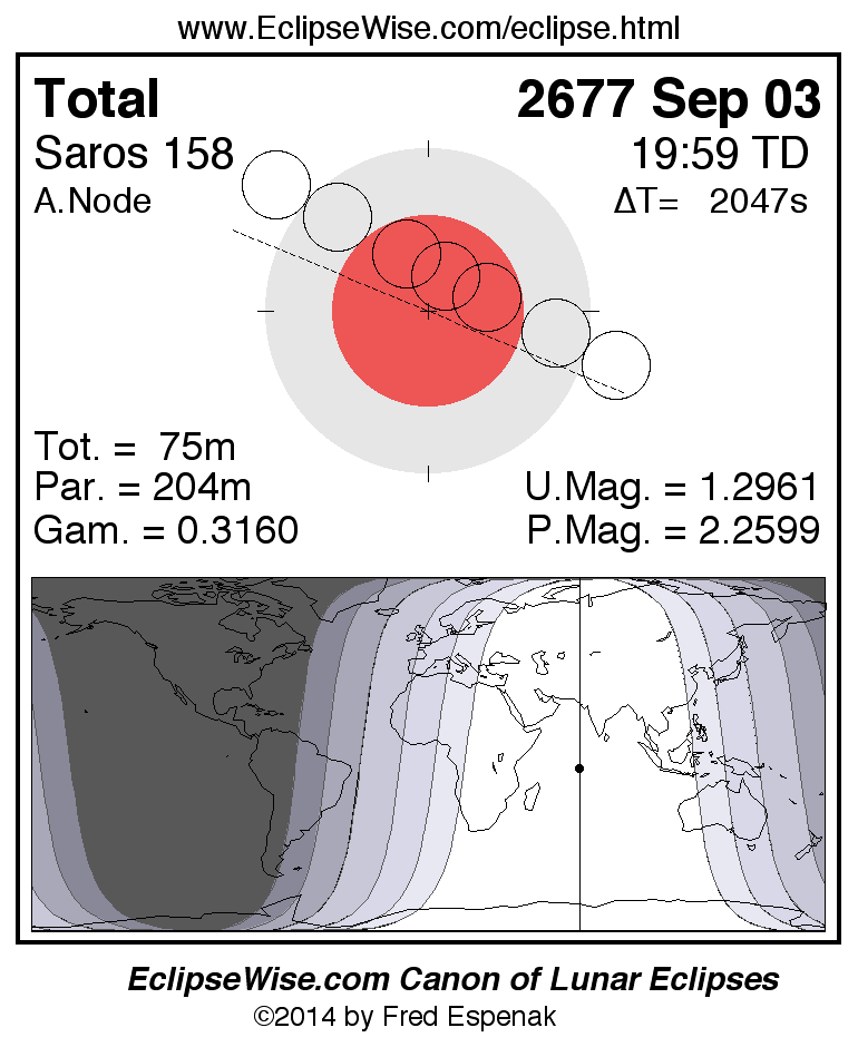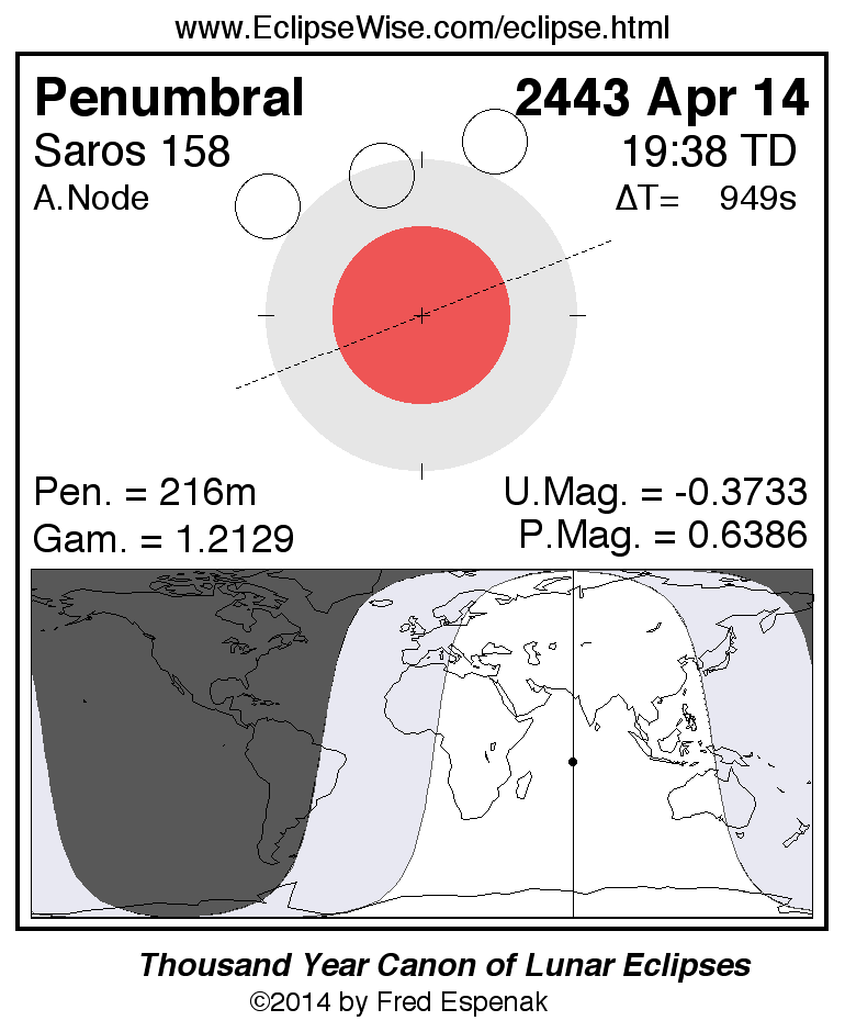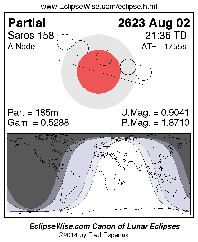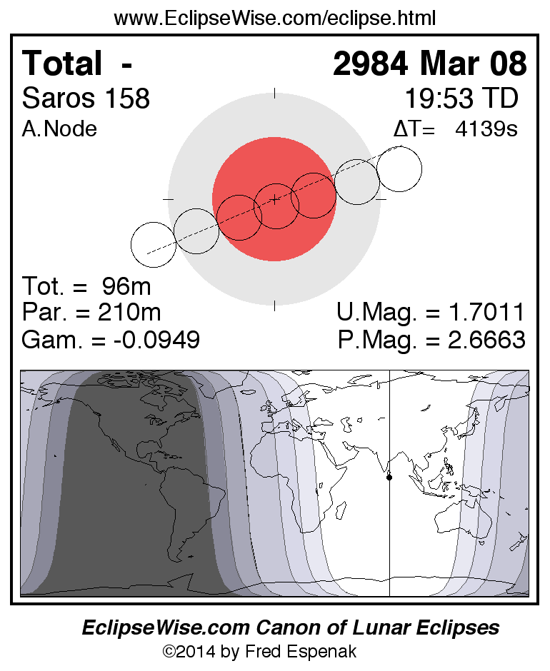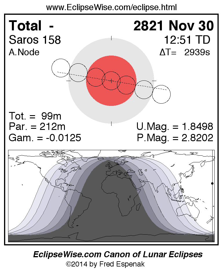 A panorama of all lunar eclipses belonging to Saros 158 is presented here. Each figure shows the Moon's path with respect to Earth's penumbral and umbral shadows. Below the path is a map depicting the geographic region of visibility for the eclipse. The date and time are given for the instant of Greatest Eclipse. Every figure serves as a hyperlink to the EclipseWise Prime page for that eclipse with a larger figure and complete details for the eclipse. Visit the Key to Lunar Eclipse Figures for a detailed explanation of these diagrams. Near the bottom of this page are a series of hyperlinks for more on lunar eclipses.