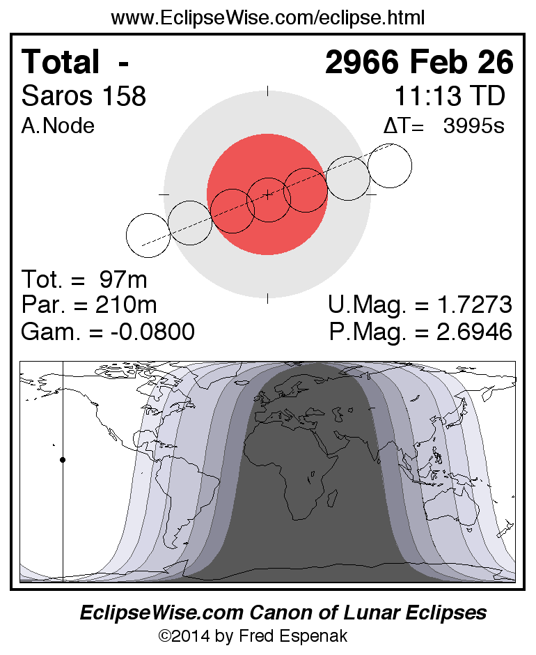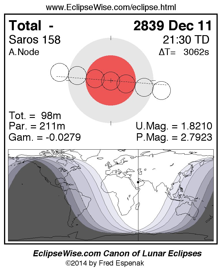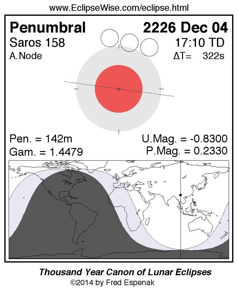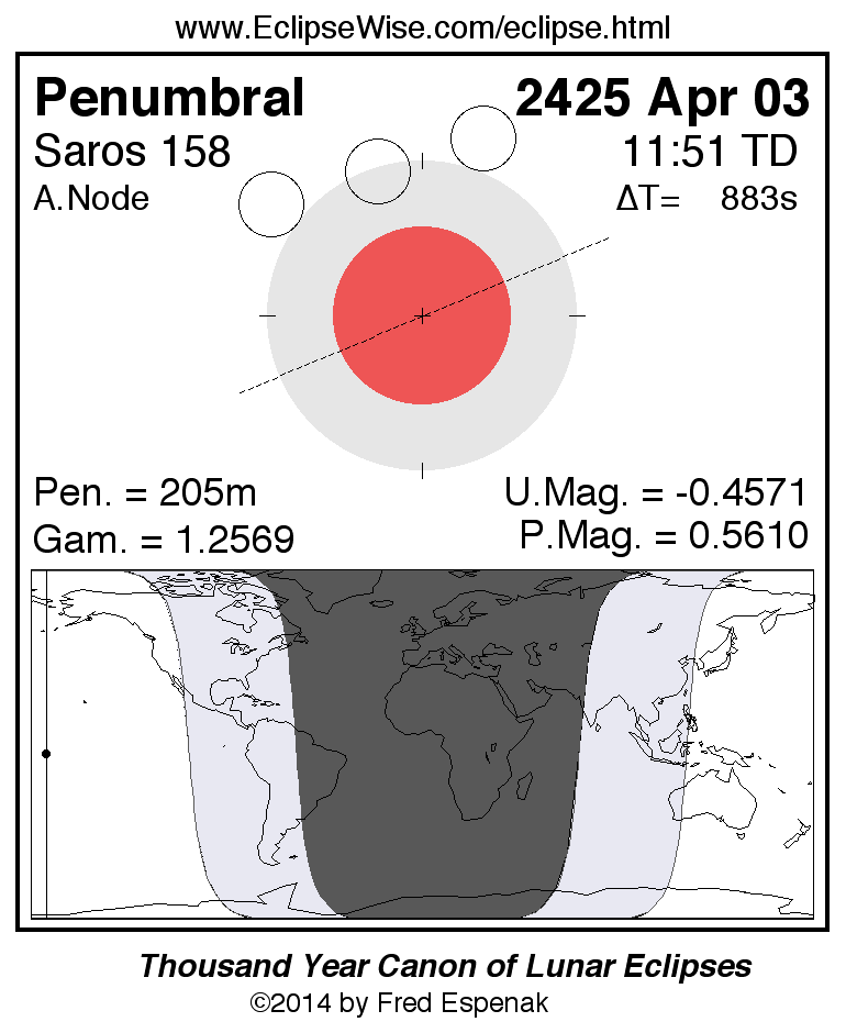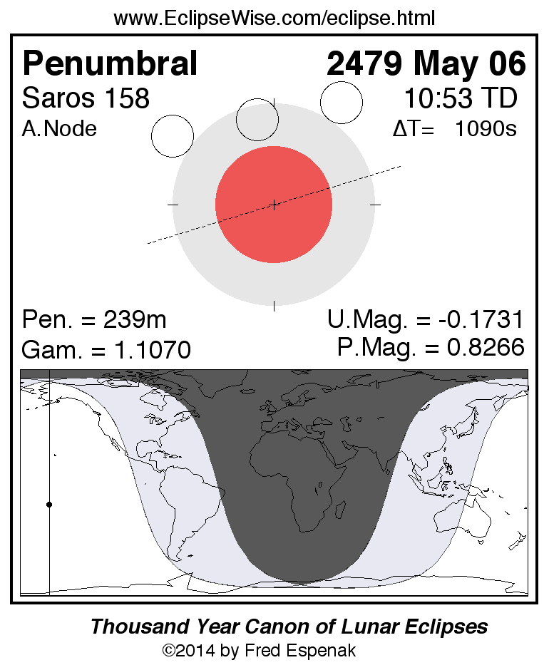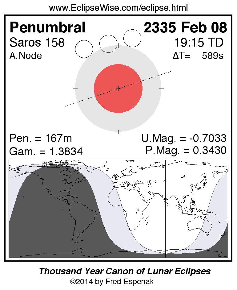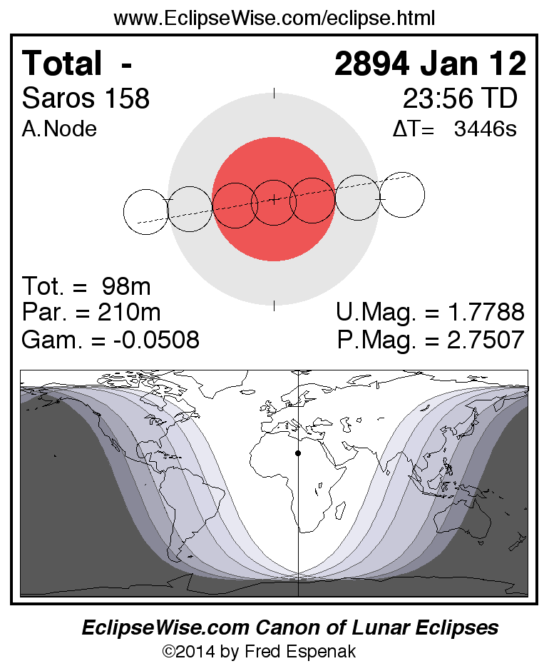 A panorama of all lunar eclipses belonging to Saros 158 is presented here. Each figure shows the Moon's path with respect to Earth's penumbral and umbral shadows. Below the path is a map depicting the geographic region of visibility for the eclipse. The date and time are given for the instant of Greatest Eclipse. Every figure serves as a hyperlink to the EclipseWise Prime page for that eclipse with a larger figure and complete details for the eclipse. Visit the Key to Lunar Eclipse Figures for a detailed explanation of these diagrams. Near the bottom of this page are a series of hyperlinks for more on lunar eclipses.