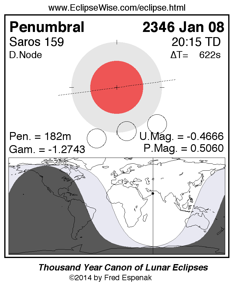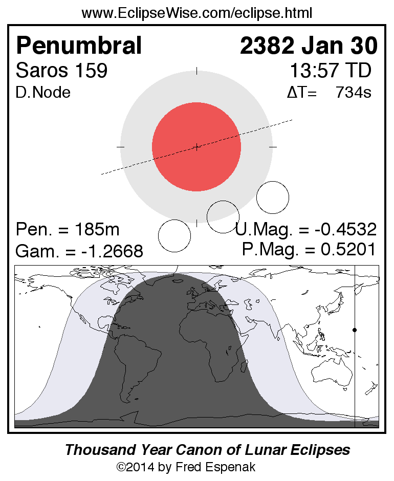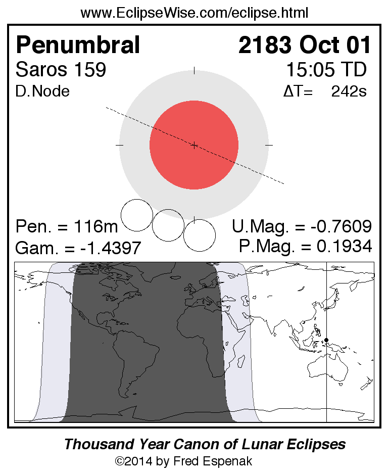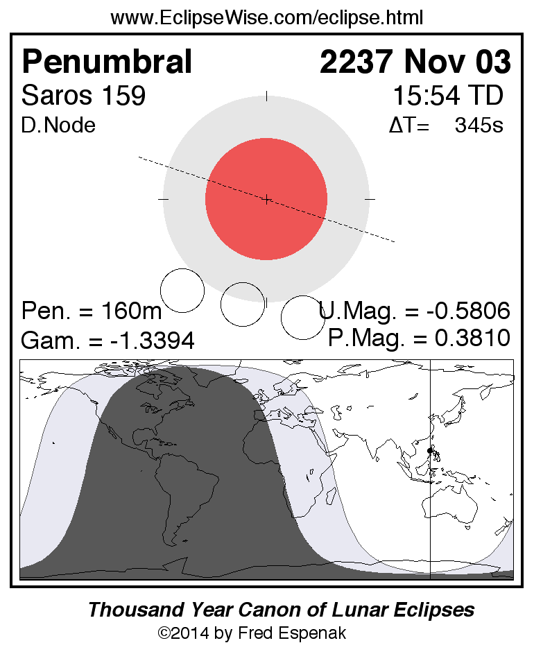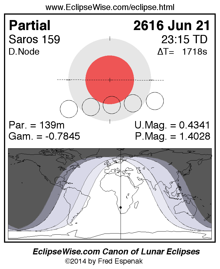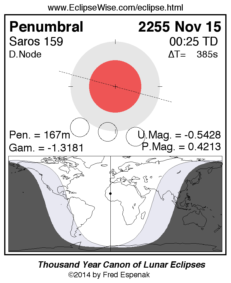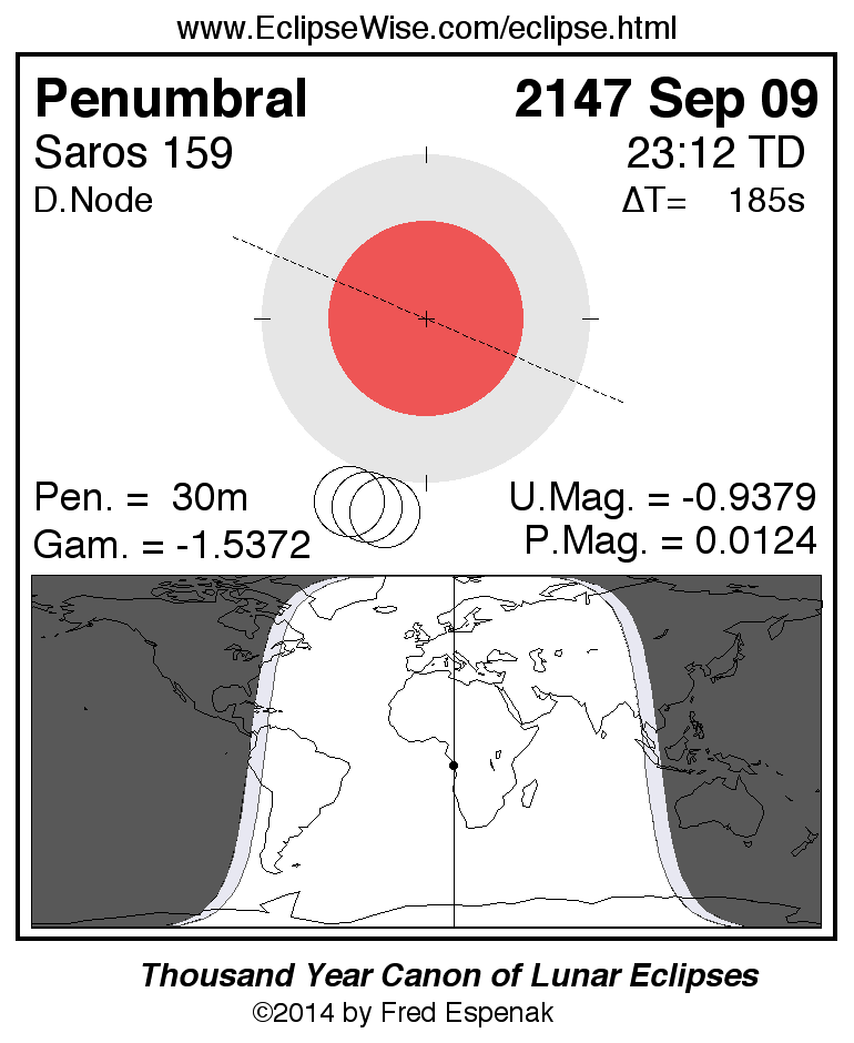 A panorama of all lunar eclipses belonging to Saros 159 is presented here. Each figure shows the Moon's path with respect to Earth's penumbral and umbral shadows. Below the path is a map depicting the geographic region of visibility for the eclipse. The date and time are given for the instant of Greatest Eclipse. Every figure serves as a hyperlink to the EclipseWise Prime page for that eclipse with a larger figure and complete details for the eclipse. Visit the Key to Lunar Eclipse Figures for a detailed explanation of these diagrams. Near the bottom of this page are a series of hyperlinks for more on lunar eclipses.