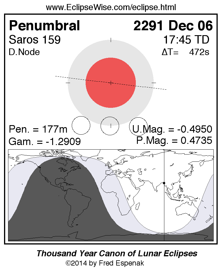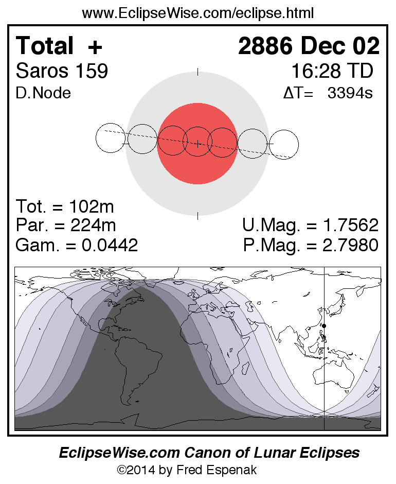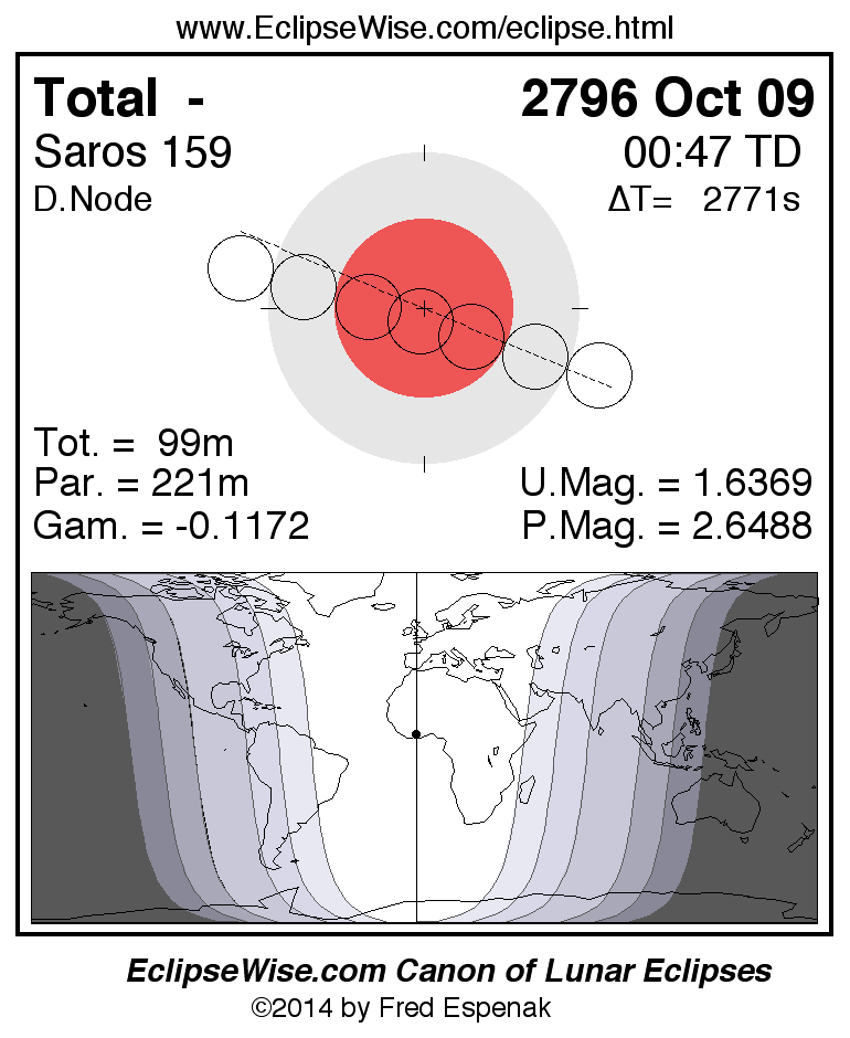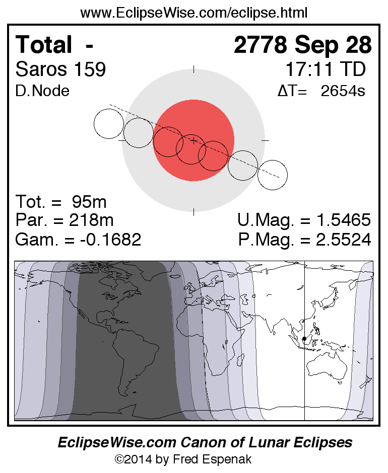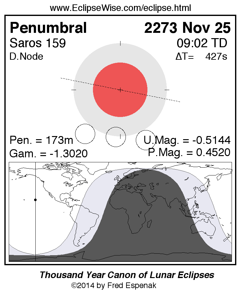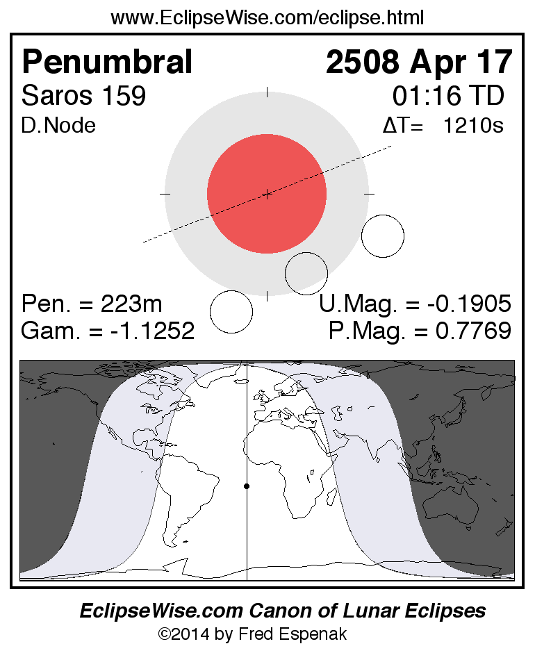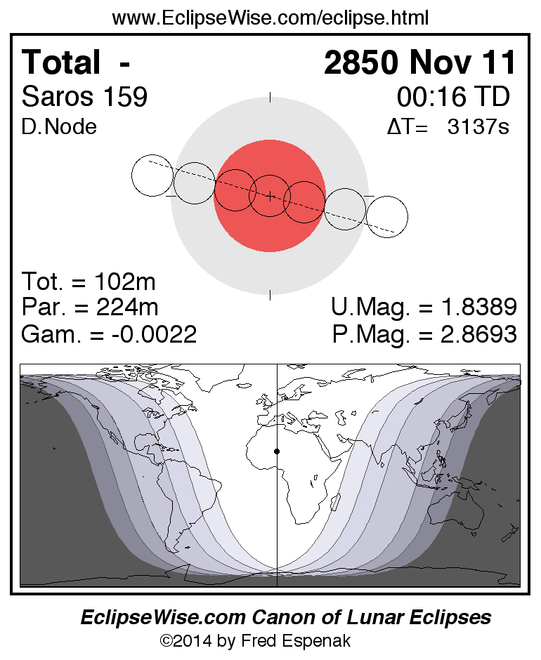 A panorama of all lunar eclipses belonging to Saros 159 is presented here. Each figure shows the Moon's path with respect to Earth's penumbral and umbral shadows. Below the path is a map depicting the geographic region of visibility for the eclipse. The date and time are given for the instant of Greatest Eclipse. Every figure serves as a hyperlink to the EclipseWise Prime page for that eclipse with a larger figure and complete details for the eclipse. Visit the Key to Lunar Eclipse Figures for a detailed explanation of these diagrams. Near the bottom of this page are a series of hyperlinks for more on lunar eclipses.