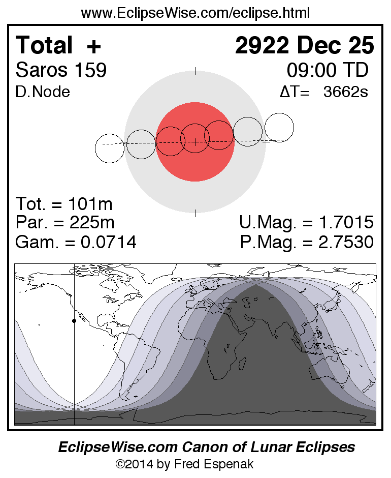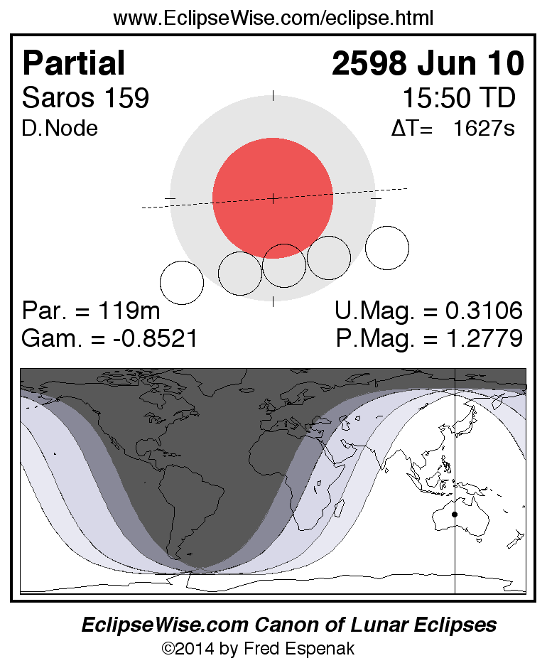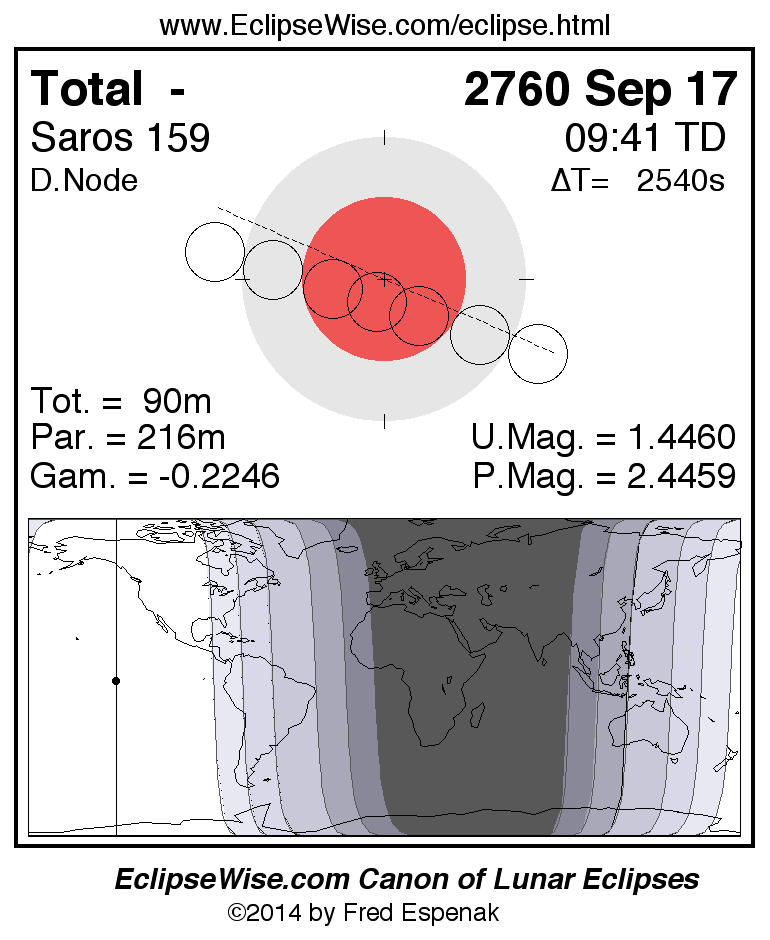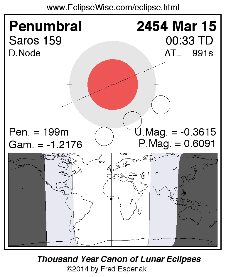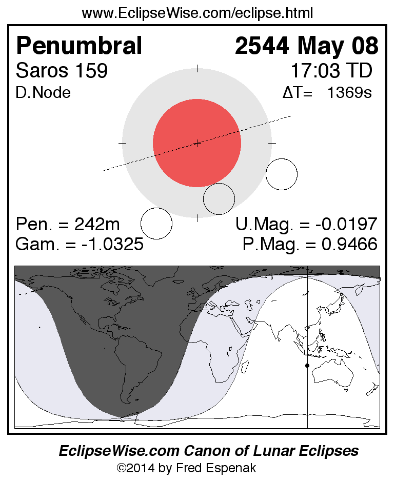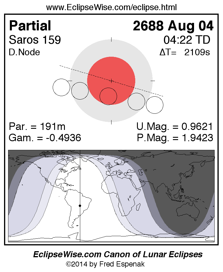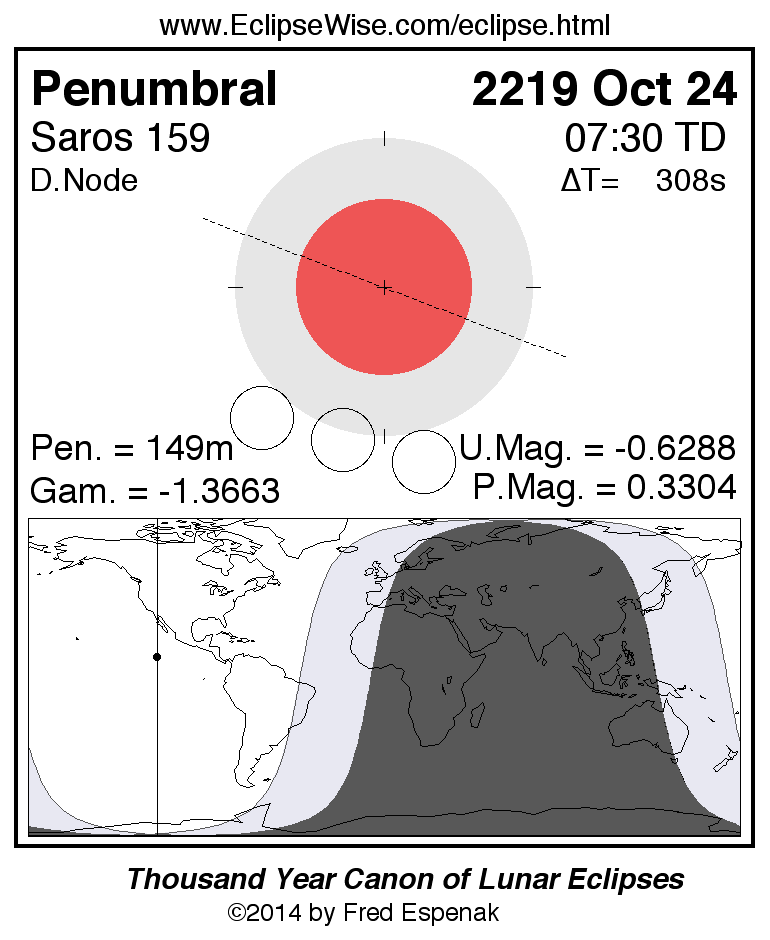 A panorama of all lunar eclipses belonging to Saros 159 is presented here. Each figure shows the Moon's path with respect to Earth's penumbral and umbral shadows. Below the path is a map depicting the geographic region of visibility for the eclipse. The date and time are given for the instant of Greatest Eclipse. Every figure serves as a hyperlink to the EclipseWise Prime page for that eclipse with a larger figure and complete details for the eclipse. Visit the Key to Lunar Eclipse Figures for a detailed explanation of these diagrams. Near the bottom of this page are a series of hyperlinks for more on lunar eclipses.