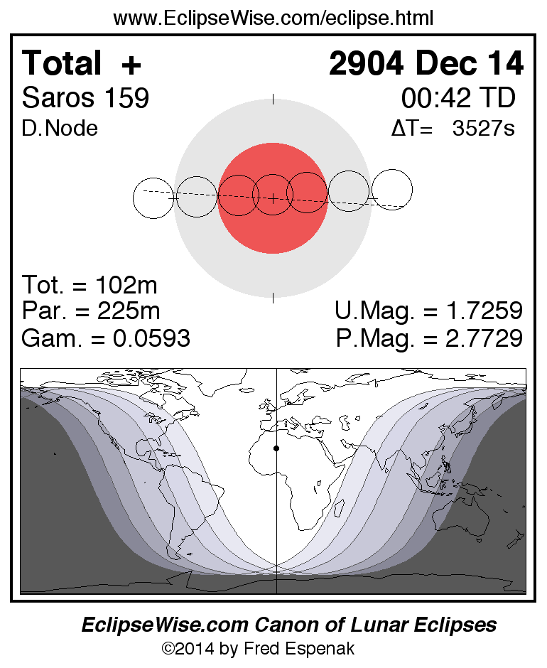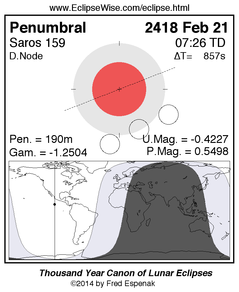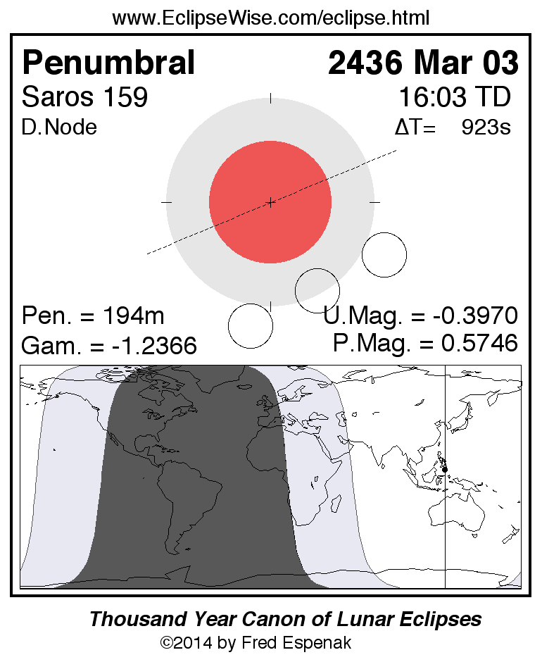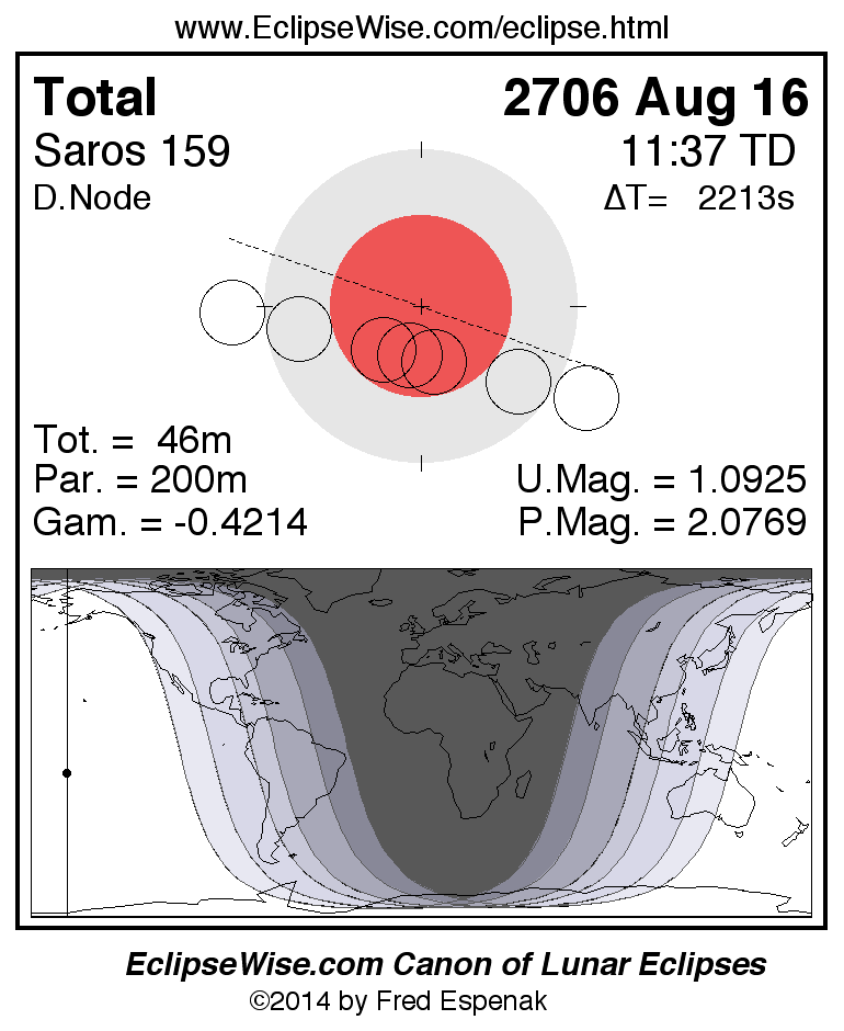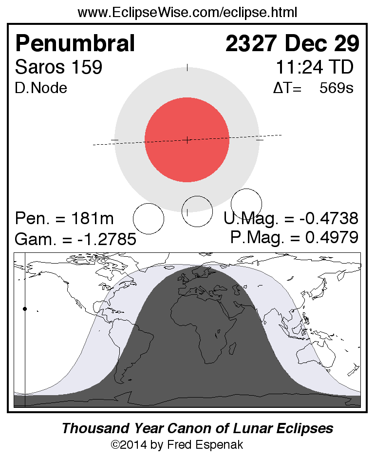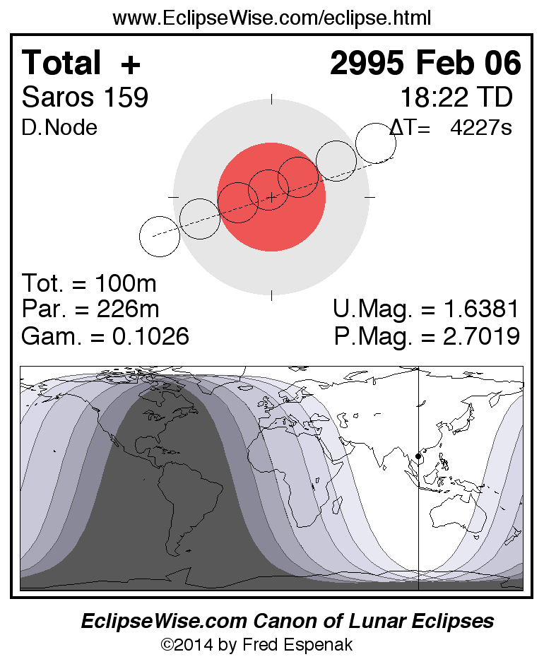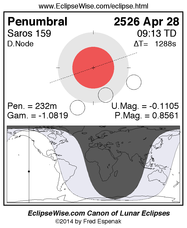 A panorama of all lunar eclipses belonging to Saros 159 is presented here. Each figure shows the Moon's path with respect to Earth's penumbral and umbral shadows. Below the path is a map depicting the geographic region of visibility for the eclipse. The date and time are given for the instant of Greatest Eclipse. Every figure serves as a hyperlink to the EclipseWise Prime page for that eclipse with a larger figure and complete details for the eclipse. Visit the Key to Lunar Eclipse Figures for a detailed explanation of these diagrams. Near the bottom of this page are a series of hyperlinks for more on lunar eclipses.