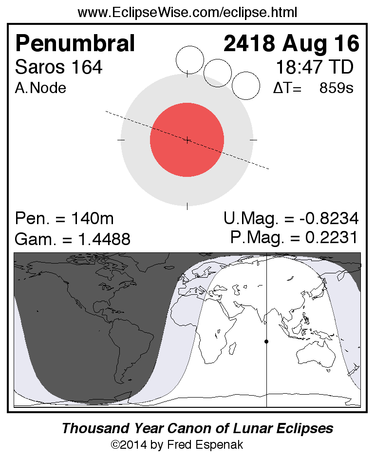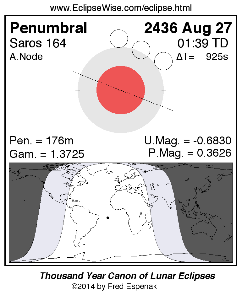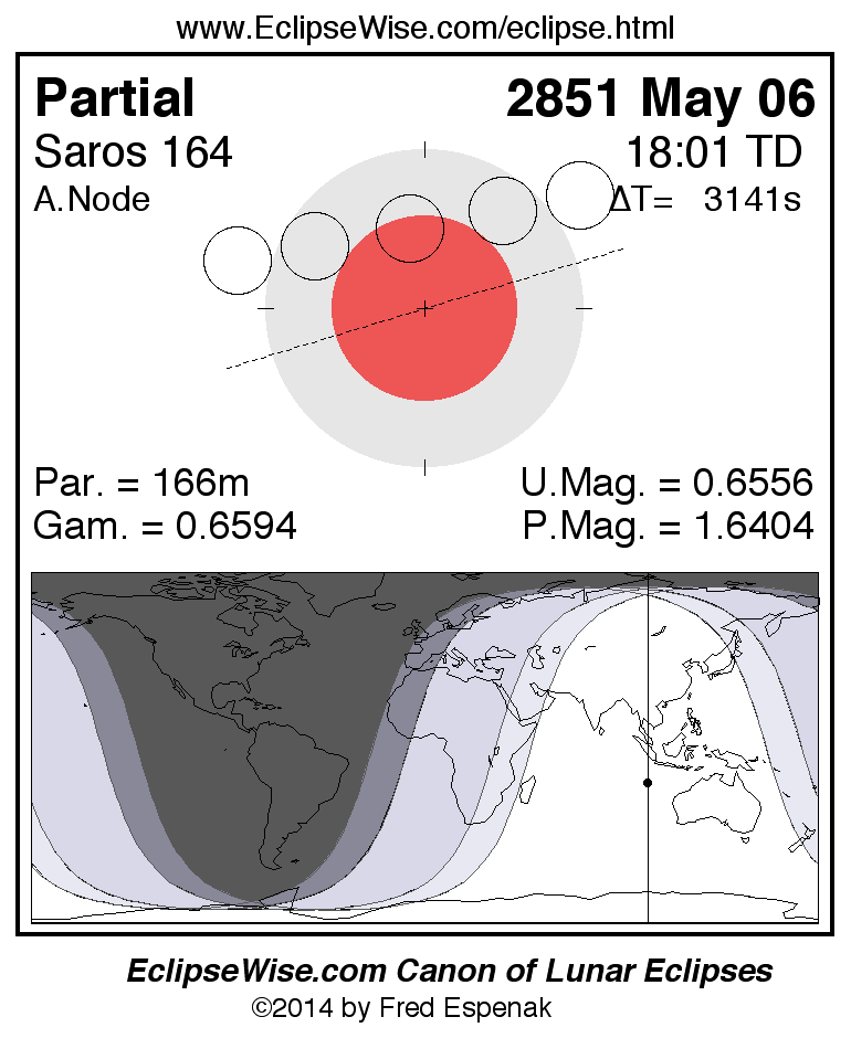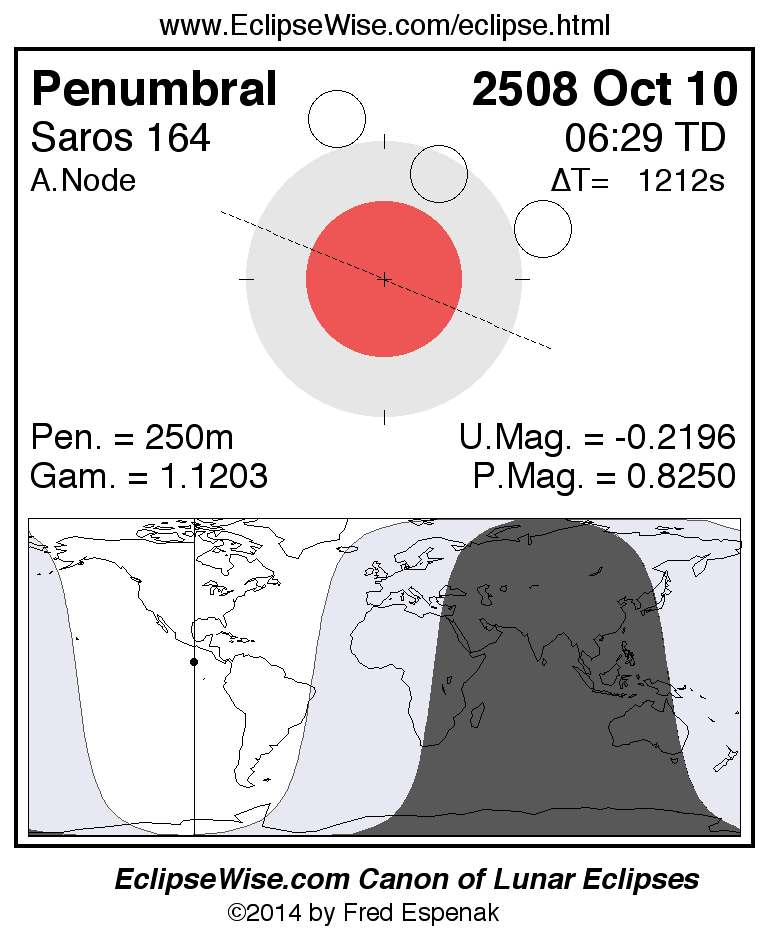 A panorama of all lunar eclipses belonging to Saros 164 is presented here. Each figure shows the Moon's path with respect to Earth's penumbral and umbral shadows. Below the path is a map depicting the geographic region of visibility for the eclipse. The date and time are given for the instant of Greatest Eclipse. Every figure serves as a hyperlink to the EclipseWise Prime page for that eclipse with a larger figure and complete details for the eclipse. Visit the Key to Lunar Eclipse Figures for a detailed explanation of these diagrams. Near the bottom of this page are a series of hyperlinks for more on lunar eclipses.