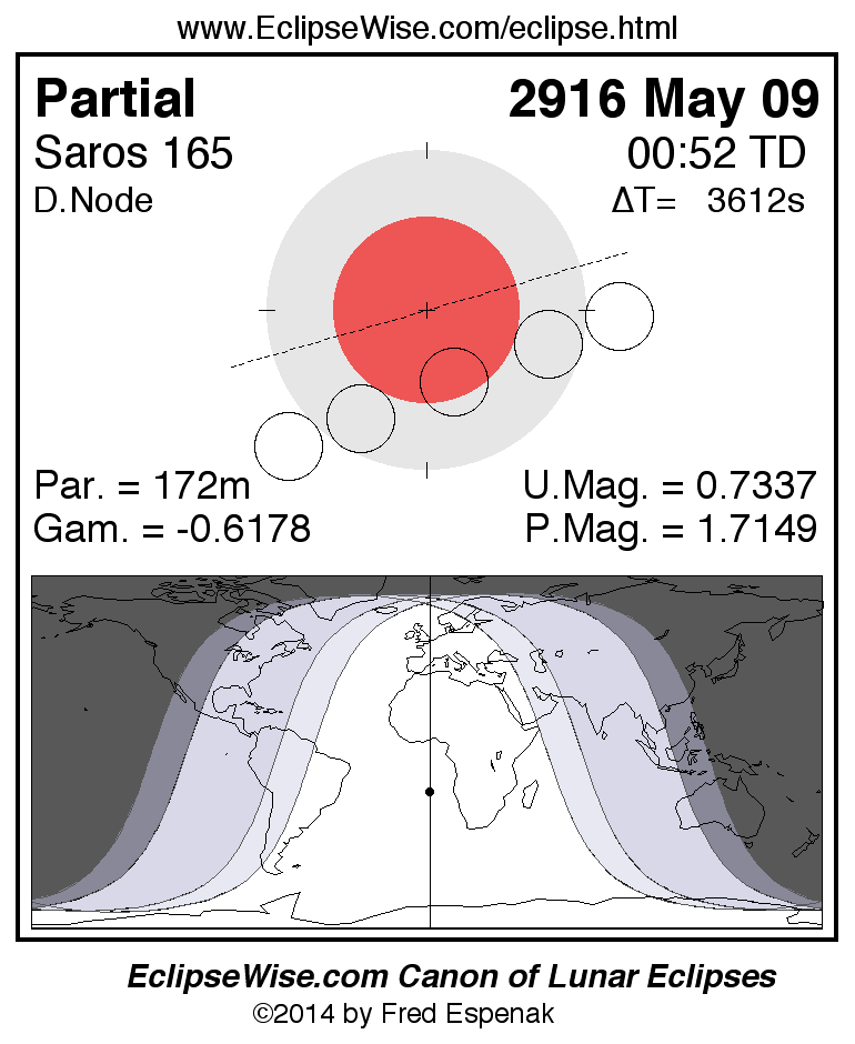 A panorama of all lunar eclipses belonging to Saros 165 is presented here. Each figure shows the Moon's path with respect to Earth's penumbral and umbral shadows. Below the path is a map depicting the geographic region of visibility for the eclipse. The date and time are given for the instant of Greatest Eclipse. Every figure serves as a hyperlink to the EclipseWise Prime page for that eclipse with a larger figure and complete details for the eclipse. Visit the Key to Lunar Eclipse Figures for a detailed explanation of these diagrams. Near the bottom of this page are a series of hyperlinks for more on lunar eclipses.