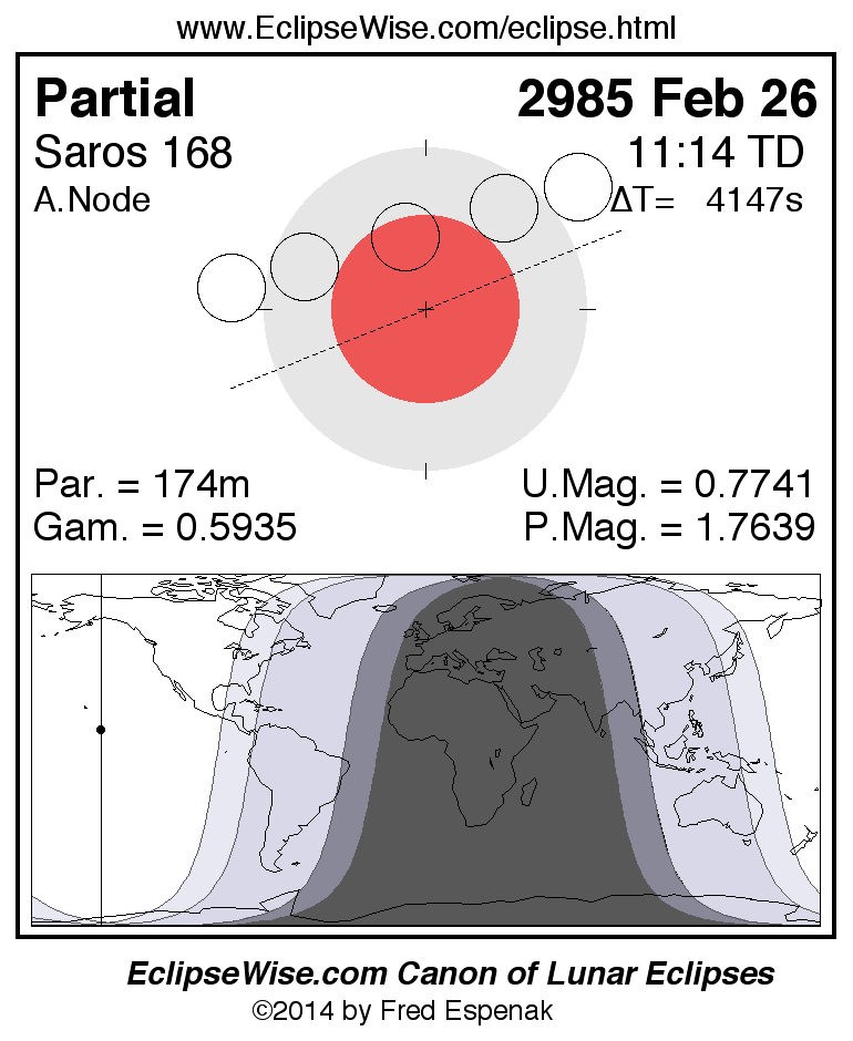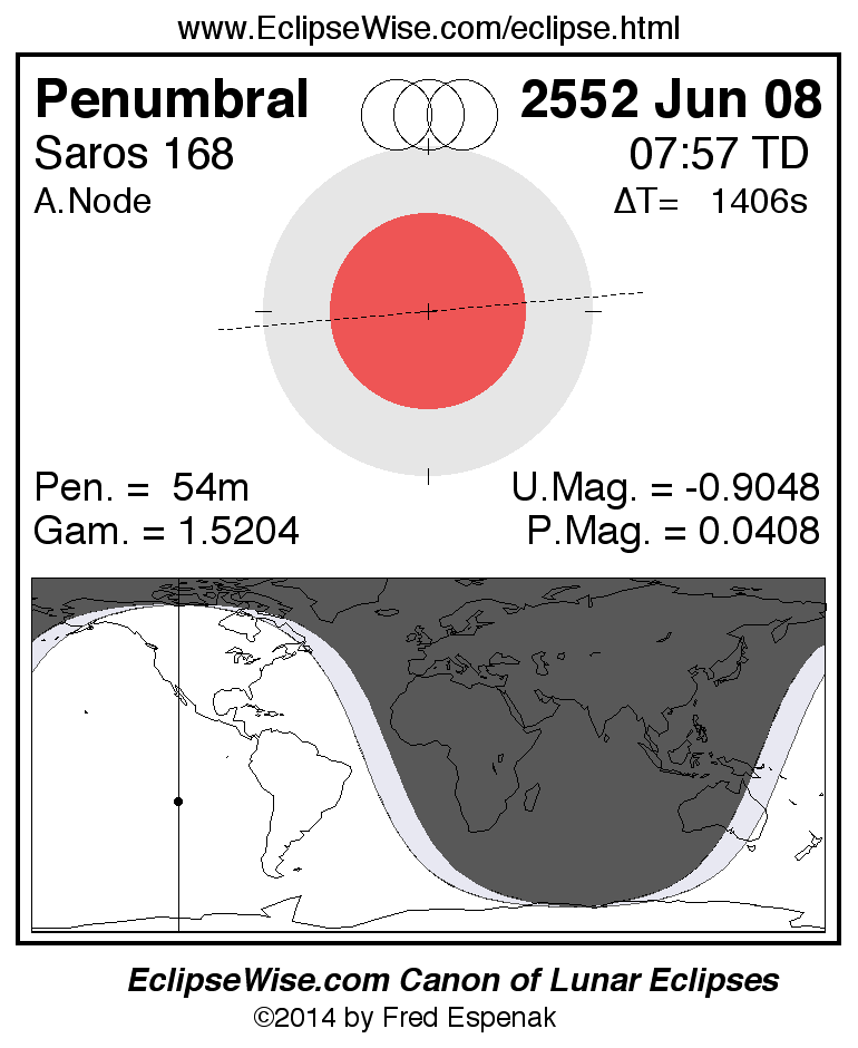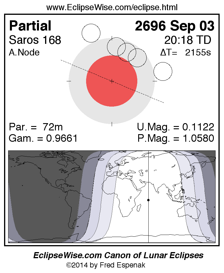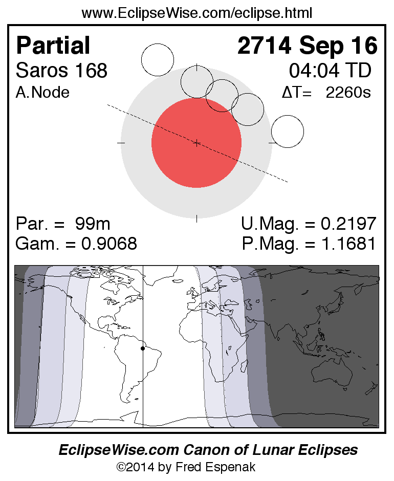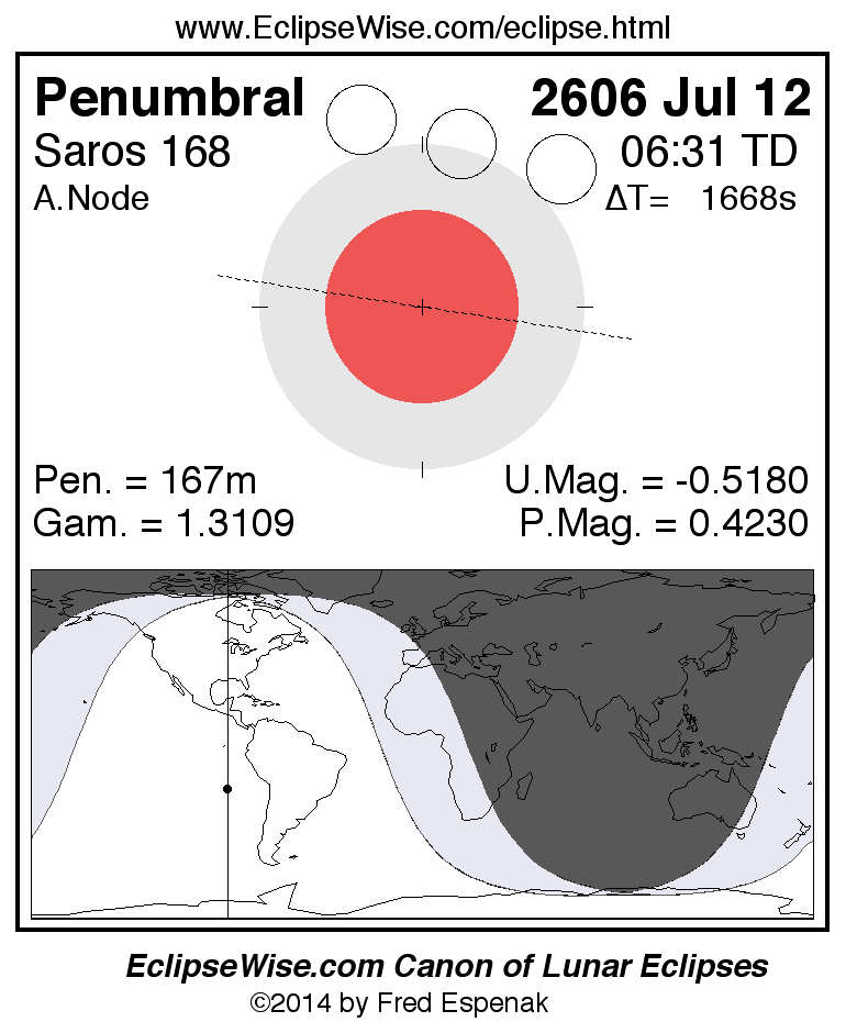 A panorama of all lunar eclipses belonging to Saros 168 is presented here. Each figure shows the Moon's path with respect to Earth's penumbral and umbral shadows. Below the path is a map depicting the geographic region of visibility for the eclipse. The date and time are given for the instant of Greatest Eclipse. Every figure serves as a hyperlink to the EclipseWise Prime page for that eclipse with a larger figure and complete details for the eclipse. Visit the Key to Lunar Eclipse Figures for a detailed explanation of these diagrams. Near the bottom of this page are a series of hyperlinks for more on lunar eclipses.